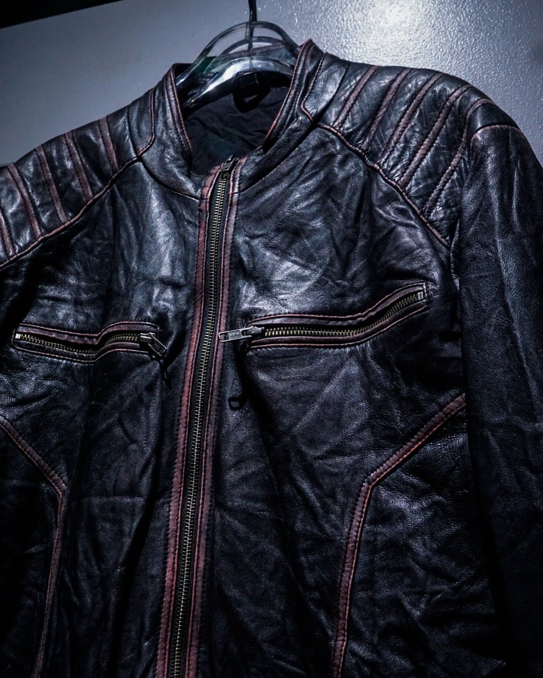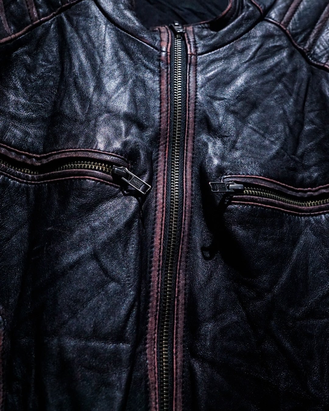 ボディには上質なシープスキンレザーを採用。非常に柔らかくしなやかな革質で、ハードなルックスながら着心地は抜群。