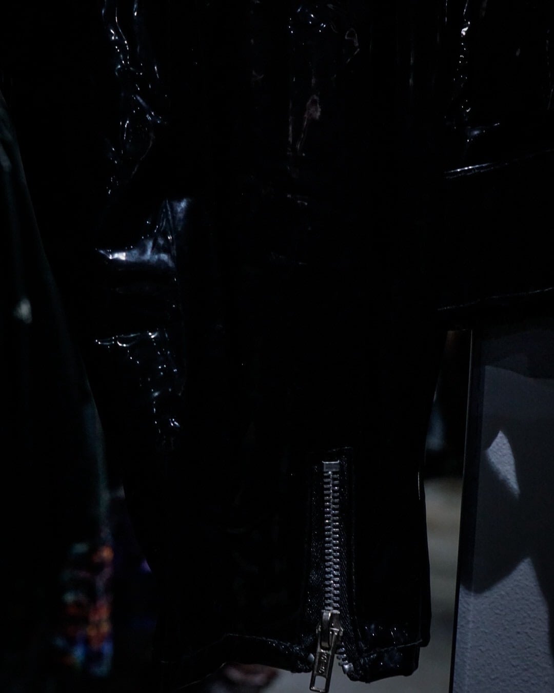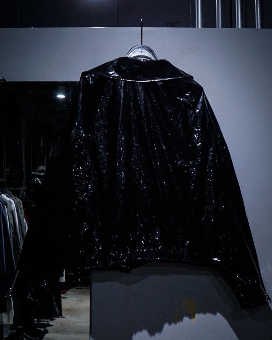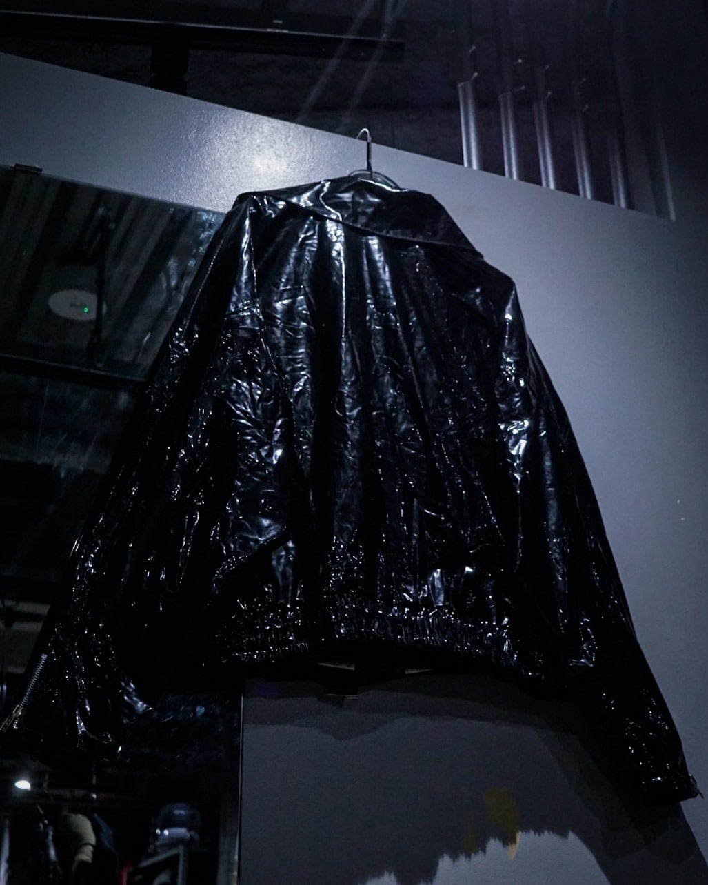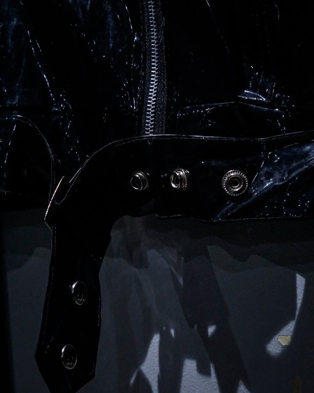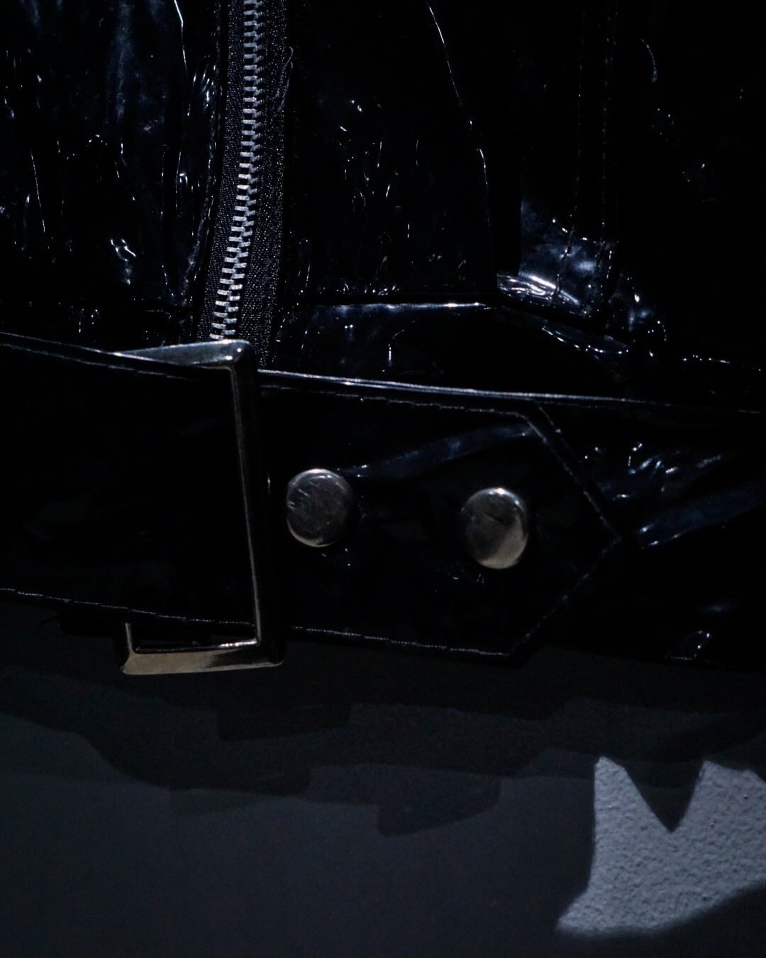 ボディには光沢感のあるブラックビニール素材を採用。シワ感のある質感と強い艶が特徴的で、光の当たり方によって表情を変えるインパクト抜群のファブリック。レザーとはまた異なる空気感を纏った素材使いに、服好きの心がグッと鷲掴みにされます。