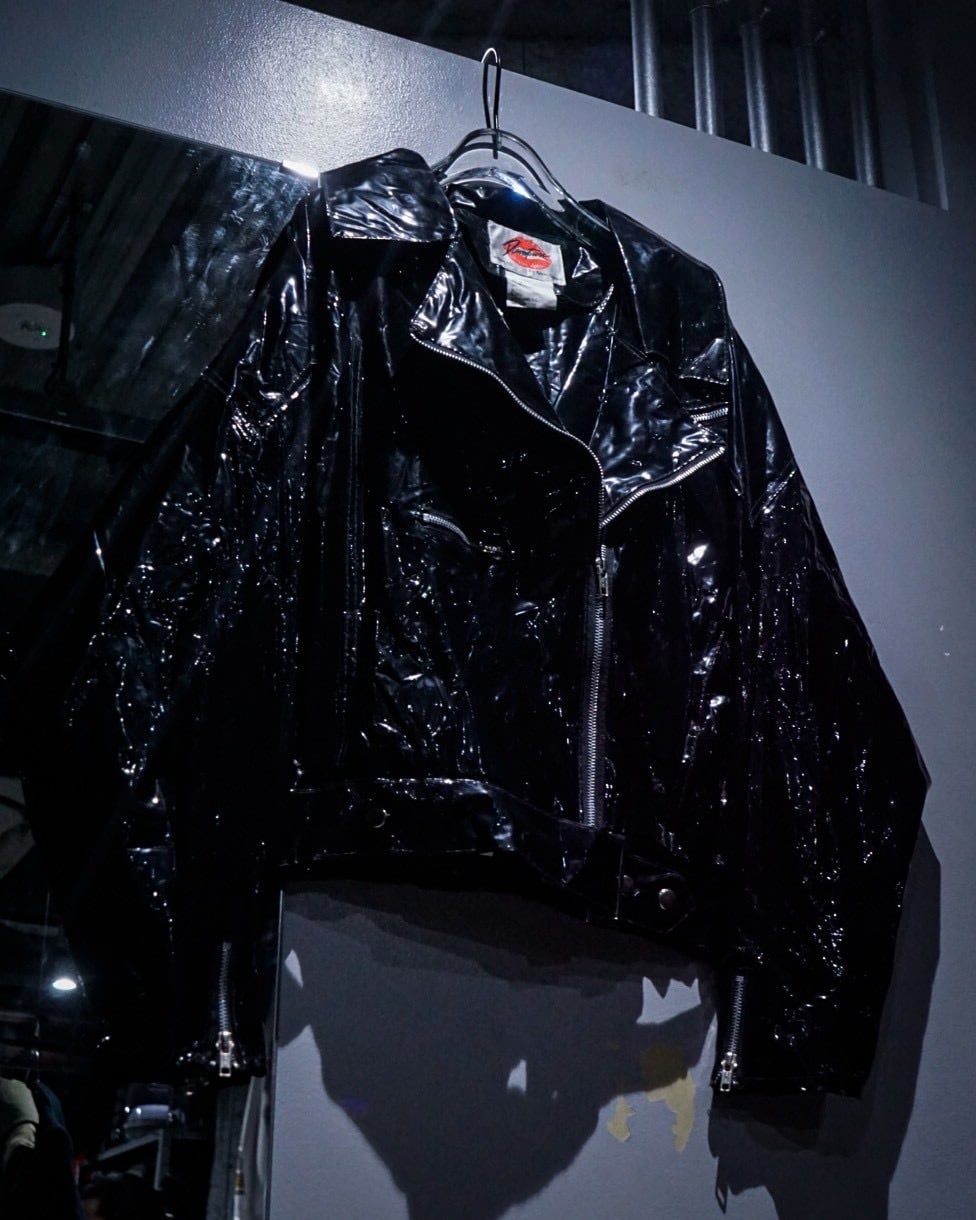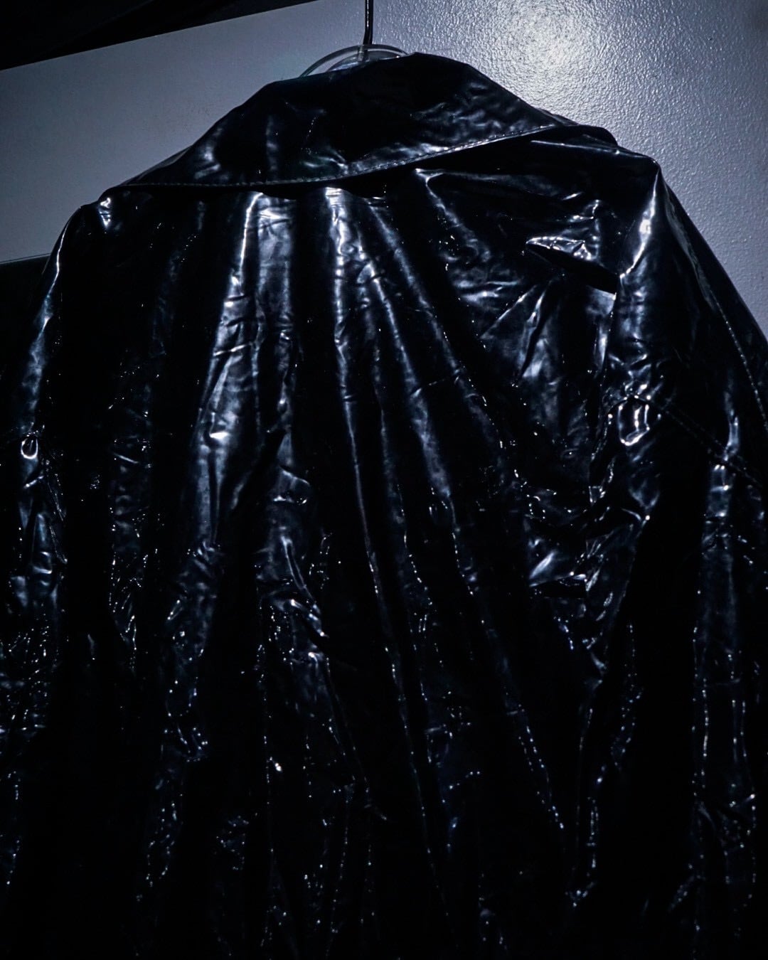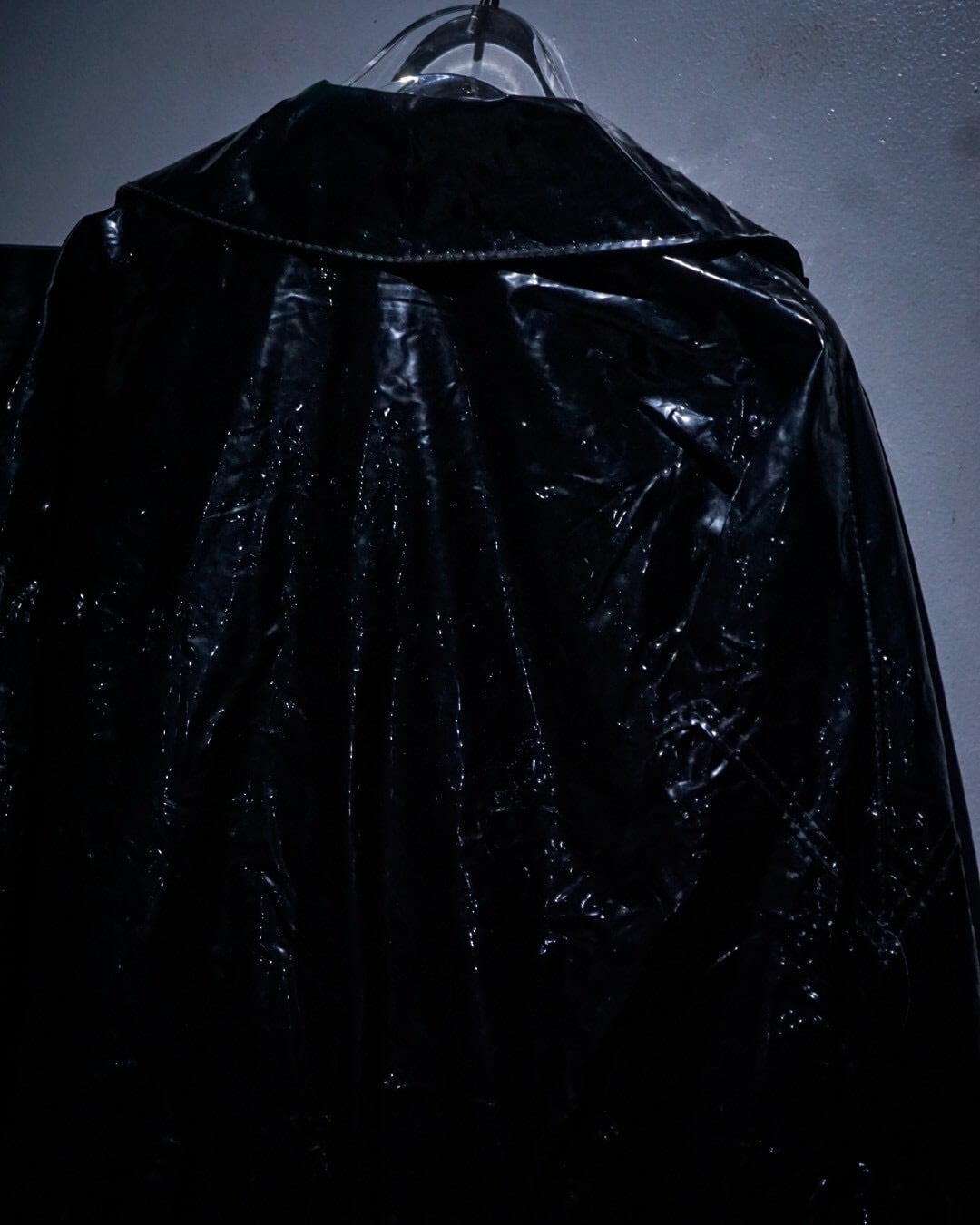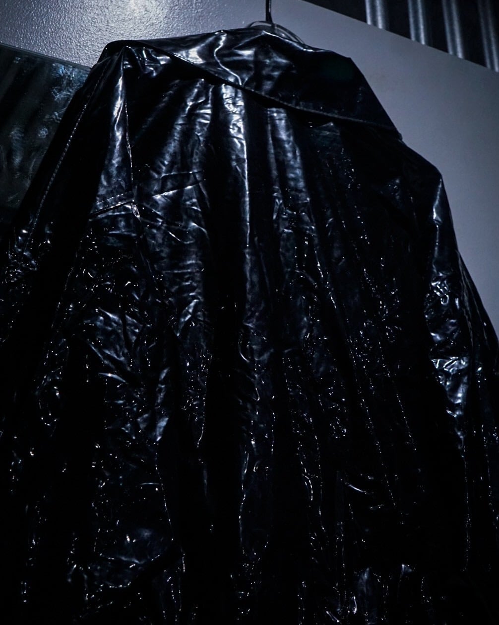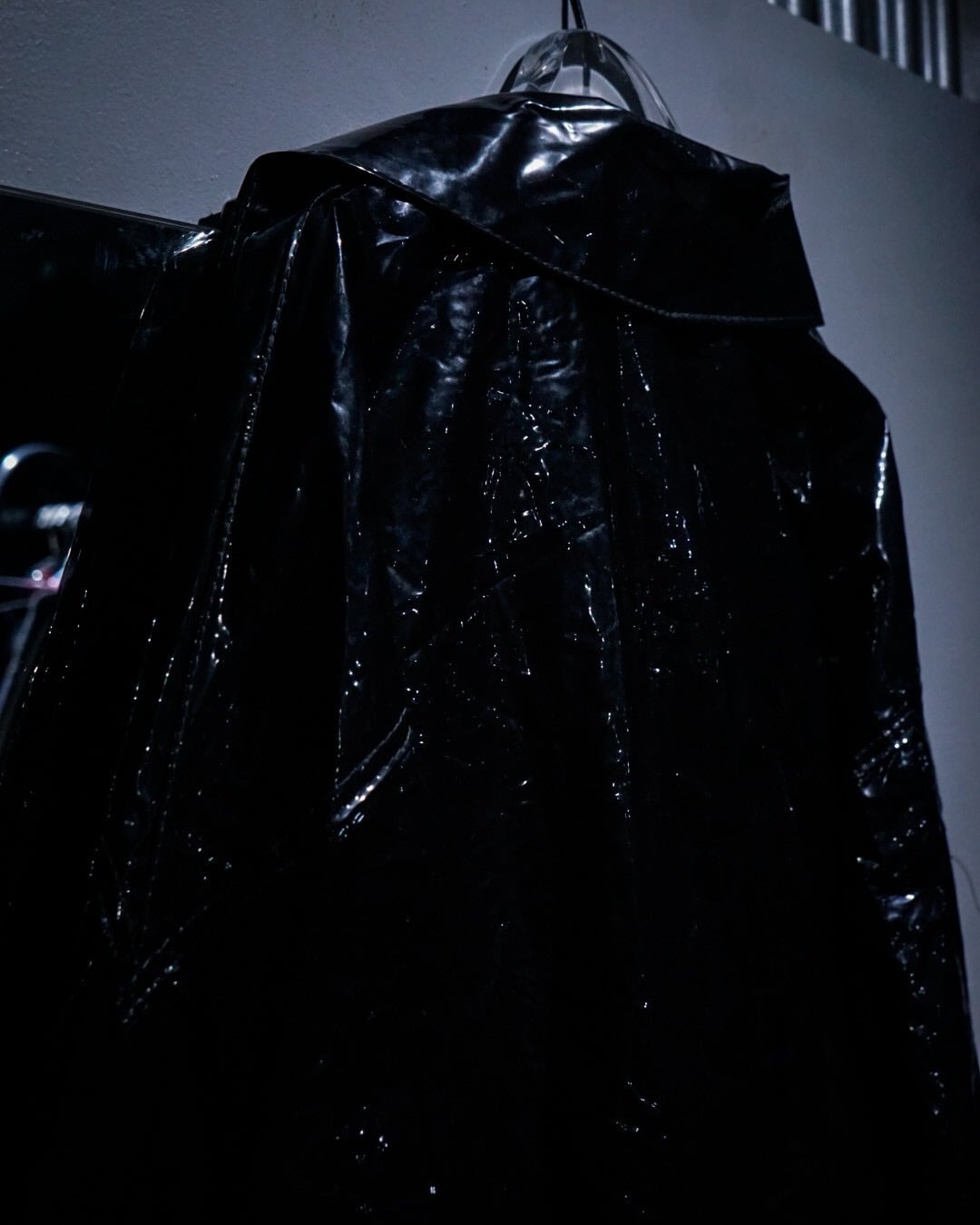 ボディには光沢感のあるブラックビニール素材を採用。シワ感のある質感と強い艶が特徴的で、光の当たり方によって表情を変えるインパクト抜群のファブリック。レザーとはまた異なる空気感を纏った素材使いに、服好きの心がグッと鷲掴みにされます。