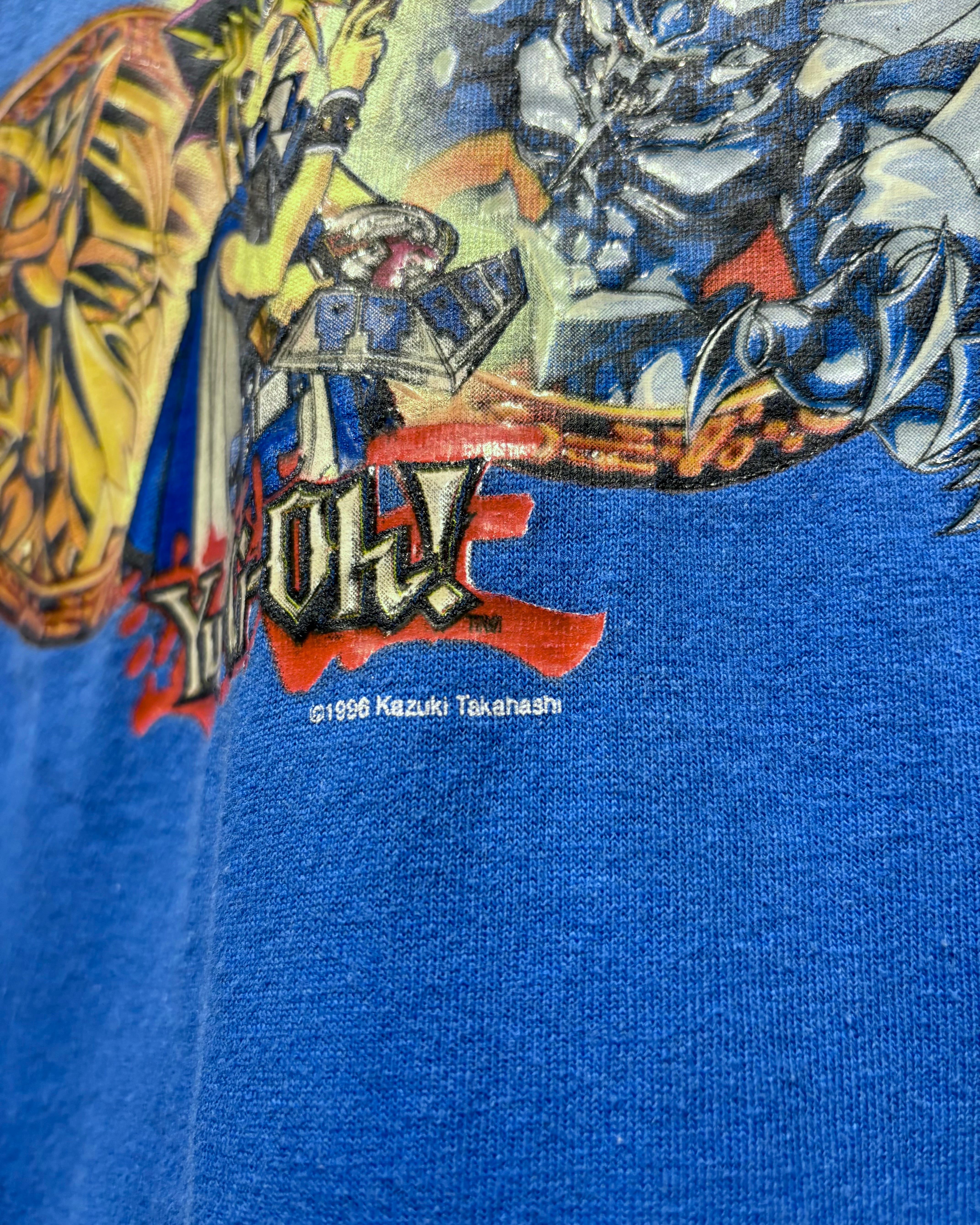 世界中で愛され続けるカードバトル漫画、アニメ作品“遊☆戯☆王”より、主人公“武藤遊戯”と象徴的モンスター“三幻神”を大胆に落とし込んだ90’sのロンT。