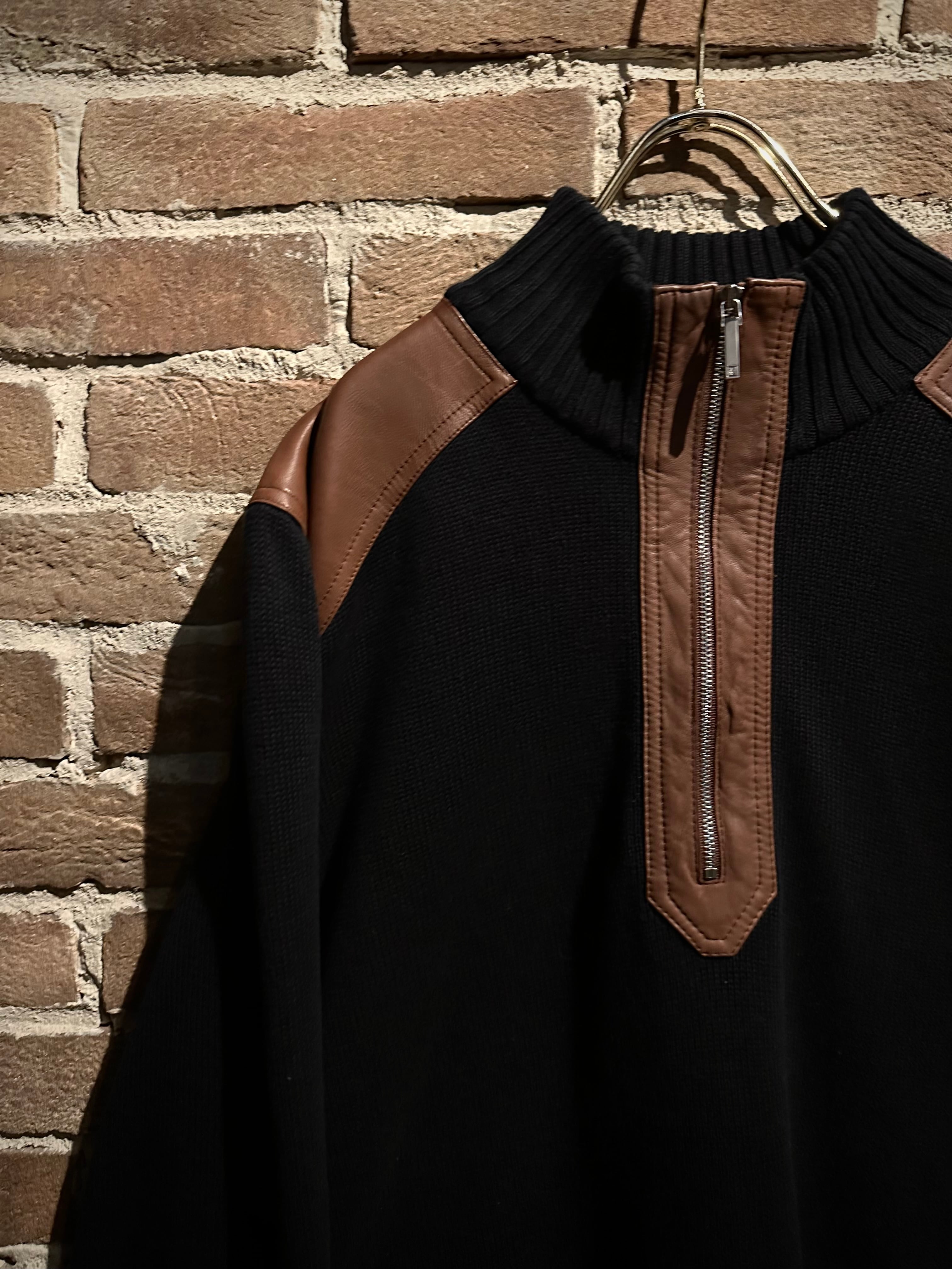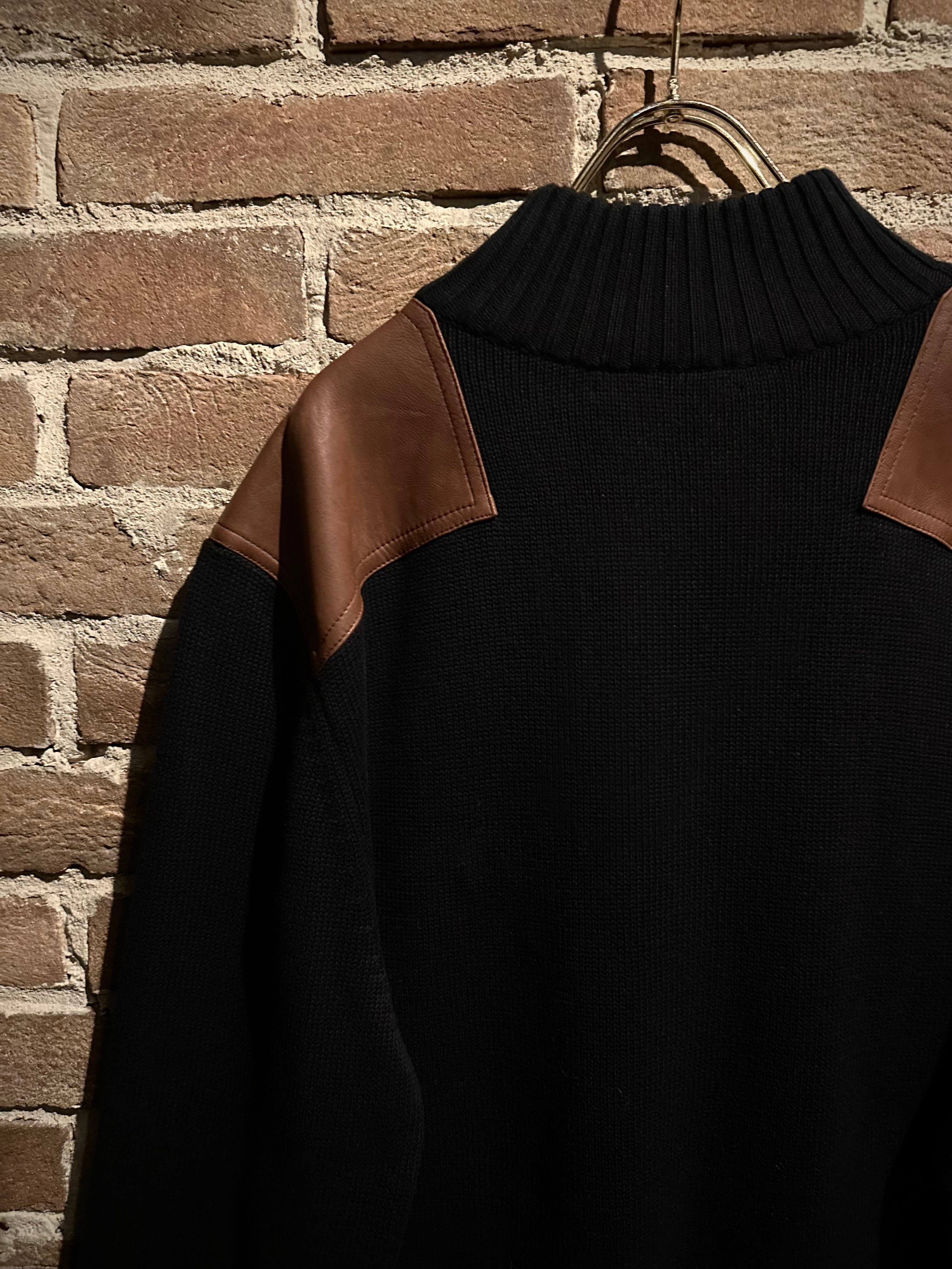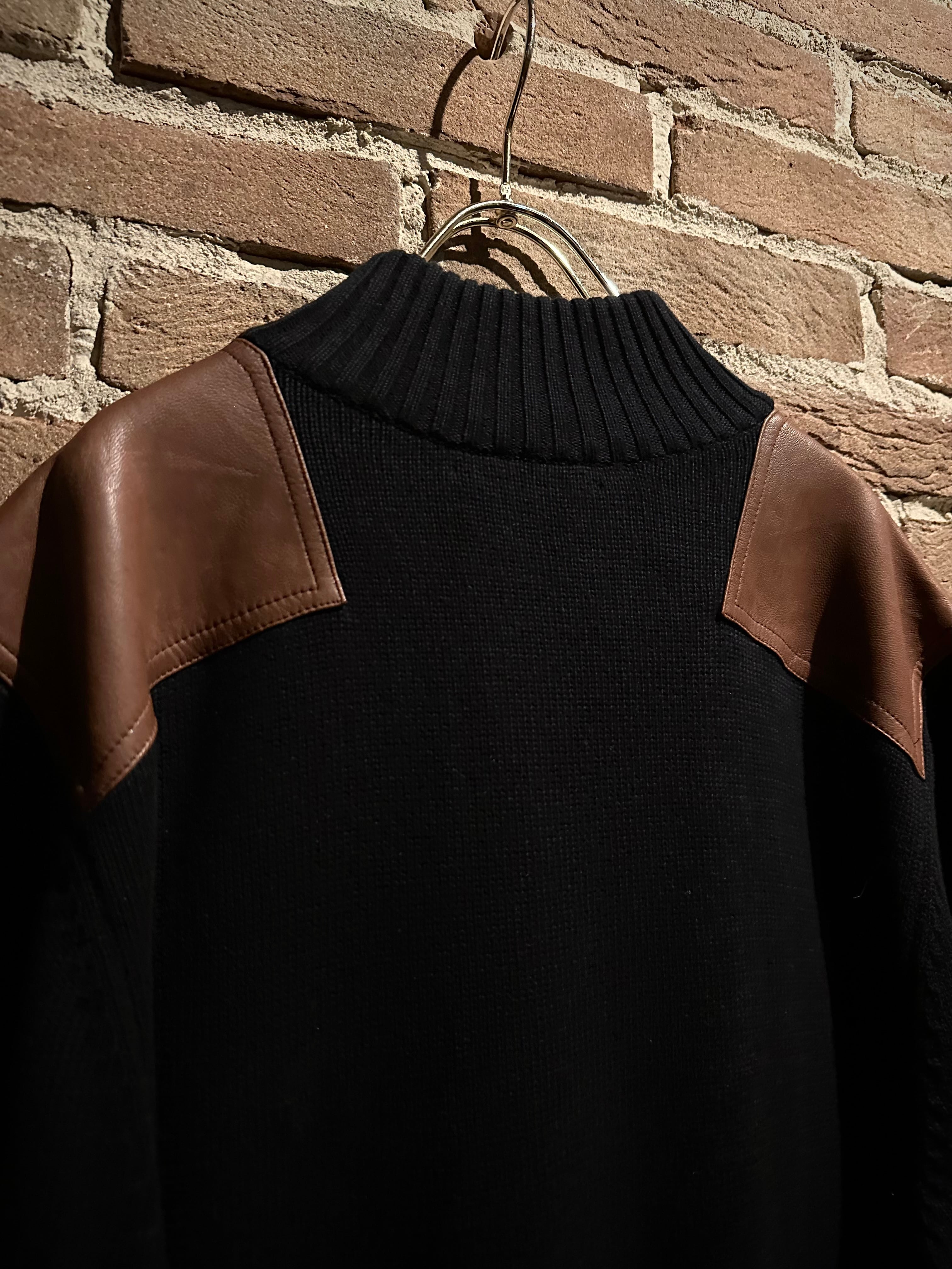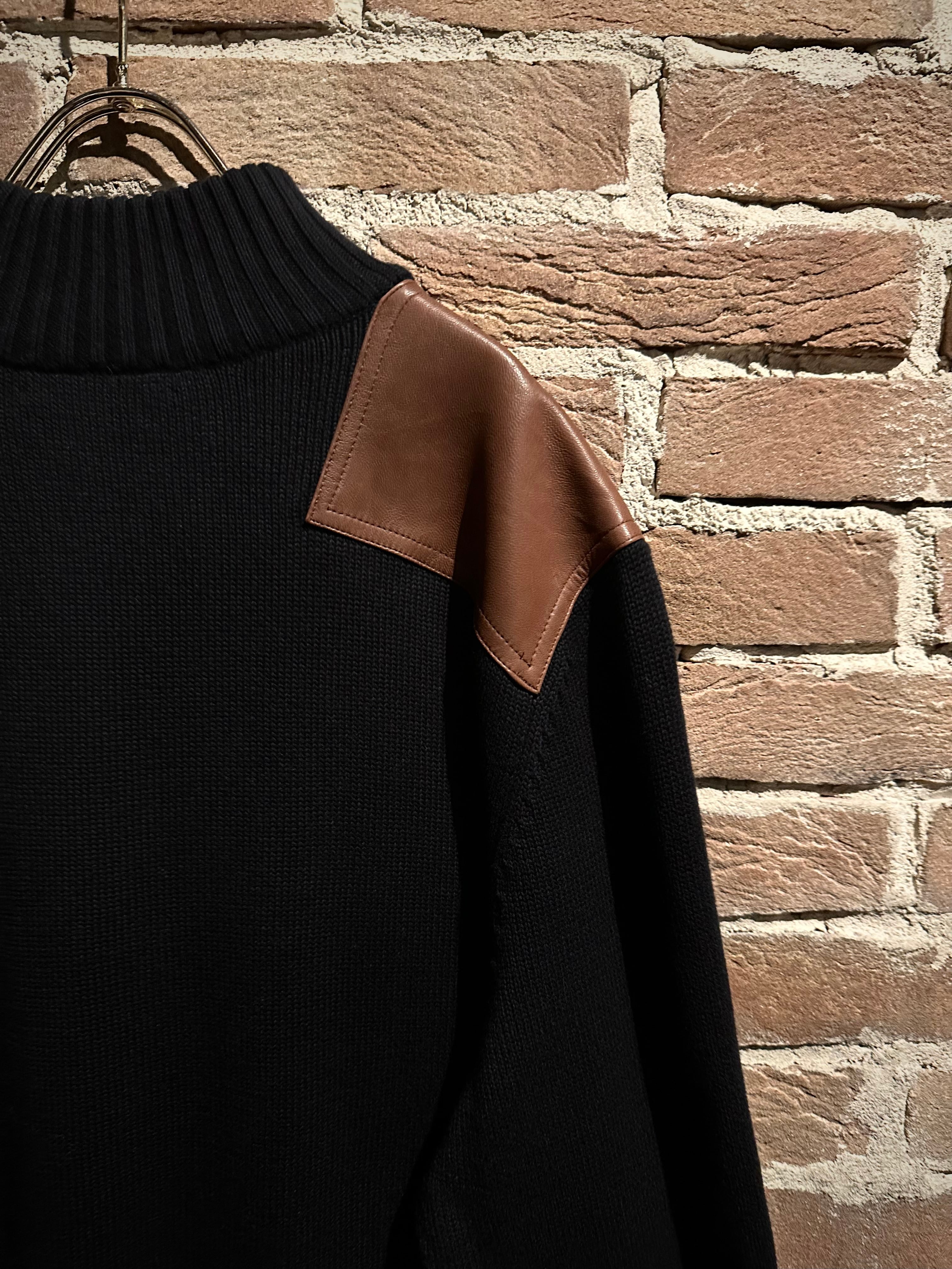 シンプルなニットボディに対し、肩とフロントの切り替えにはブラウンのレザーを配した1着。