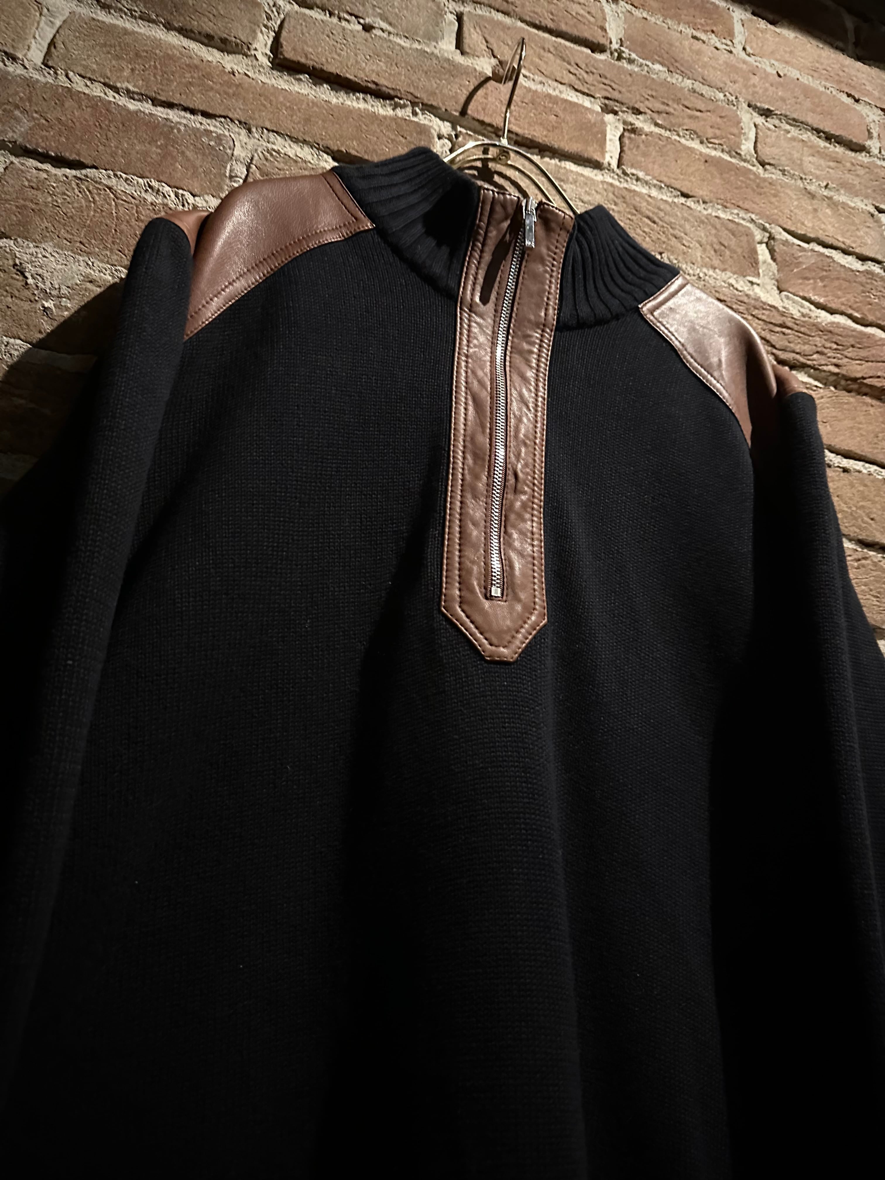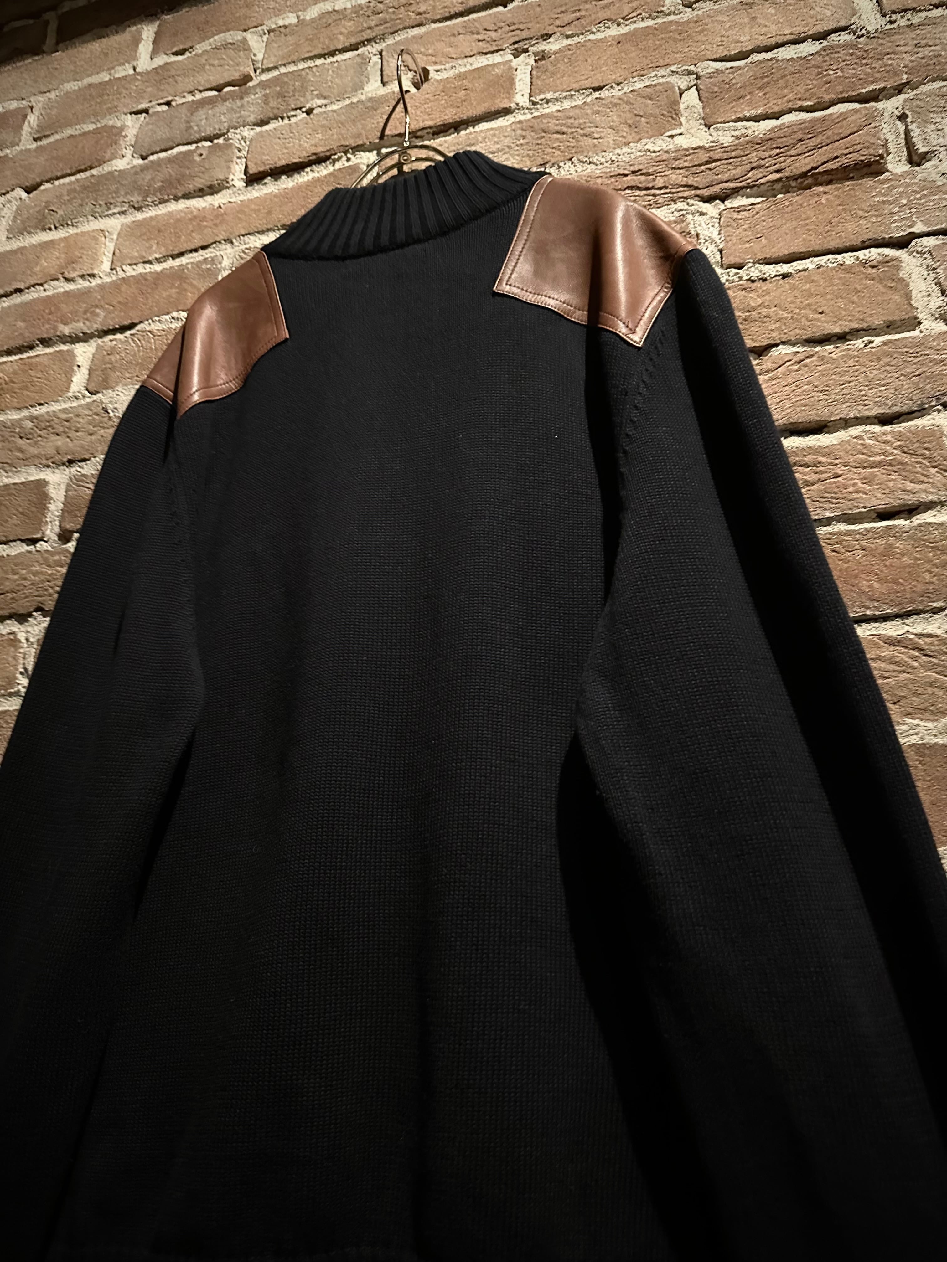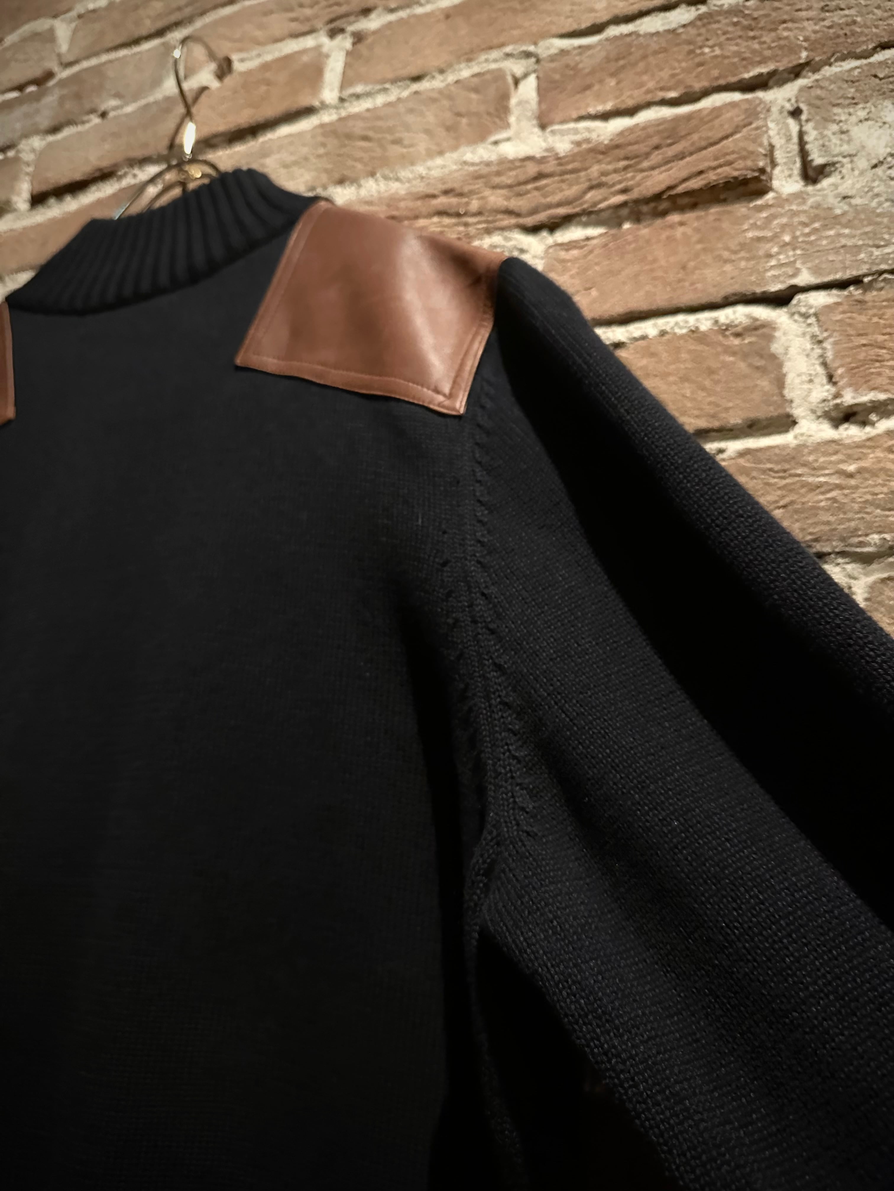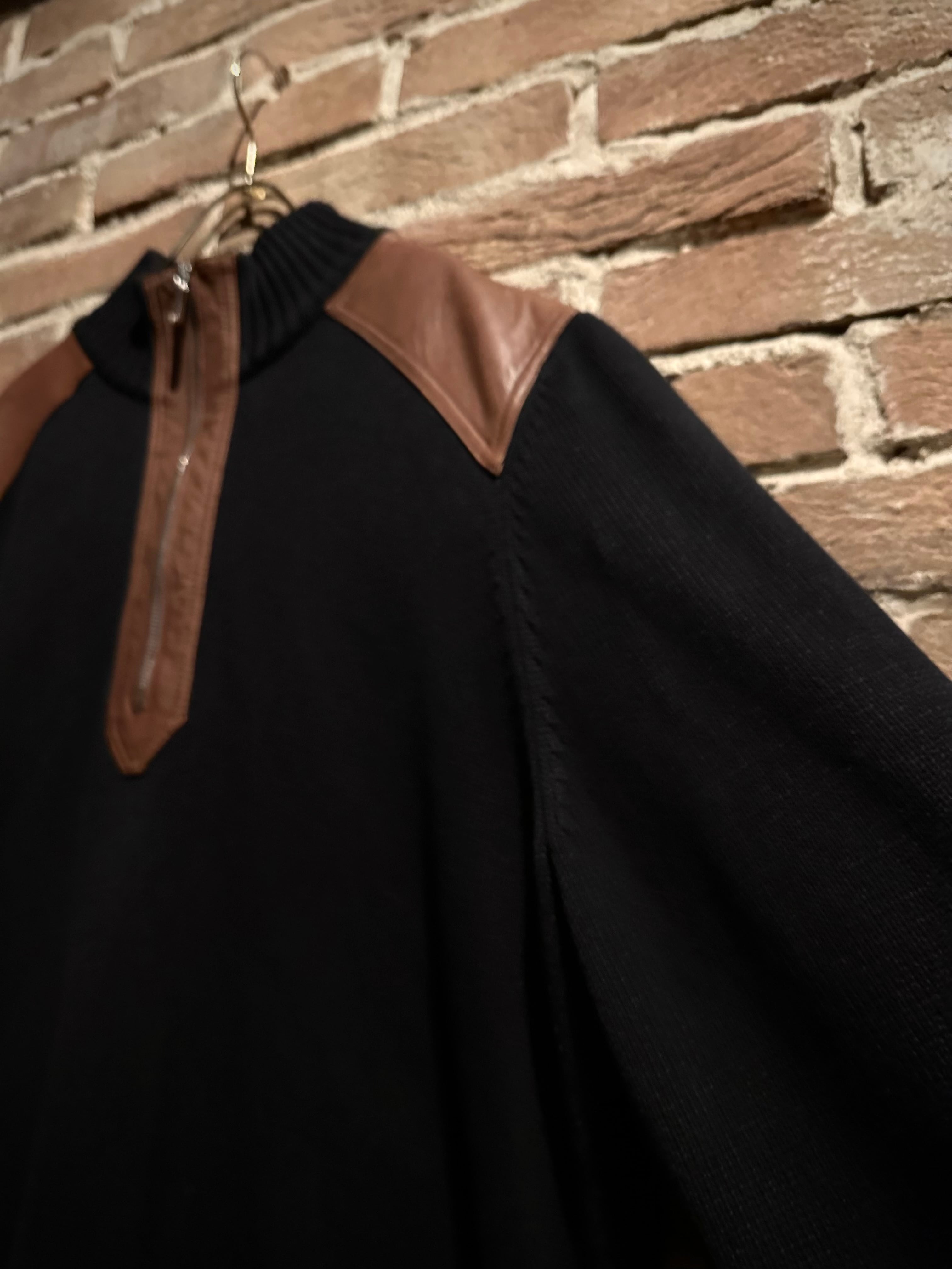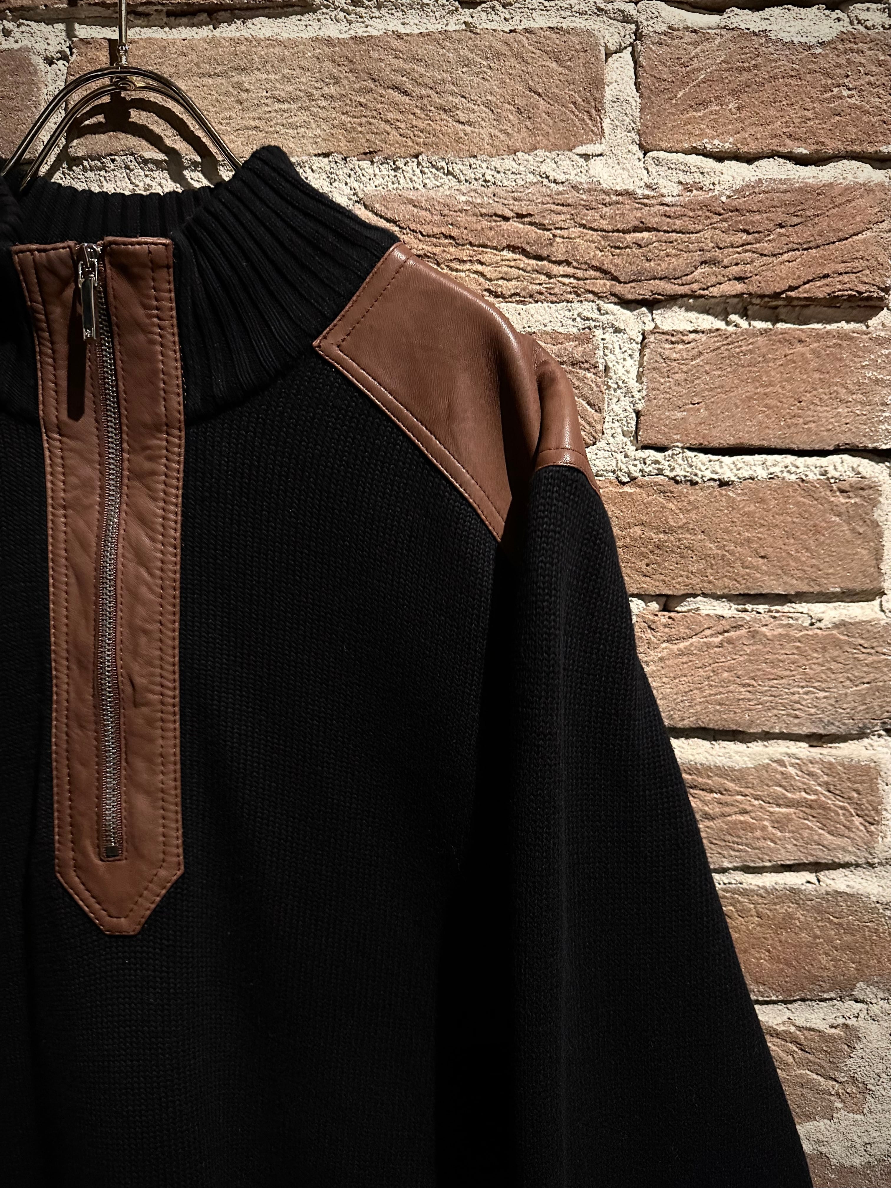 シンプルなニットボディに対し、肩とフロントの切り替えにはブラウンのレザーを配した1着。