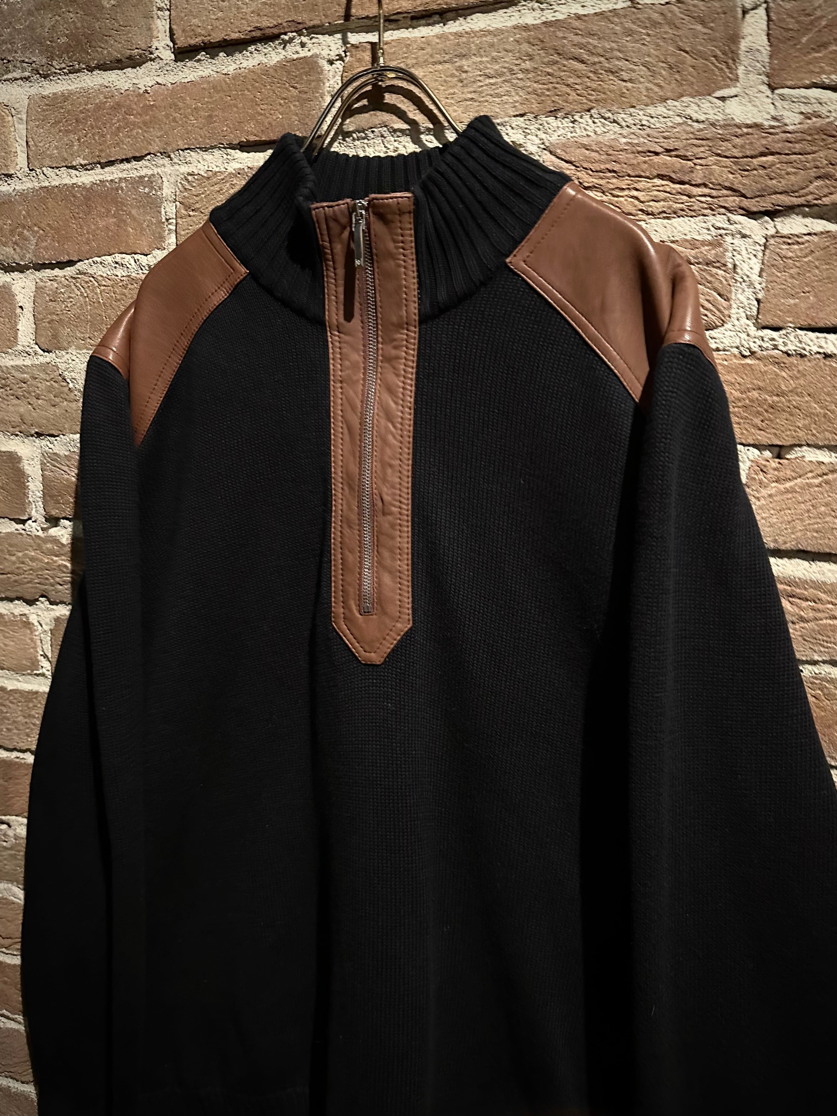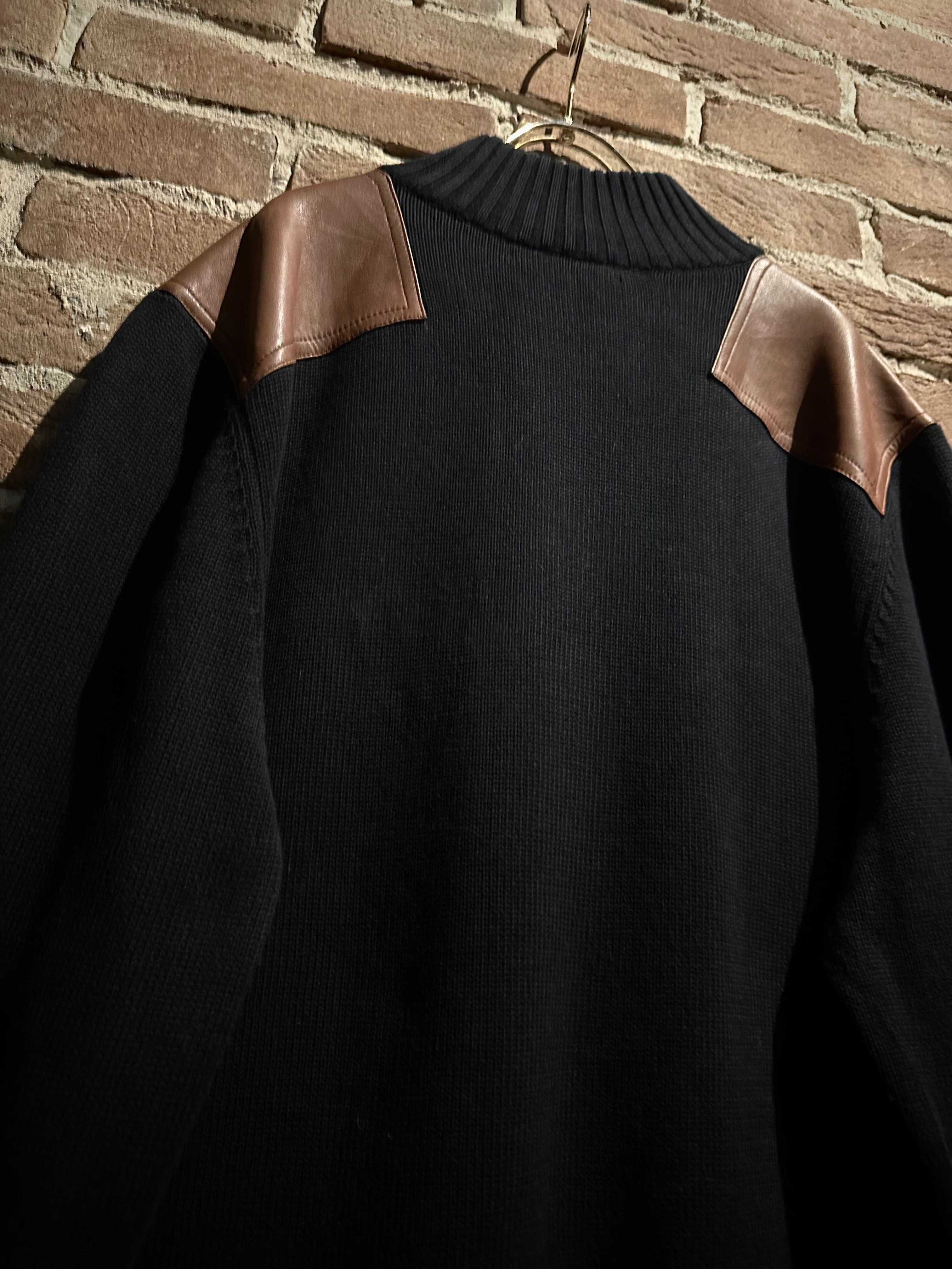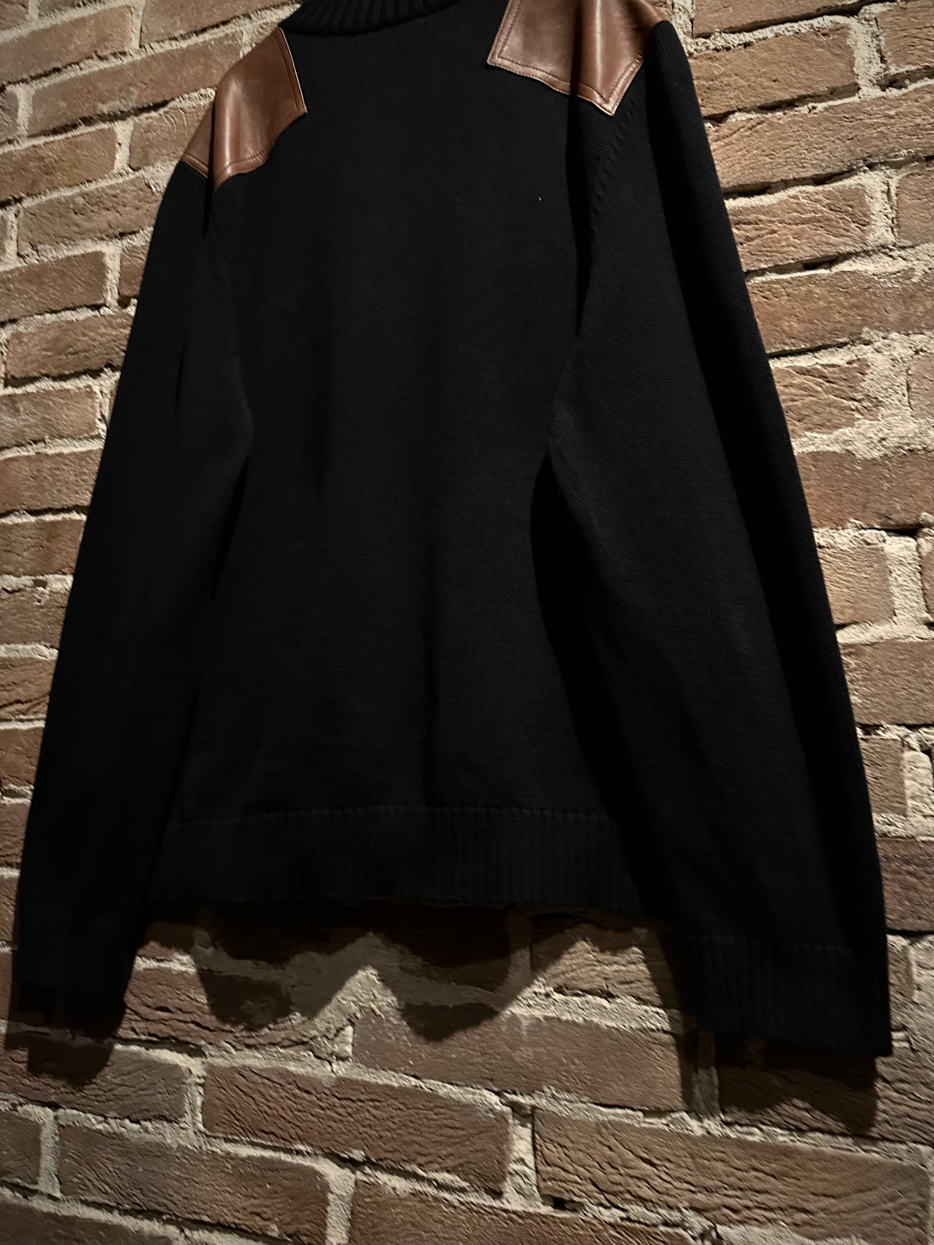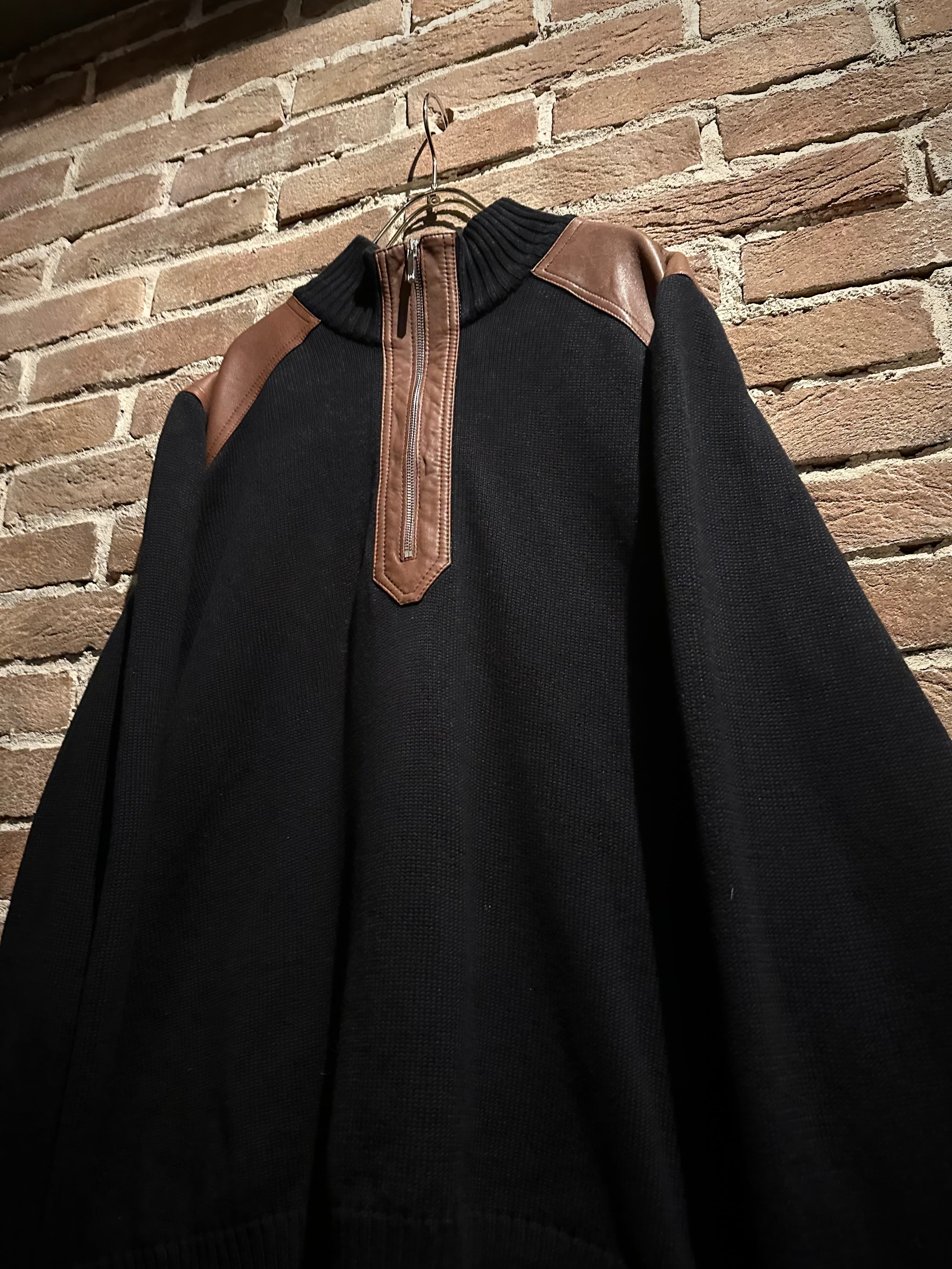 シンプルなニットボディに対し、肩とフロントの切り替えにはブラウンのレザーを配した1着。