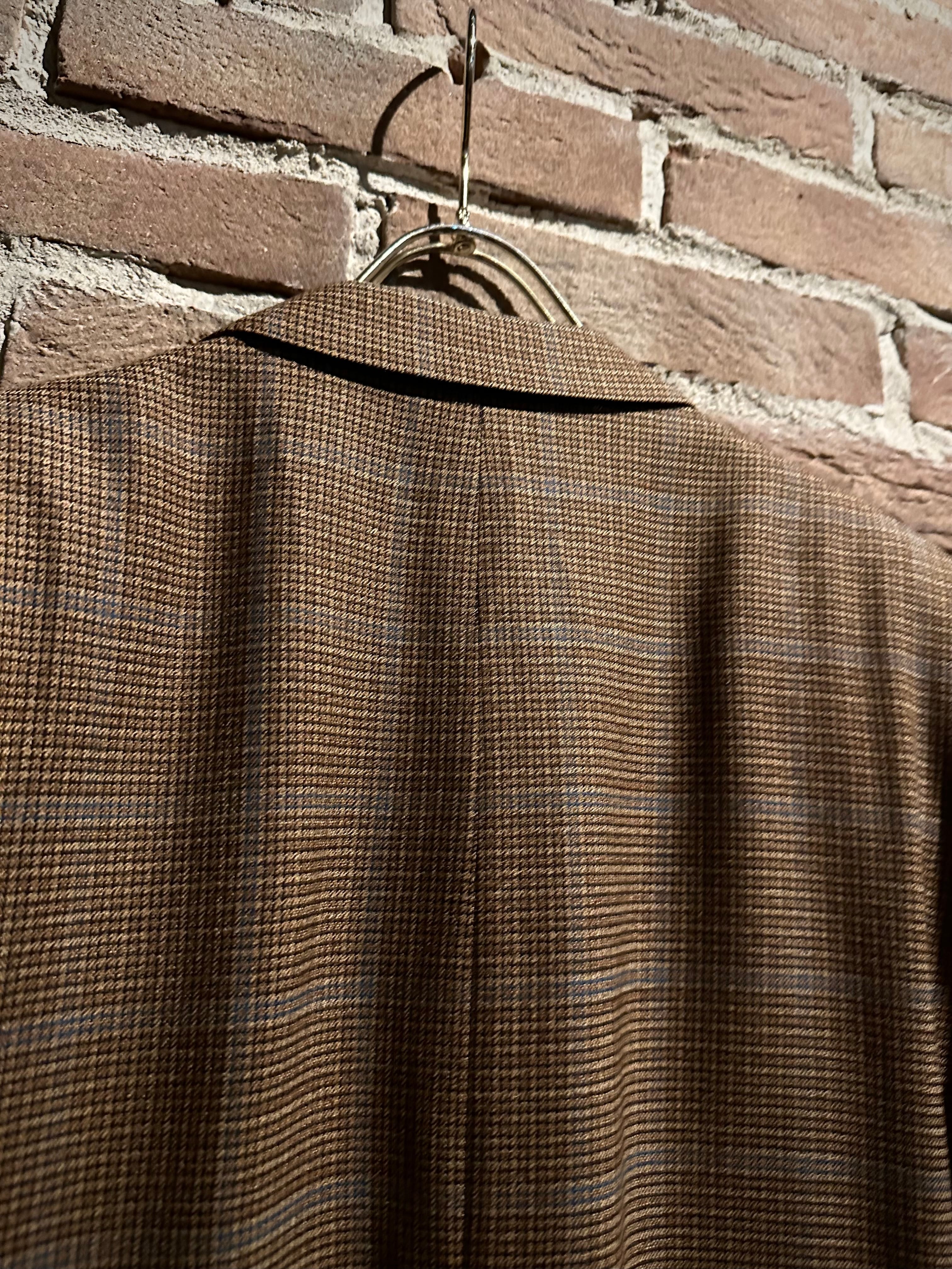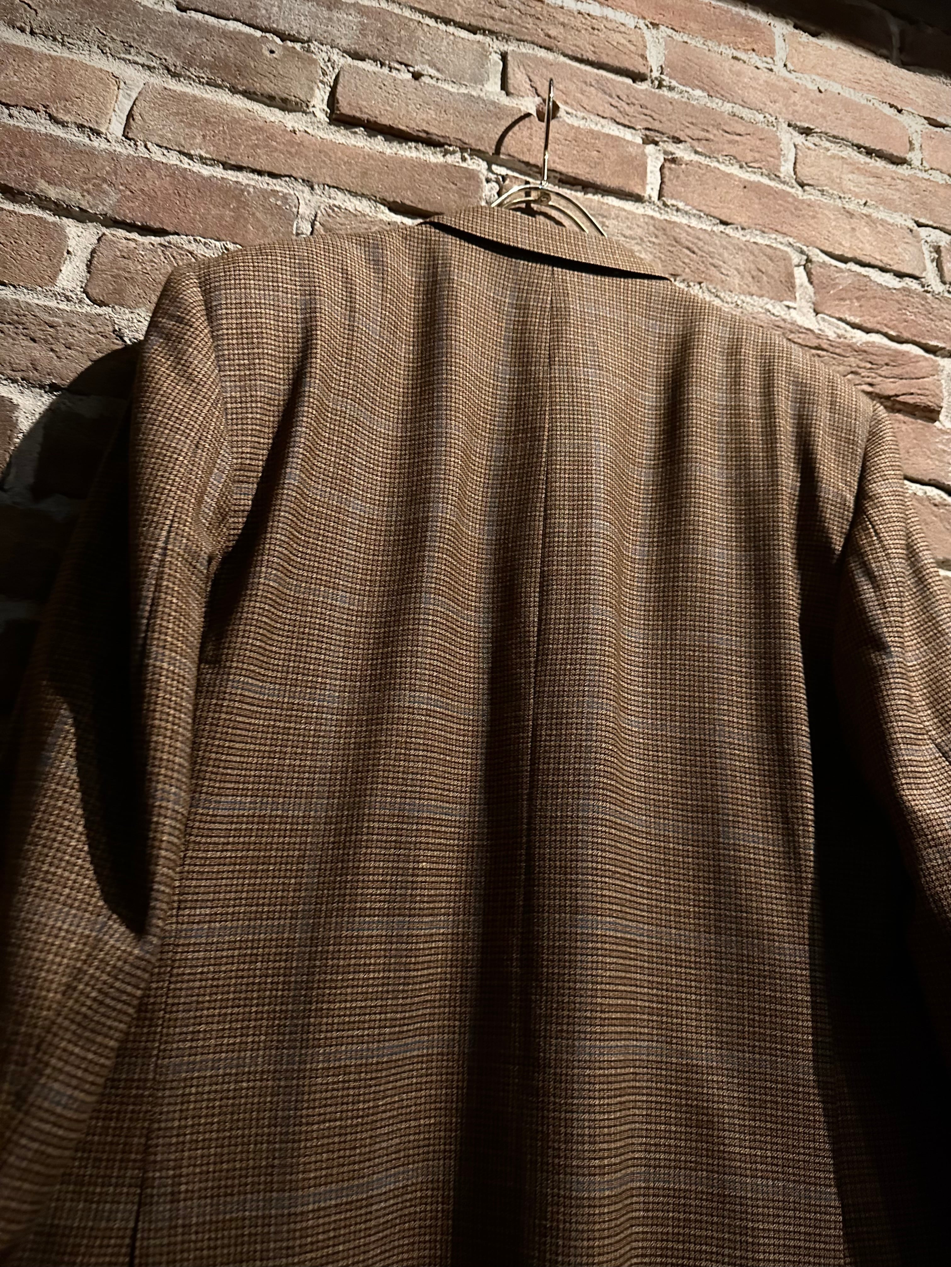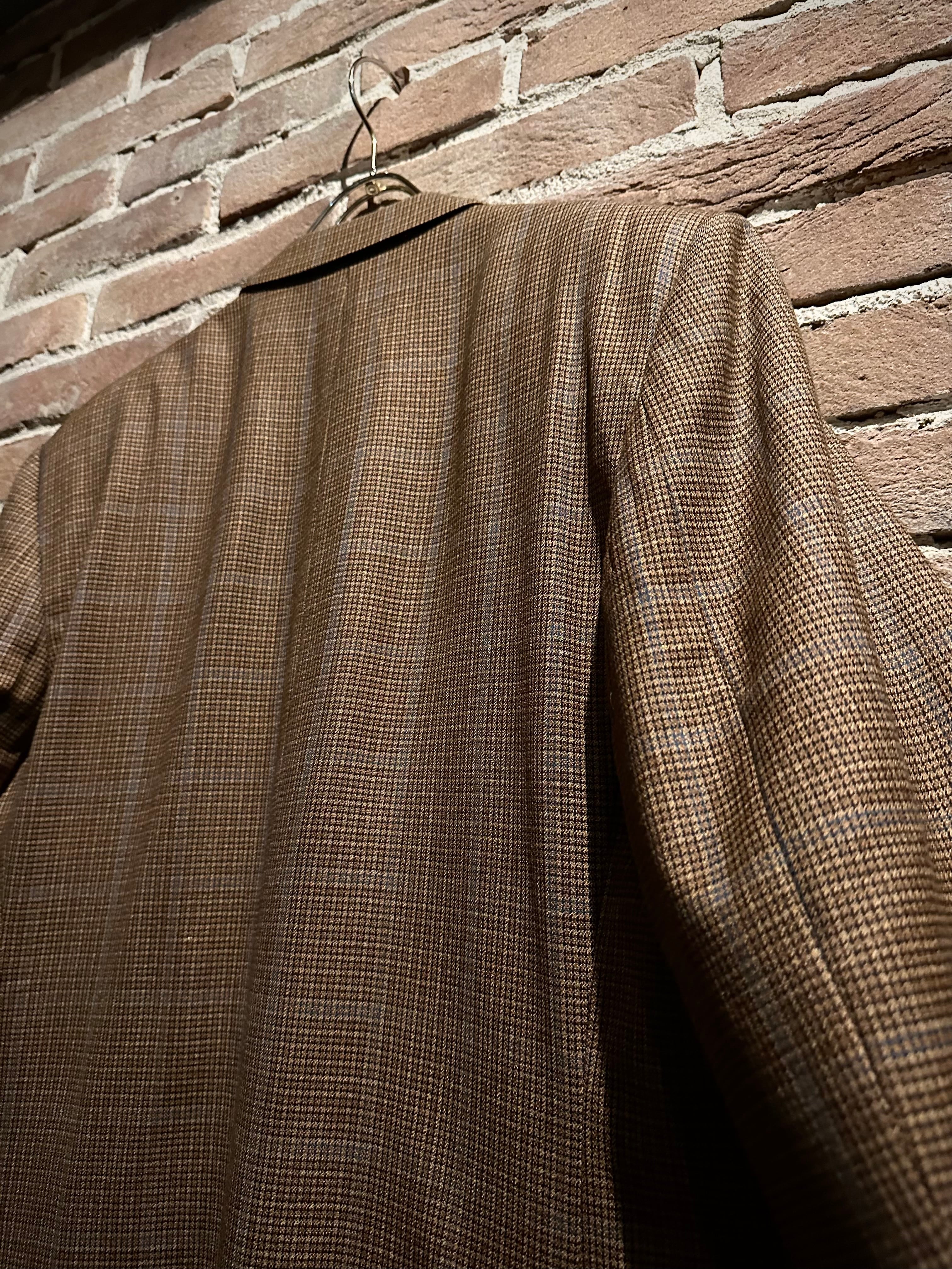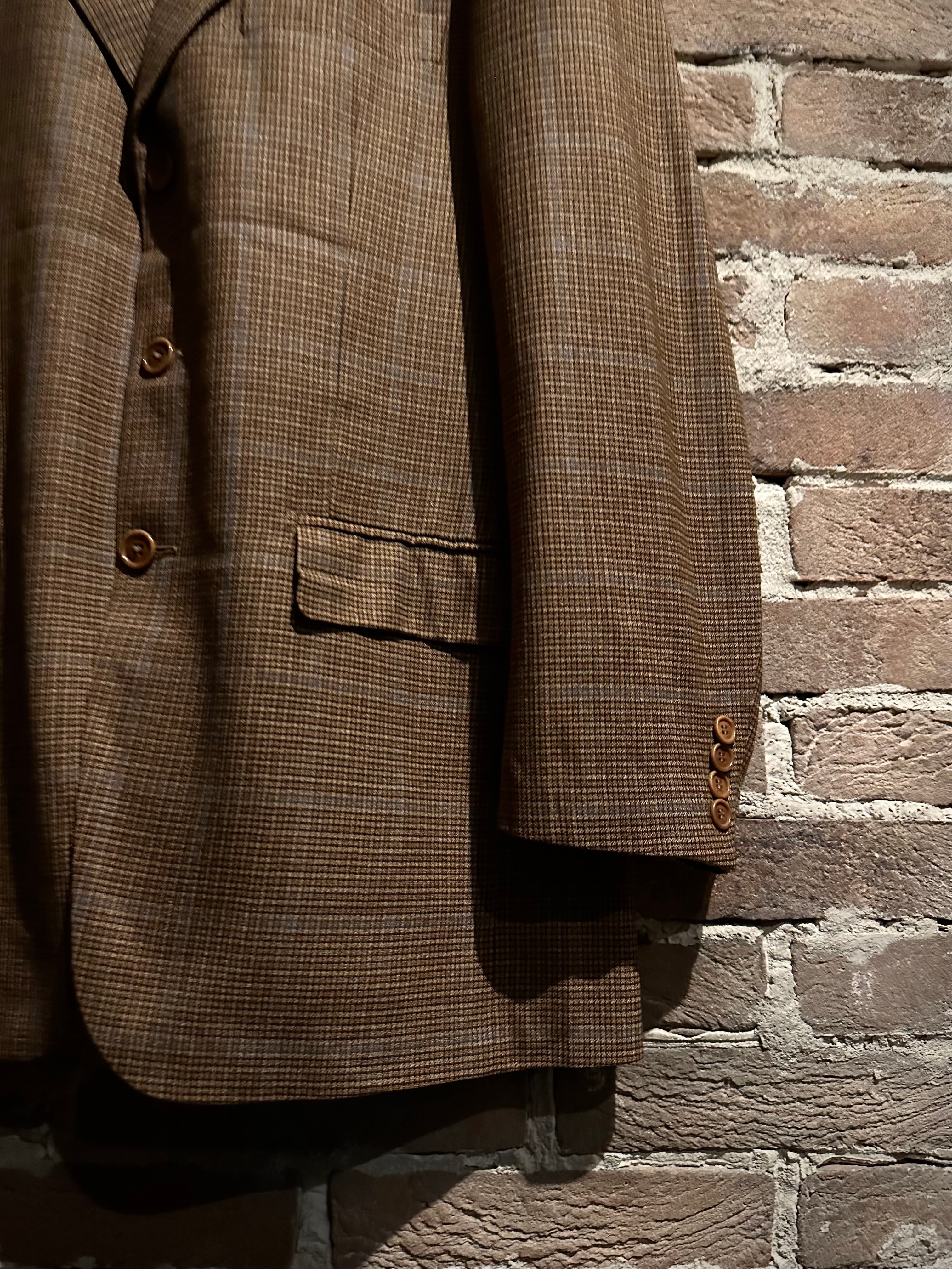 ブラウンを基調とした細かな織り柄に、うっすらとブルーのラインが走ることで奥行きのある表情を演出した1着。