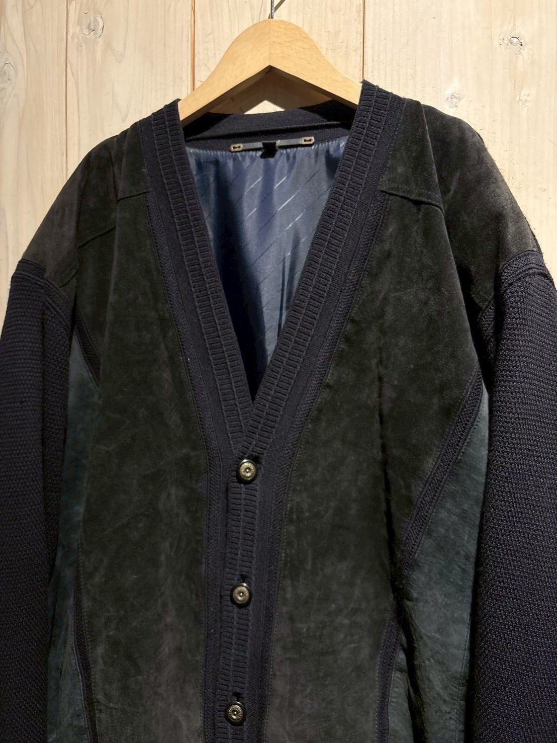 異素材の質感と落ち着いたネイビーカラーが織りなす洗練された佇まい。汎用性も併せ持ったカーディガンジャケットの逸品です。