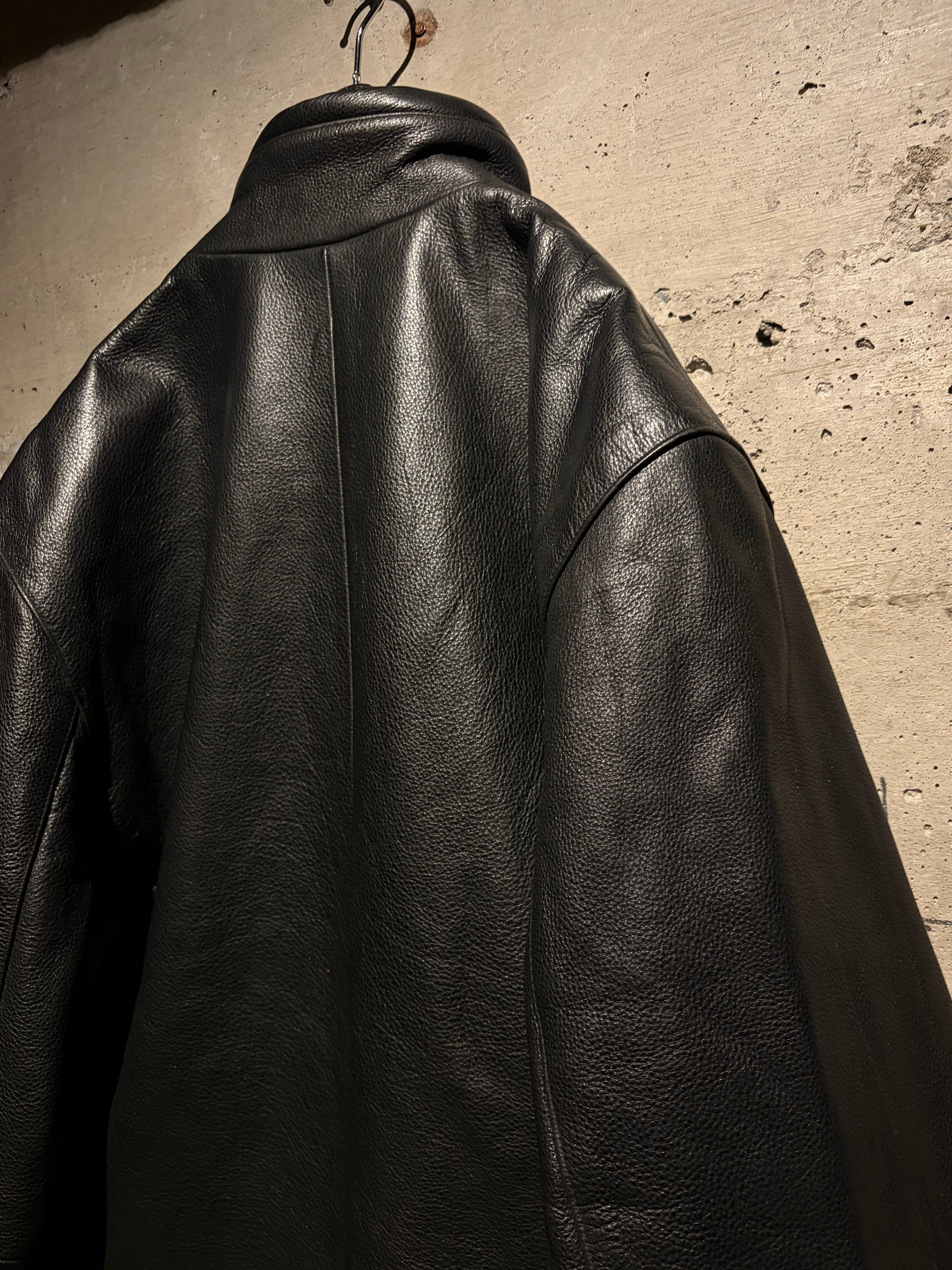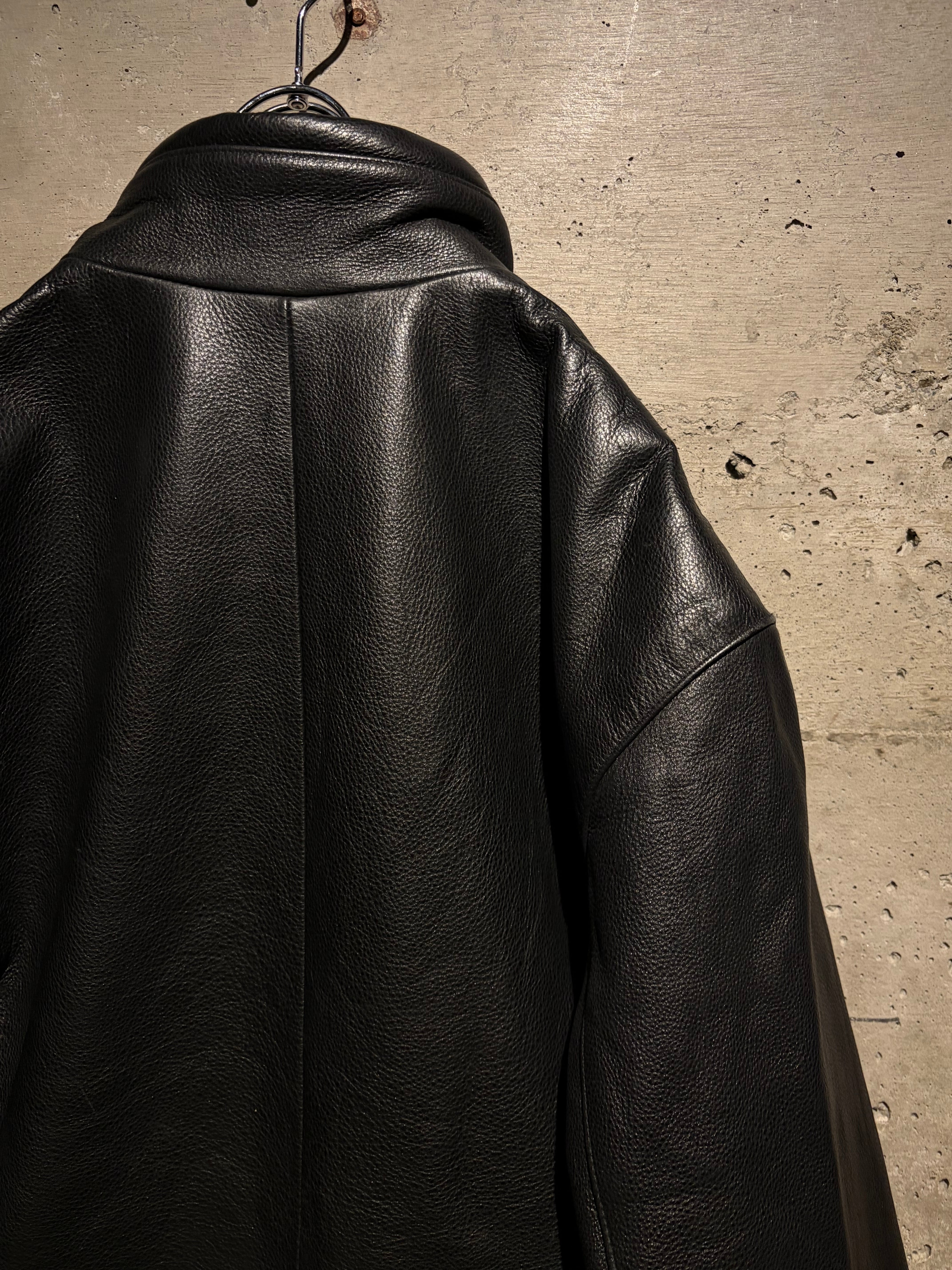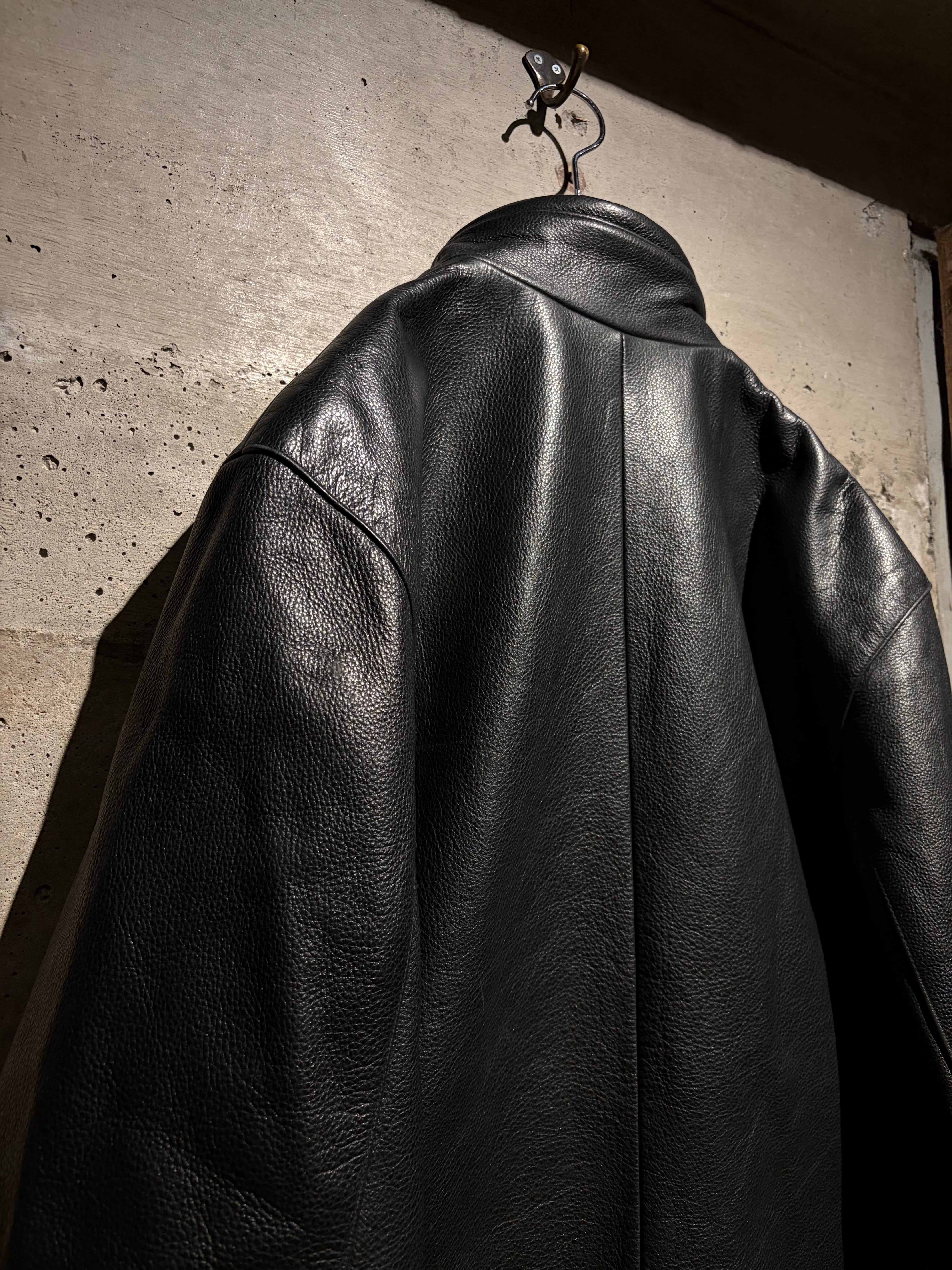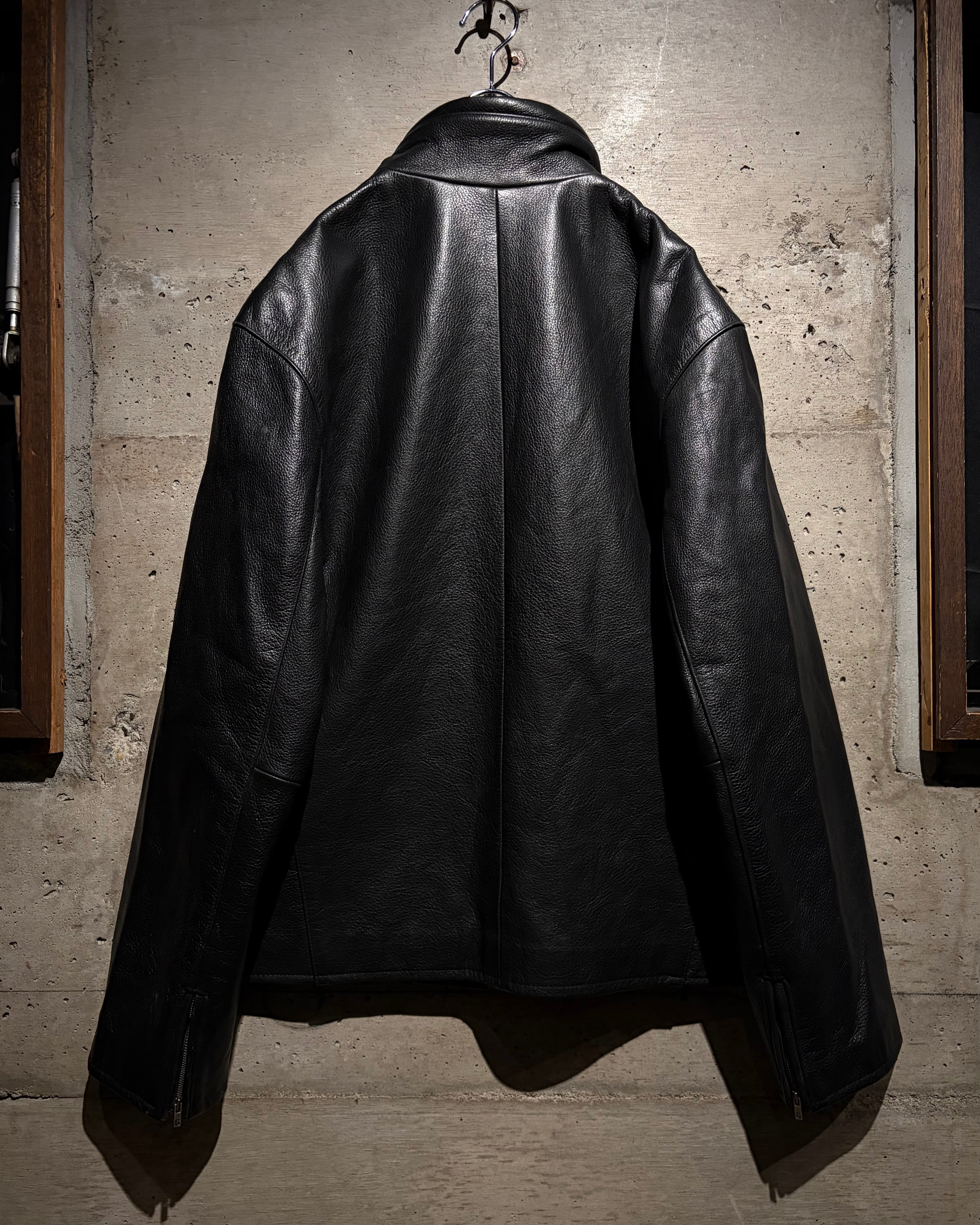 フロントにはジップポケット、両サイドにはスラッシュポケットを配置したミニマルなデザイン。無駄を削ぎ落とした構成がレザーの質感を際立たせ、洗練された佇まいを演出しています。