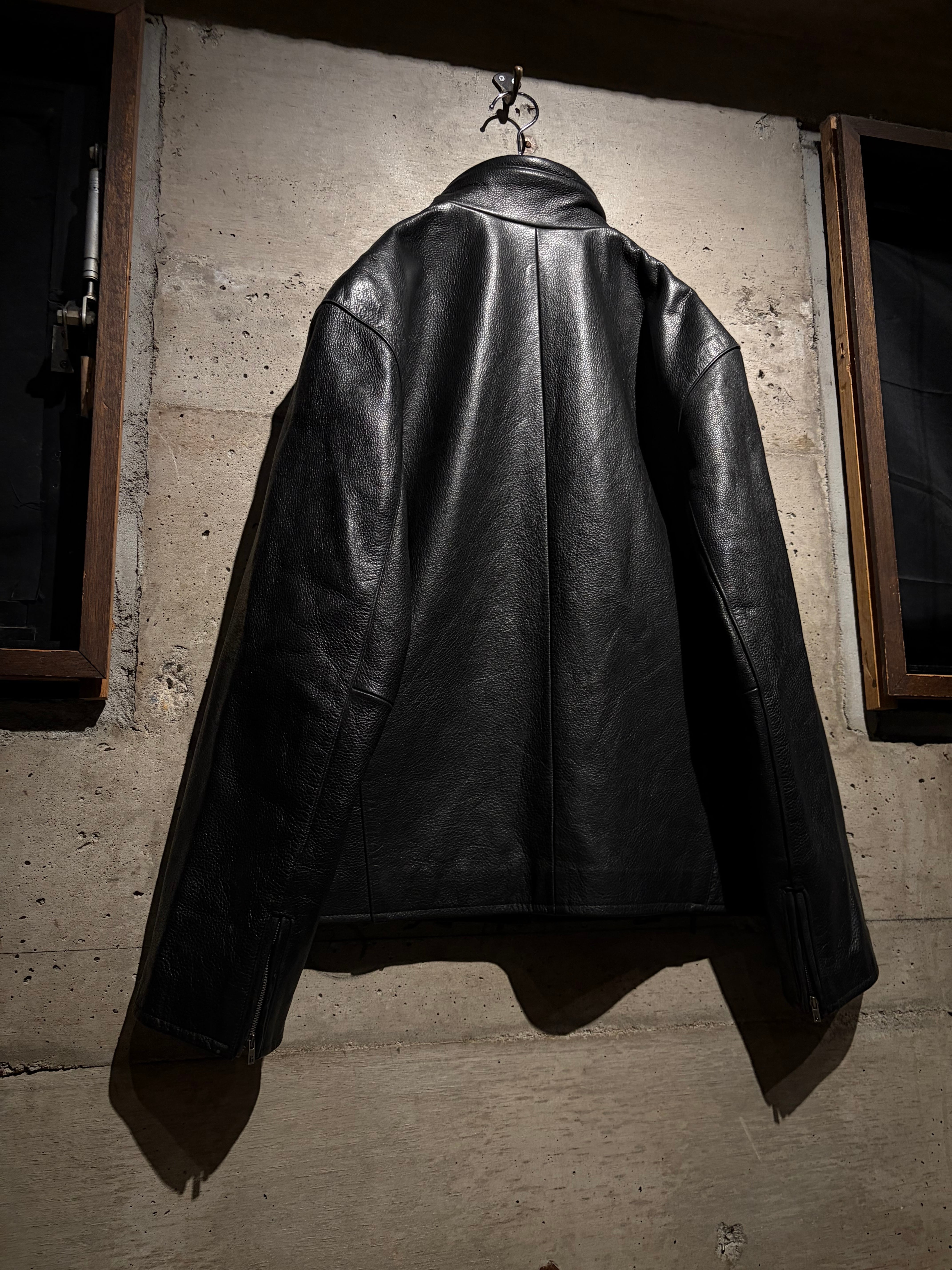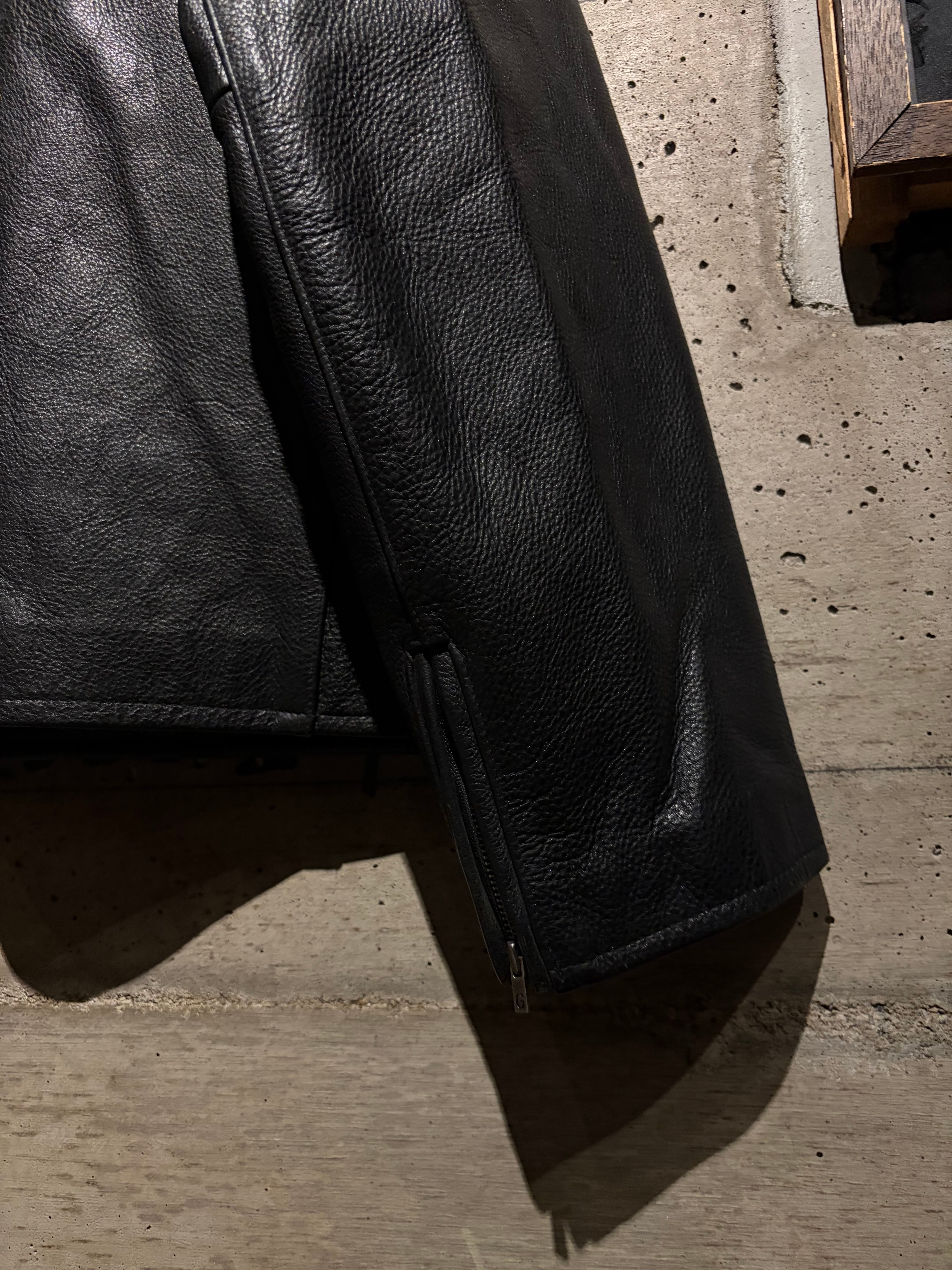 ボディにはハリと柔らかさを兼ね備えた上質なブラックレザーを採用。しっとりとした質感と滑らかな表情を持ち、着込むほどに深みのある風合いへと変化していくレザーならではの魅力を存分に楽しめる逸品です。