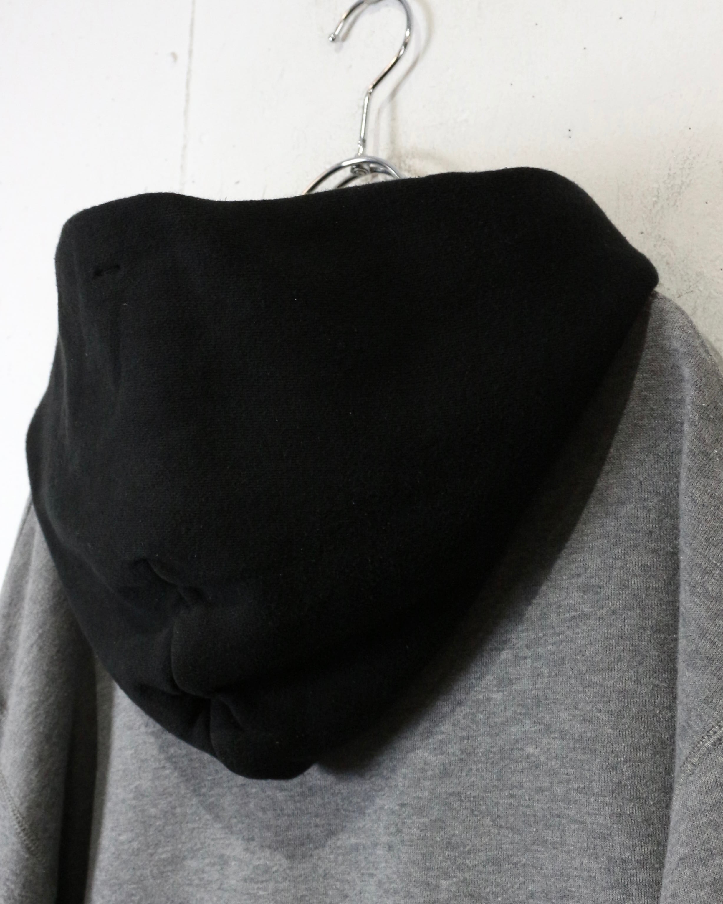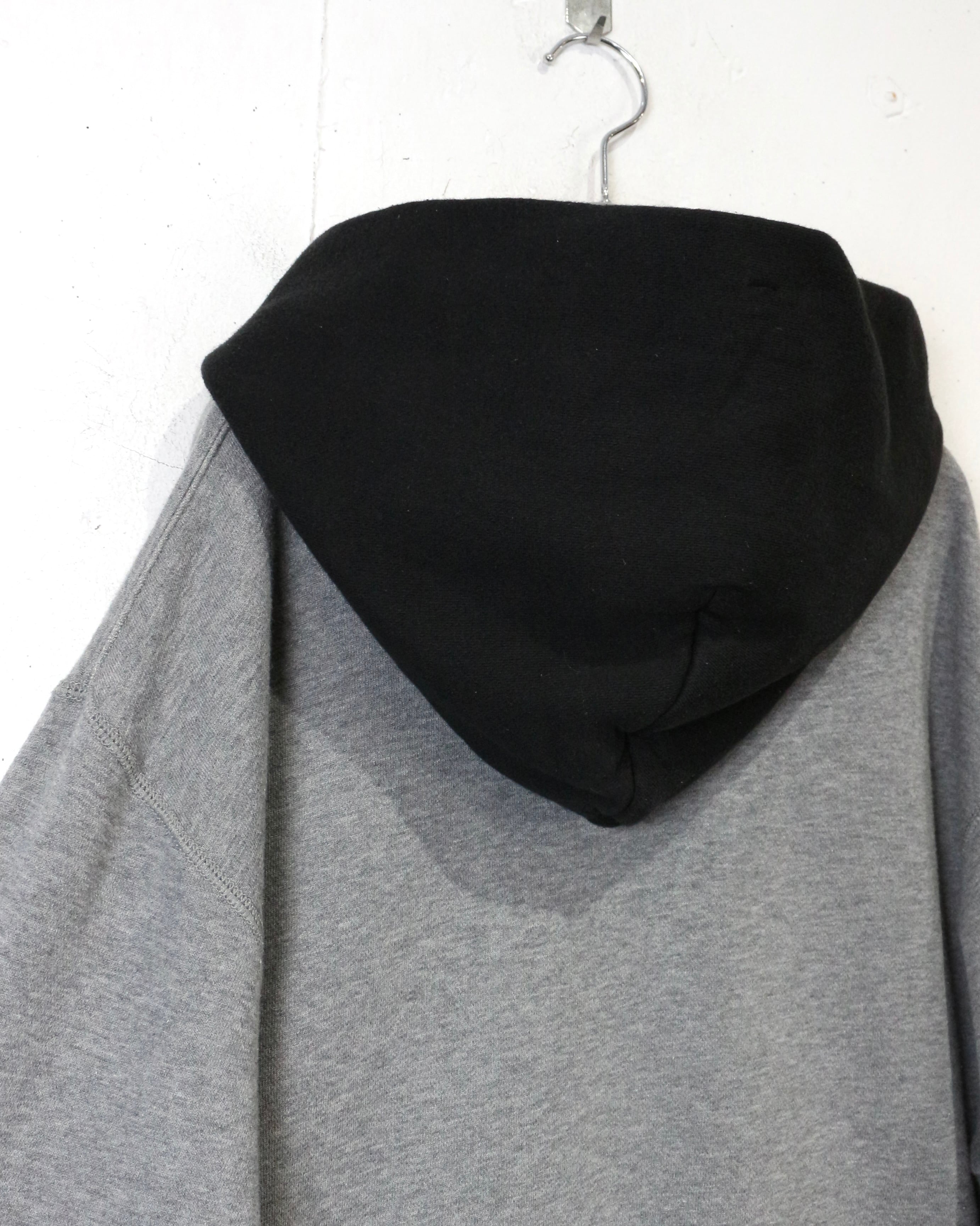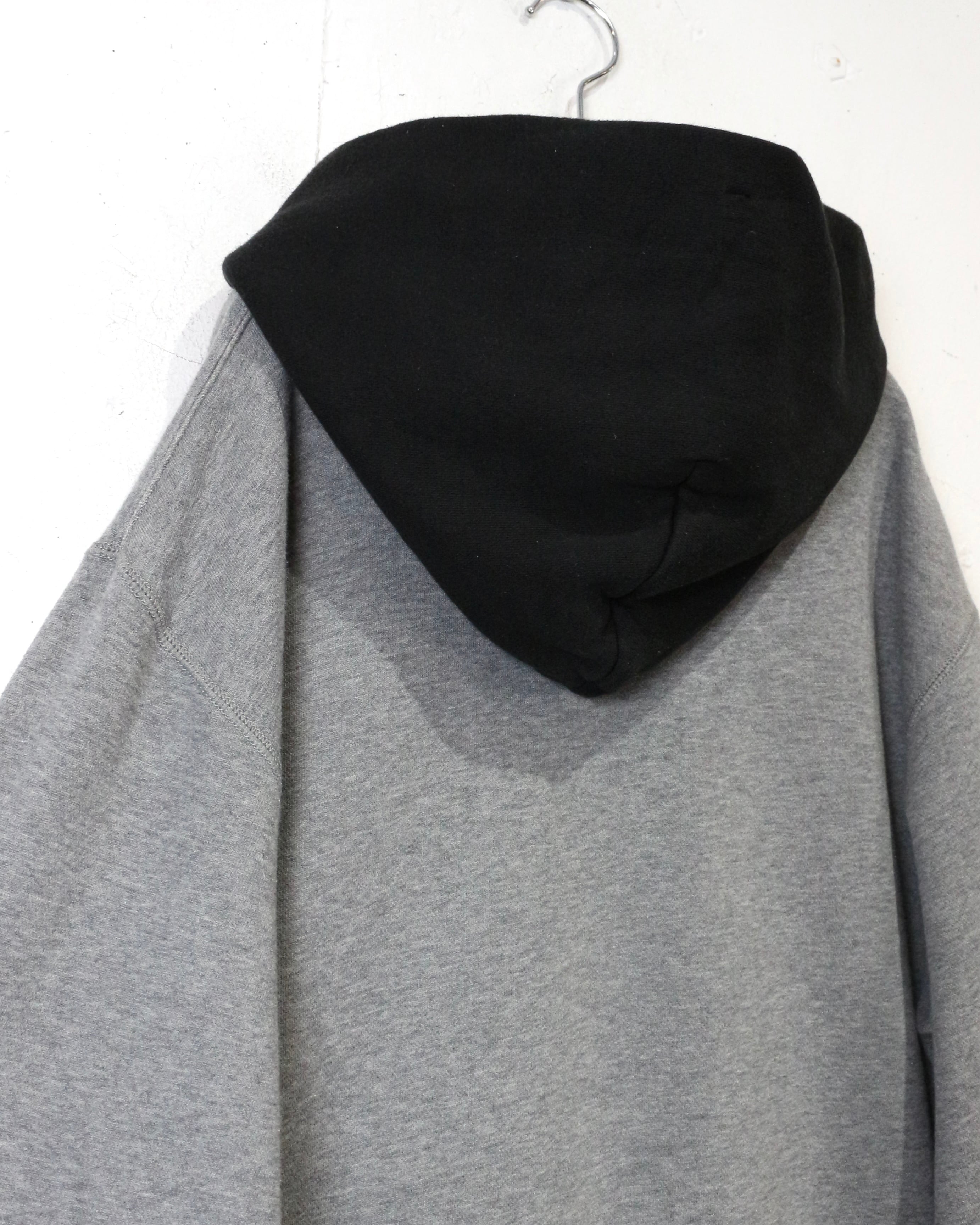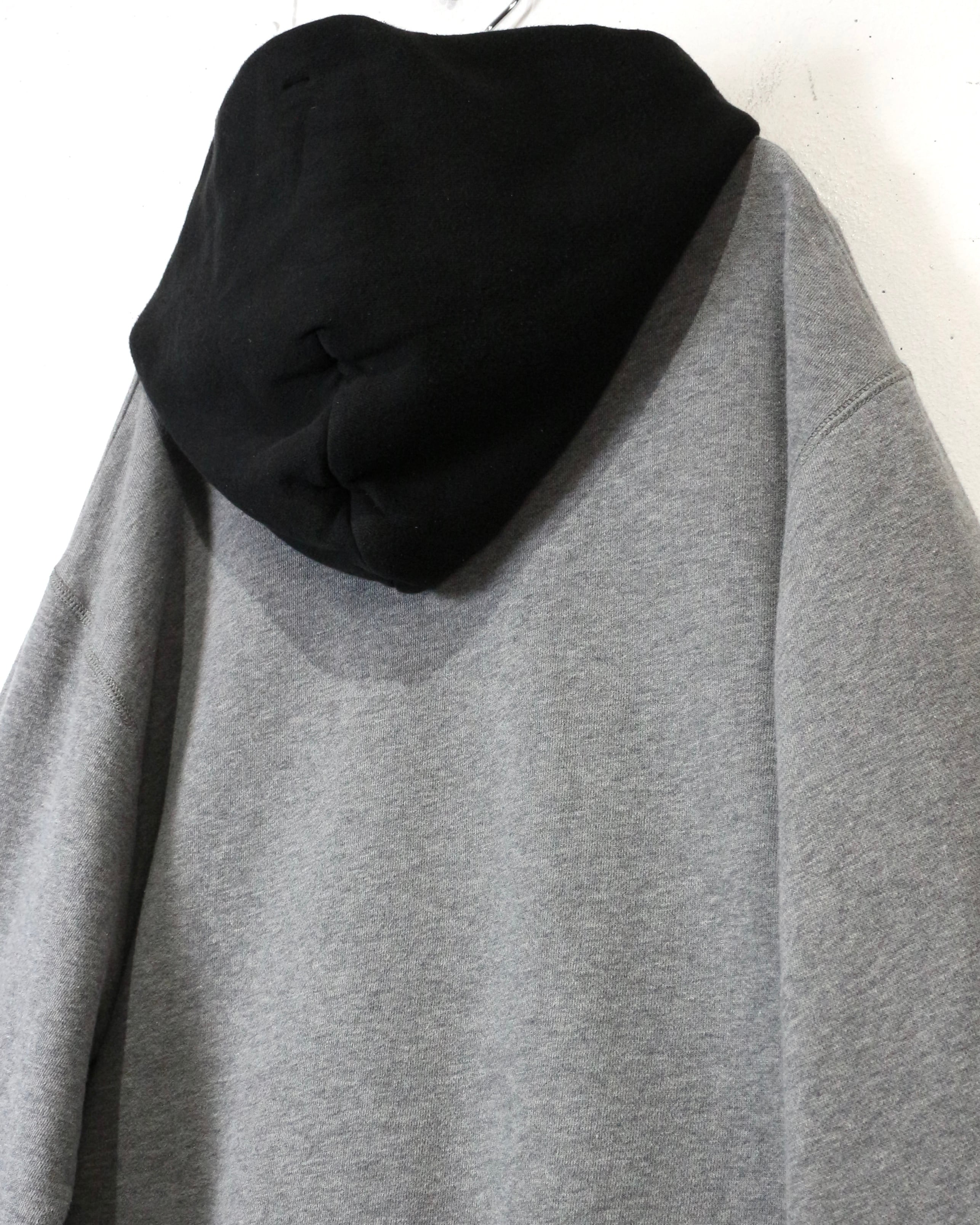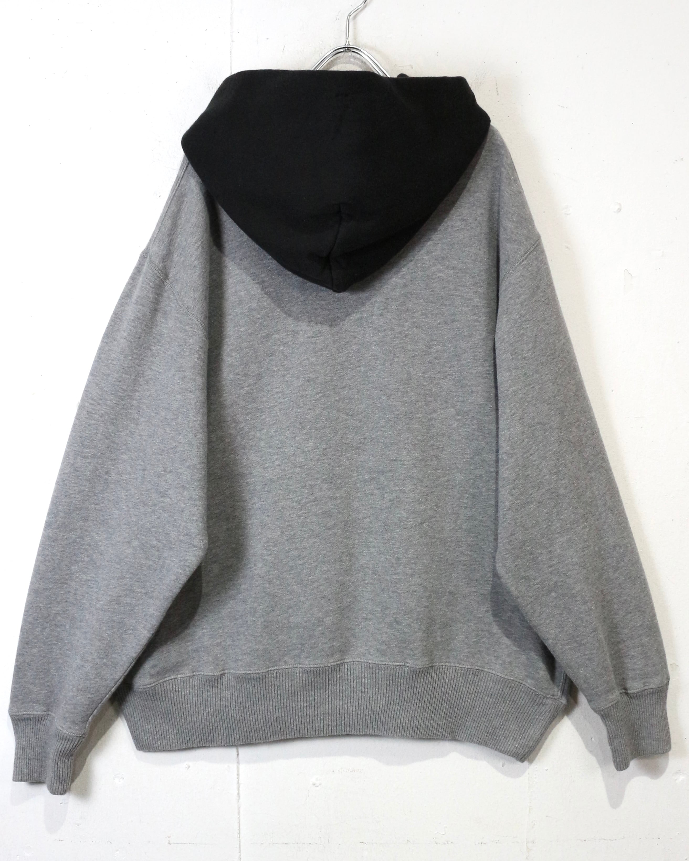 さらにフード部分は後付けしたようなブラックカラーで切り替えられた2トーン仕様。シンプルなグレースウェットにコントラストを加え、程よく引き締まったデザインバランスに仕上がっています。