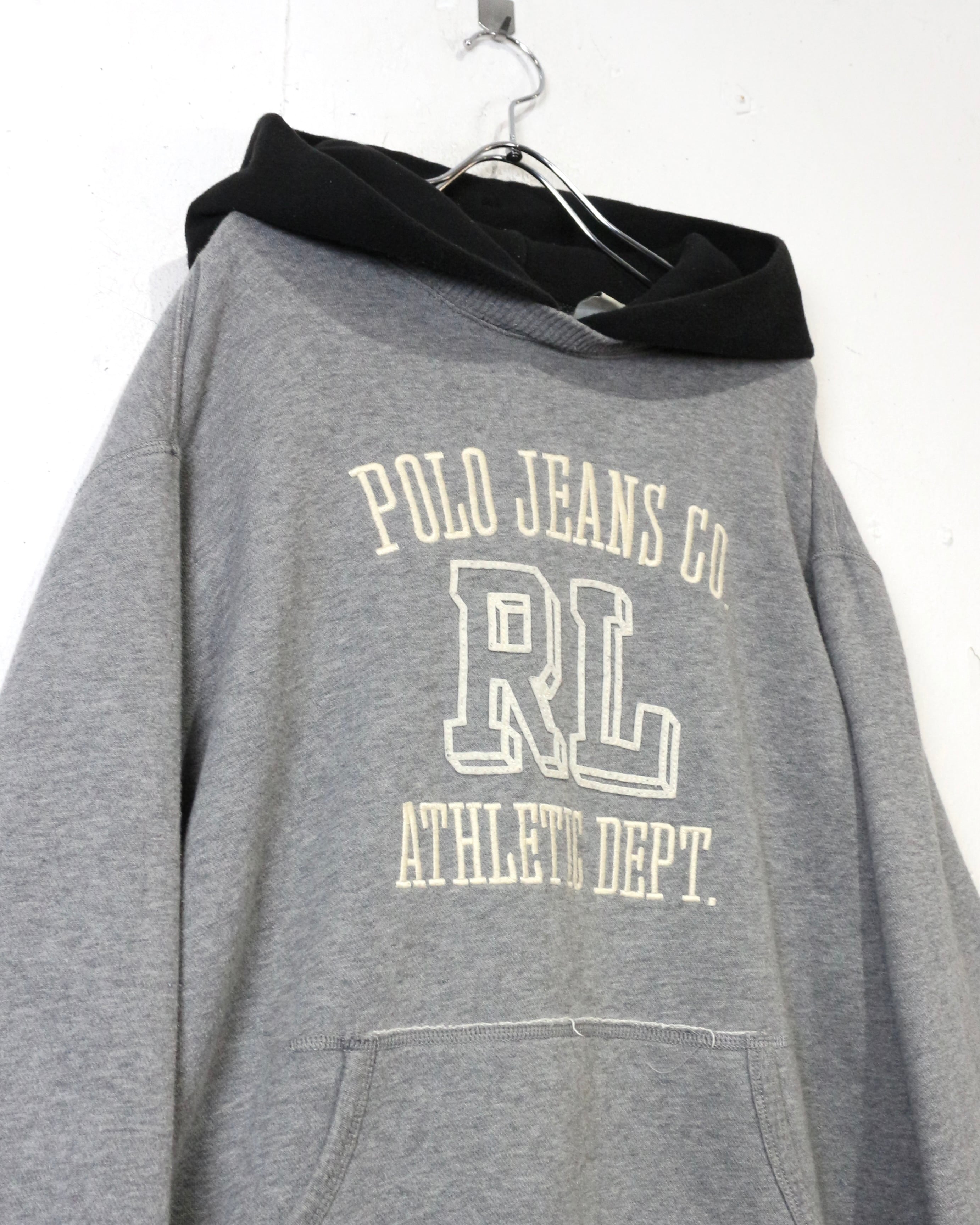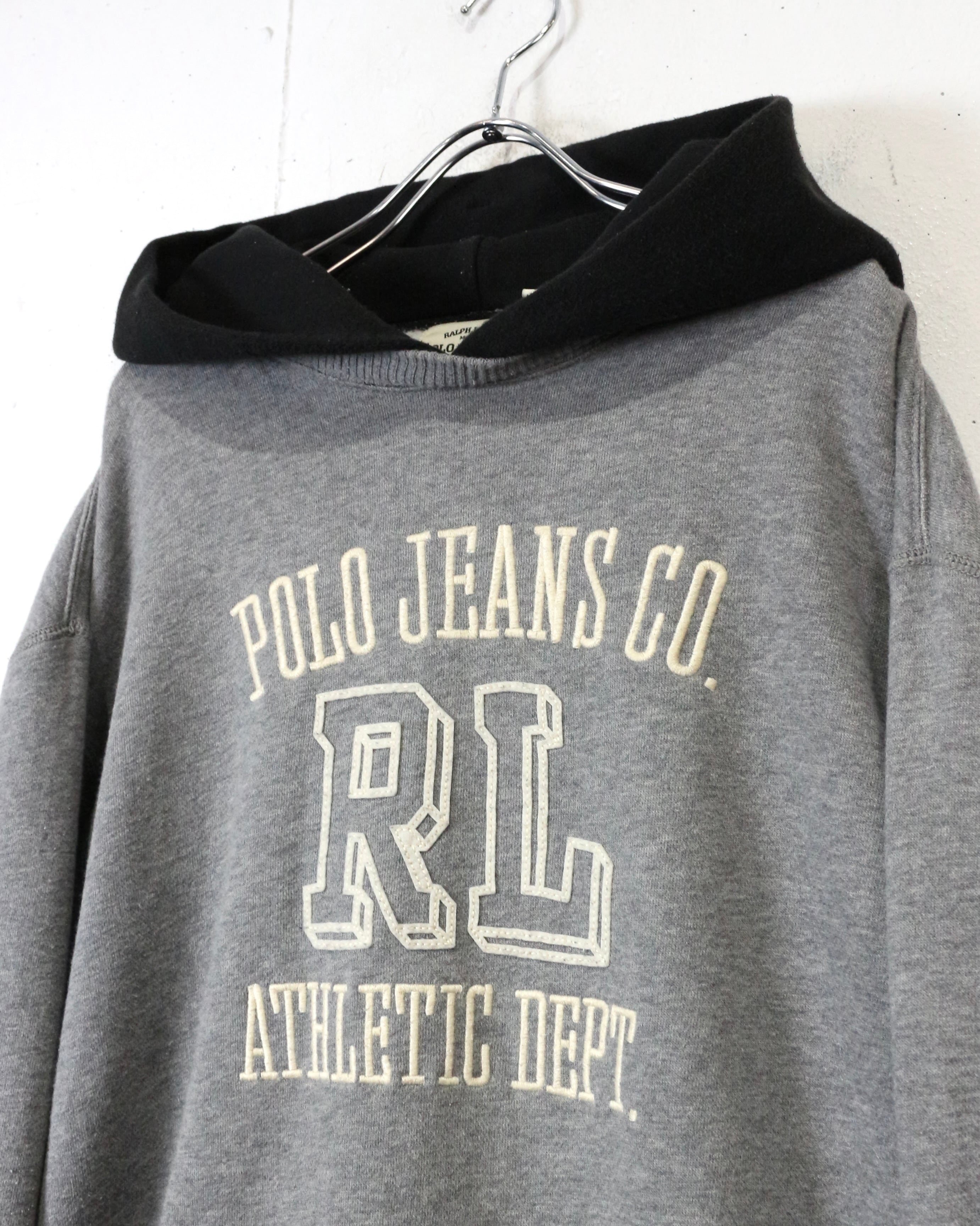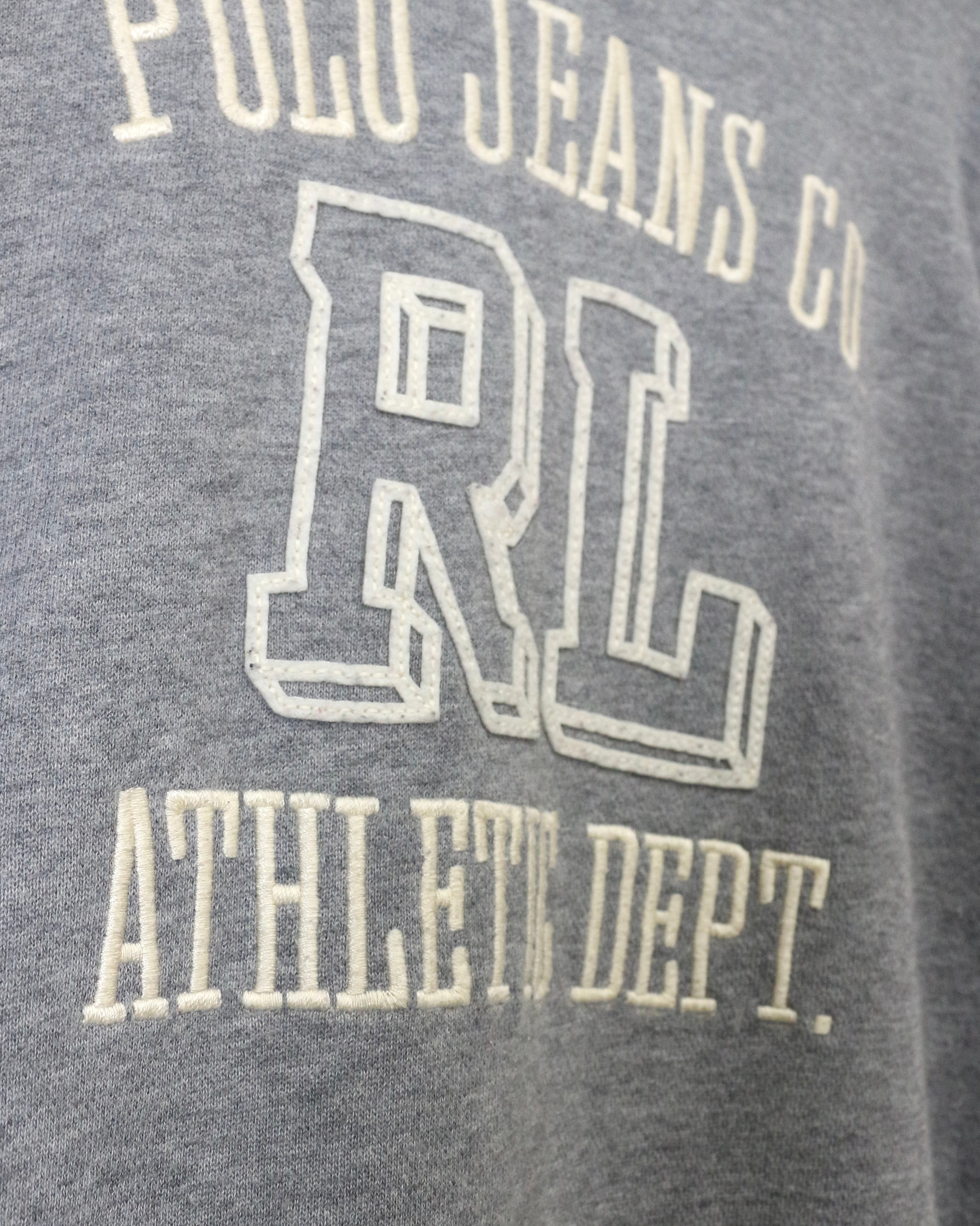 グレーボディをベースに、フロントには“POLO JEANS CO.”と“RL ATHLETIC DEPT.”のカレッジライクなロゴプリント、刺繍を配置した、クラシックなアメリカンカレッジの空気感を纏った1着。
