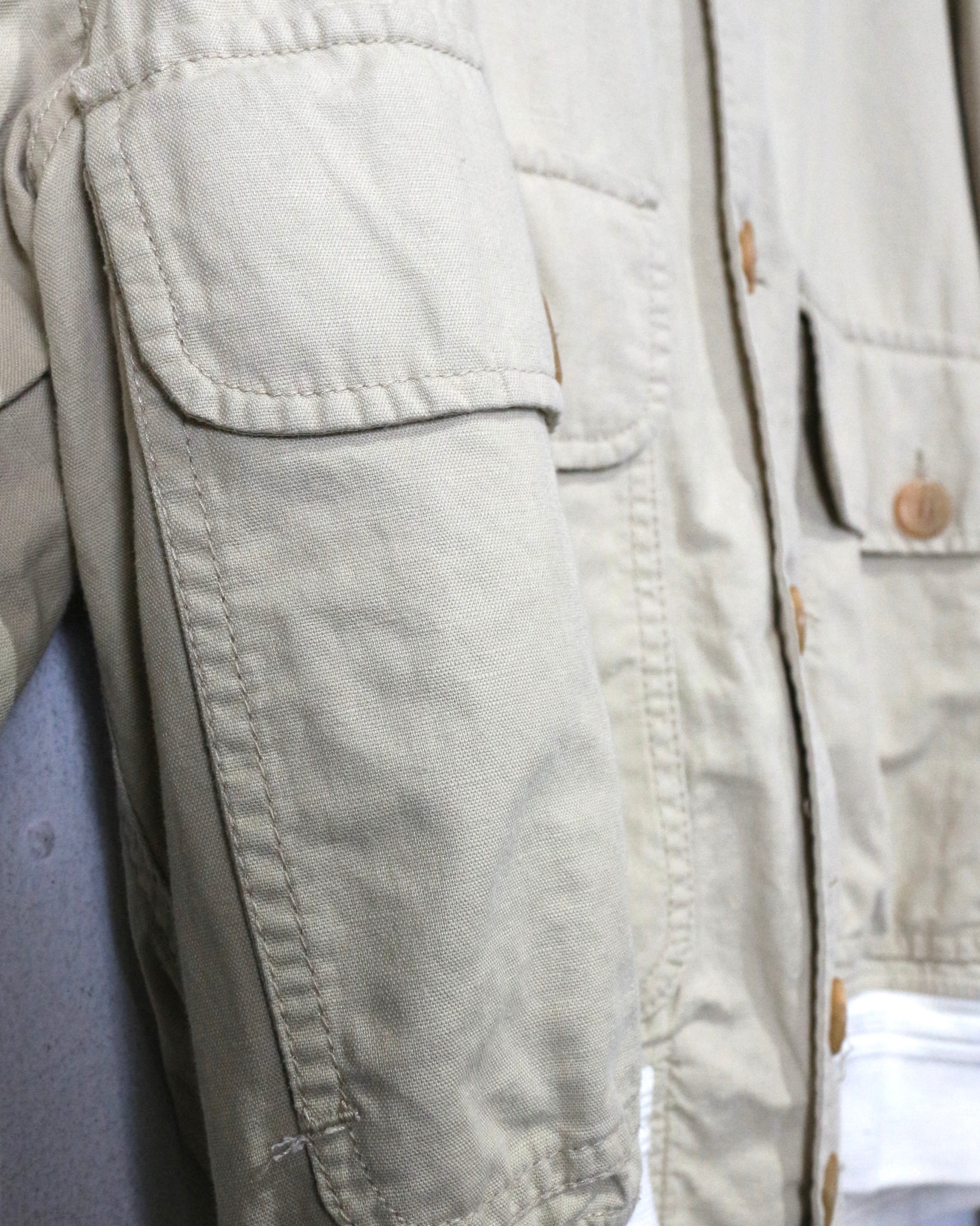軽やかなリネン混の生地を採用した1着で、ナチュラルな風合いと柔らかなハリ感が特徴。ベージュトーンの落ち着いたカラーリングに、リネン特有のドライな質感が重なることで、ナチュラルな風合いに仕上がっています。