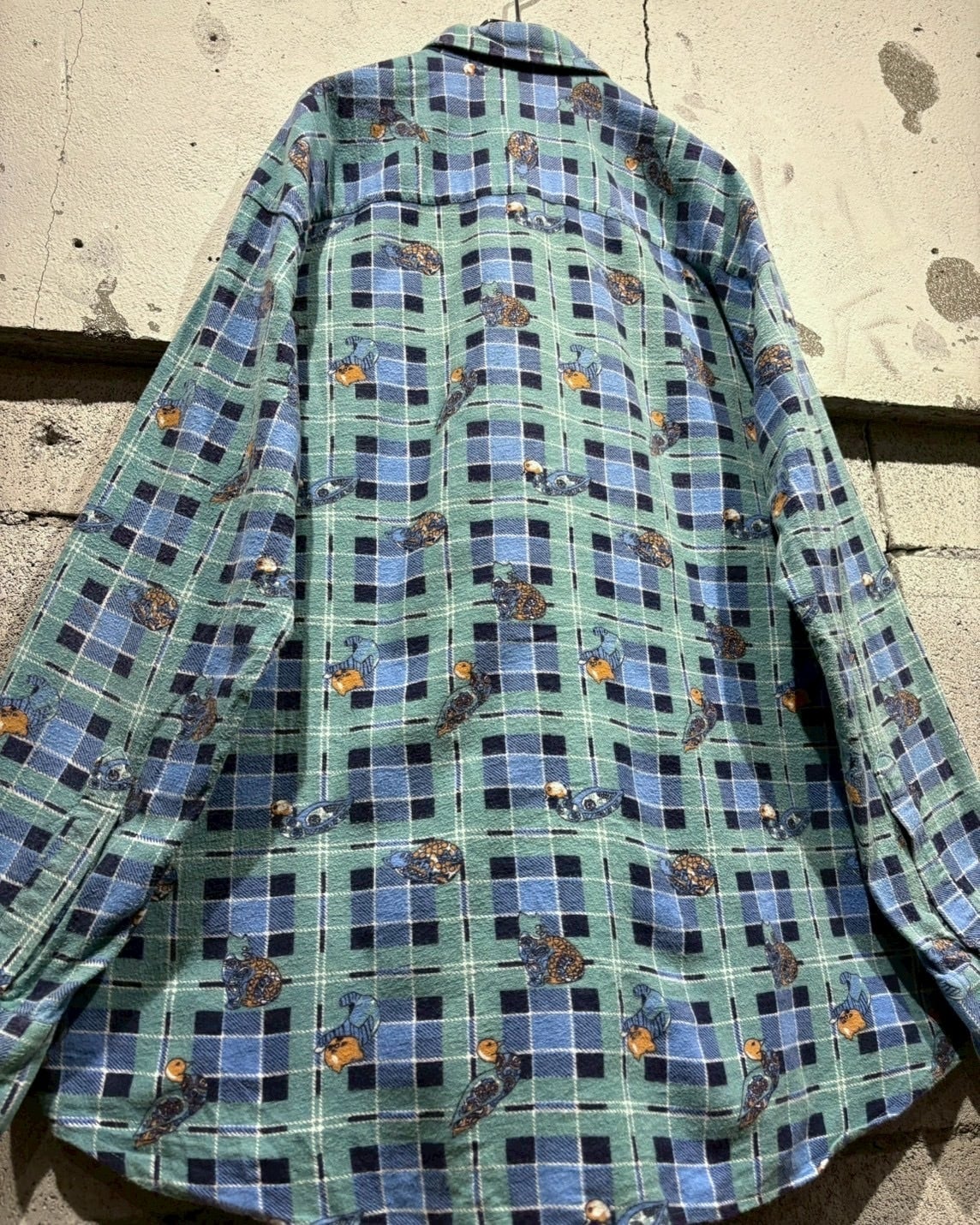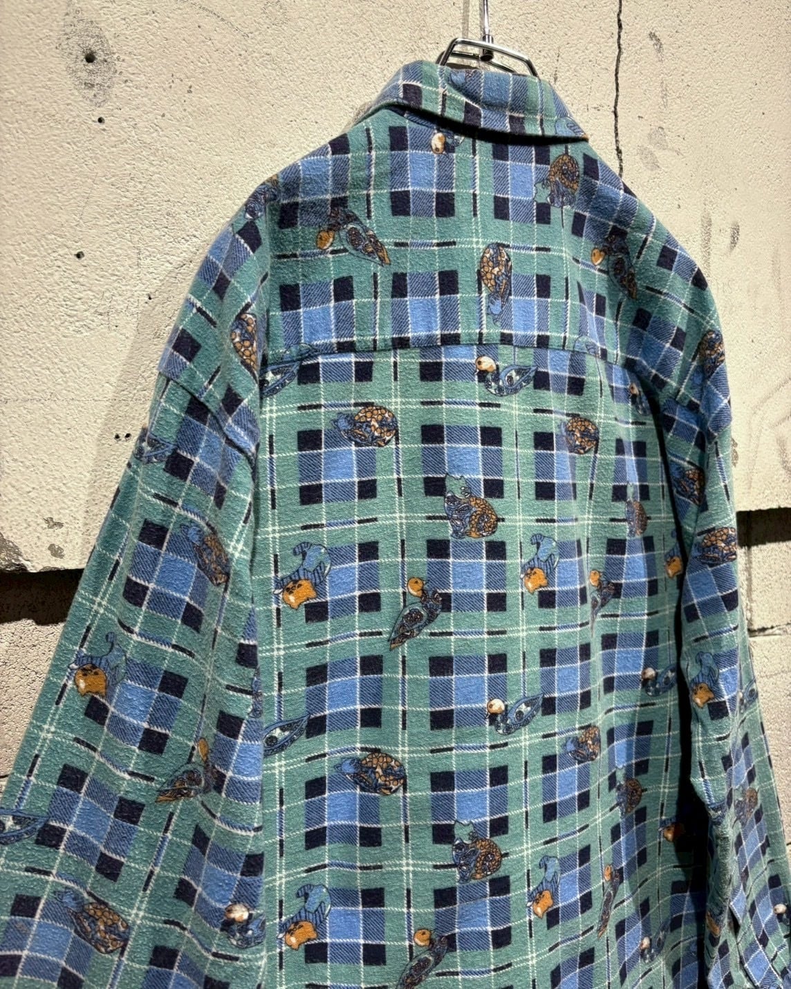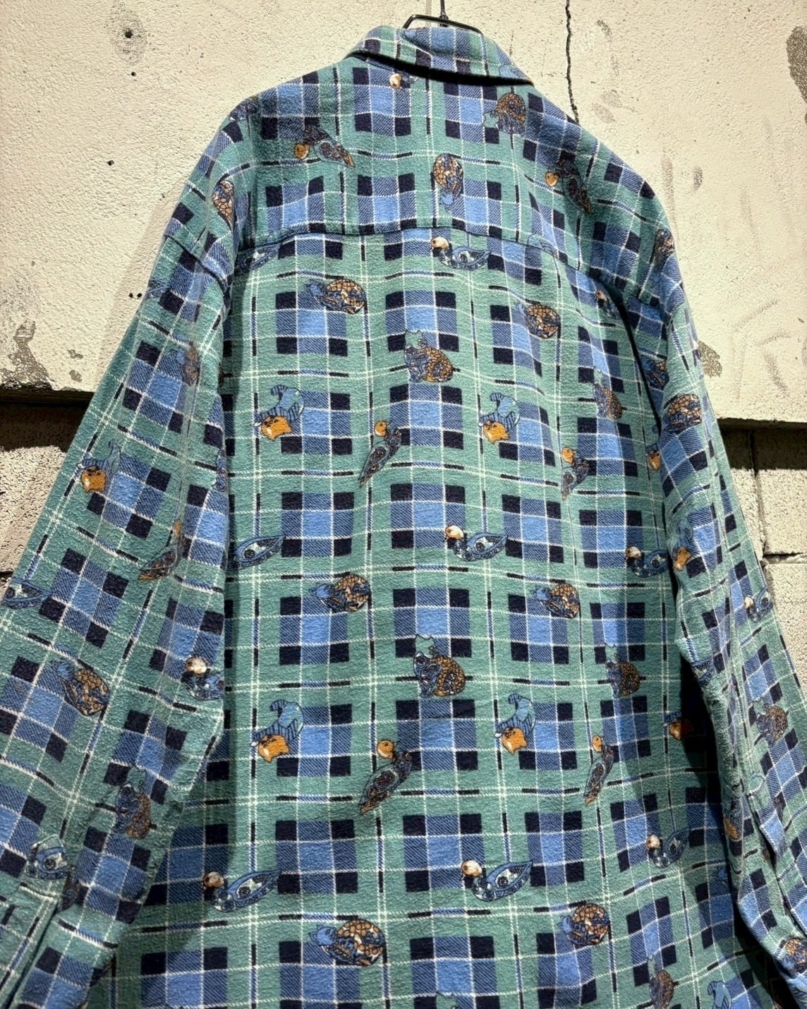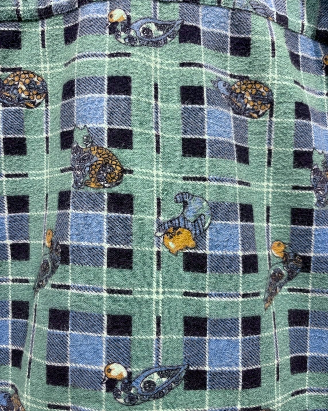グリーン×ブルーの格子柄をベースに、鴨や猫、犬といった動物モチーフをゆるキャラ風のタッチで全面に散りばめた総柄デザインの1着。