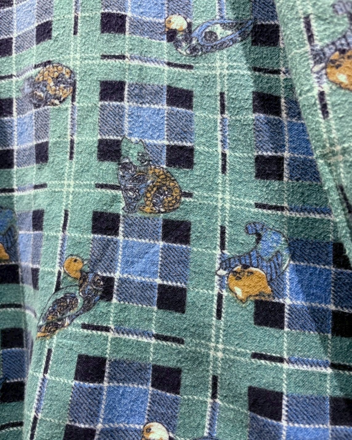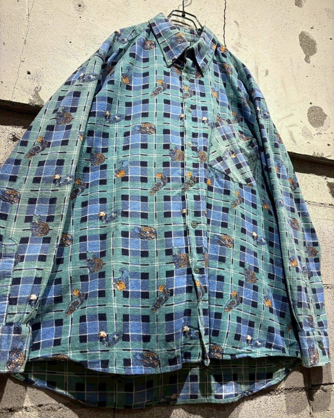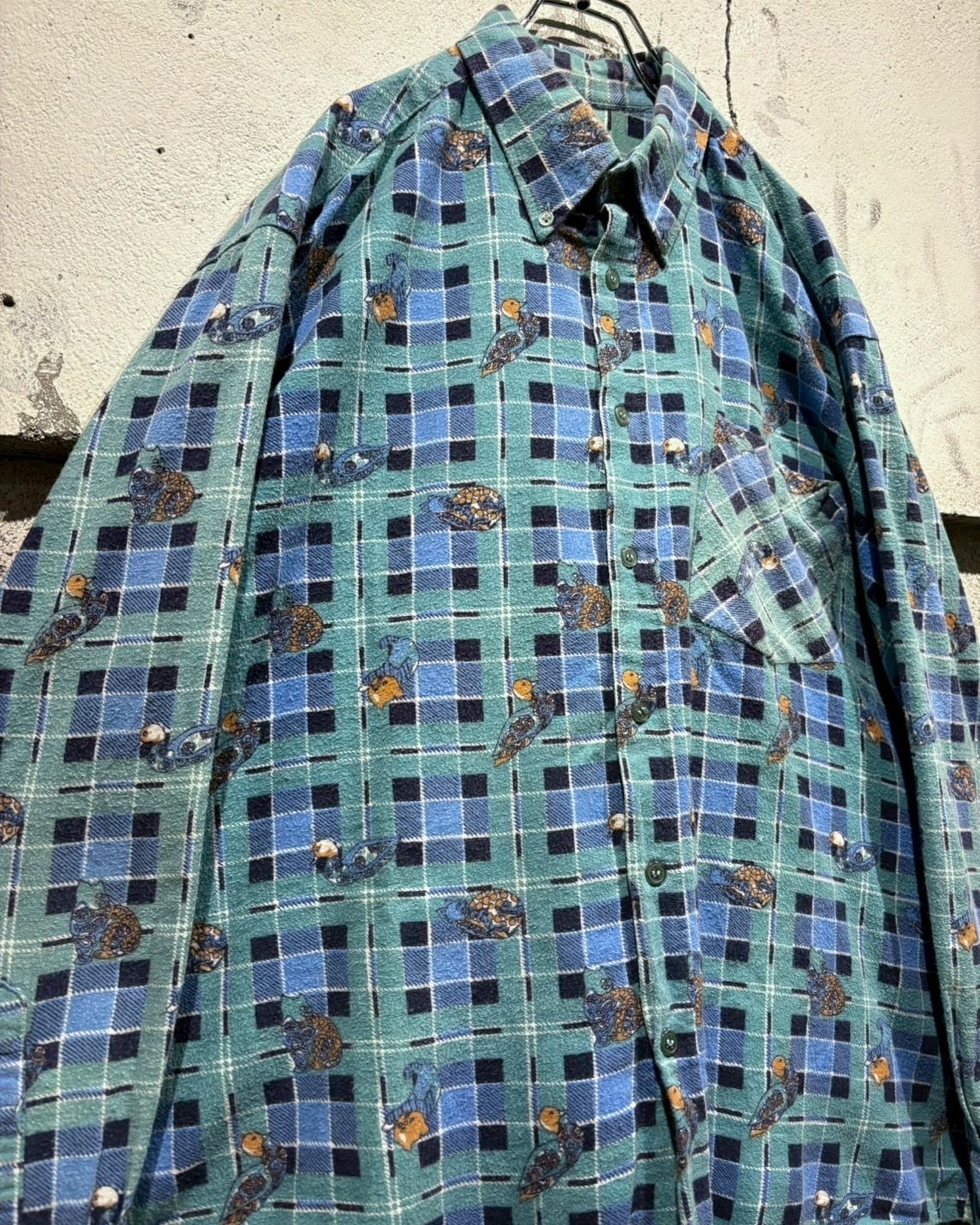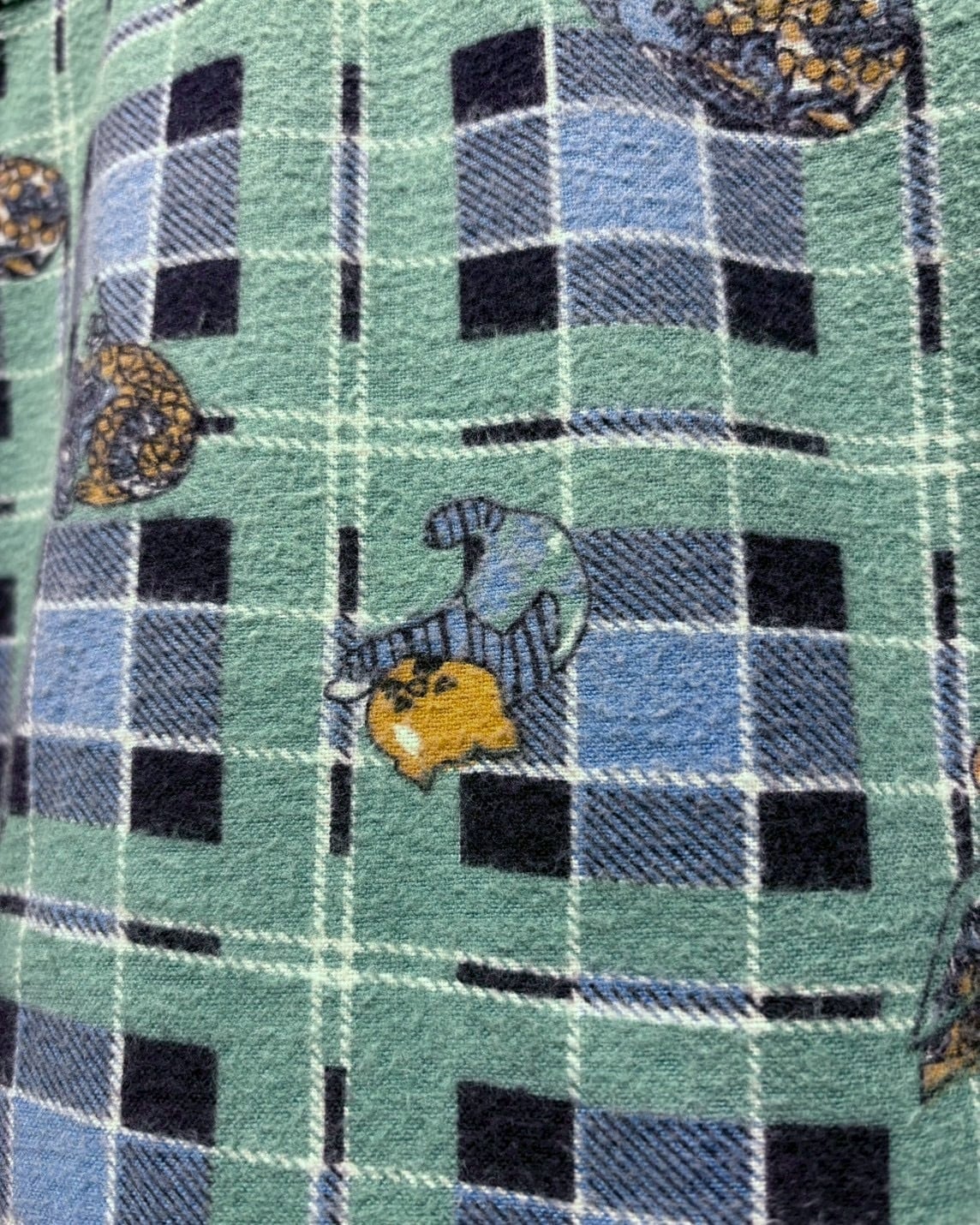 グリーン×ブルーの格子柄をベースに、鴨や猫、犬といった動物モチーフをゆるキャラ風のタッチで全面に散りばめた総柄デザインの1着。