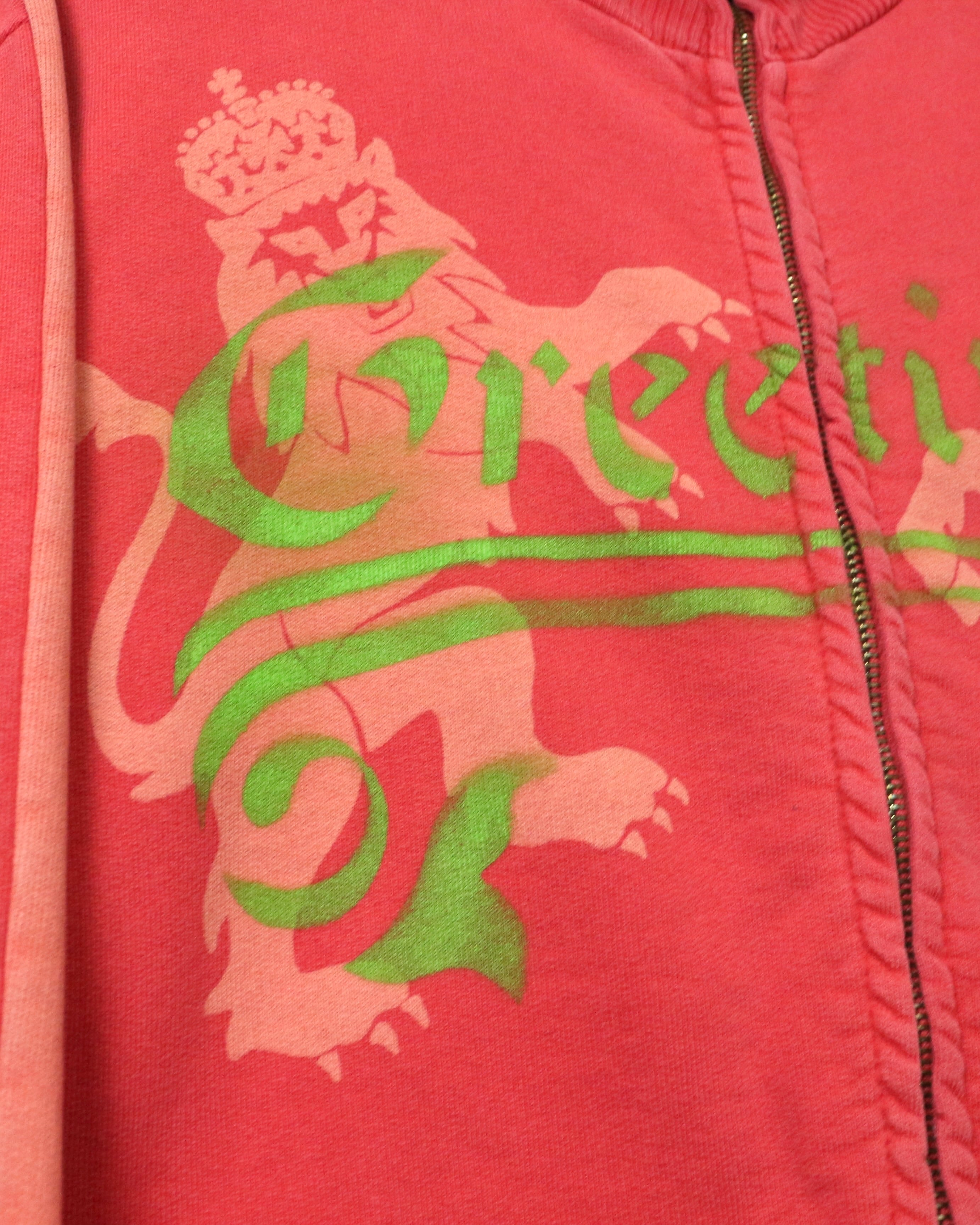 鮮やかなレッドボディをベースに、フロントには大胆にライオンやユニコーンモチーフを配置したクラシカルな紋章デザインをプリントで表現した1着。