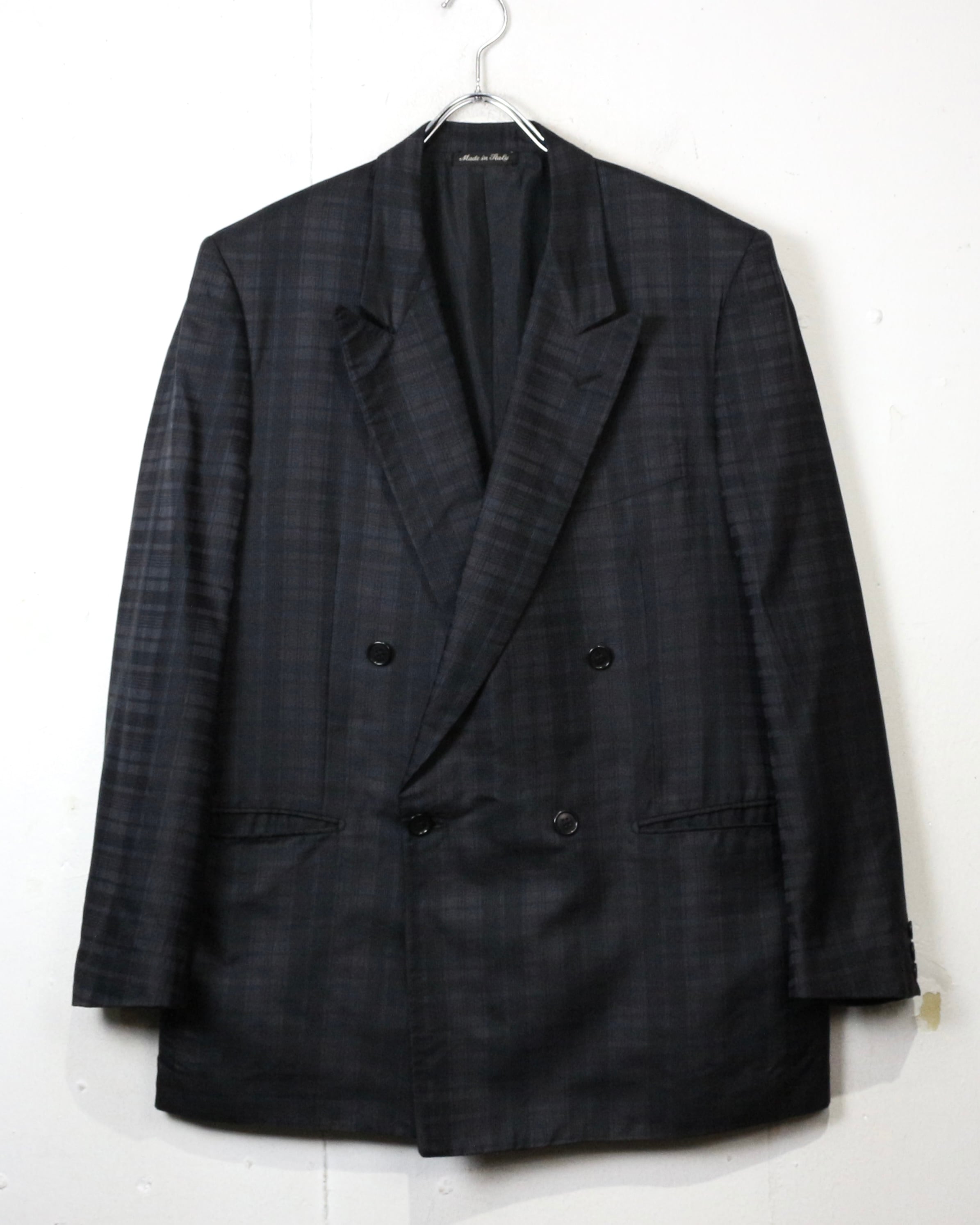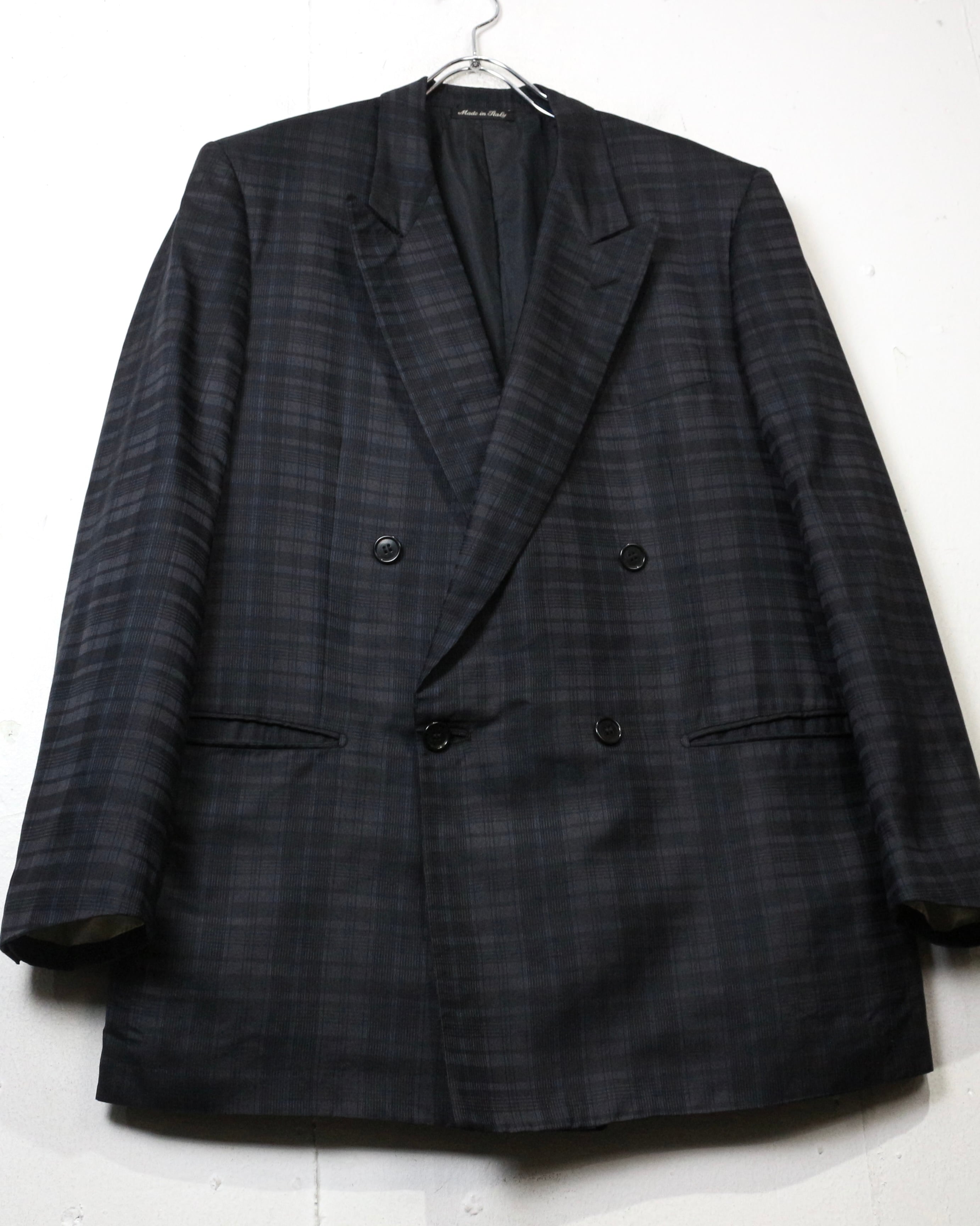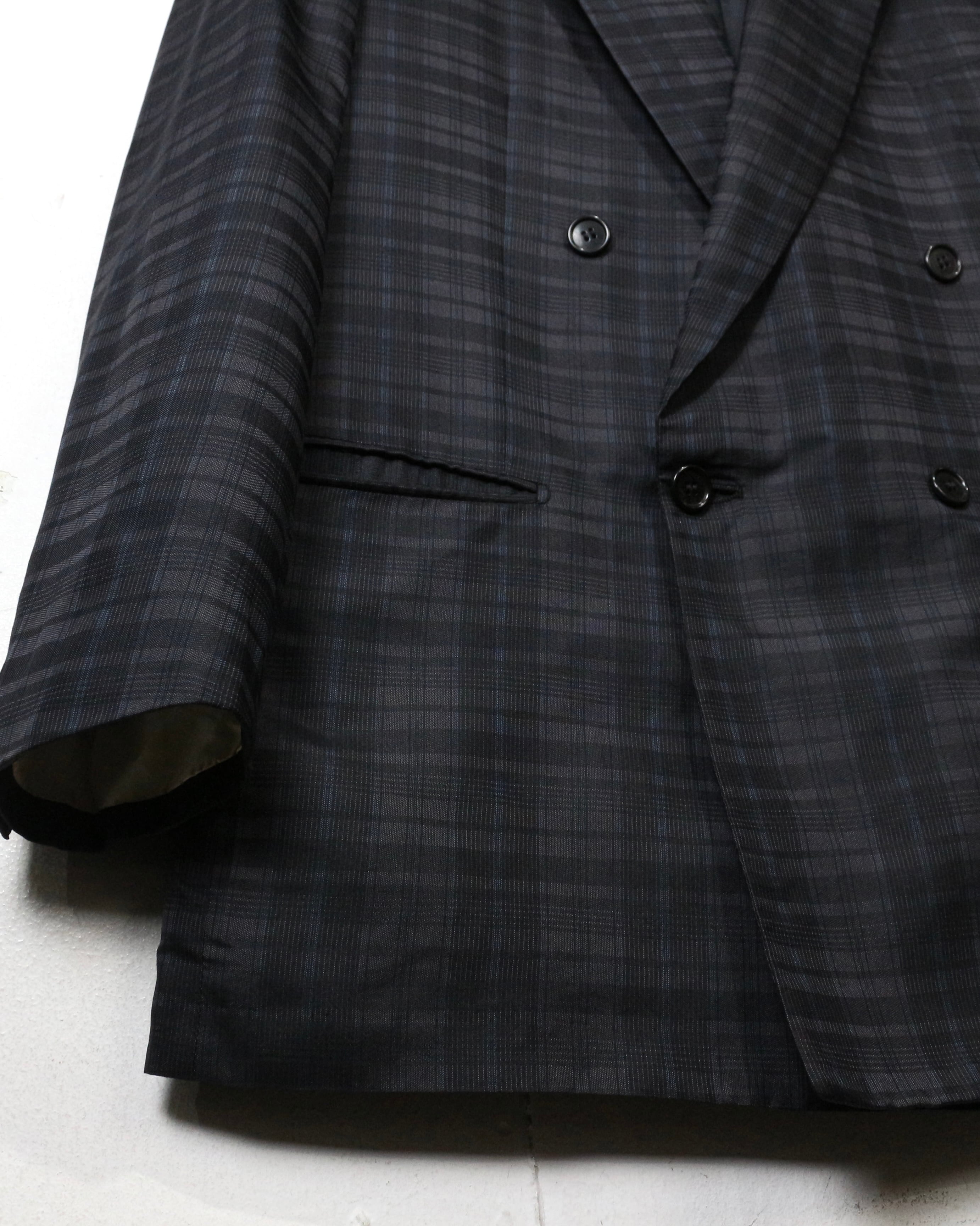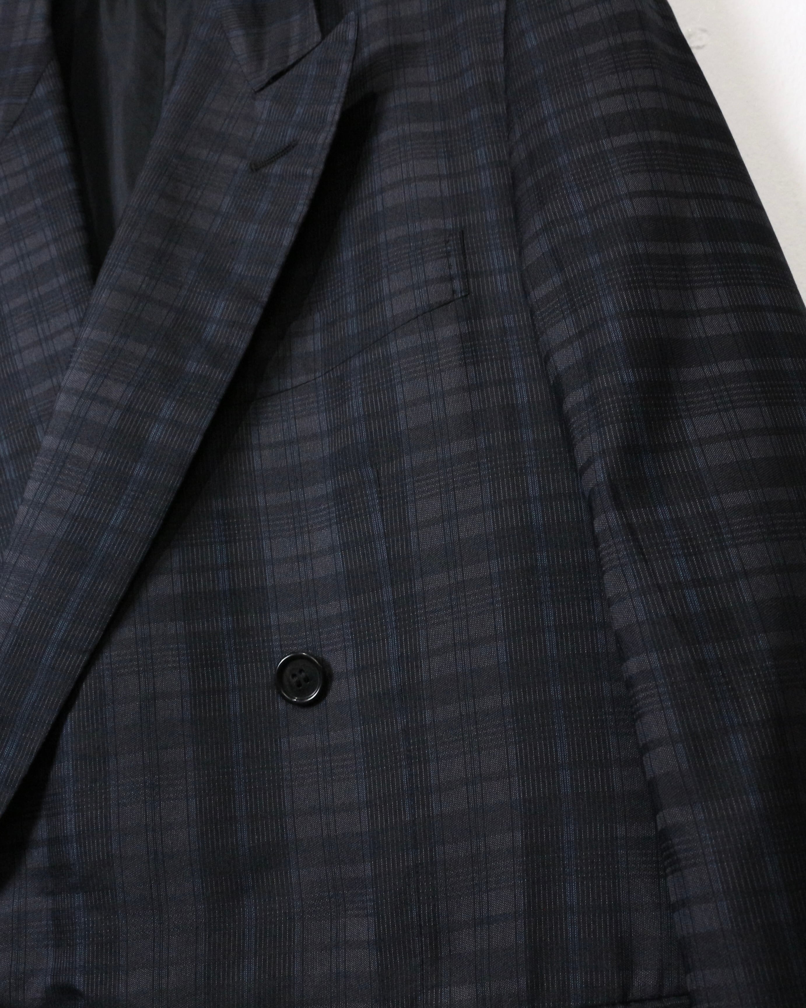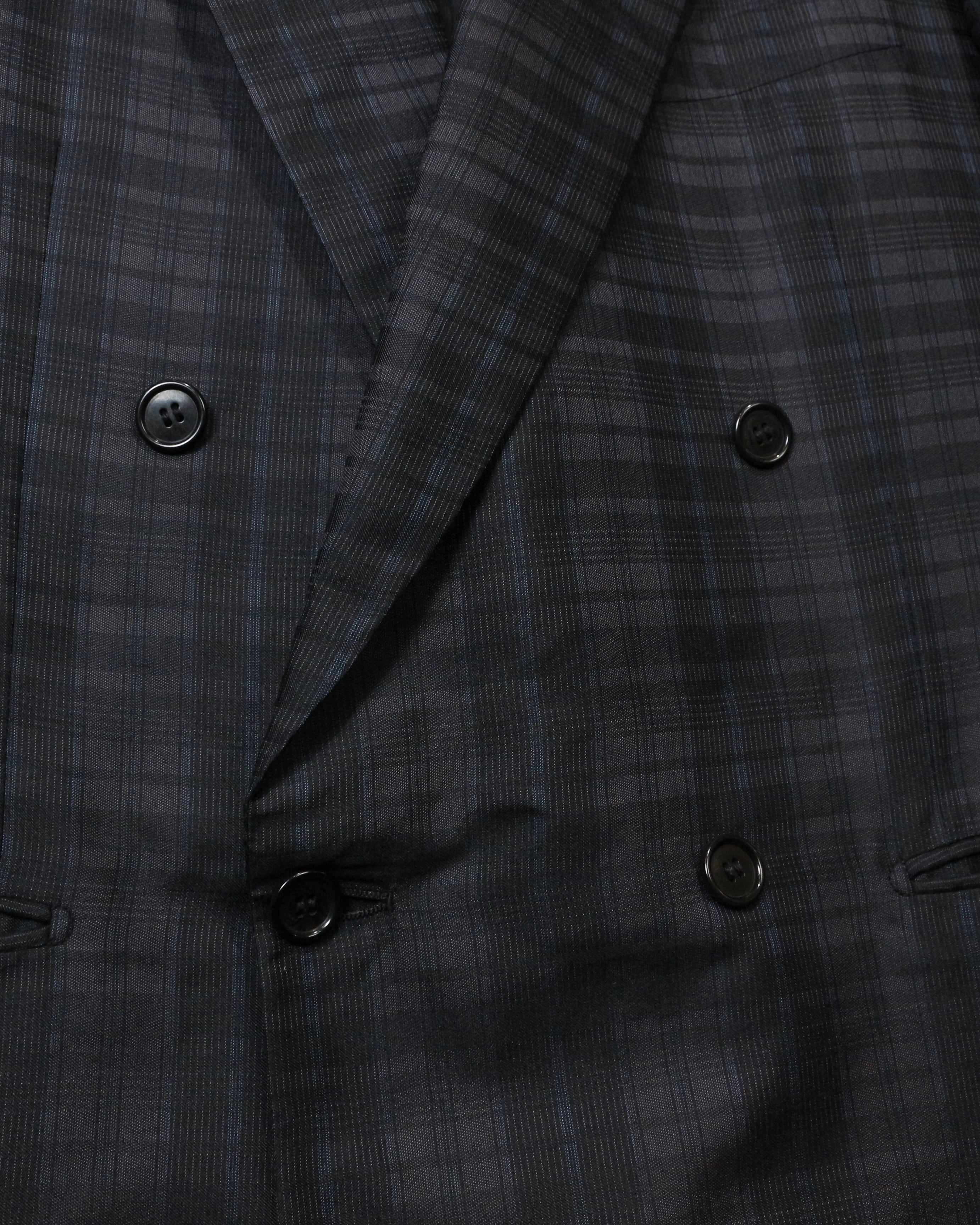 ダブルブレスト4ボタン仕様にシャープなラペルを備え、クラシックなテーラリングをベースにしながらも、洗練されたモード感を感じさせる仕立て。主張しすぎないチェックパターンが全体の雰囲気を引き締め、落ち着いたラグジュアリーな佇まいを演出しています。