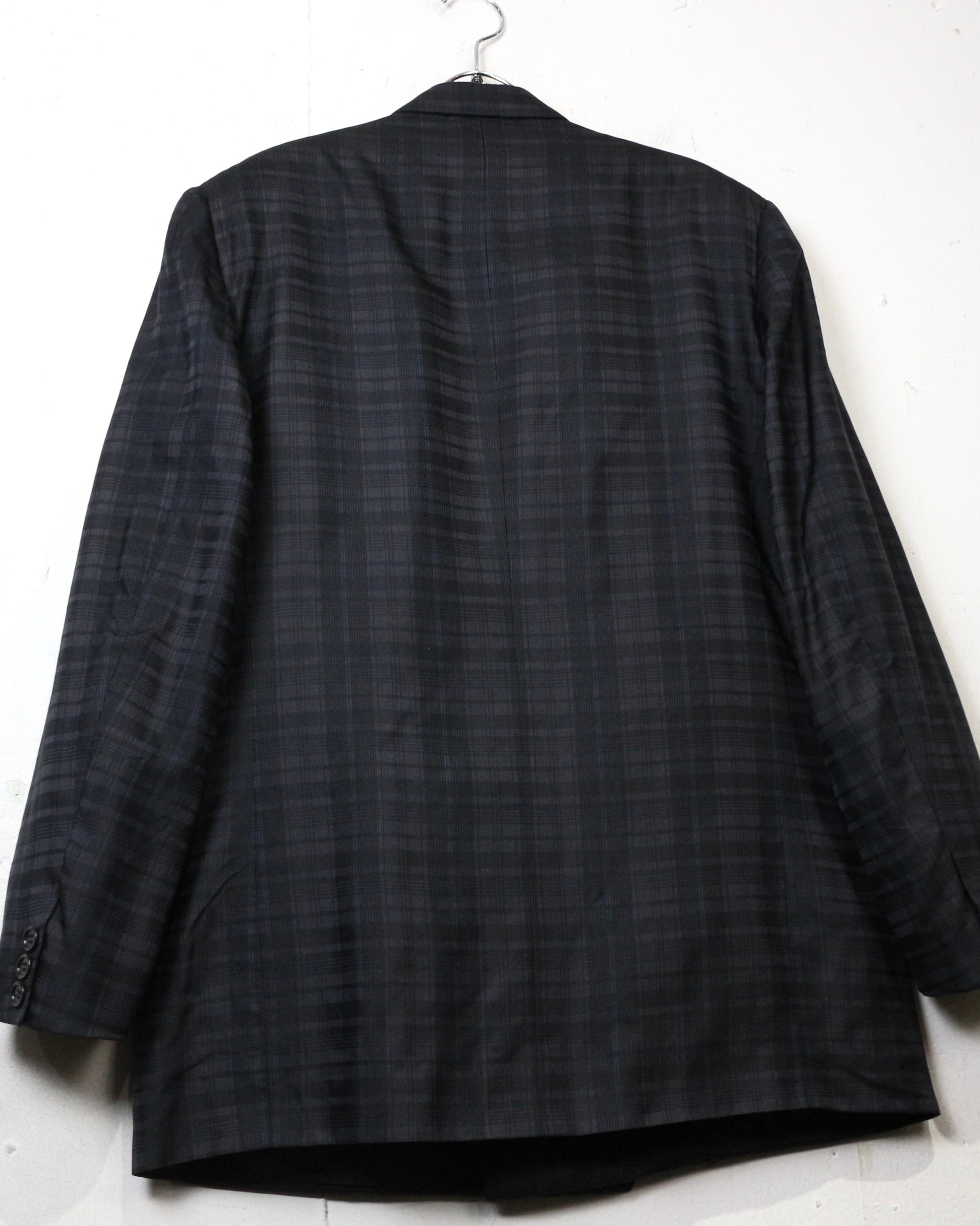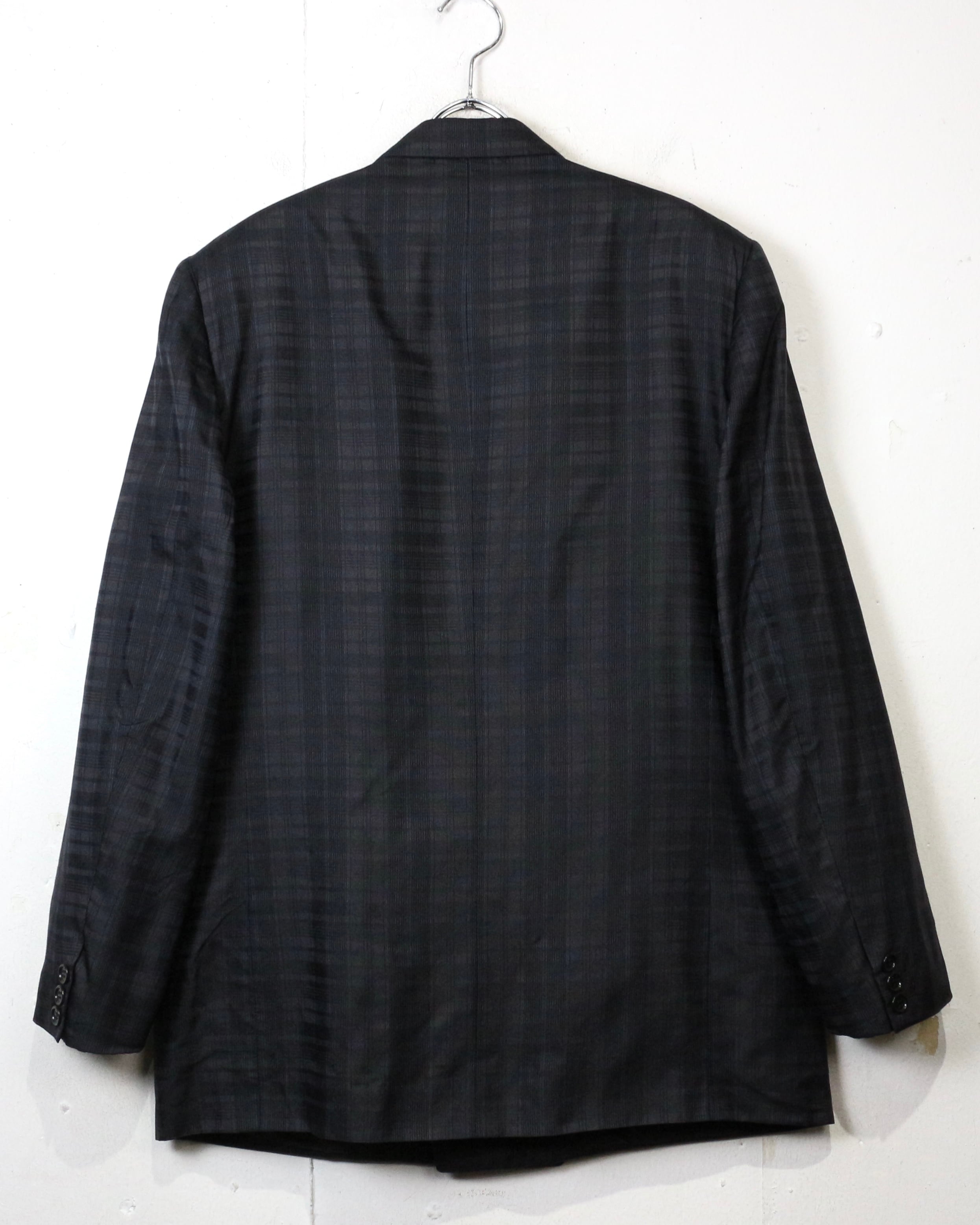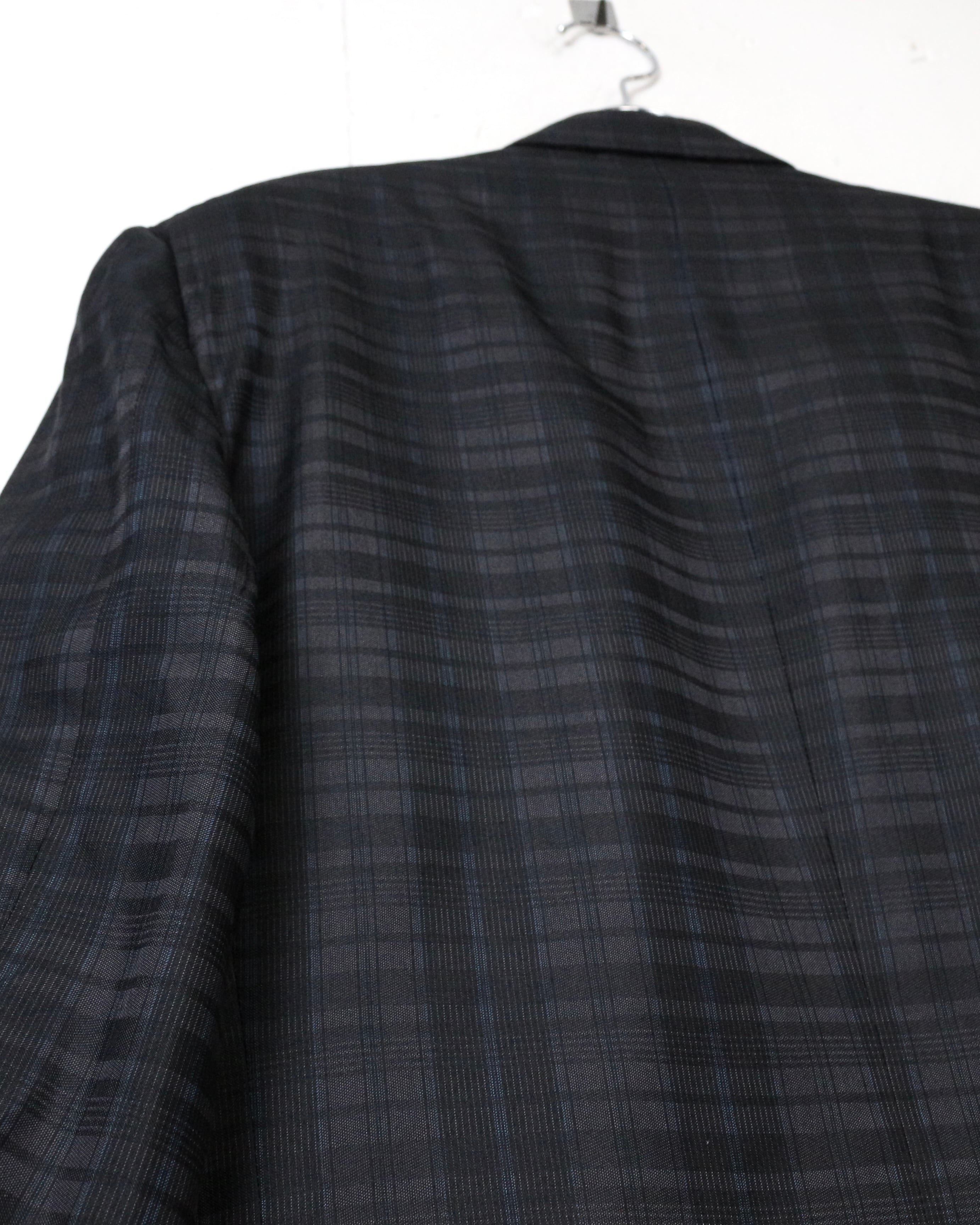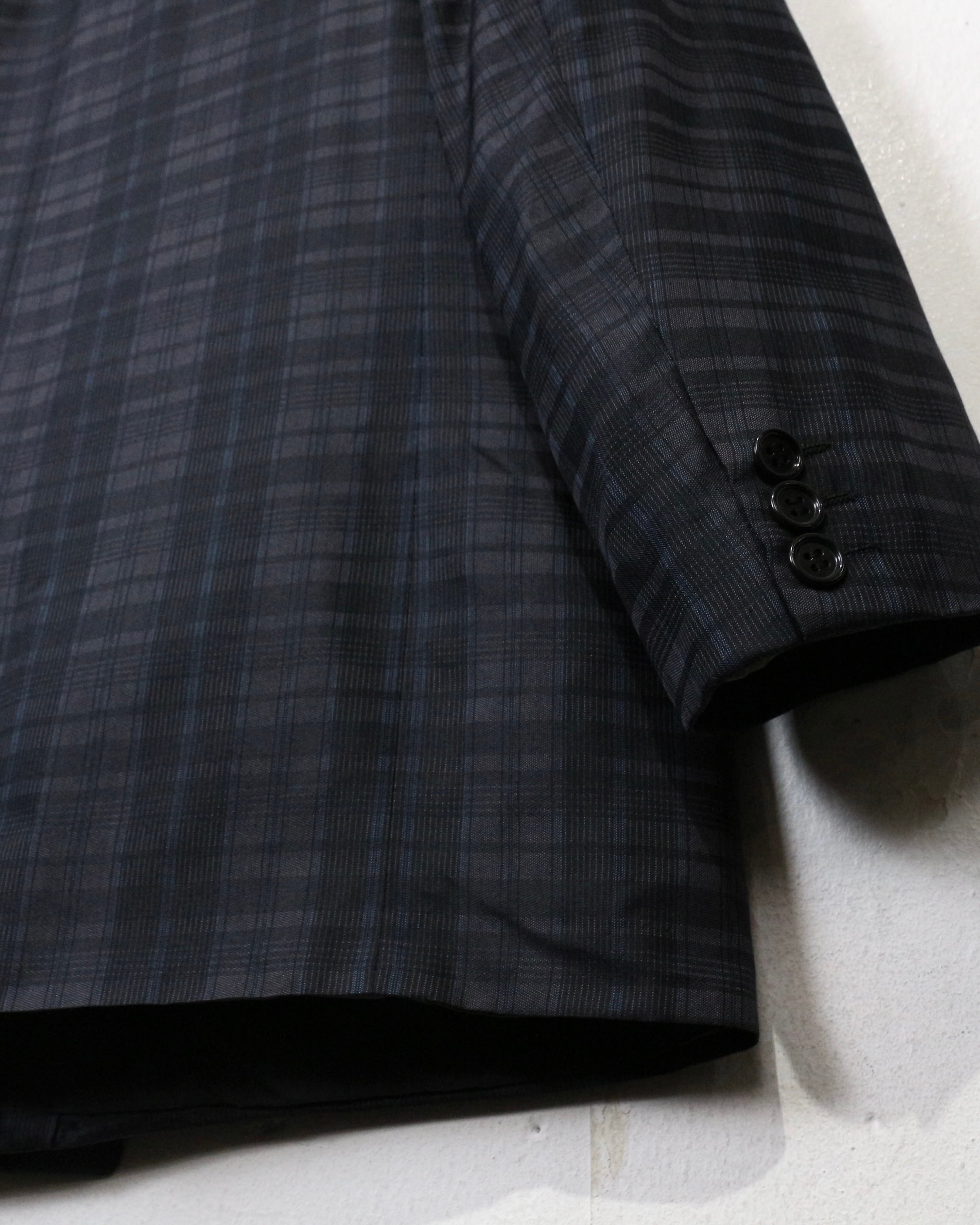 ダブルブレスト4ボタン仕様にシャープなラペルを備え、クラシックなテーラリングをベースにしながらも、洗練されたモード感を感じさせる仕立て。主張しすぎないチェックパターンが全体の雰囲気を引き締め、落ち着いたラグジュアリーな佇まいを演出しています。