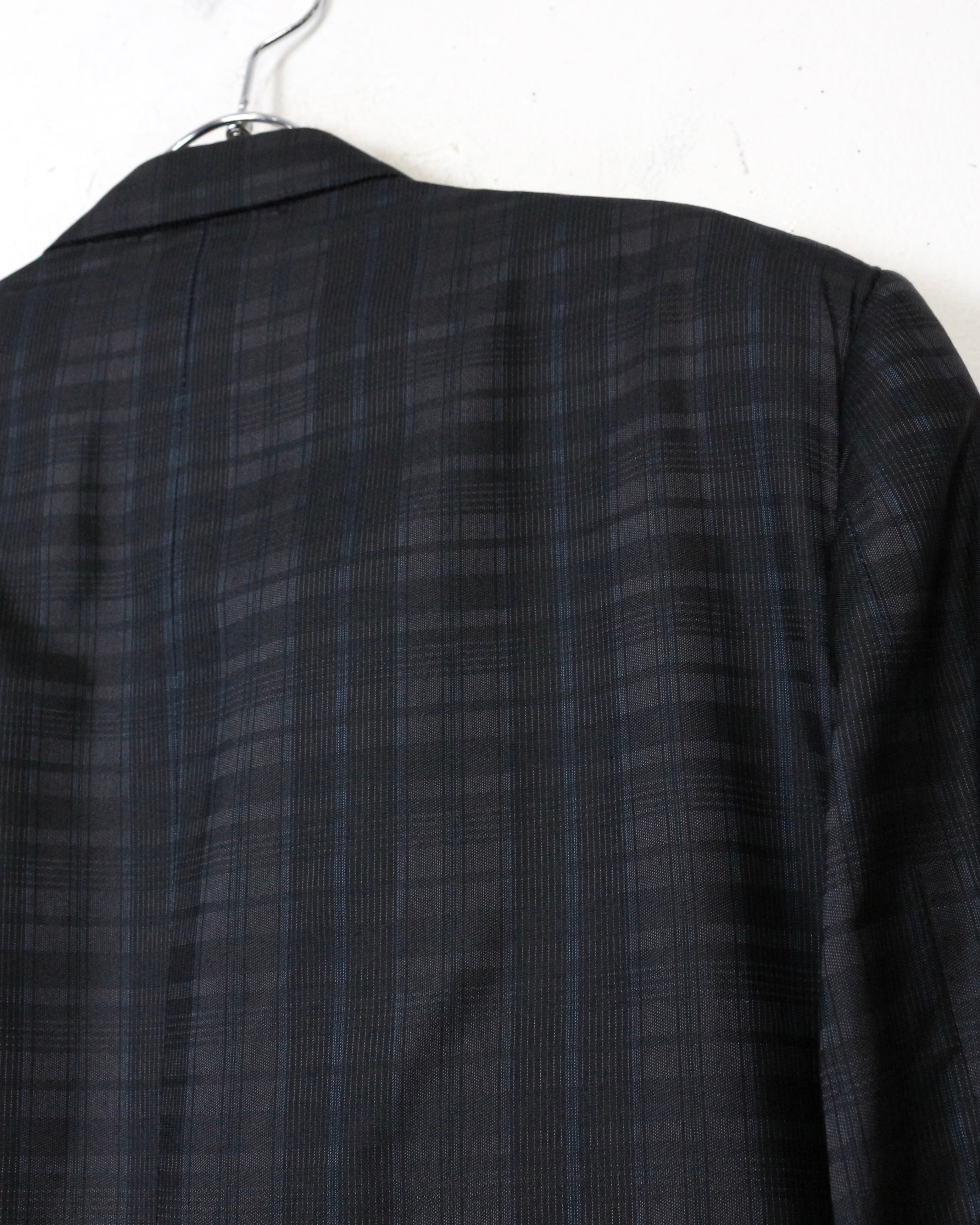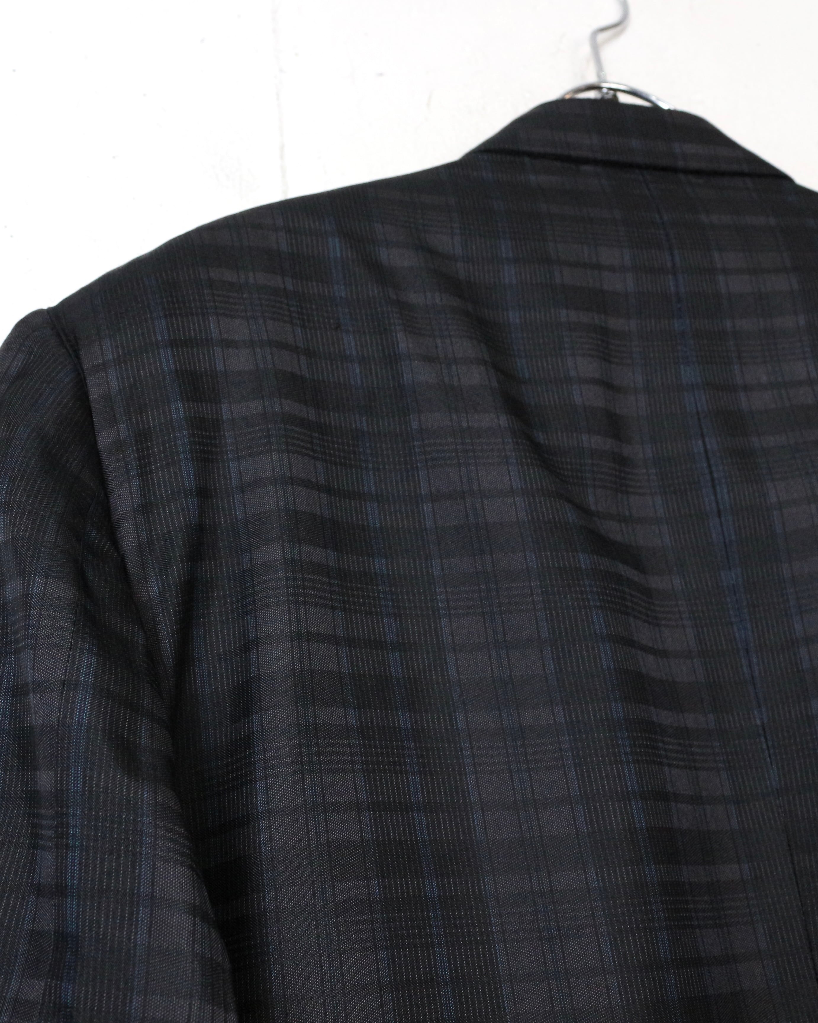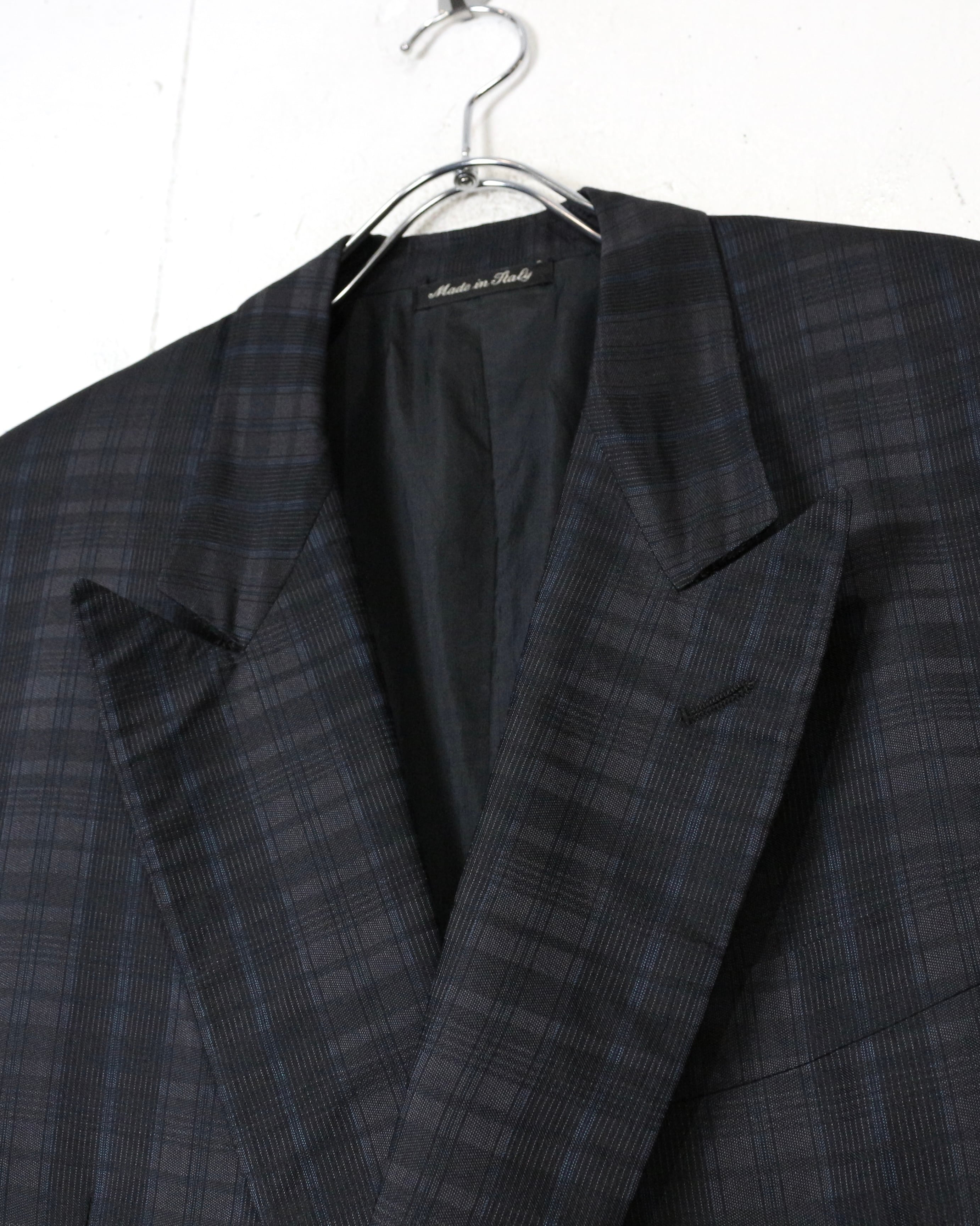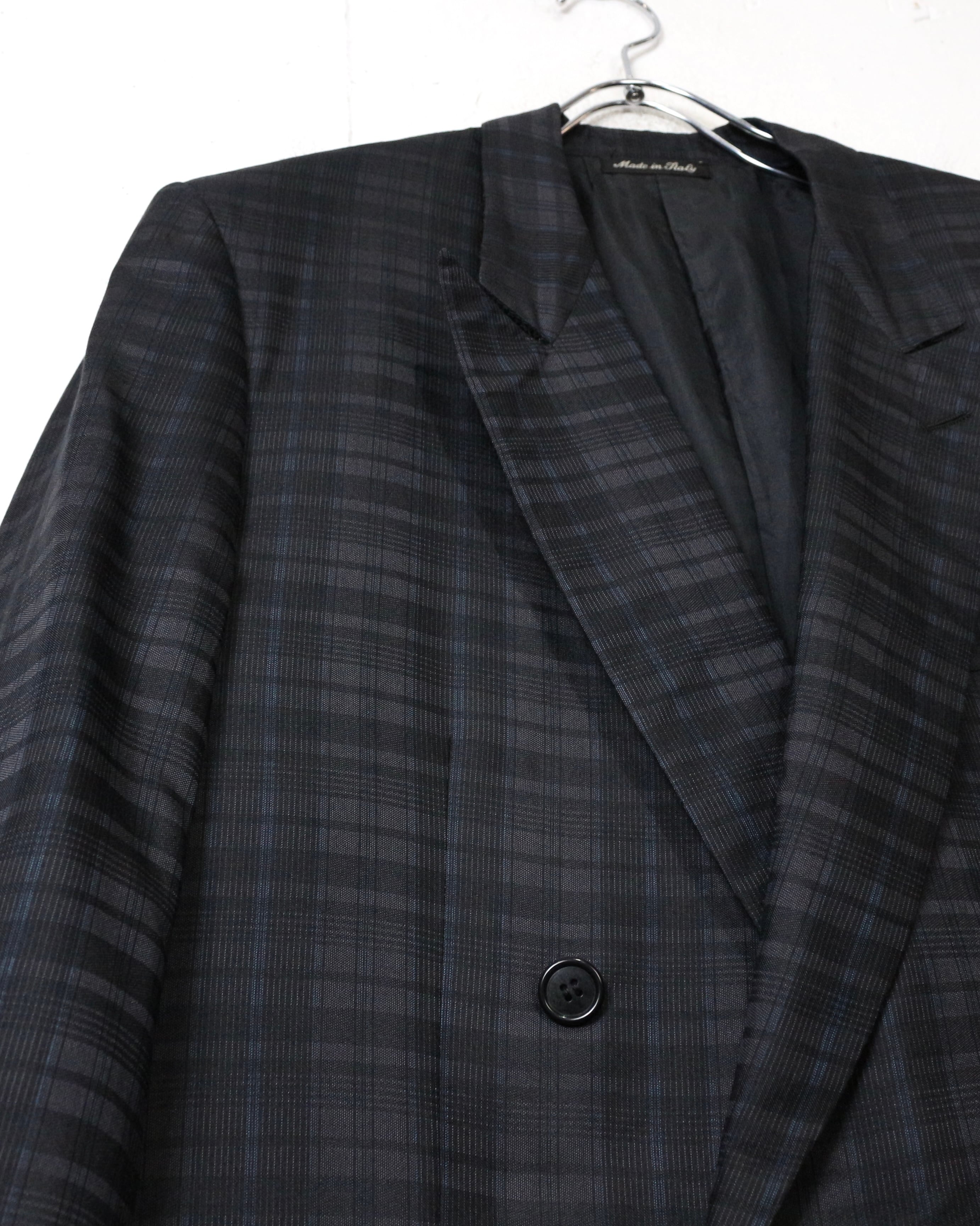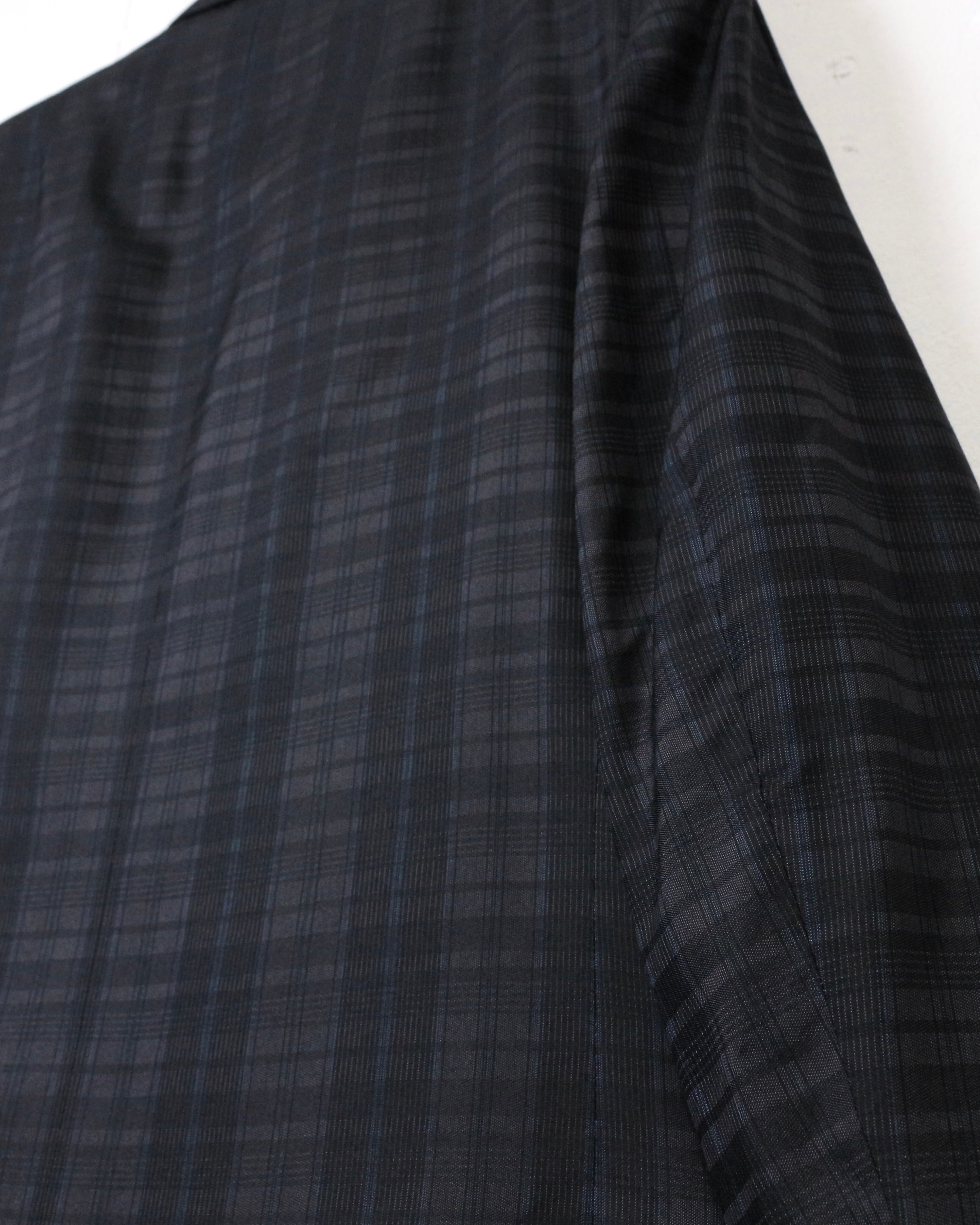 ダブルブレスト4ボタン仕様にシャープなラペルを備え、クラシックなテーラリングをベースにしながらも、洗練されたモード感を感じさせる仕立て。主張しすぎないチェックパターンが全体の雰囲気を引き締め、落ち着いたラグジュアリーな佇まいを演出しています。