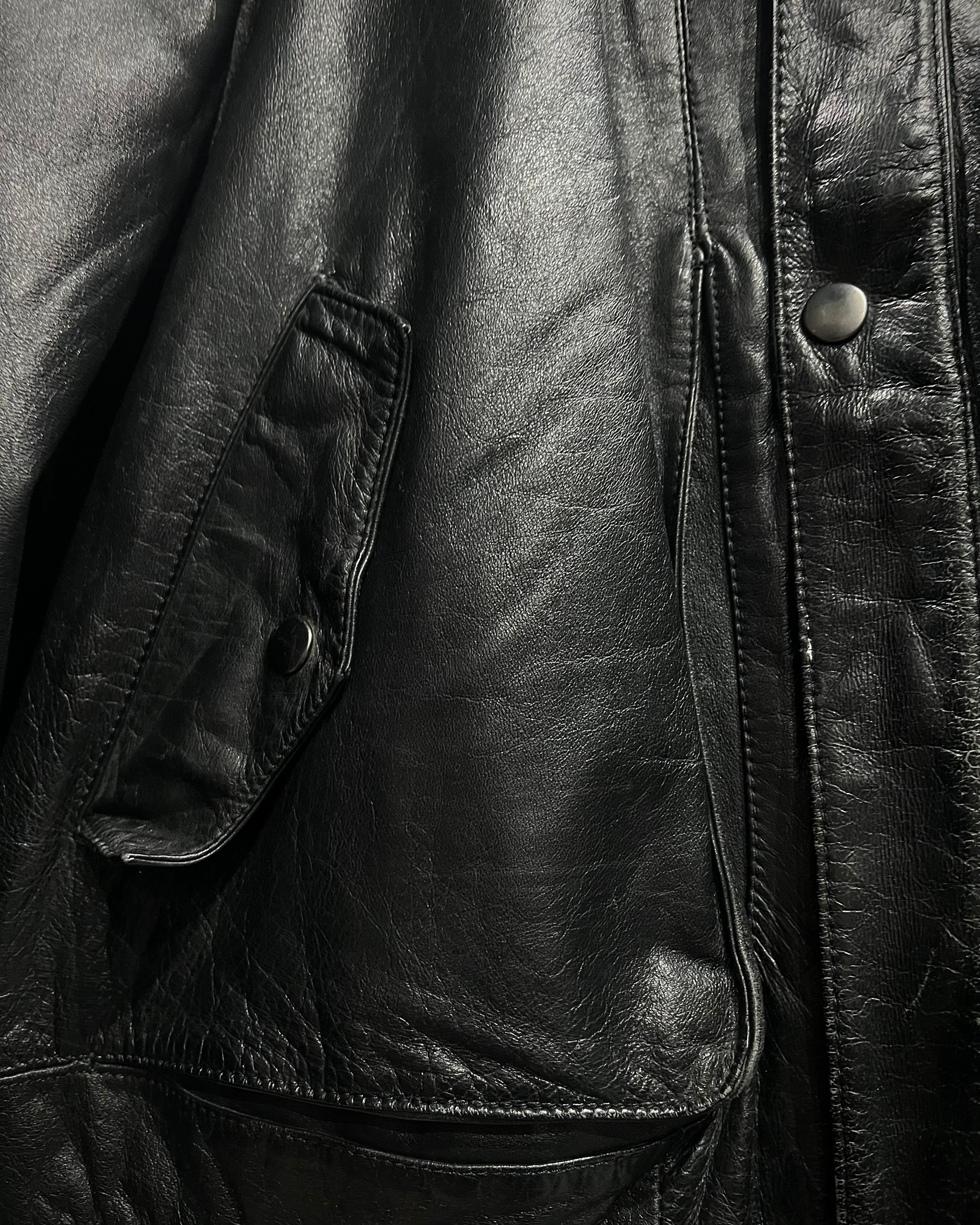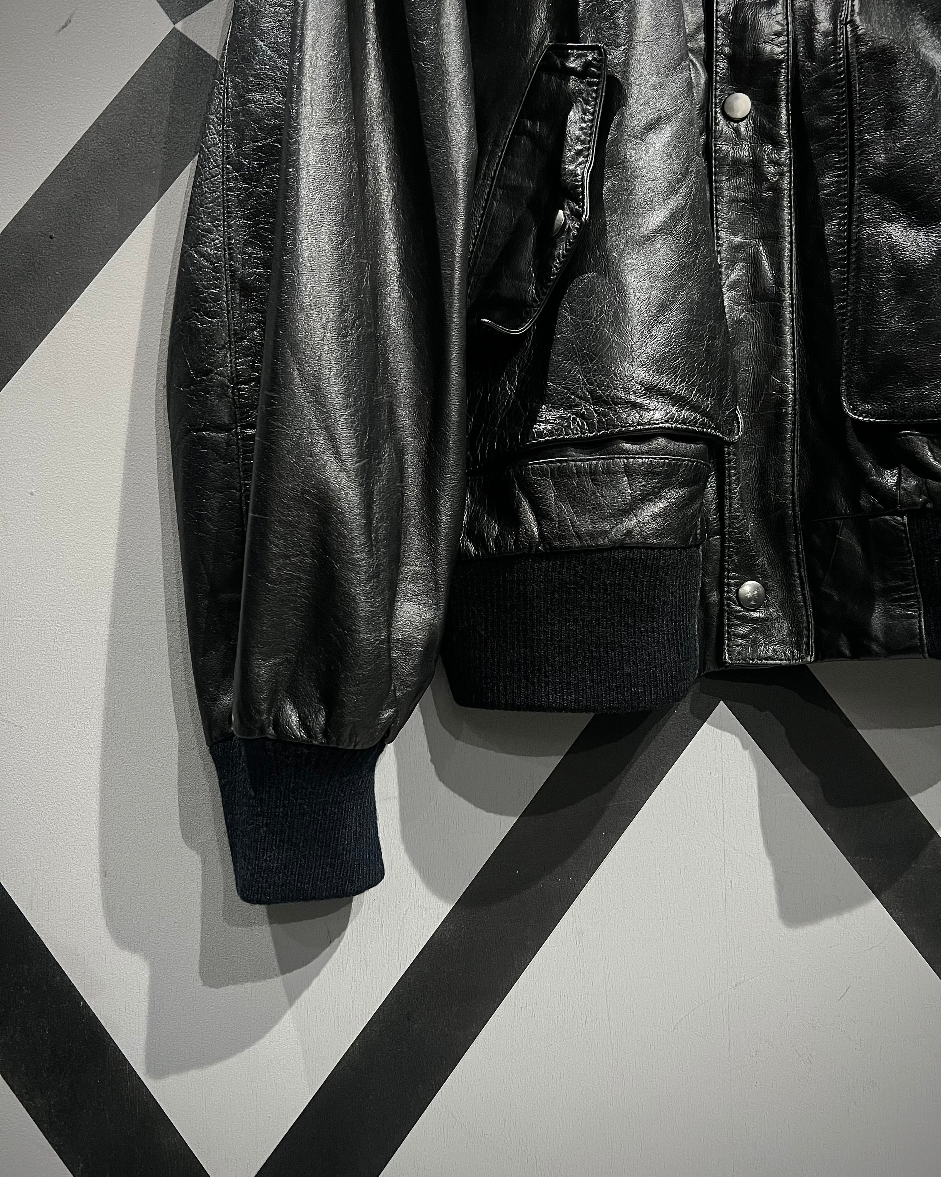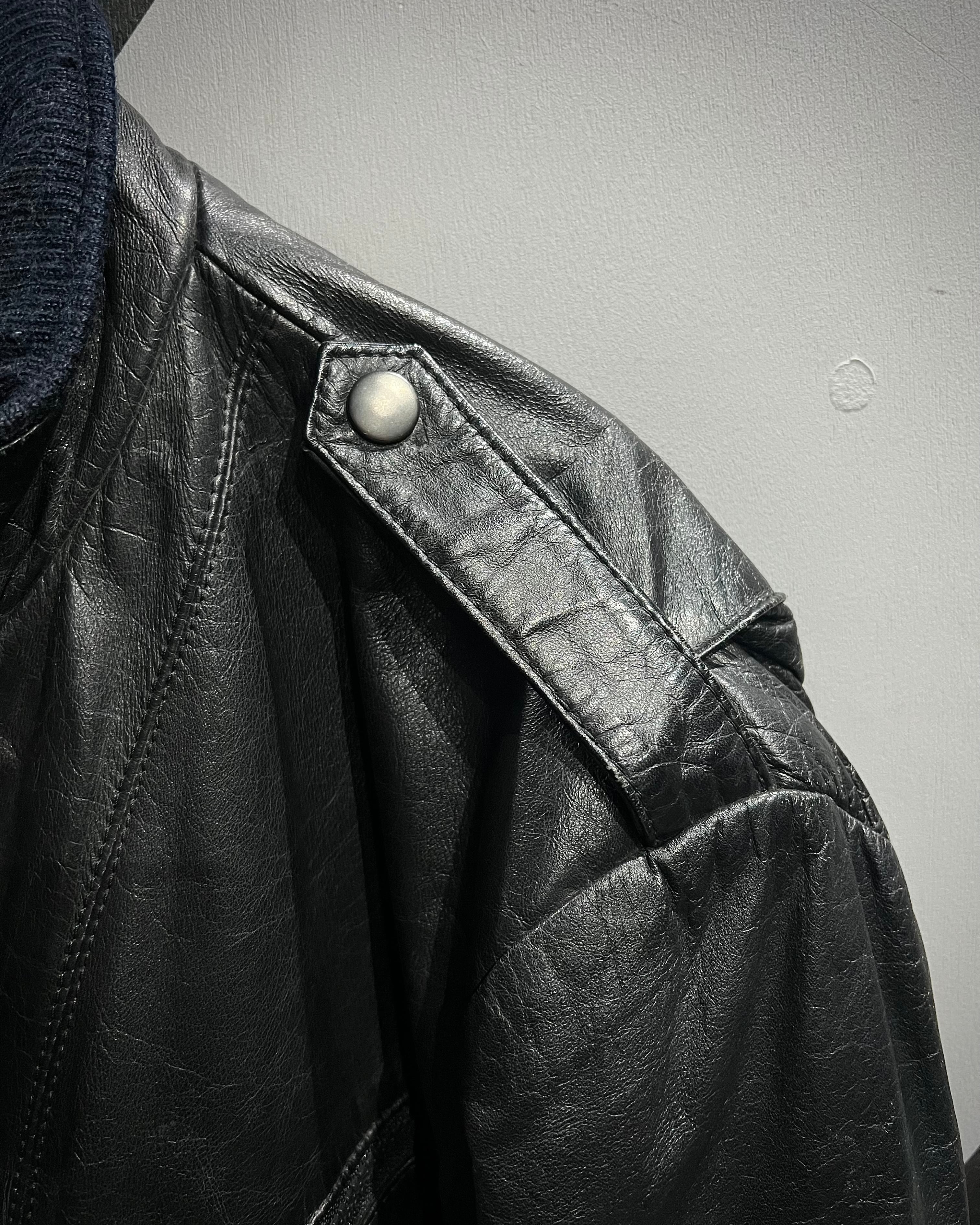 ボディにはしなやかで柔らかなレザーを採用。着込まれることで生まれた自然なシワ感と鈍く光るブラックレザーの艶が相まって、重厚感のある雰囲気を演出。滑らかな質感ながら程よい厚みもあり、レザーならではの存在感を存分に感じられる仕上がりです。