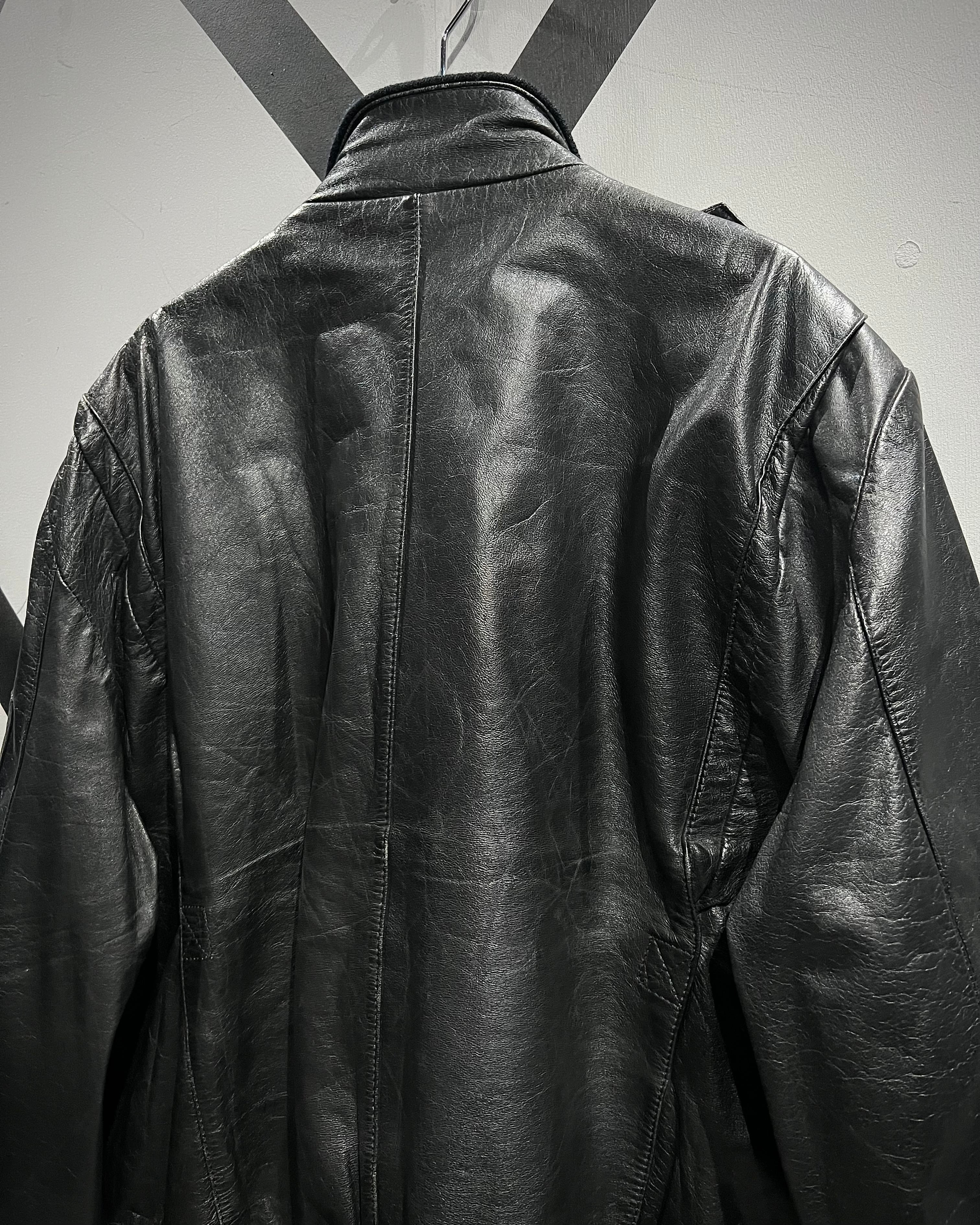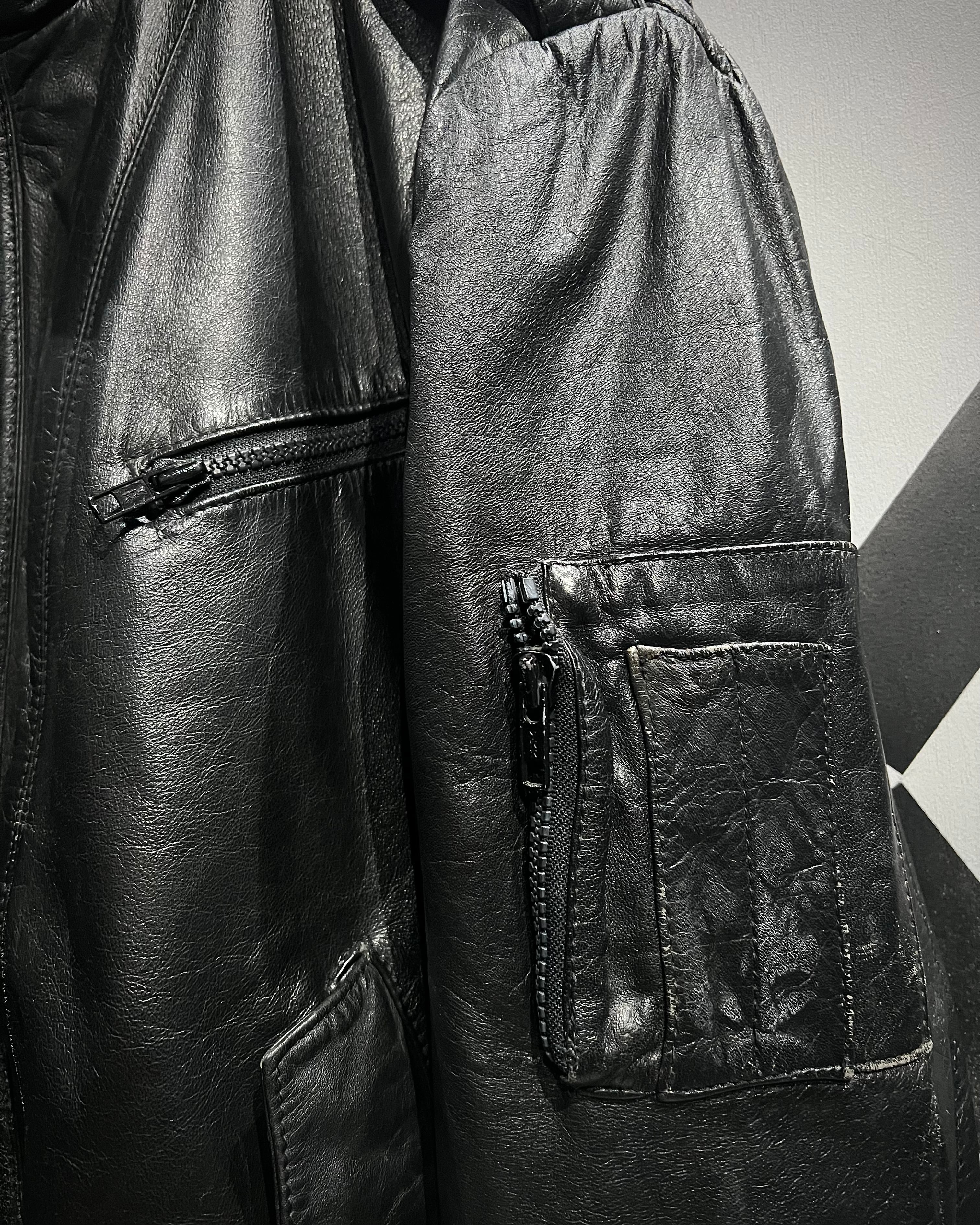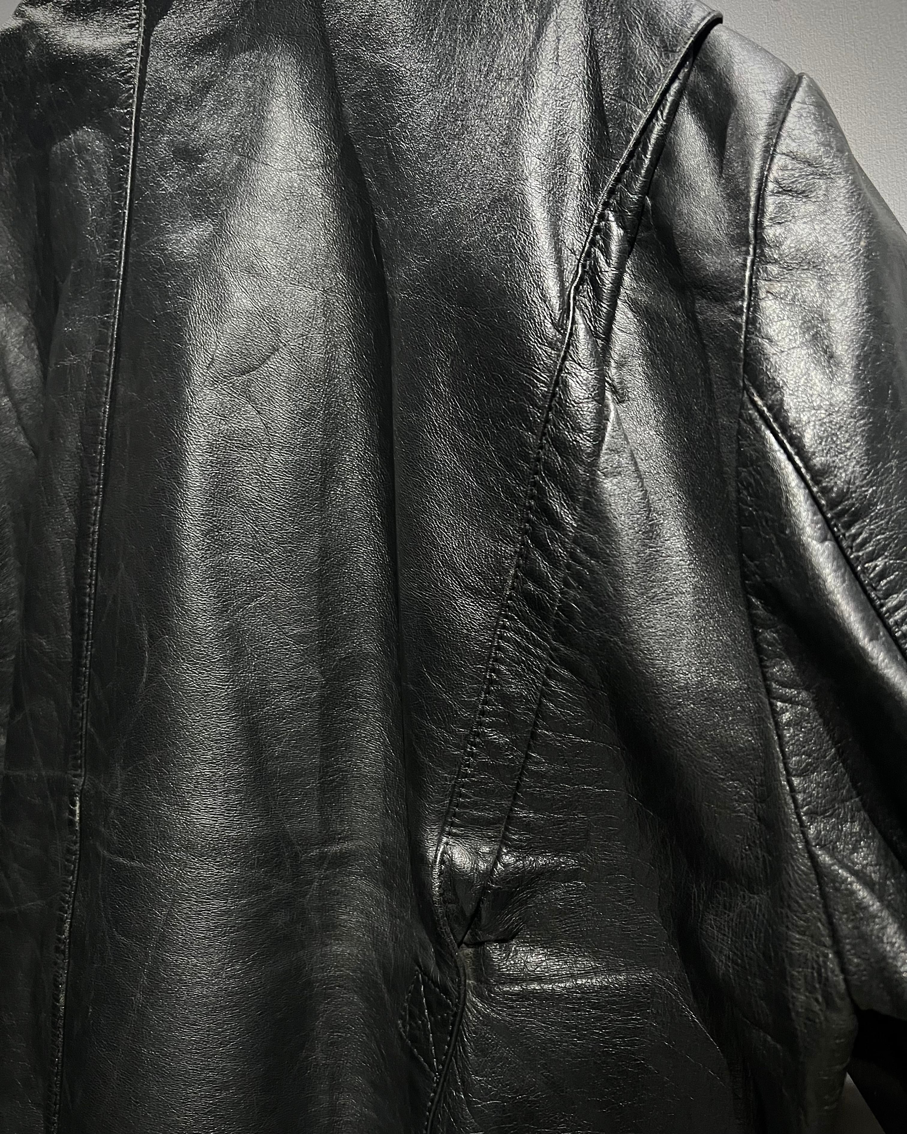 シルエットはスリムなサイズ感。身体に沿うようなラインが生まれ、レザー特有の立体感が際立つシルエットに。デニムやカーゴパンツと合わせた無骨なスタイリングはもちろん、スラックスと合わせてモードに着こなすスタイルにも自然と馴染みます。