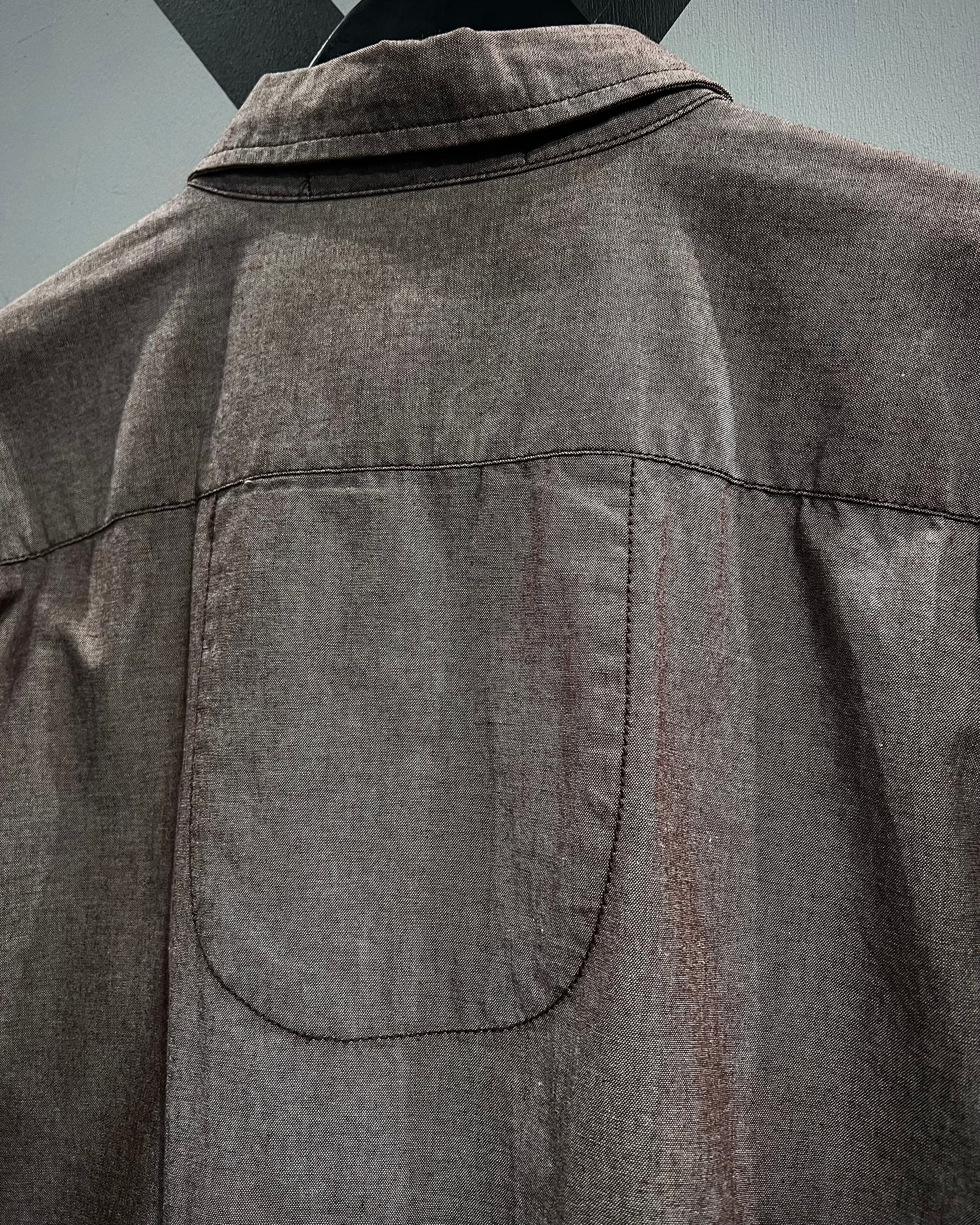 フロントにはフラップ付きのダブルポケットを配置し、左胸には小さなスリットポケットを重ねた特徴的なデザイン。ブランドネームのピスネームがさりげなく施され、主張しすぎないアクセントとして機能しています。