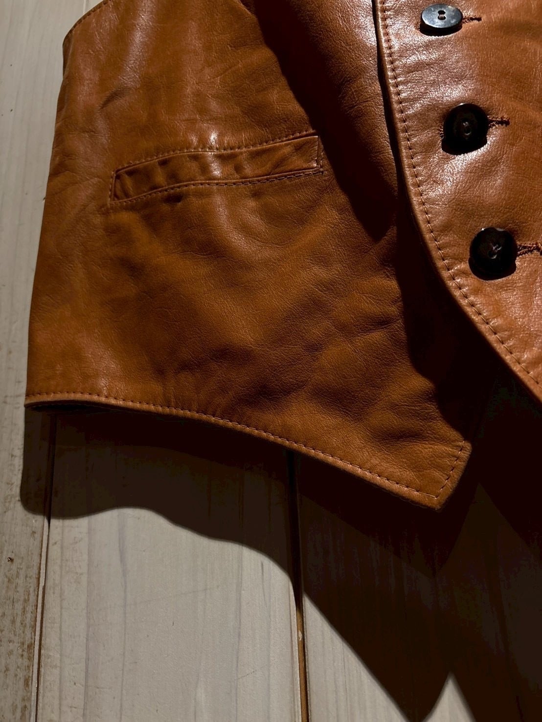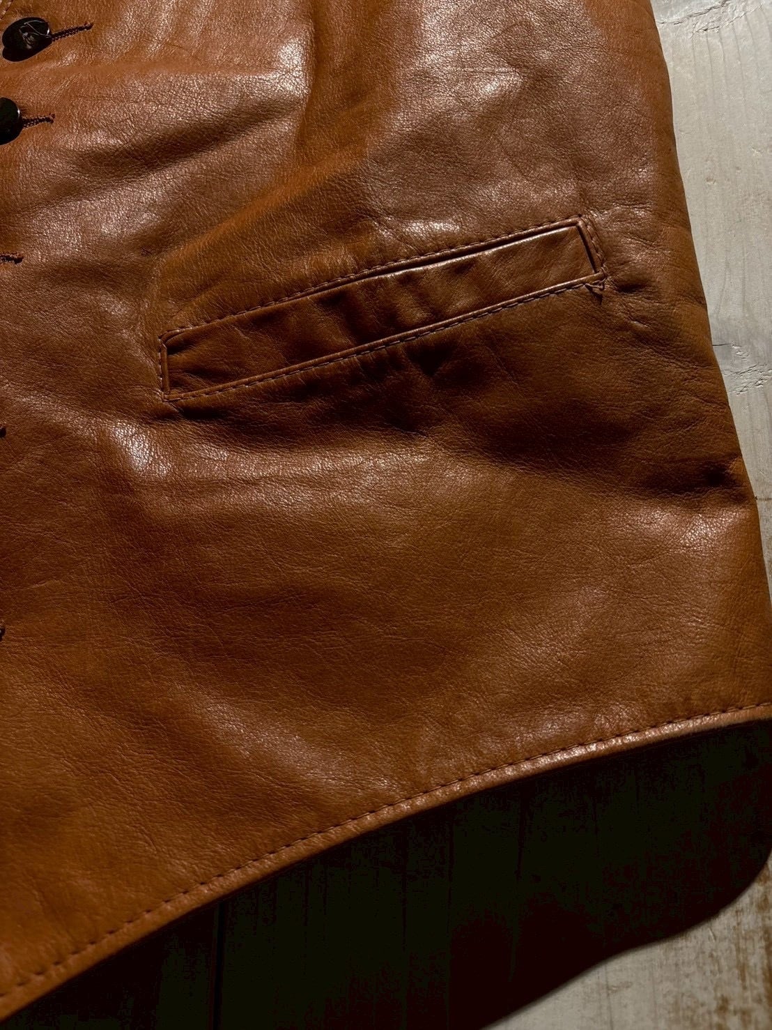 フロントはクラシックなボタン仕様に、シンプルなポケットを配置したミニマルなデザイン。無駄のない構造だからこそレザーの質感が際立ち、スタイリングのアクセントとして程よい存在感を放ちます。