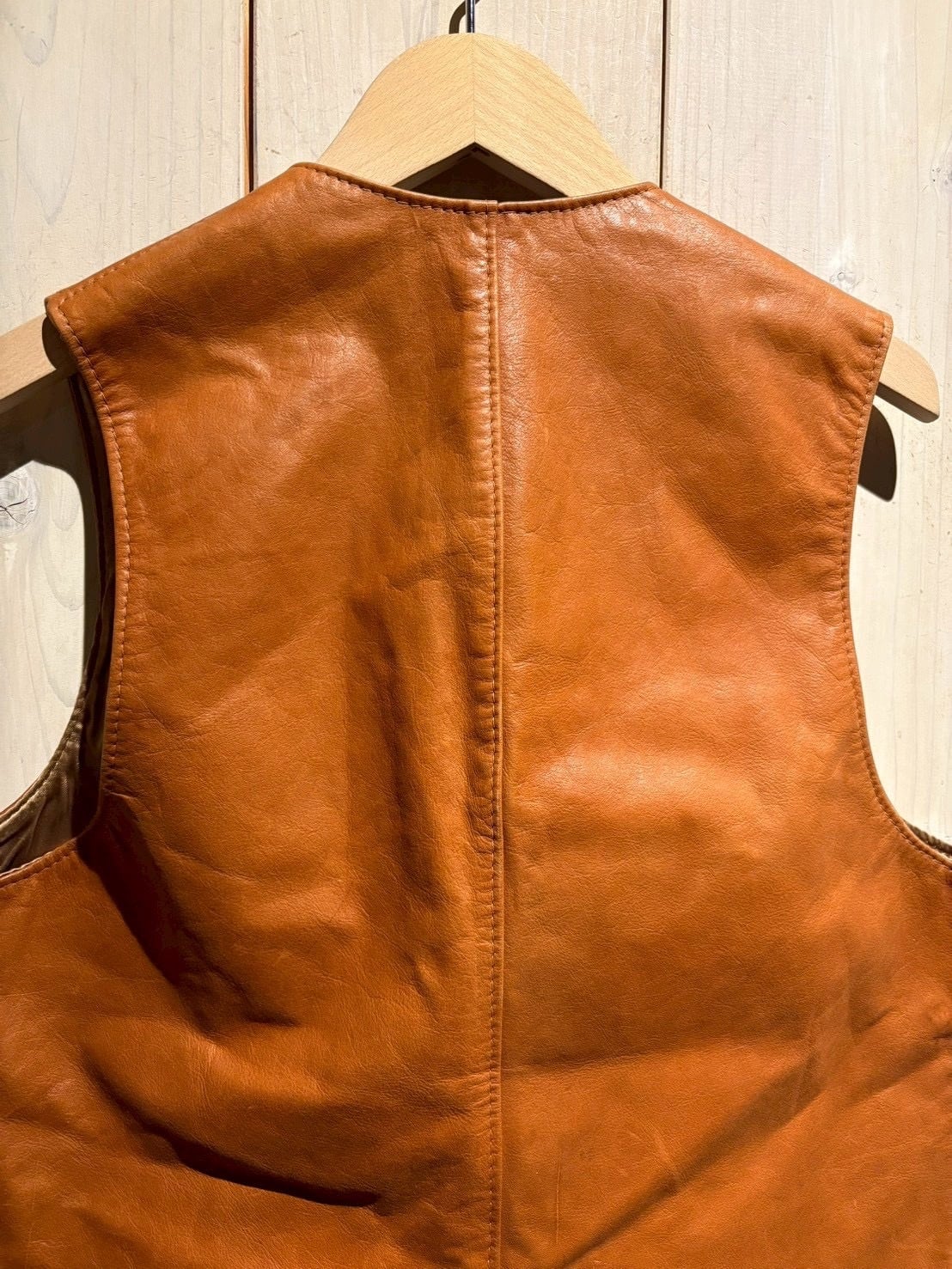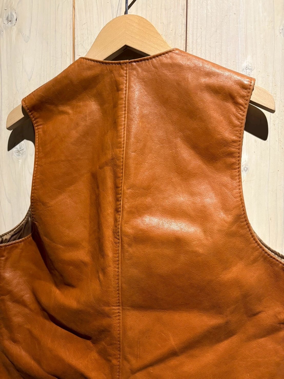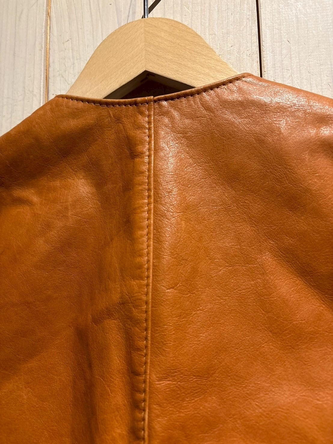 しなやかさとタフさを兼ね備えた牛革ならではの質感で、着用を重ねることでさらに味わい深い表情へと変化していく素材感が魅力。キャメルブラウンの色味も相まって、ヴィンテージレザー特有の温かみある雰囲気を演出しています。