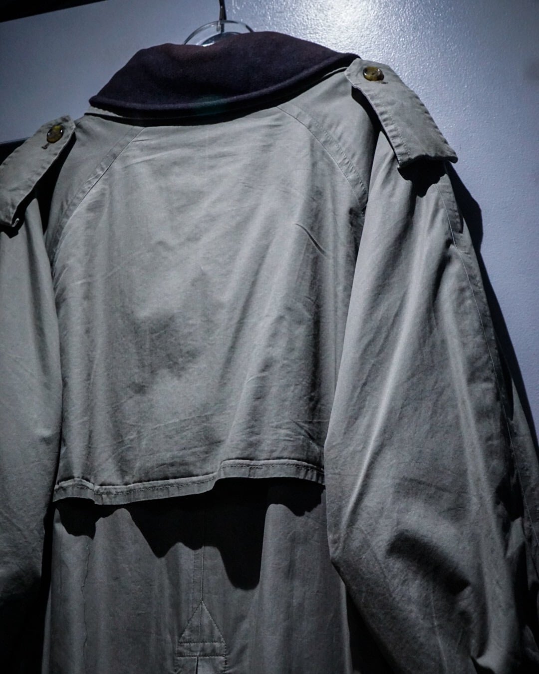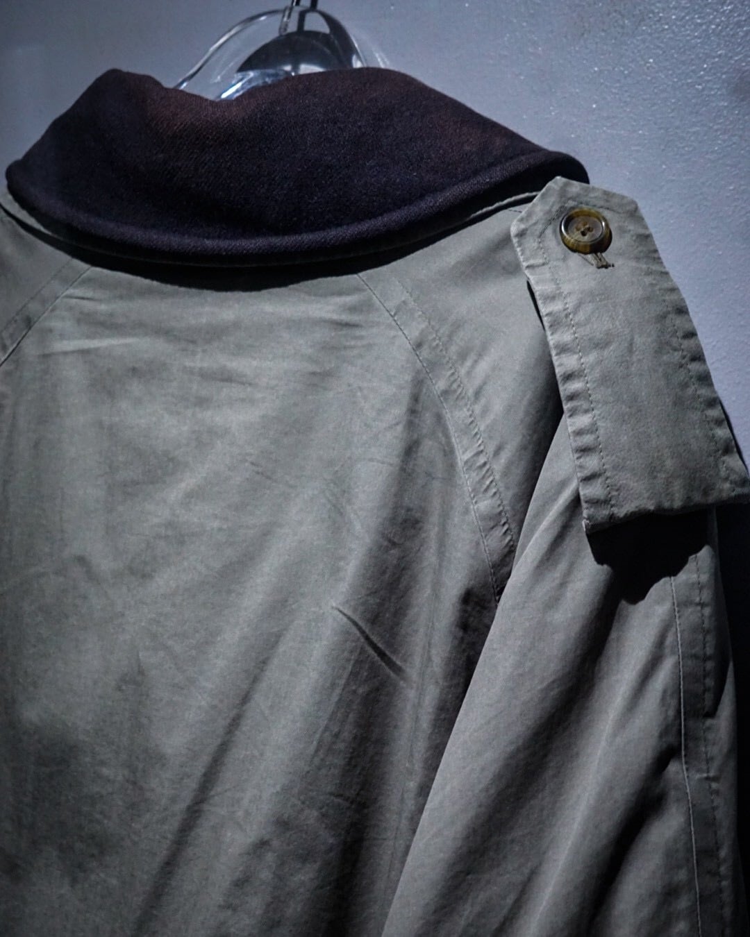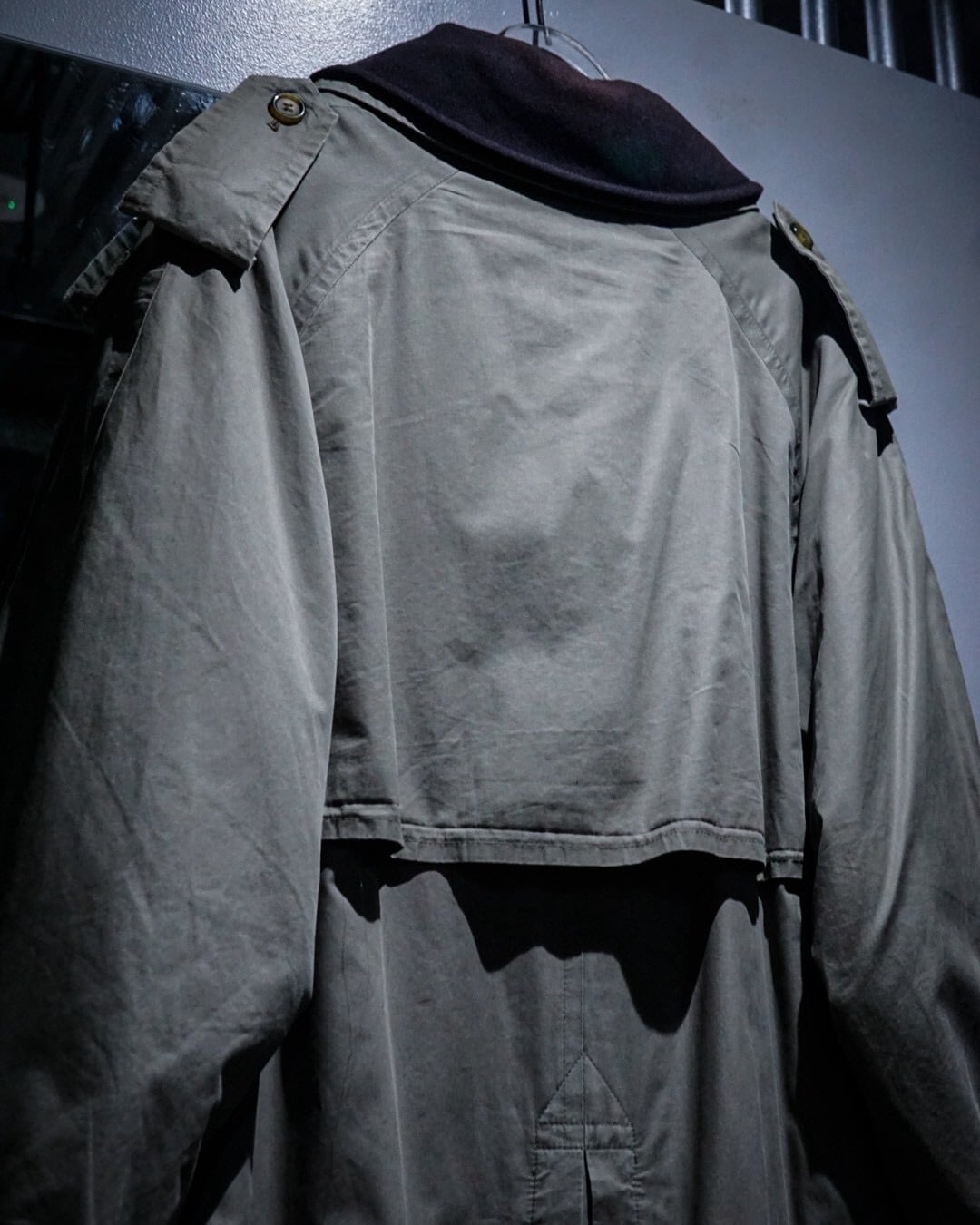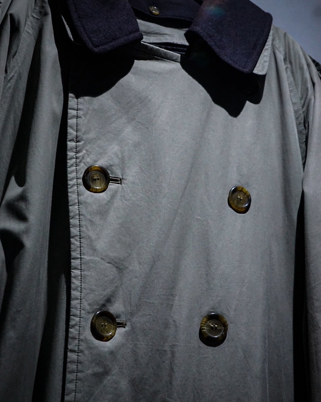 エポレットやヨーク、スリーブストラップに加えダブルブレスト仕様、トレンチコートの代表的なディテールが風格を最大限に漂わせ、そこに曲線を描く襟や全体のシルエットが相まって高級感を体現した1着。