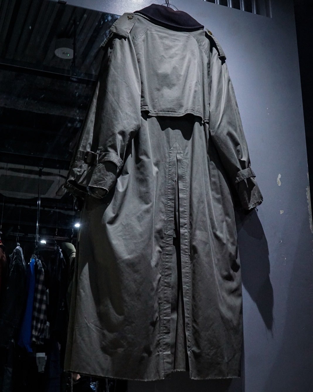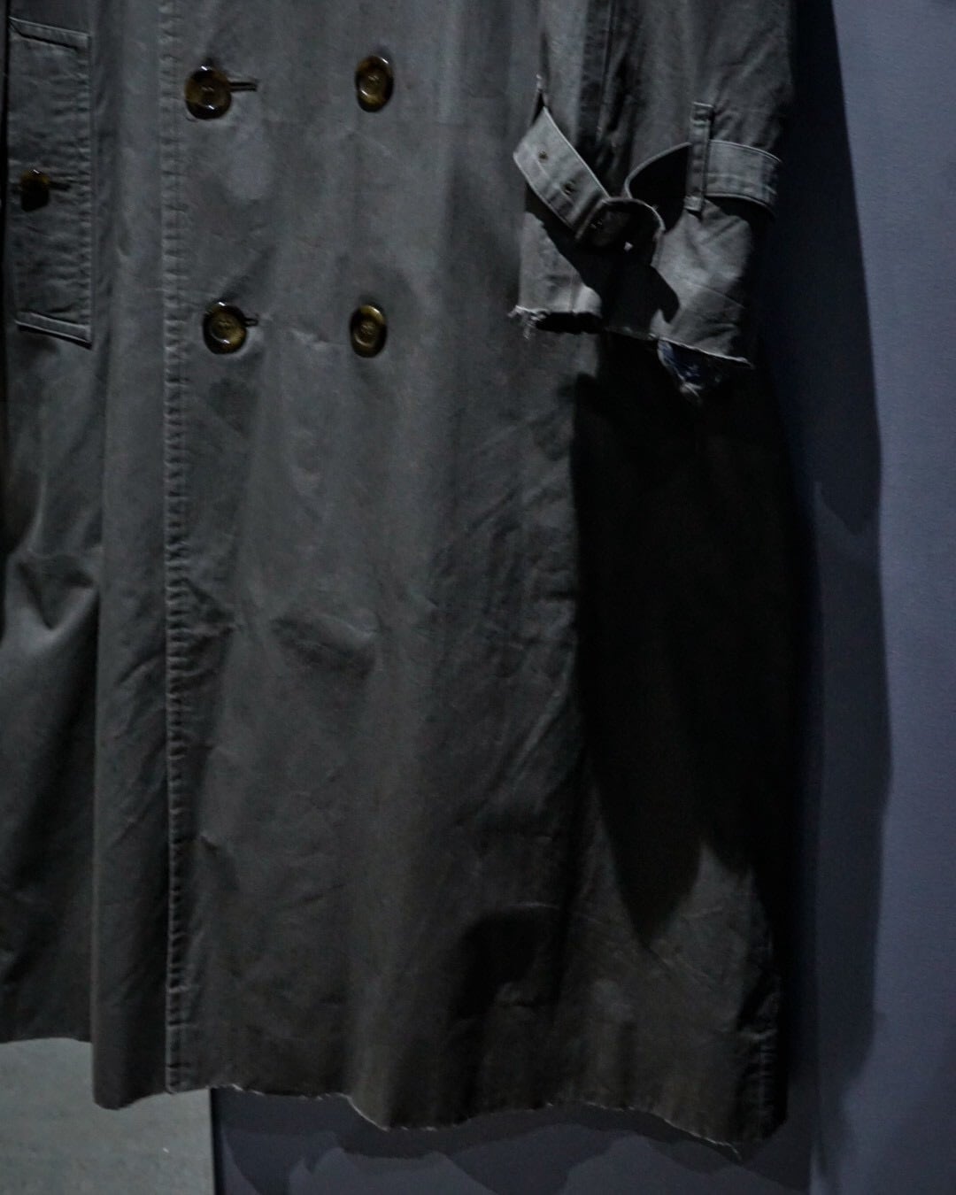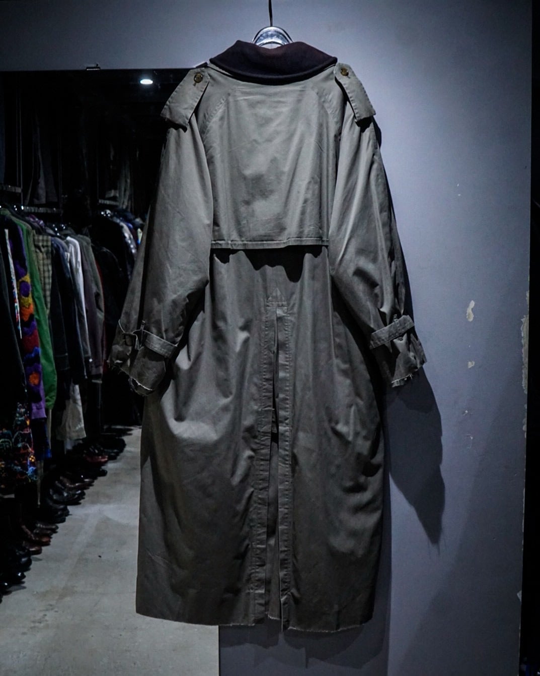 エポレットやヨーク、スリーブストラップに加えダブルブレスト仕様、トレンチコートの代表的なディテールが風格を最大限に漂わせ、そこに曲線を描く襟や全体のシルエットが相まって高級感を体現した1着。