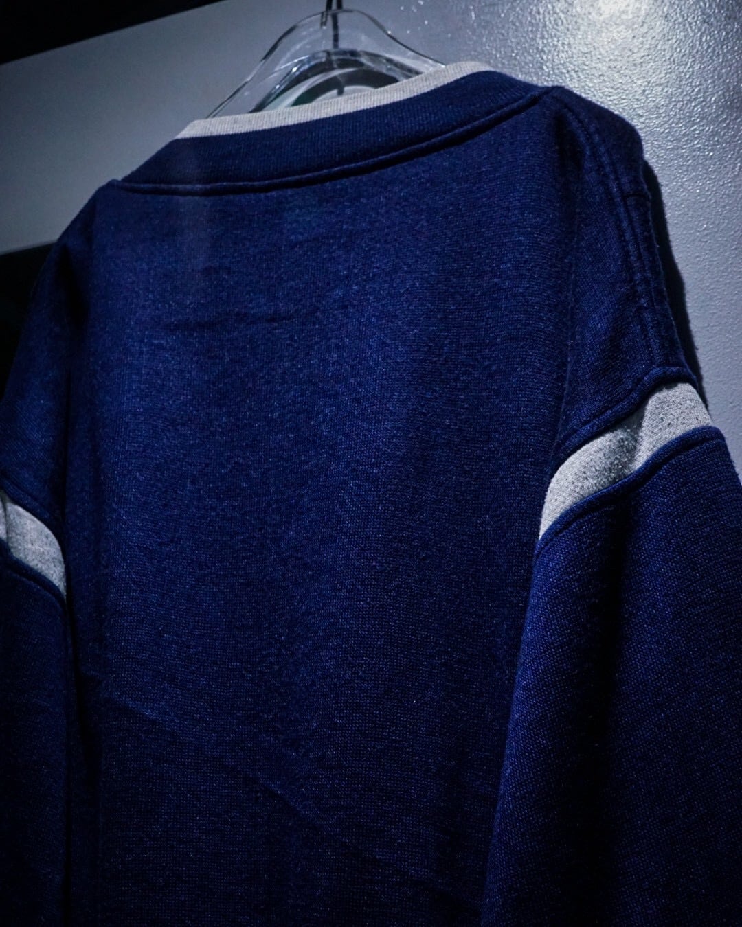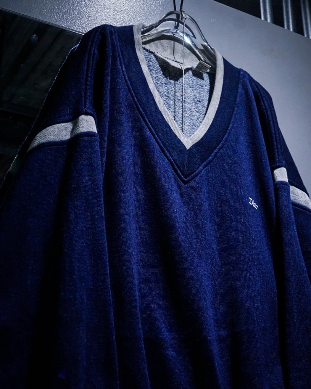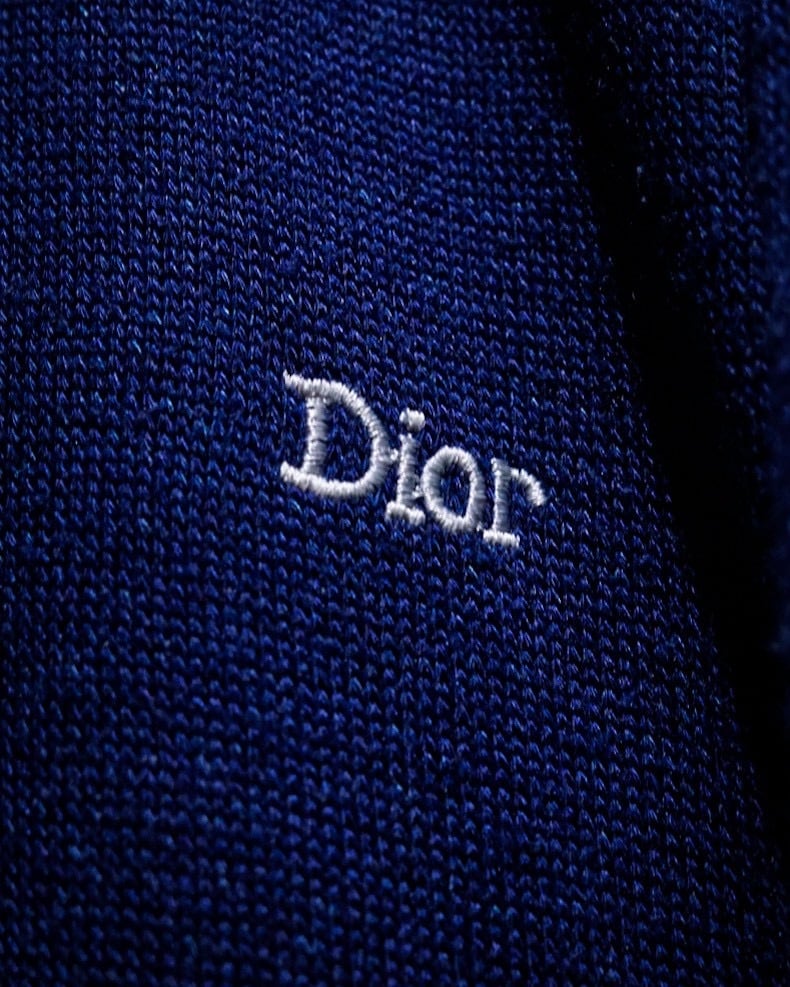 深みのあるネイビーカラーのボディに、Vネック仕様のトップスを採用。ネックや袖に走るライトグレーのラインや左胸のロゴ刺繍が程よいアクセントとなり、スポーティーな要素を取り入れながらもDiorらしい洗練された雰囲気を演出しています。
