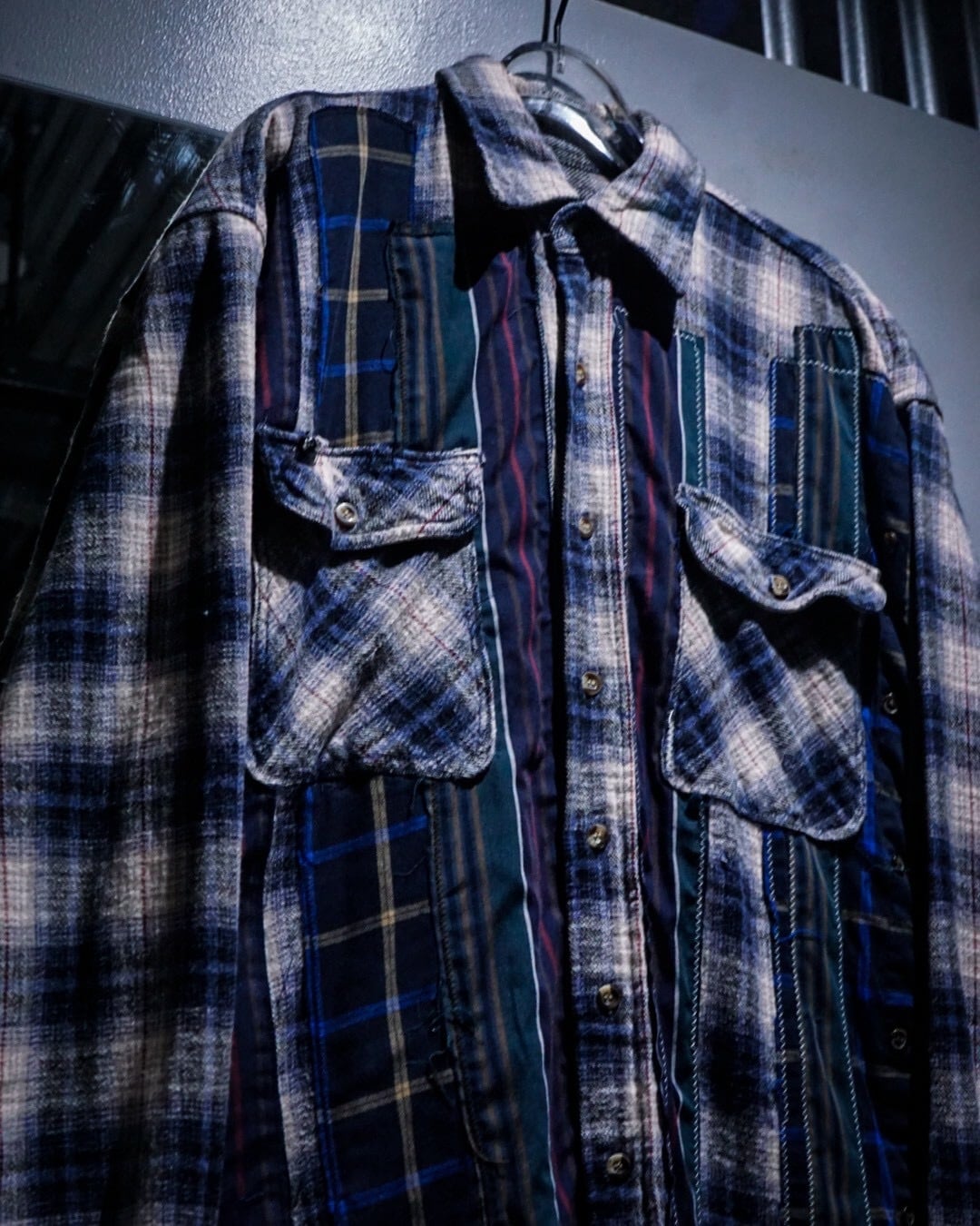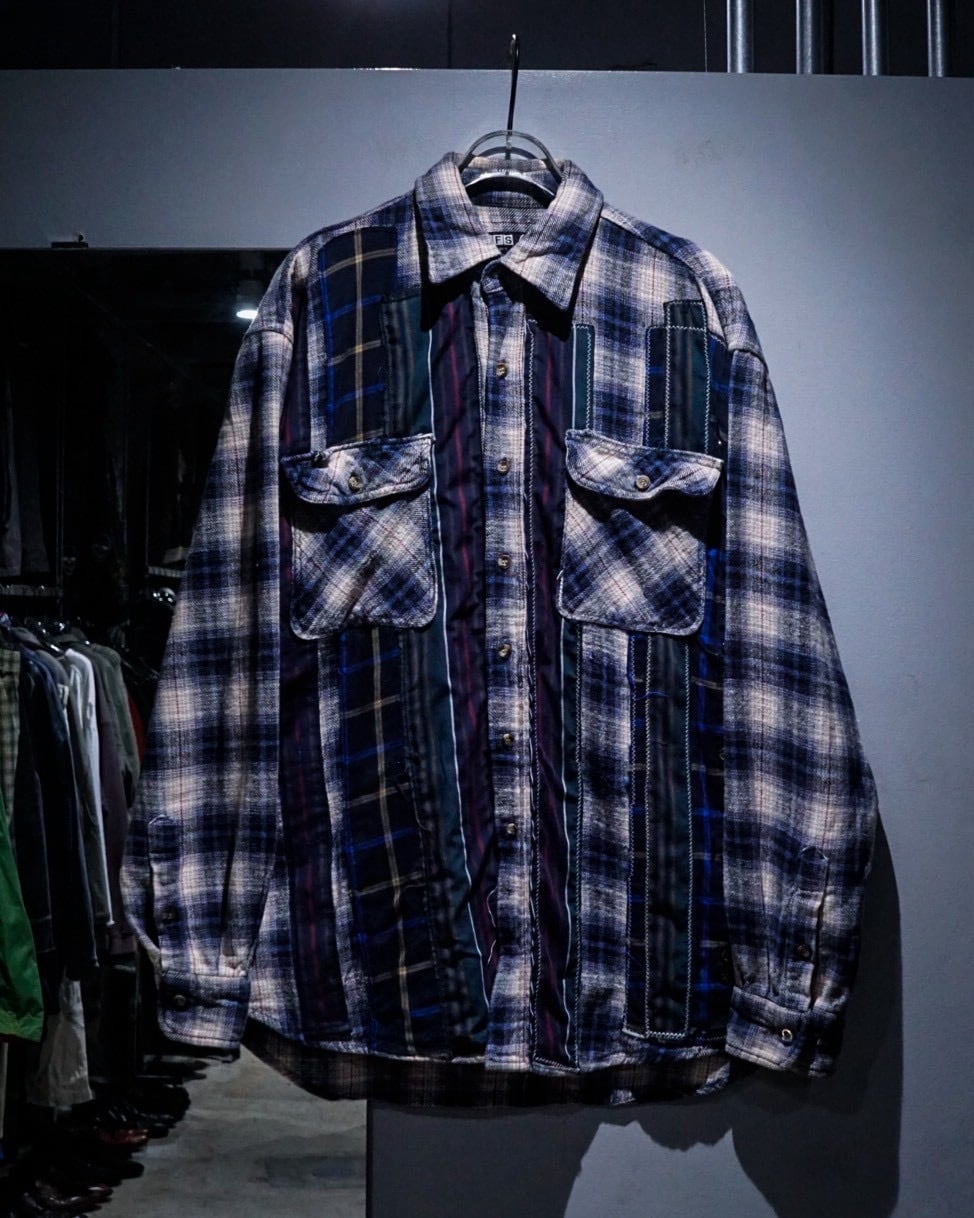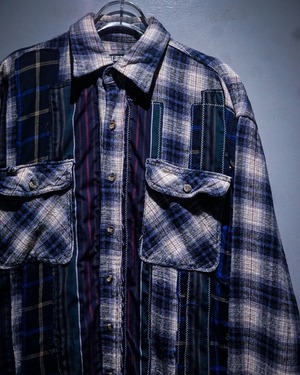 80〜90年代頃の空気感を纏ったオンブレチェックのヘビーネルシャツを基盤に、複数のストライプ生地やチェック生地を大胆に縦方向へ切り替えたパッチワークリメイクを施したスペシャルな1着。
