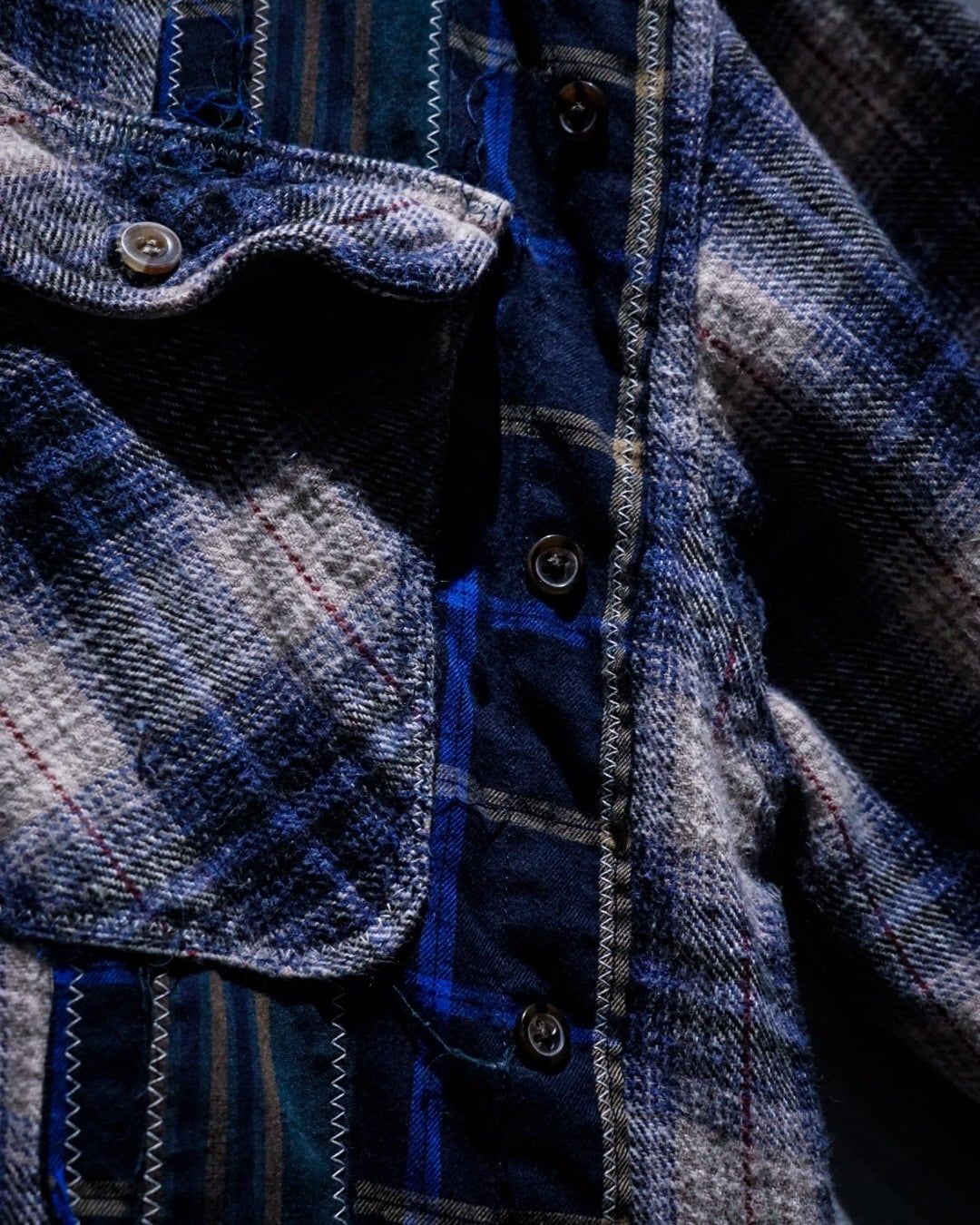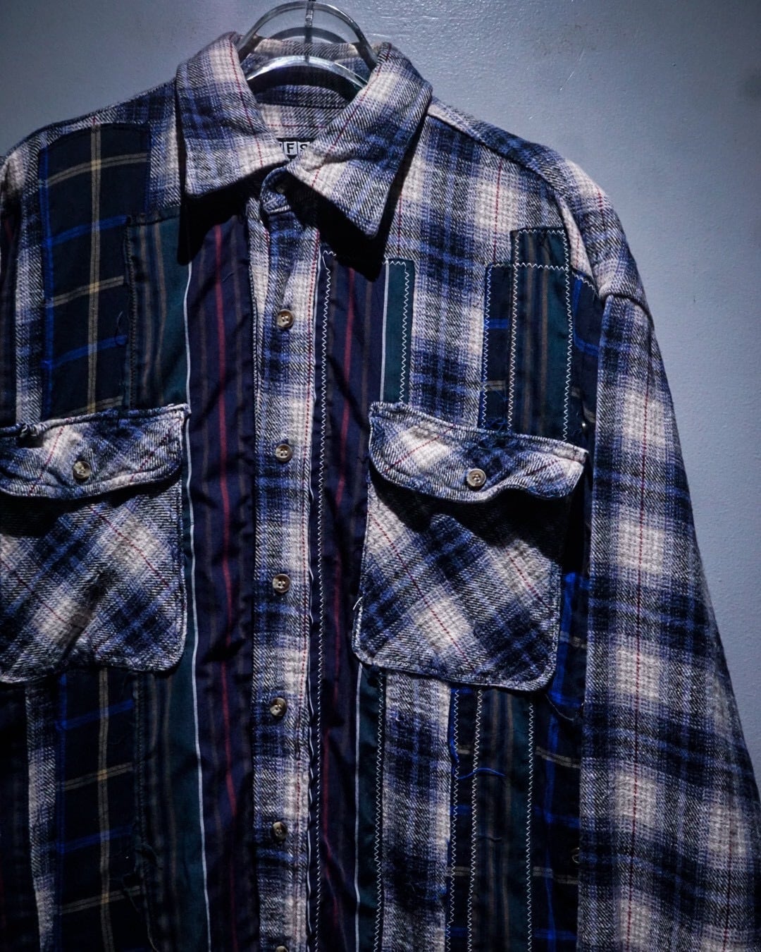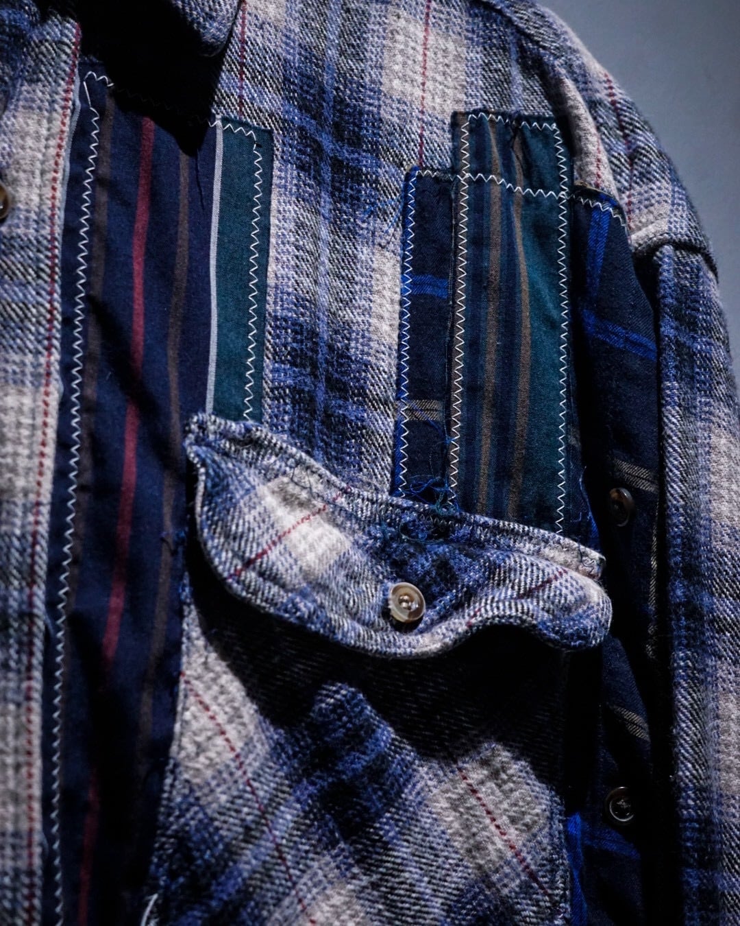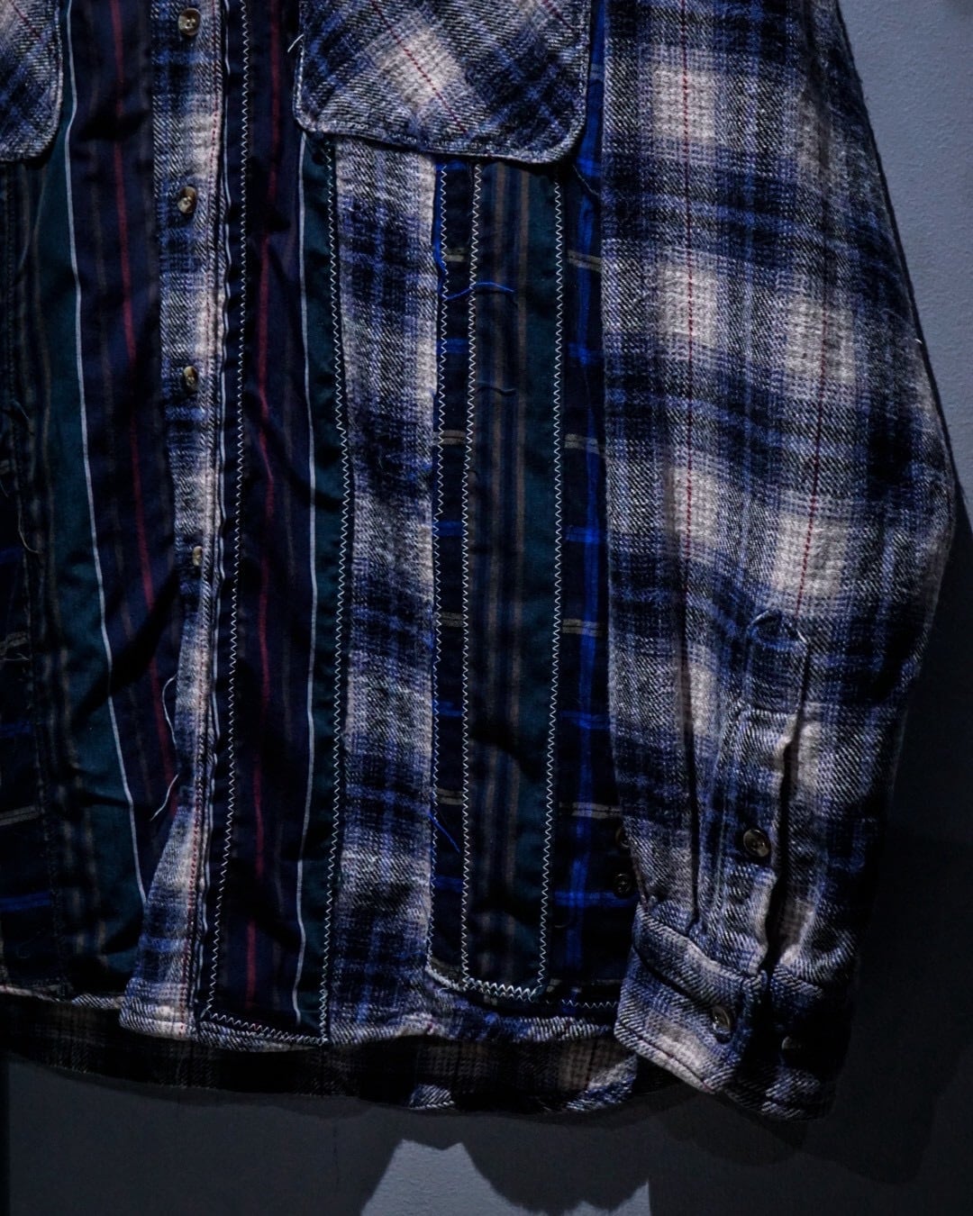 ヴィンテージネルらしい柔らかな起毛感と、ブルー〜グレーを基調とした落ち着きのあるオンブレチェックと、パッチワークによる唯一無二のデザインの掛け合わせが◎既存のネルシャツとは一線を画すデザインへと昇華されています。