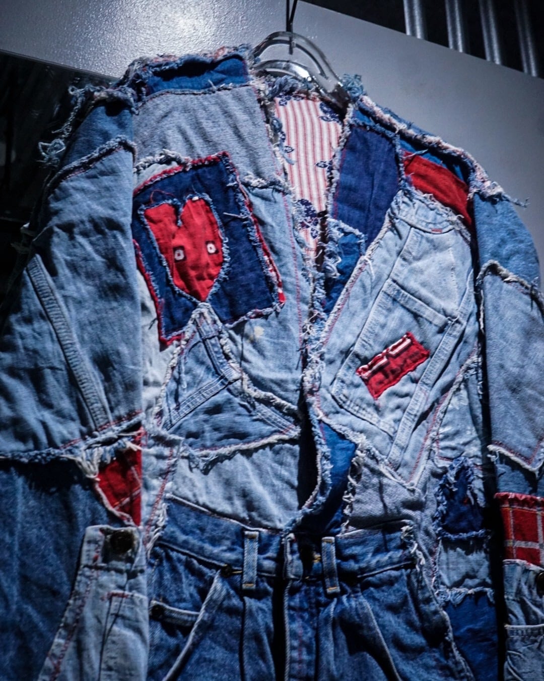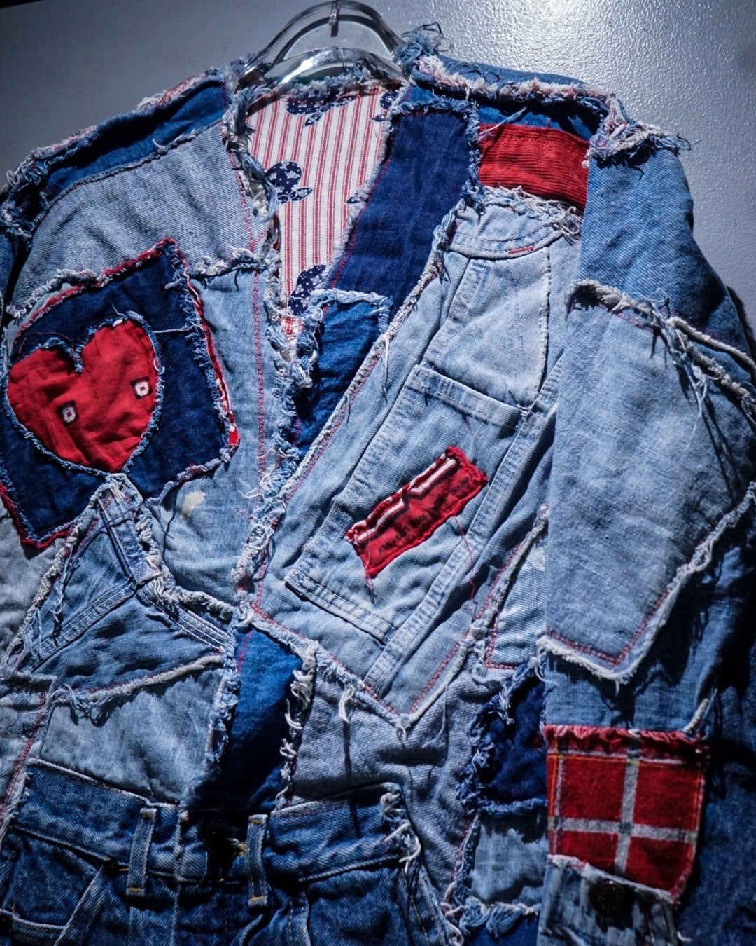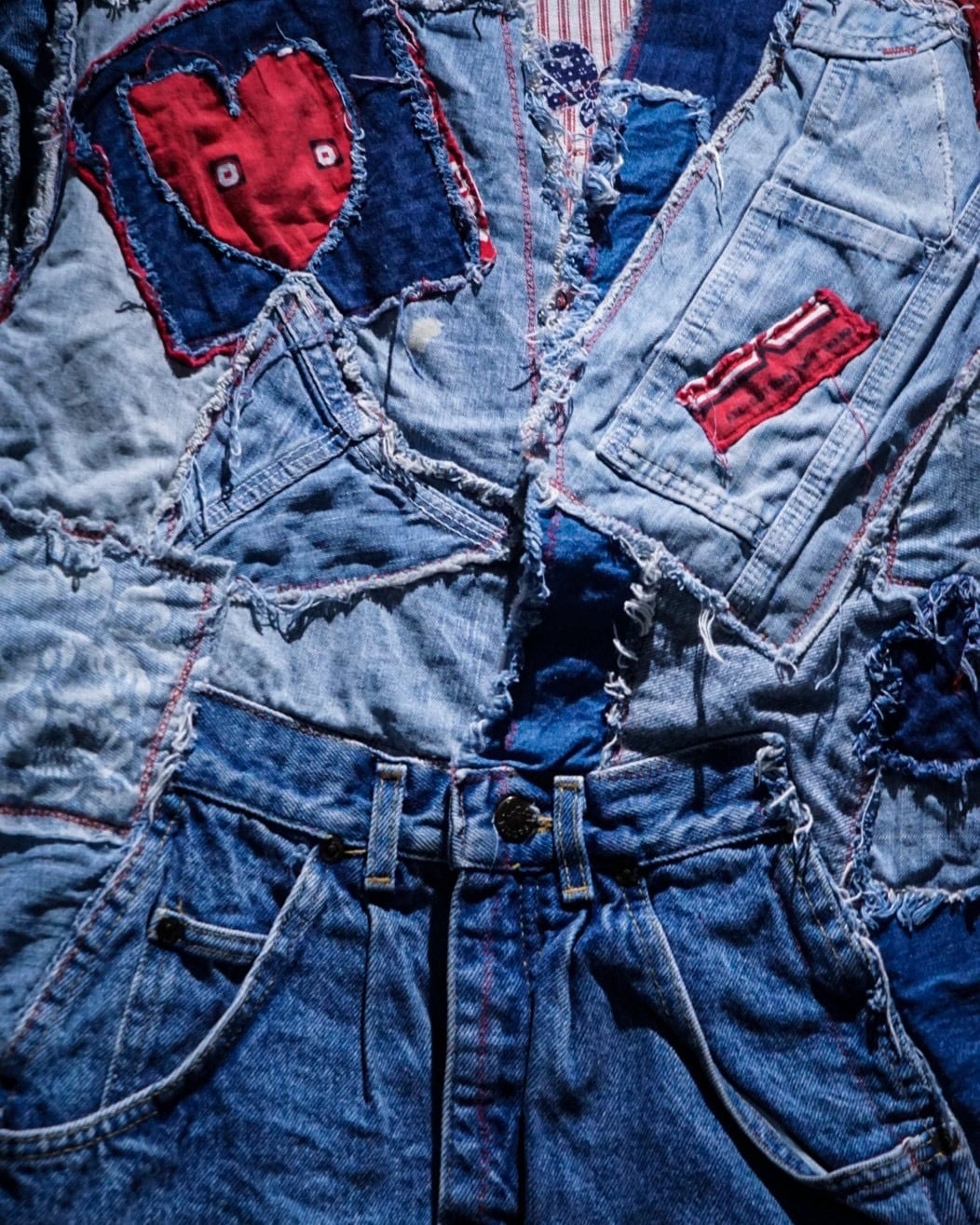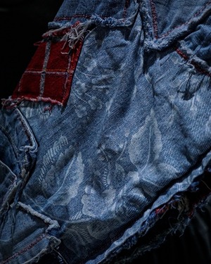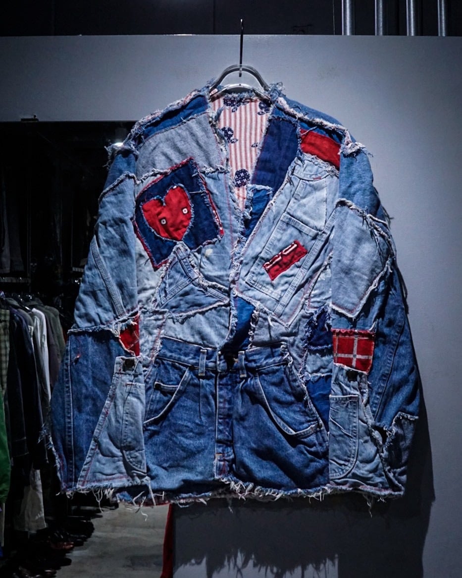 ライトオンスから色落ちしたインディゴまで様々なデニムファブリックをパッチワーク状に組み合わせ、随所にフリンジを残したラフなカッティングが特徴。赤いステッチやチェック生地などの差し色に、遊び心のあるハートモチーフのアクセントも最高です。