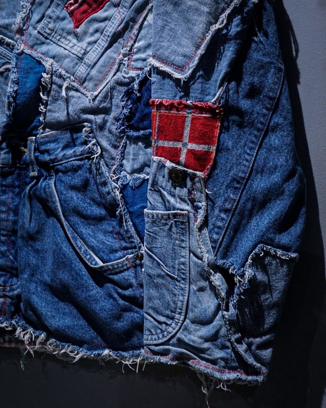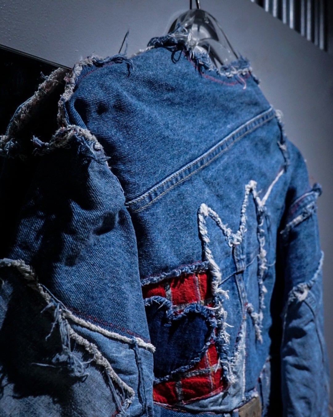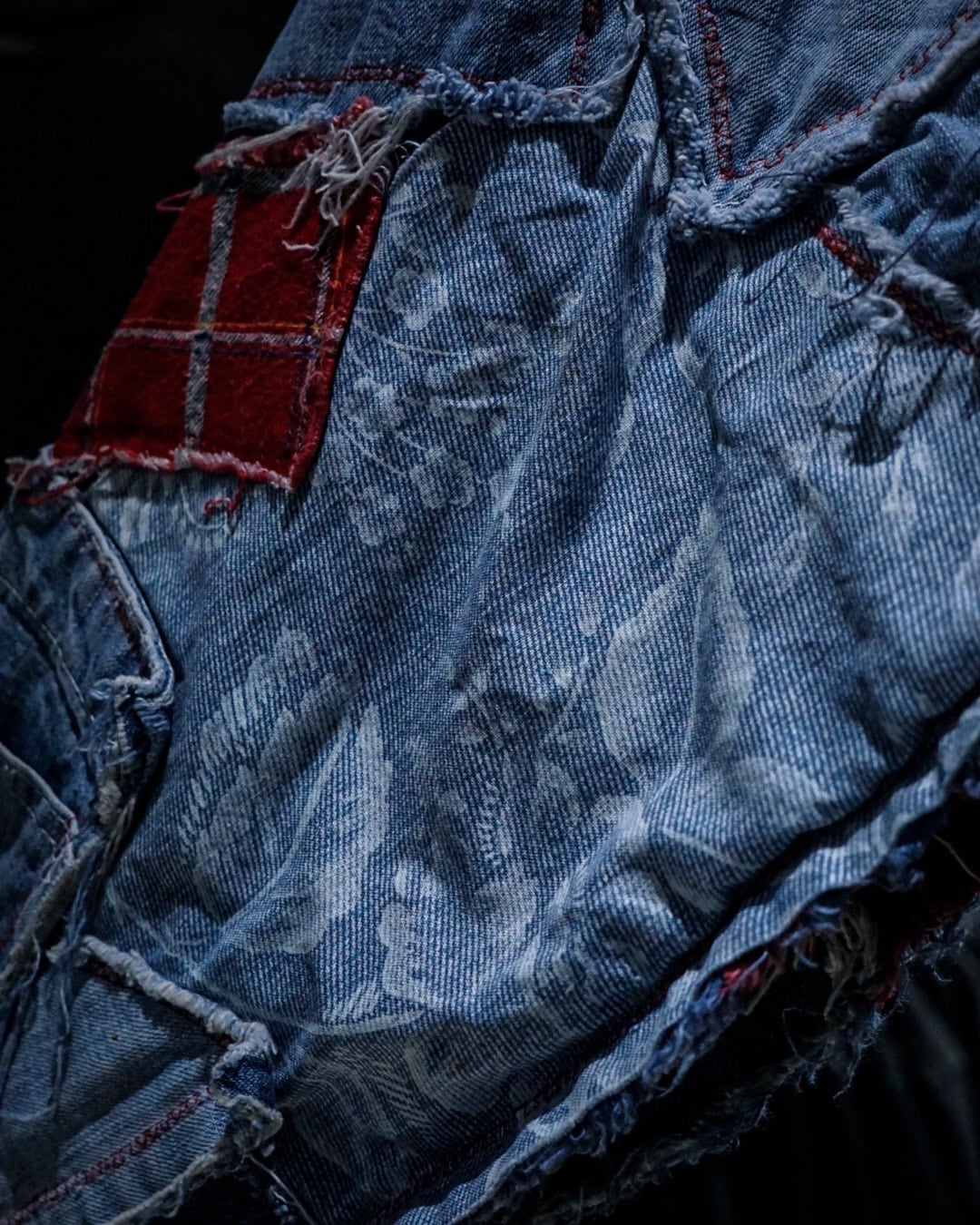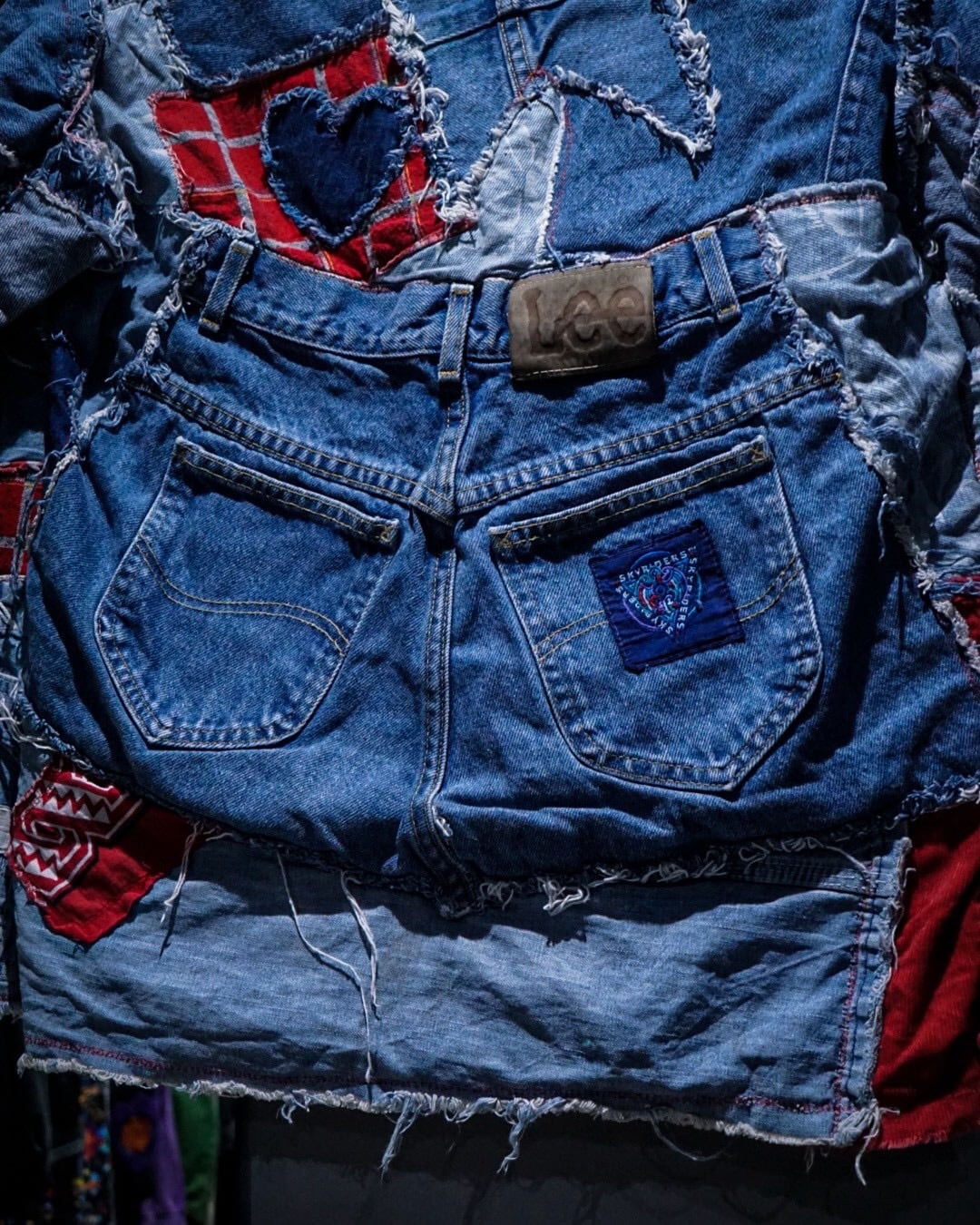 ライトオンスから色落ちしたインディゴまで様々なデニムファブリックをパッチワーク状に組み合わせ、随所にフリンジを残したラフなカッティングが特徴。赤いステッチやチェック生地などの差し色に、遊び心のあるハートモチーフのアクセントも最高です。