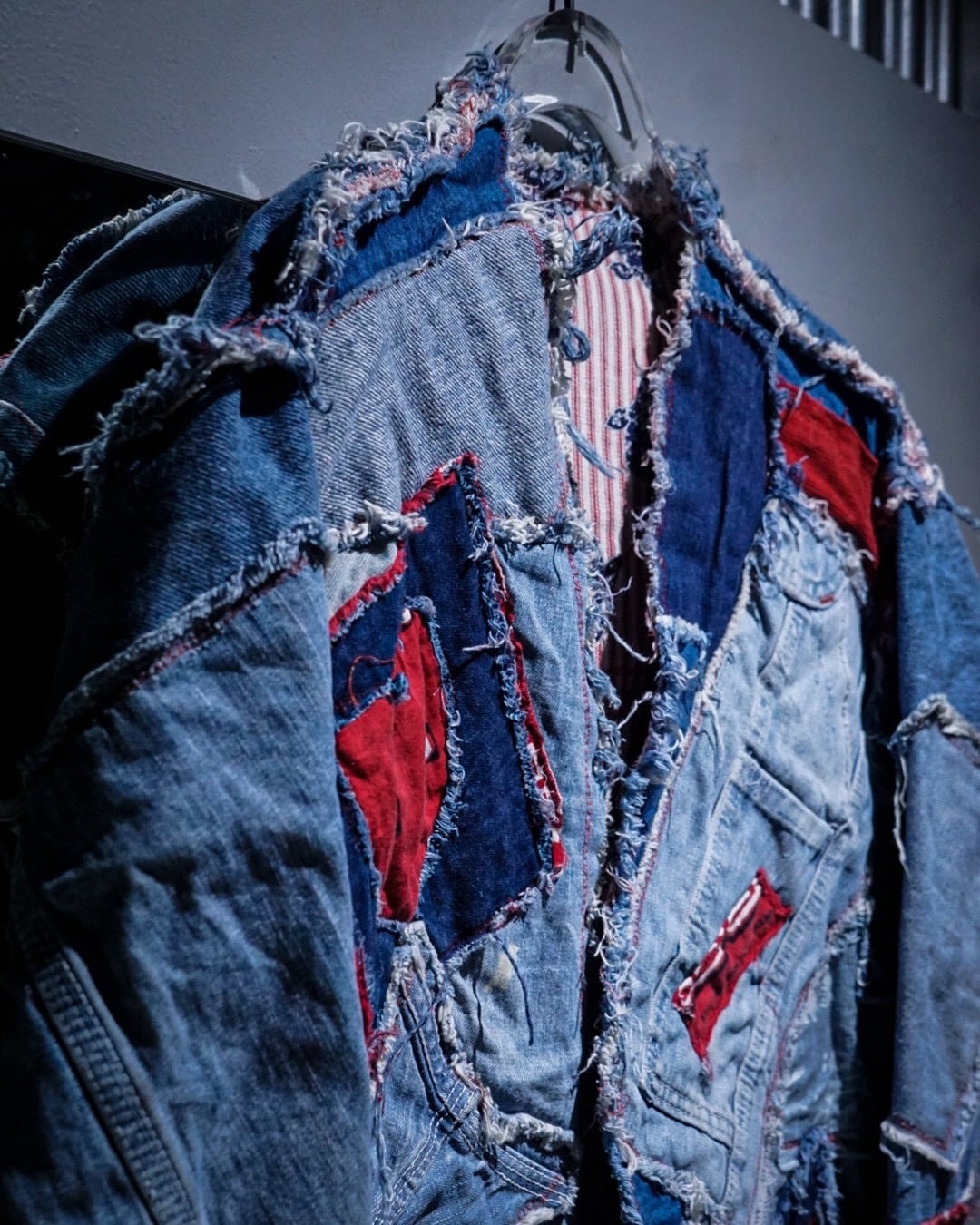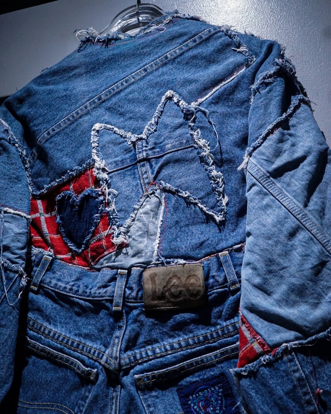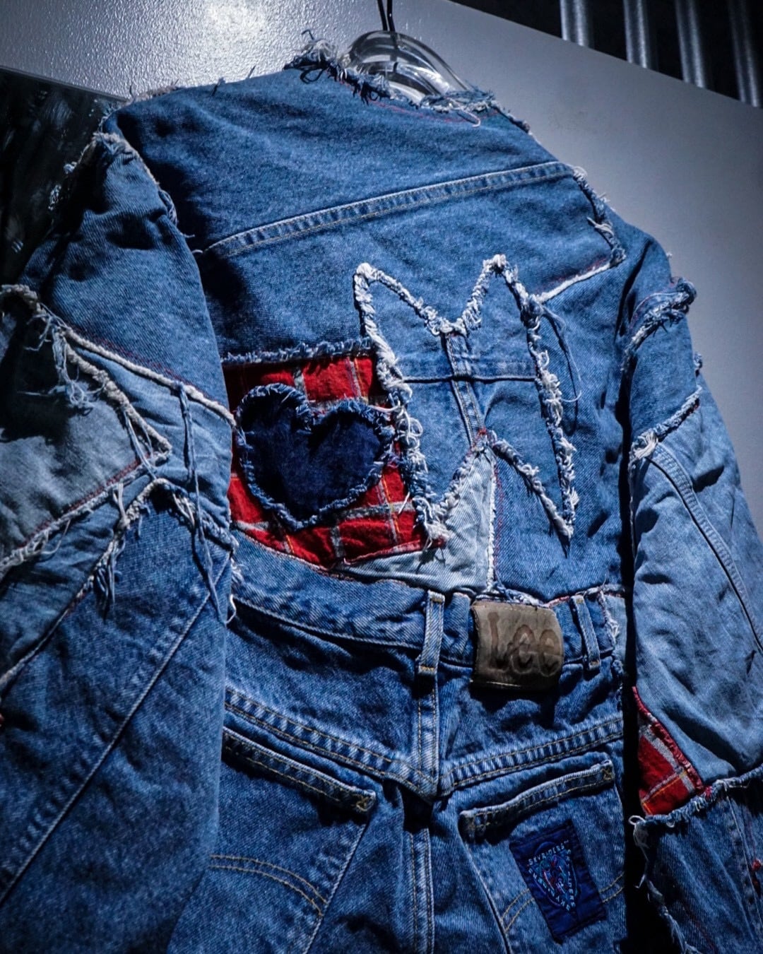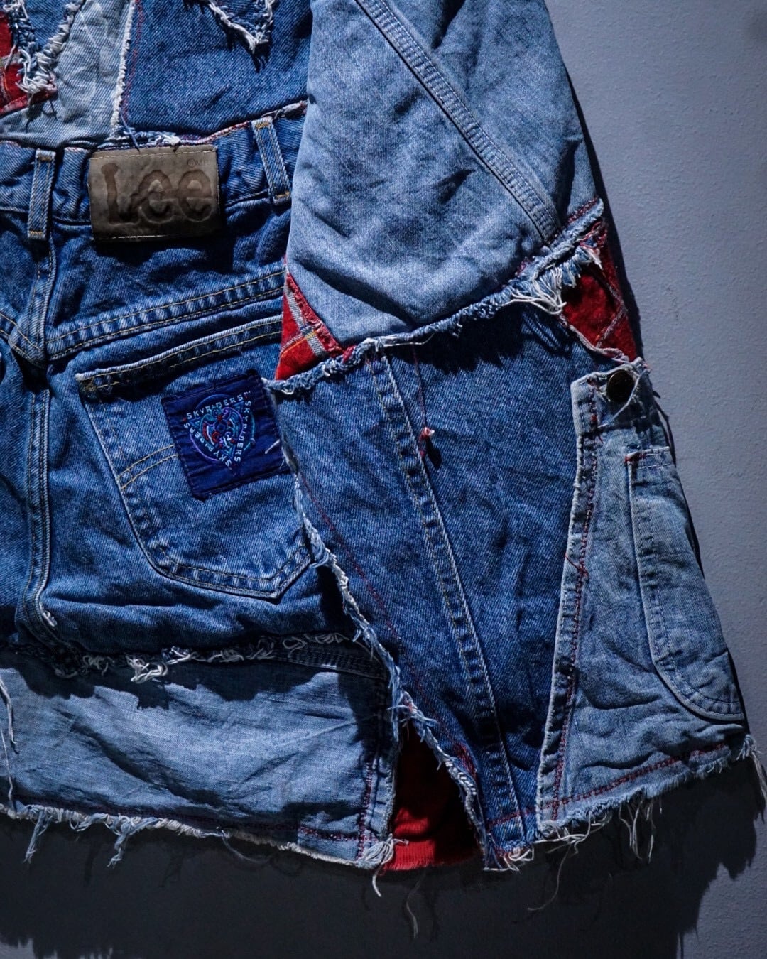 ライトオンスから色落ちしたインディゴまで様々なデニムファブリックをパッチワーク状に組み合わせ、随所にフリンジを残したラフなカッティングが特徴。赤いステッチやチェック生地などの差し色に、遊び心のあるハートモチーフのアクセントも最高です。