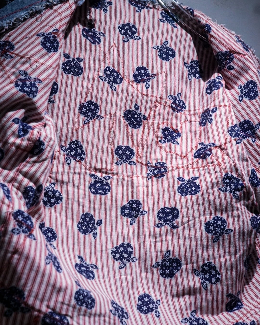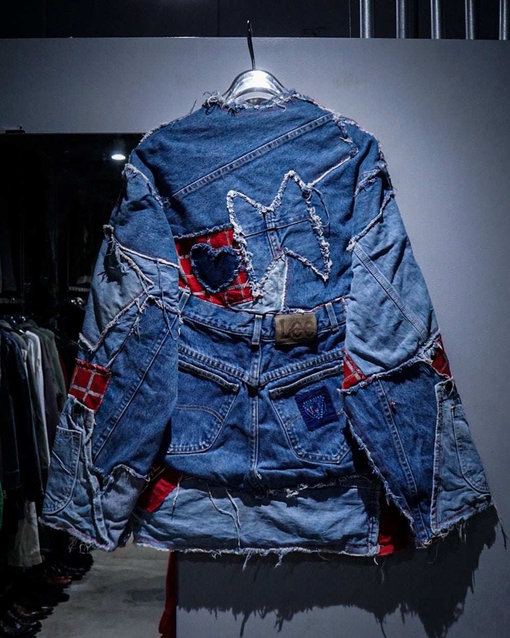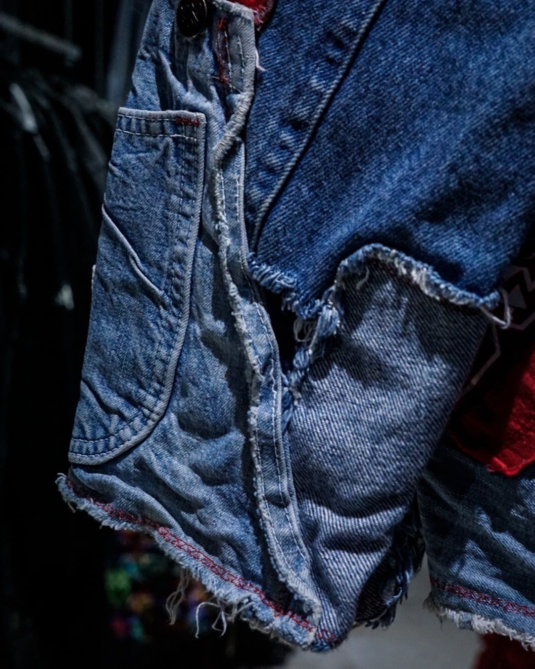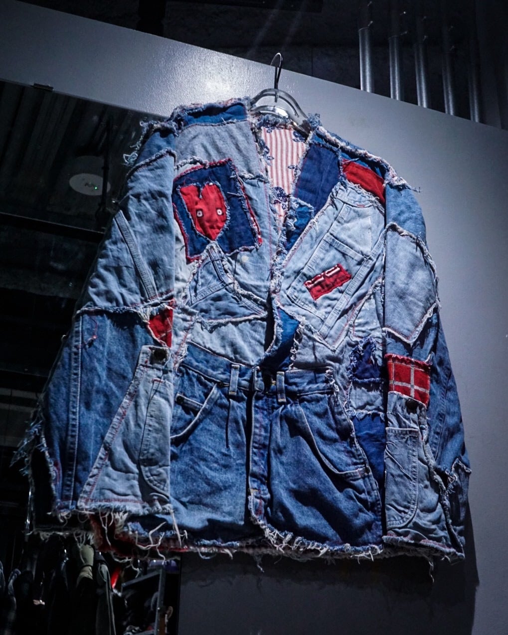 ライトオンスから色落ちしたインディゴまで様々なデニムファブリックをパッチワーク状に組み合わせ、随所にフリンジを残したラフなカッティングが特徴。赤いステッチやチェック生地などの差し色に、遊び心のあるハートモチーフのアクセントも最高です。