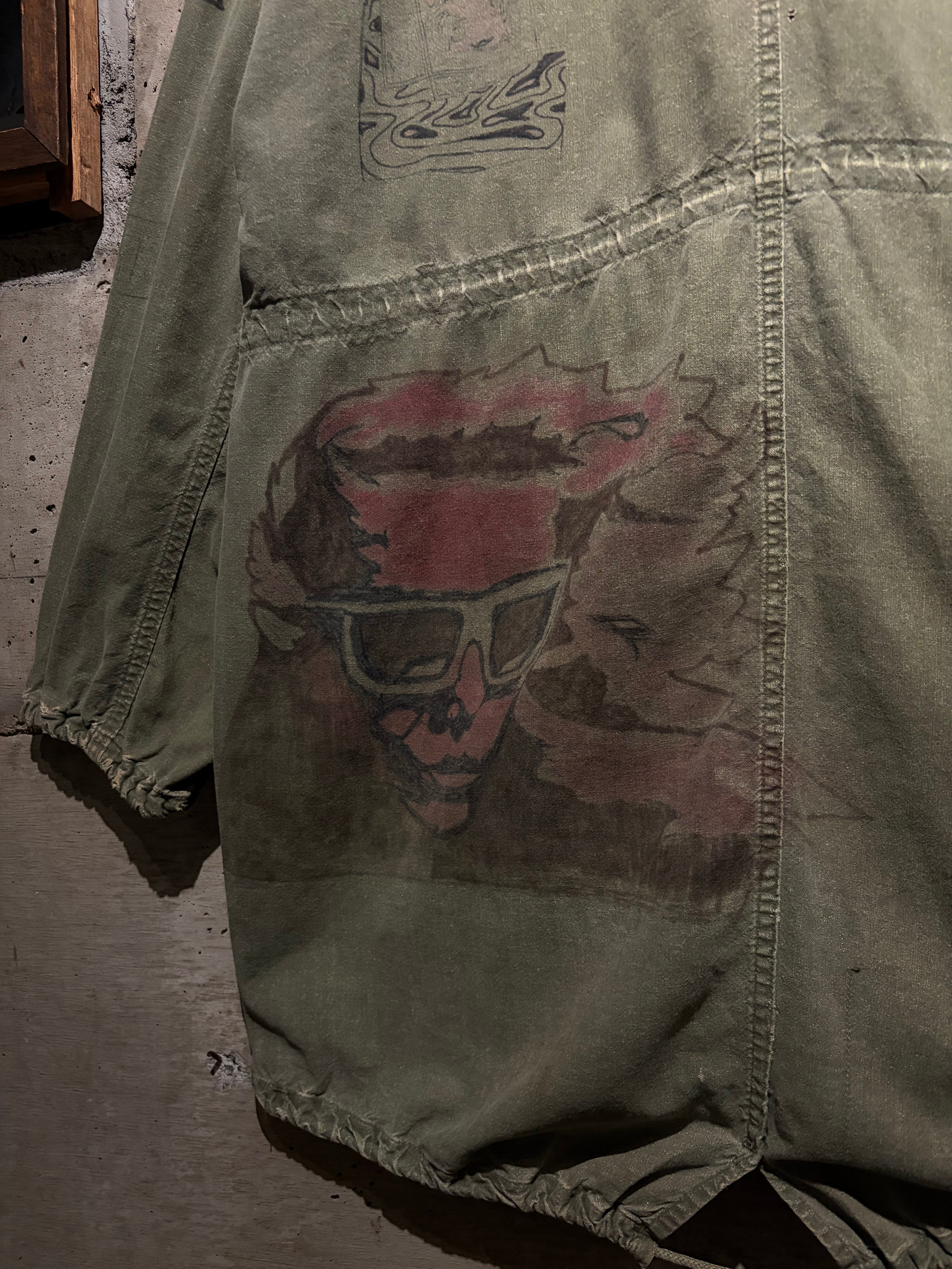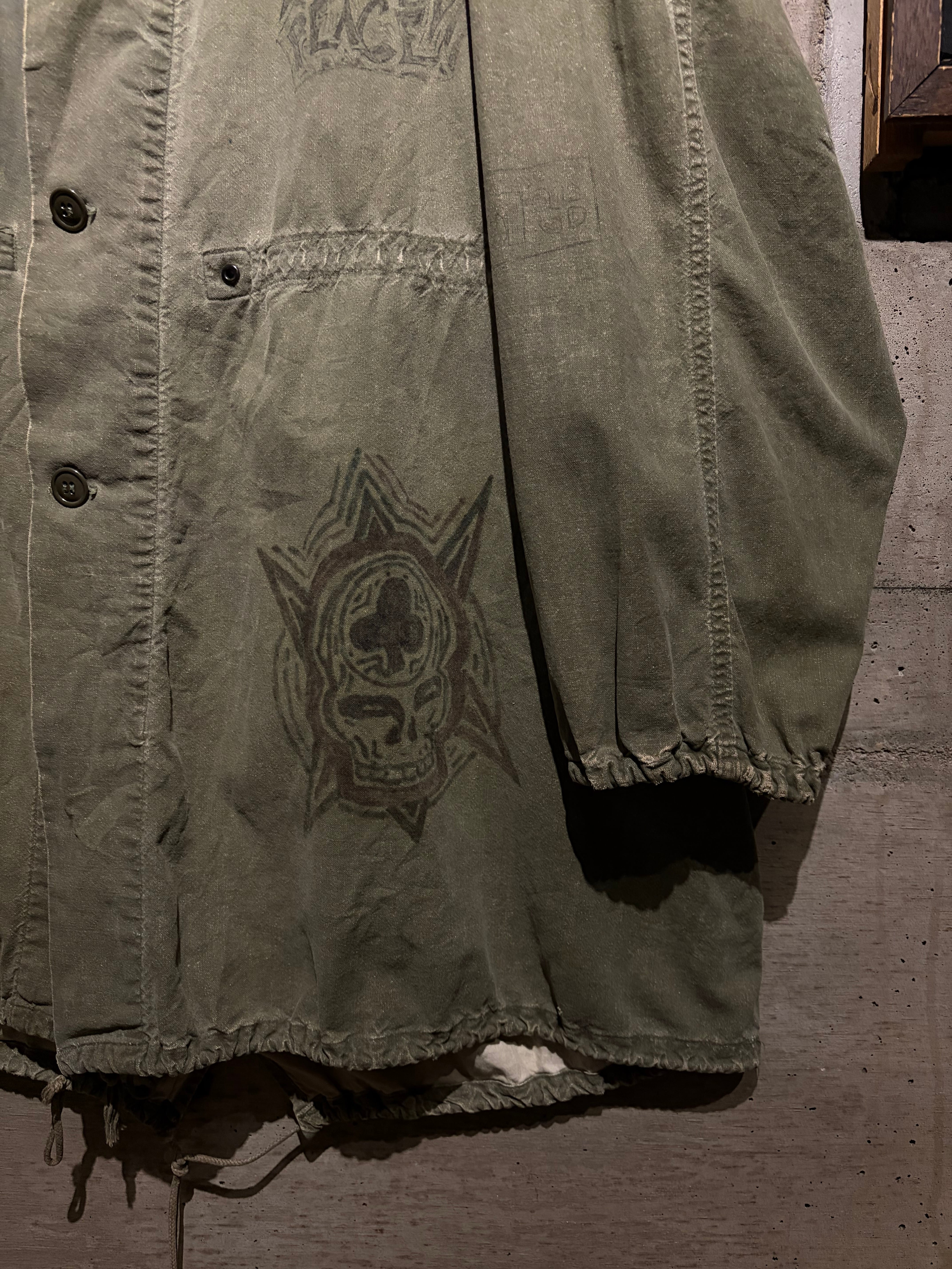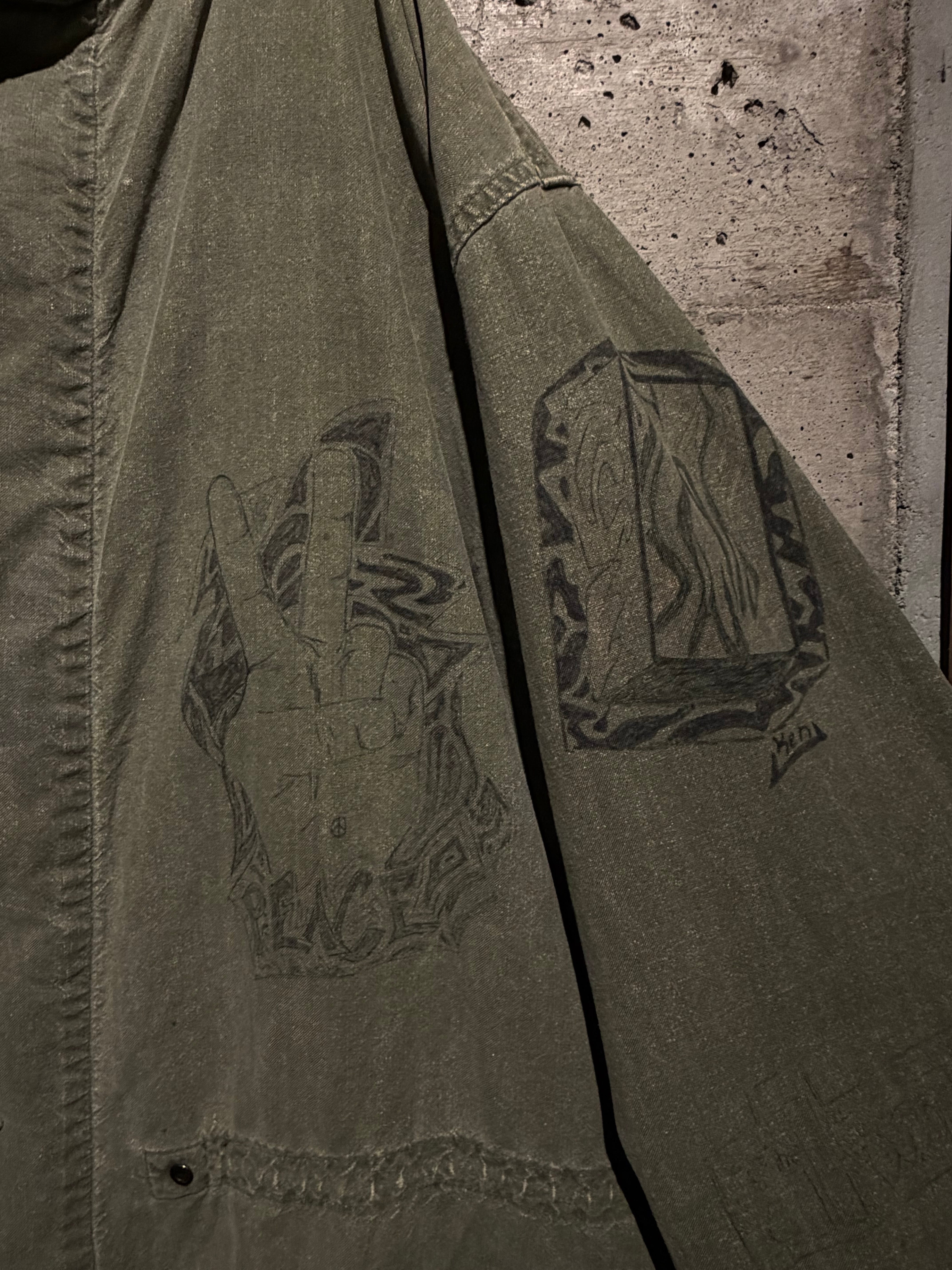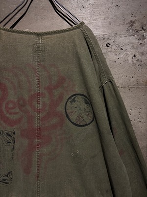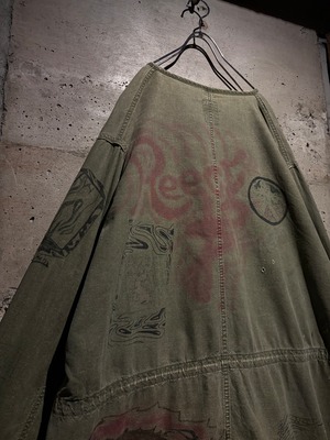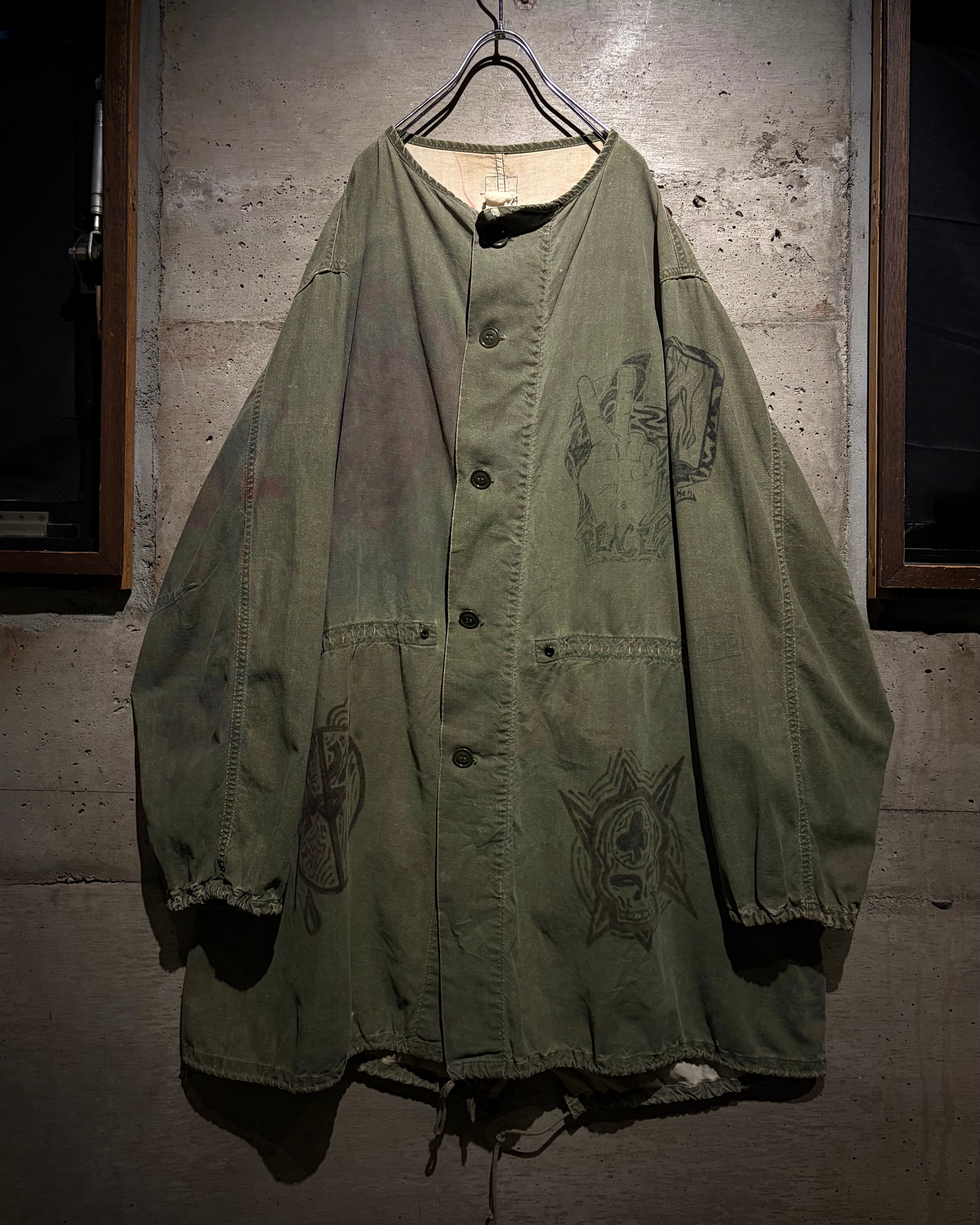 フロントにはスカルモチーフや独特な雰囲気を放つグラフィック、袖や裾、背面にも大胆なドローイングが施され、ミリタリーウェアの無骨な表情に思想全開な。