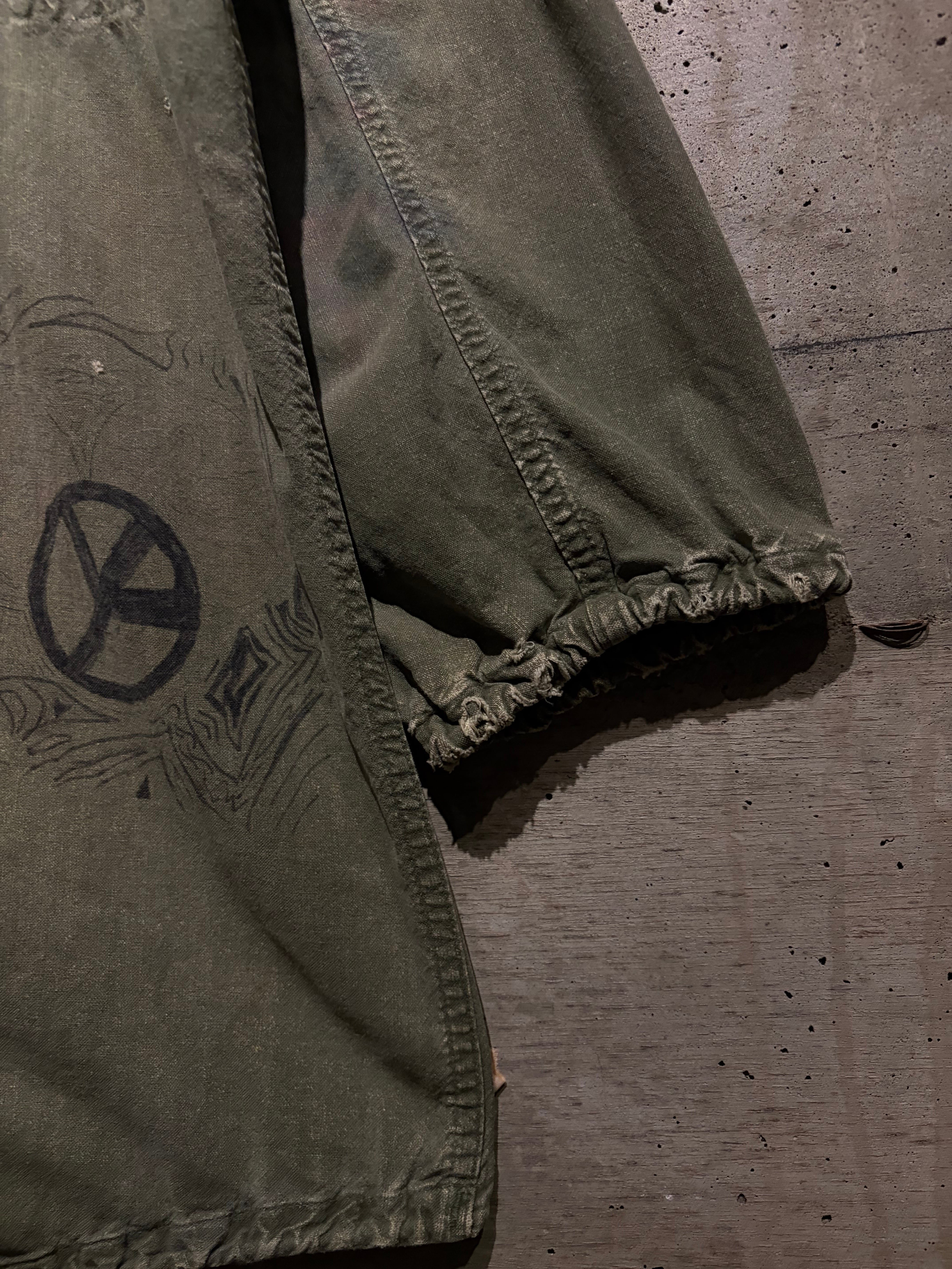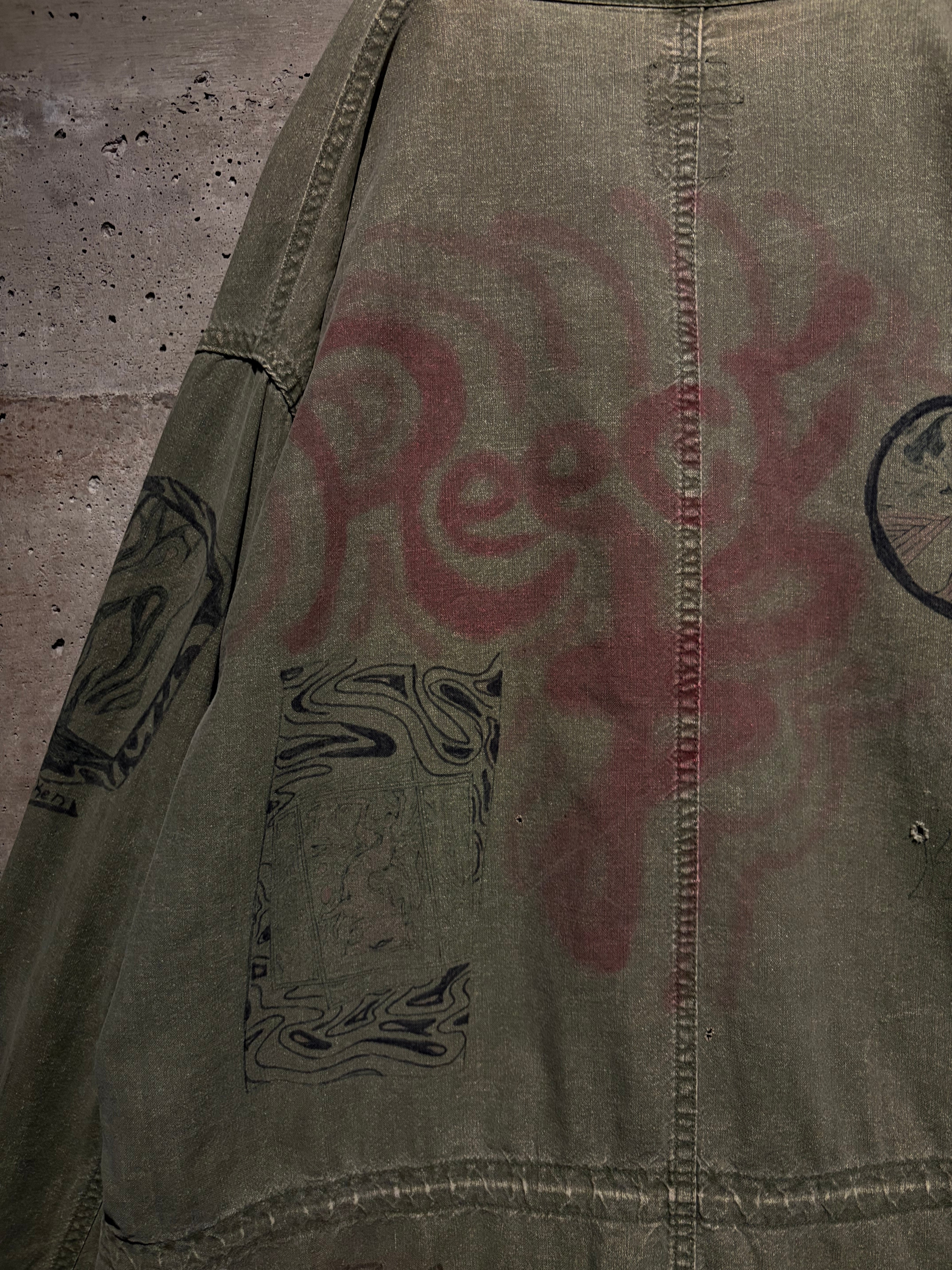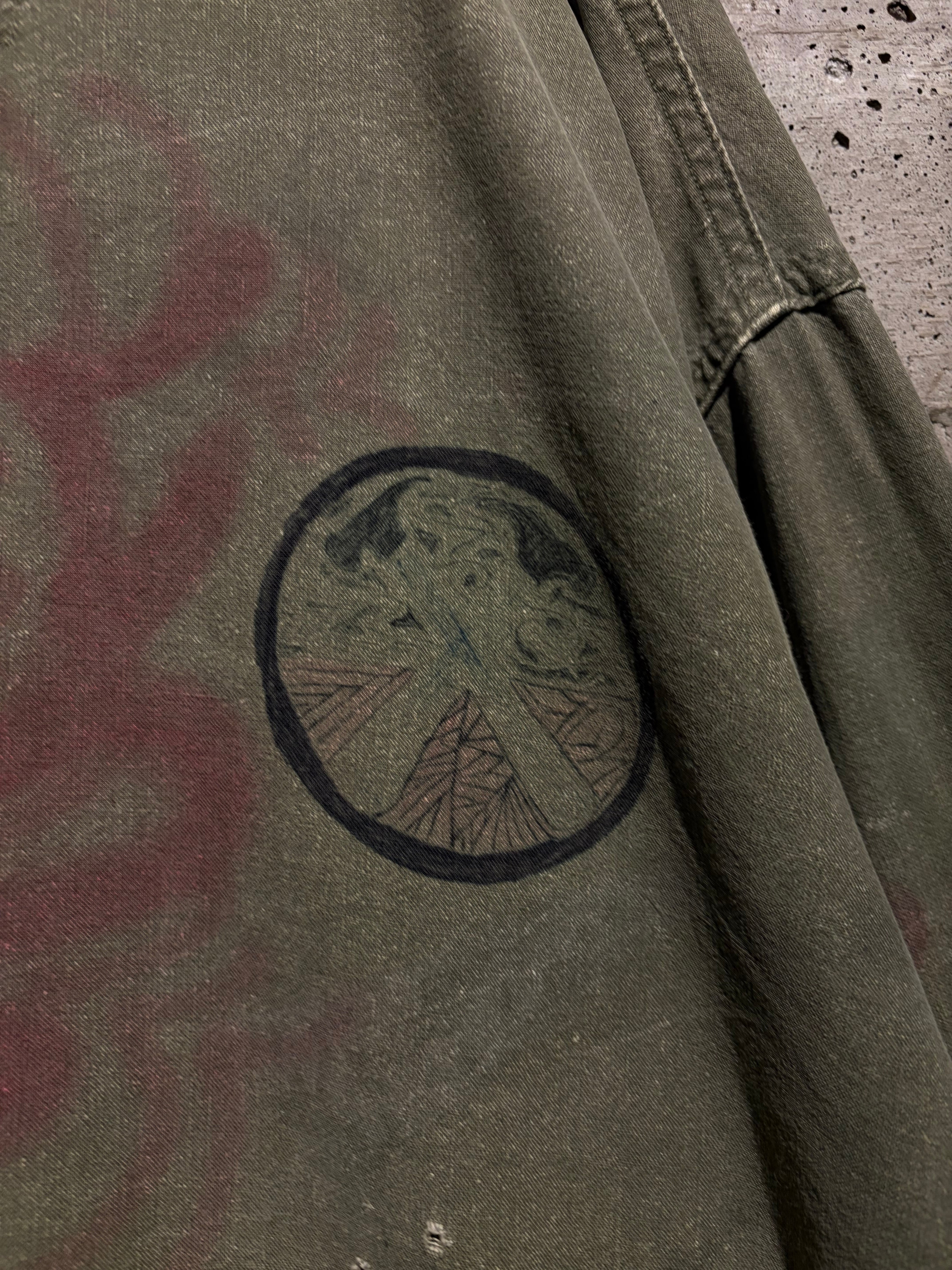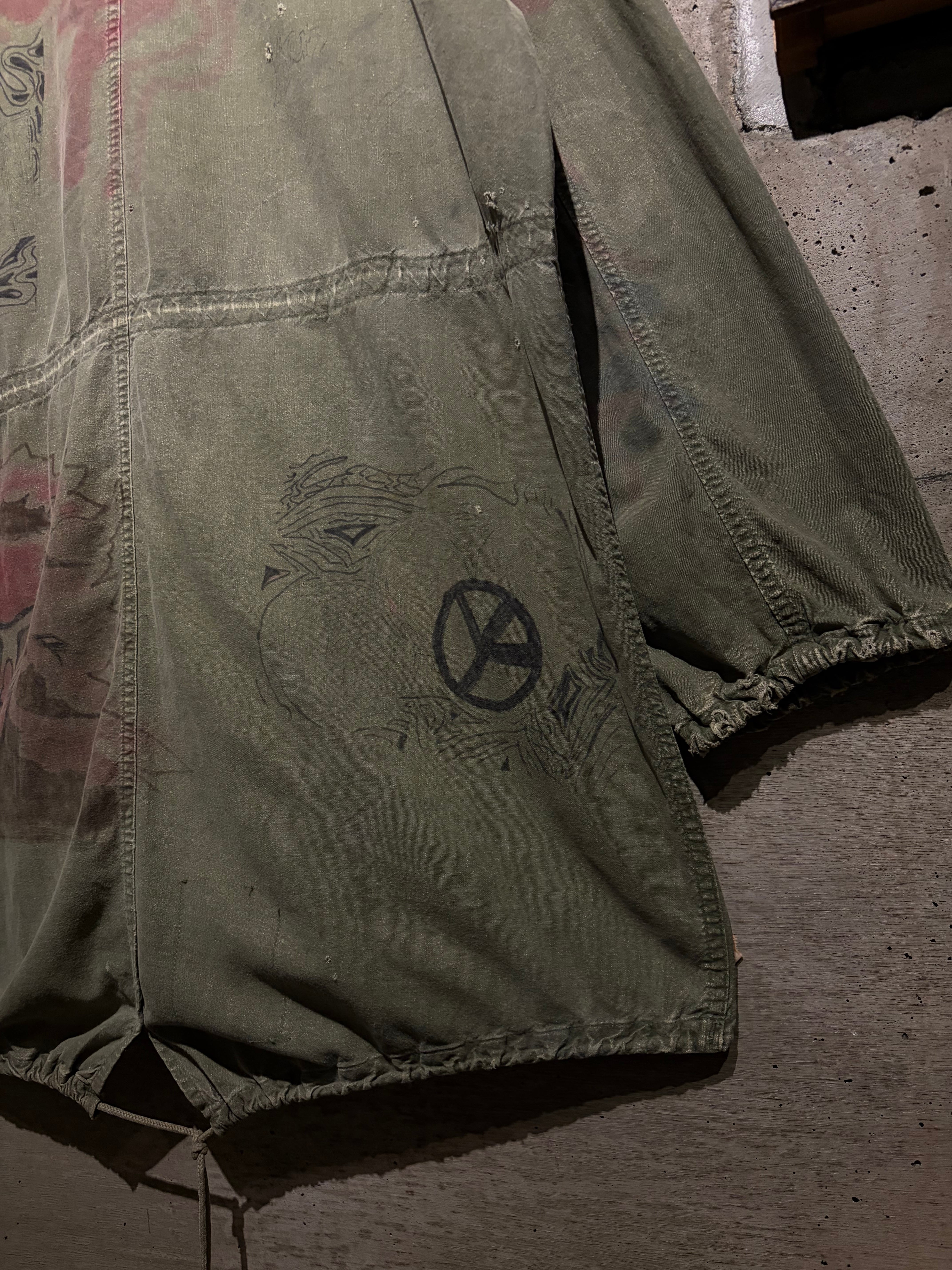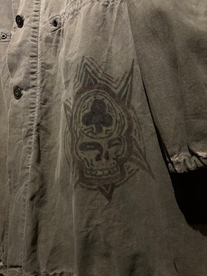 フロントにはスカルモチーフや独特な雰囲気を放つグラフィック、袖や裾、背面にも大胆なドローイングが施され、ミリタリーウェアの無骨な表情に思想全開な。