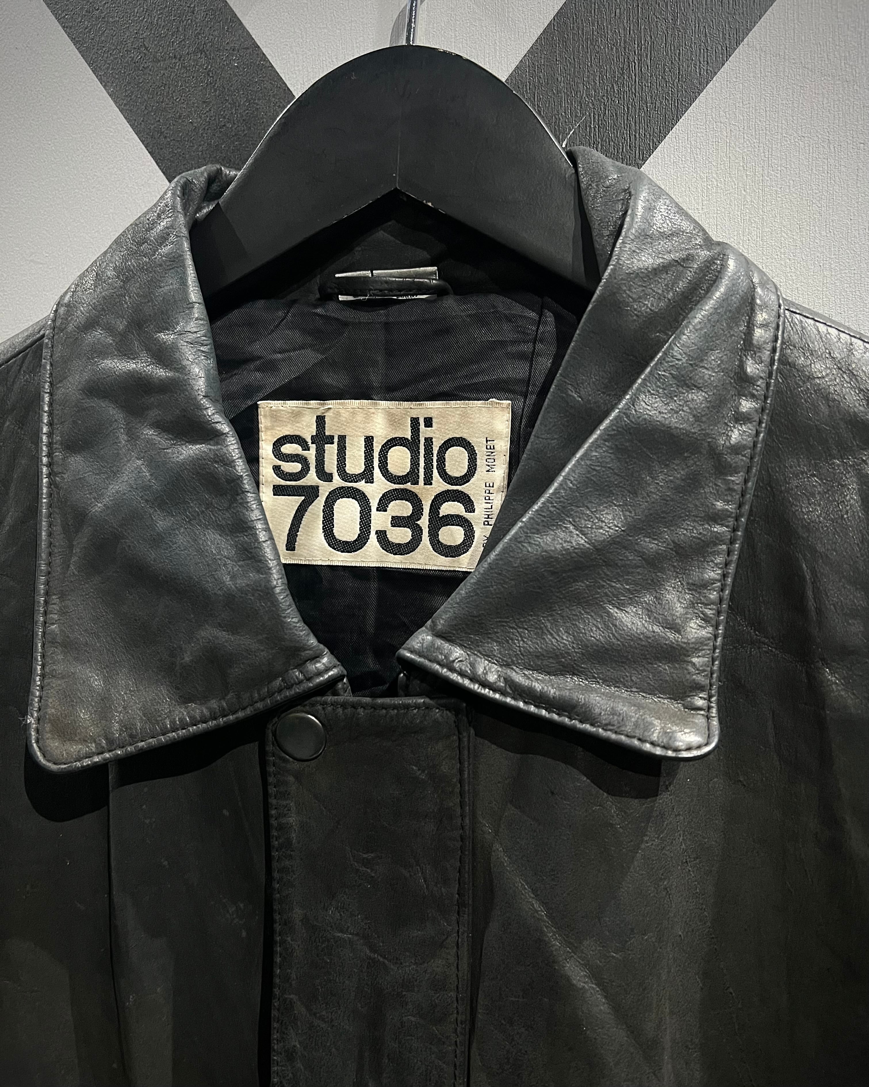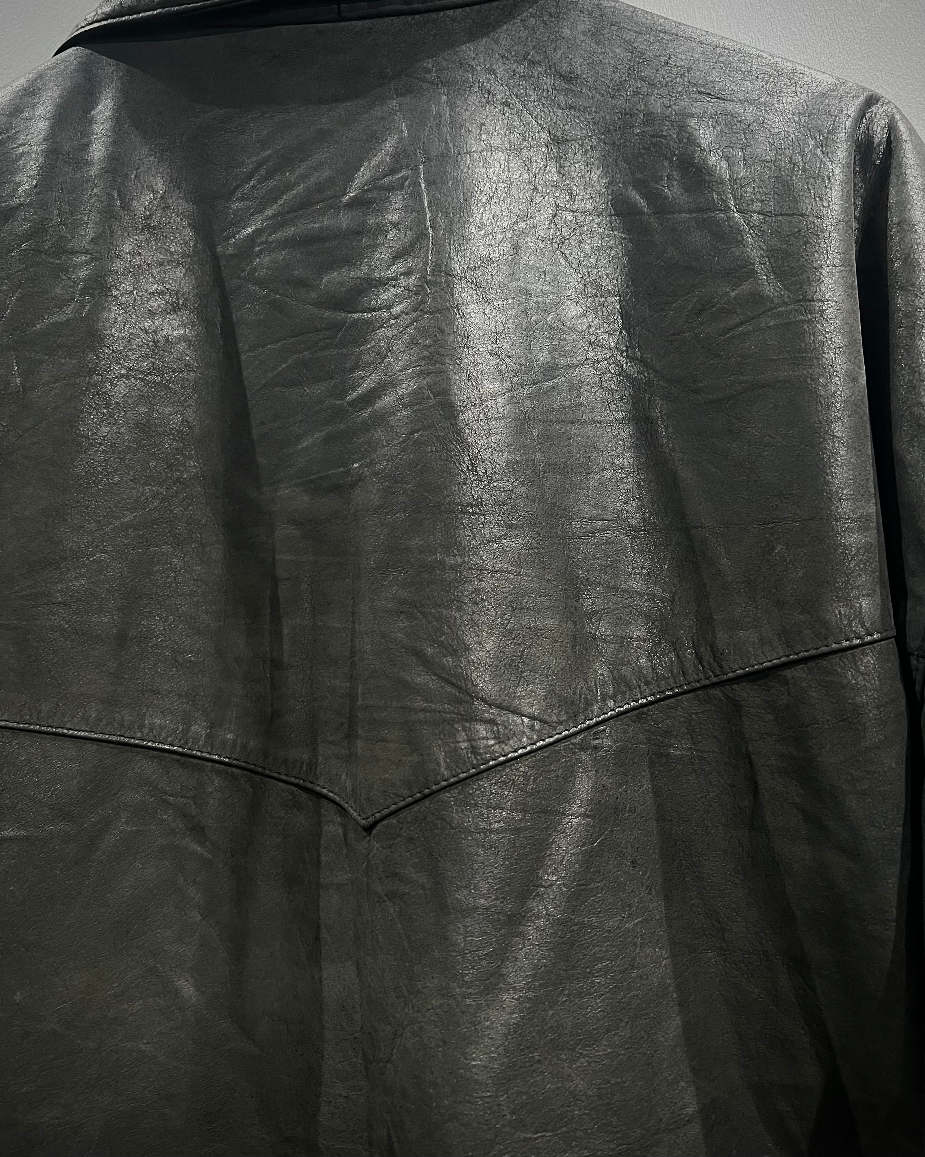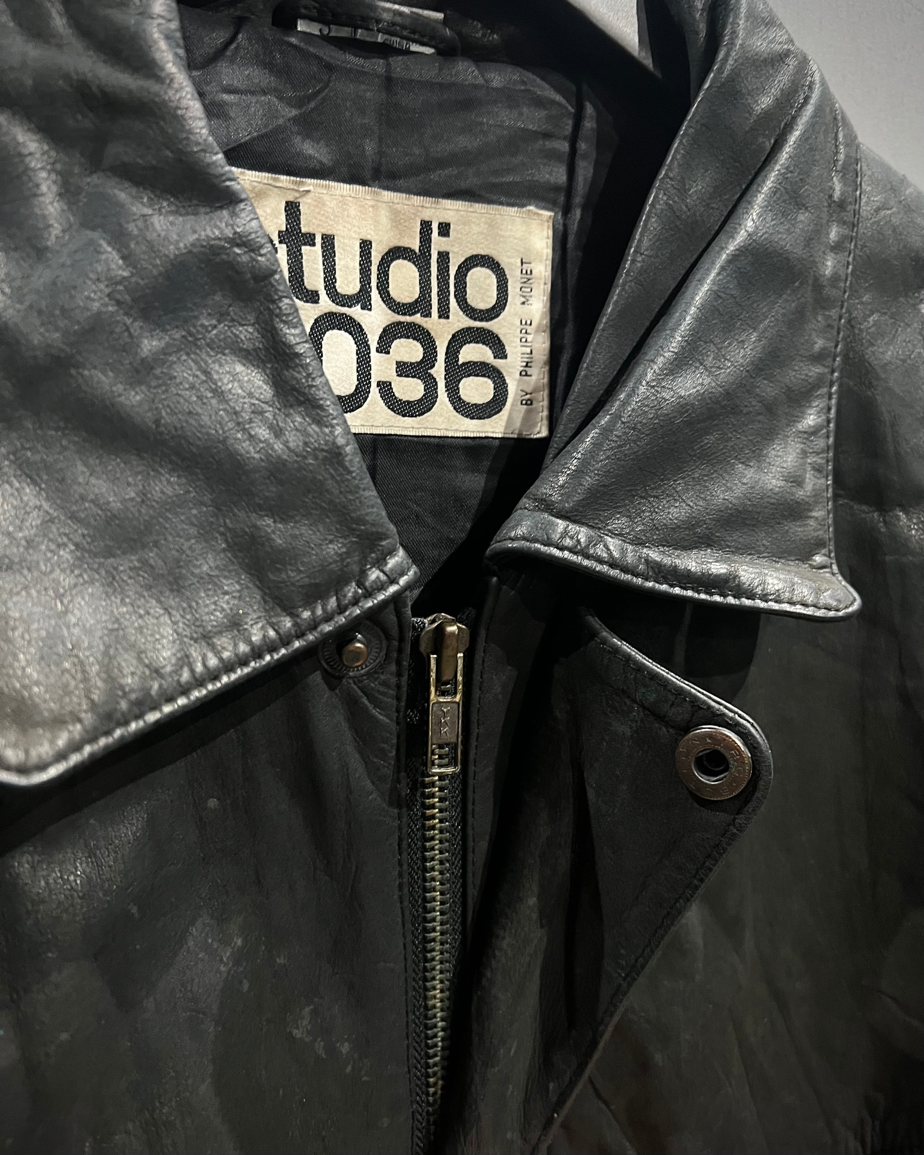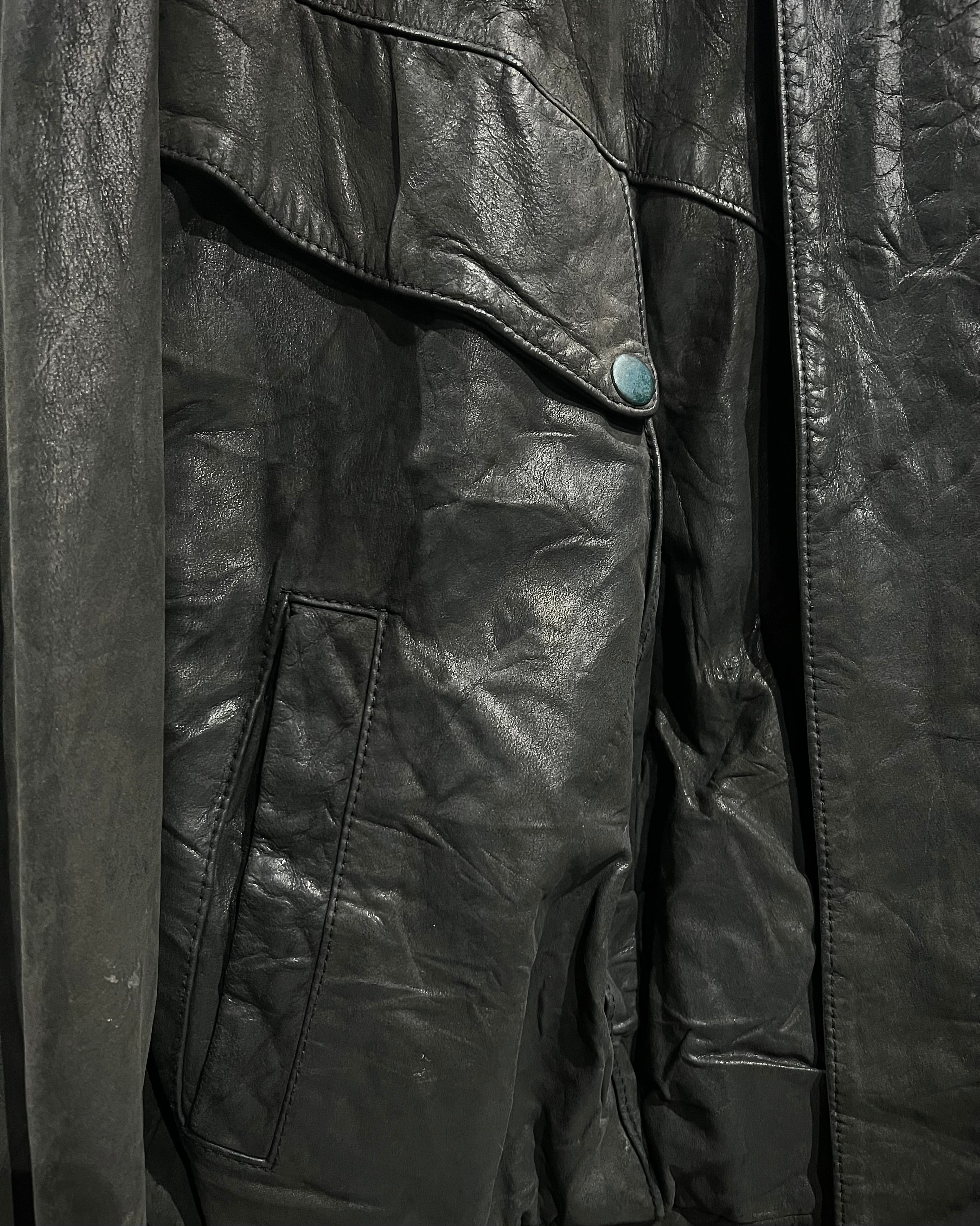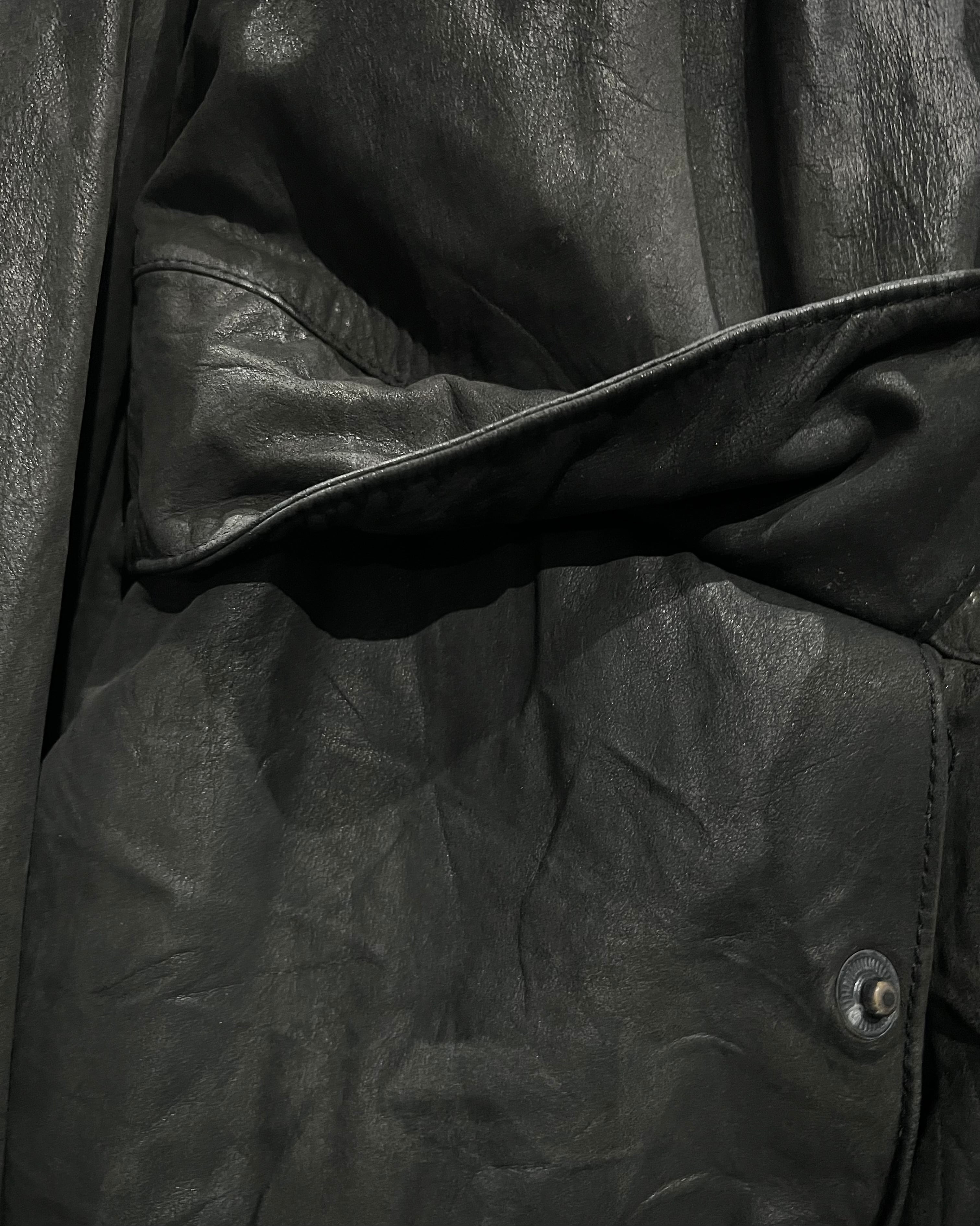 フロントはジップとスナップボタンのダブル仕様。フライトジャケットをモチーフにしたデザインで、胸元にはフラップの装飾を加えたユニークな構成。斜めに走る切り替えパネルやポケット配置が、シンプルなブラックレザーの中に立体的な表情を生み出しています。
