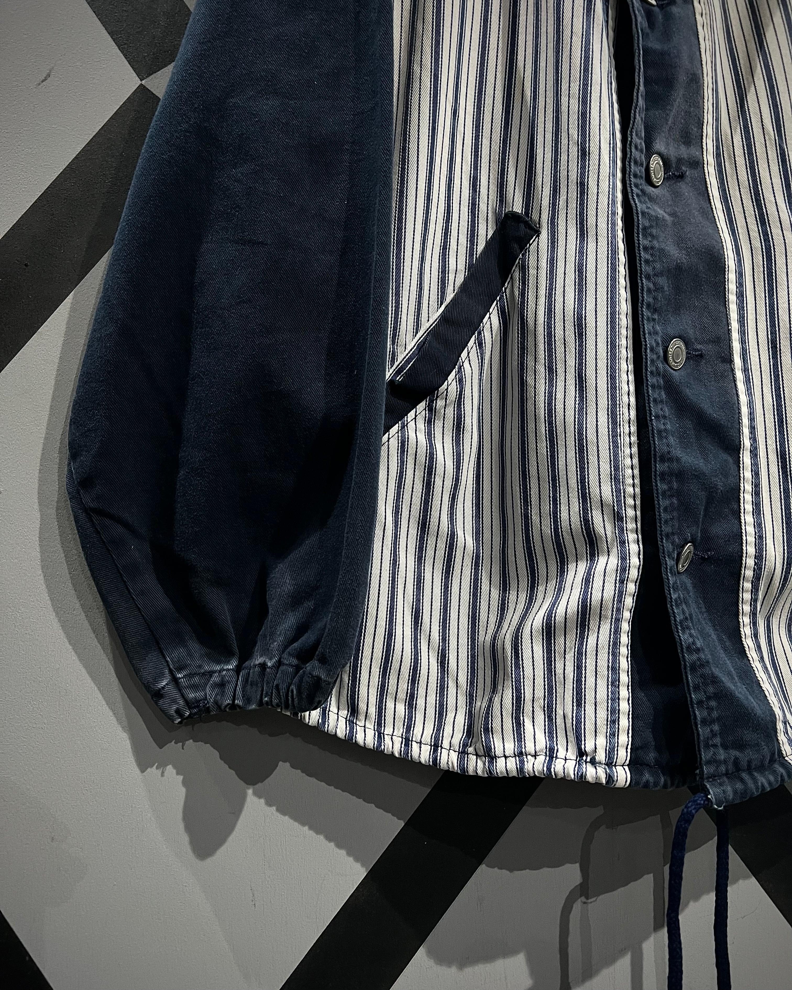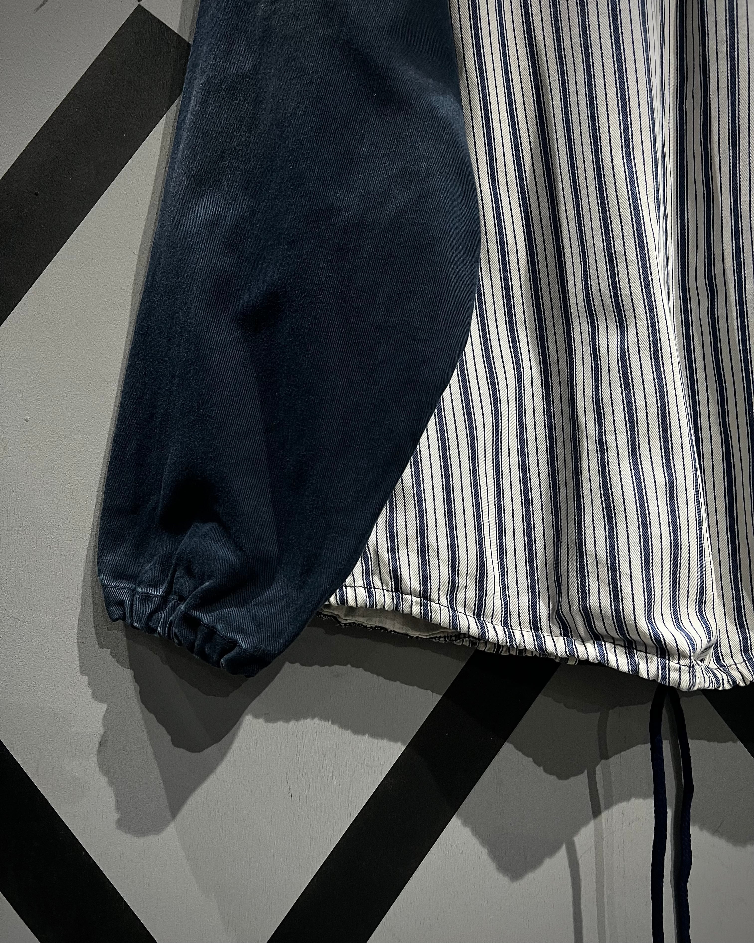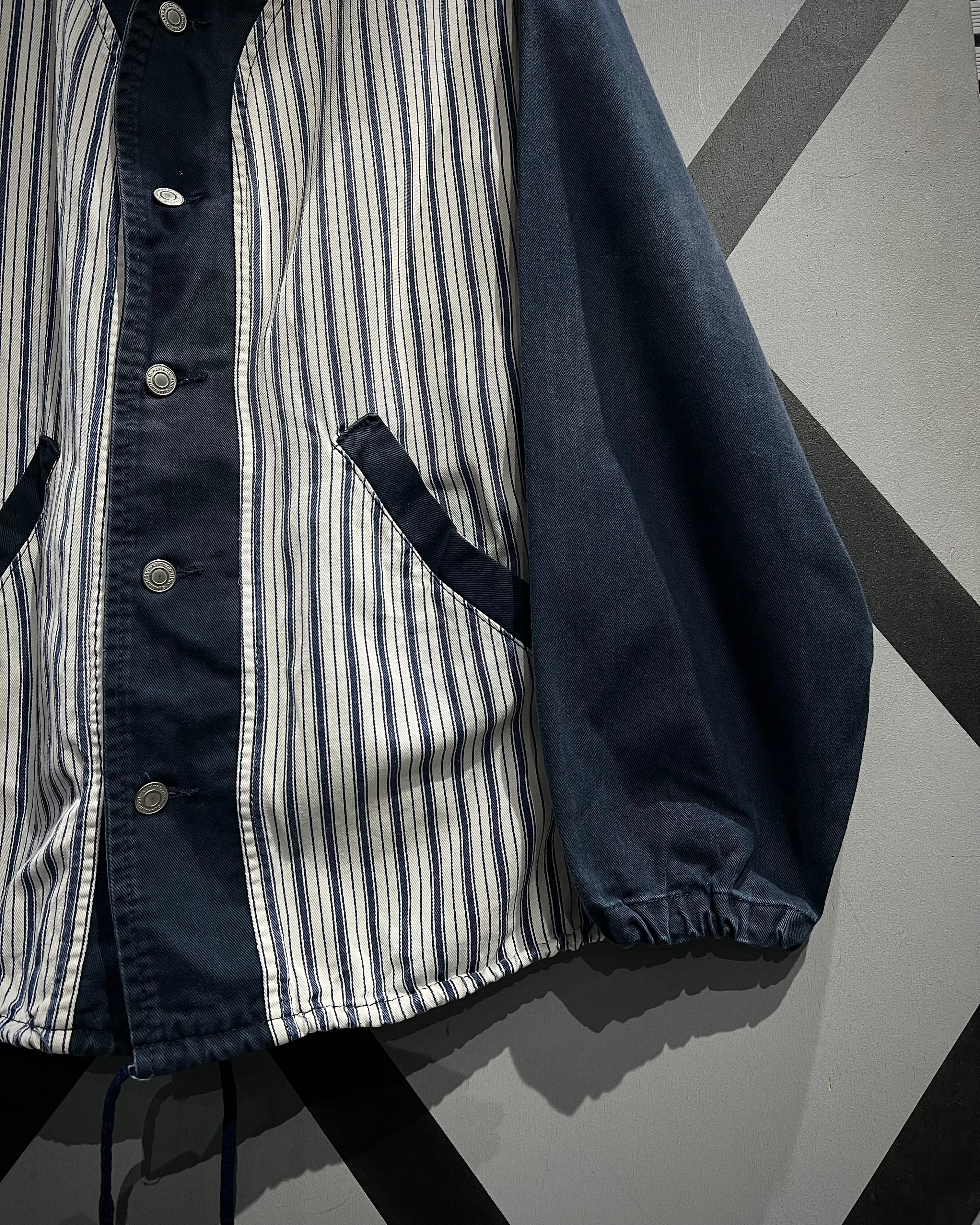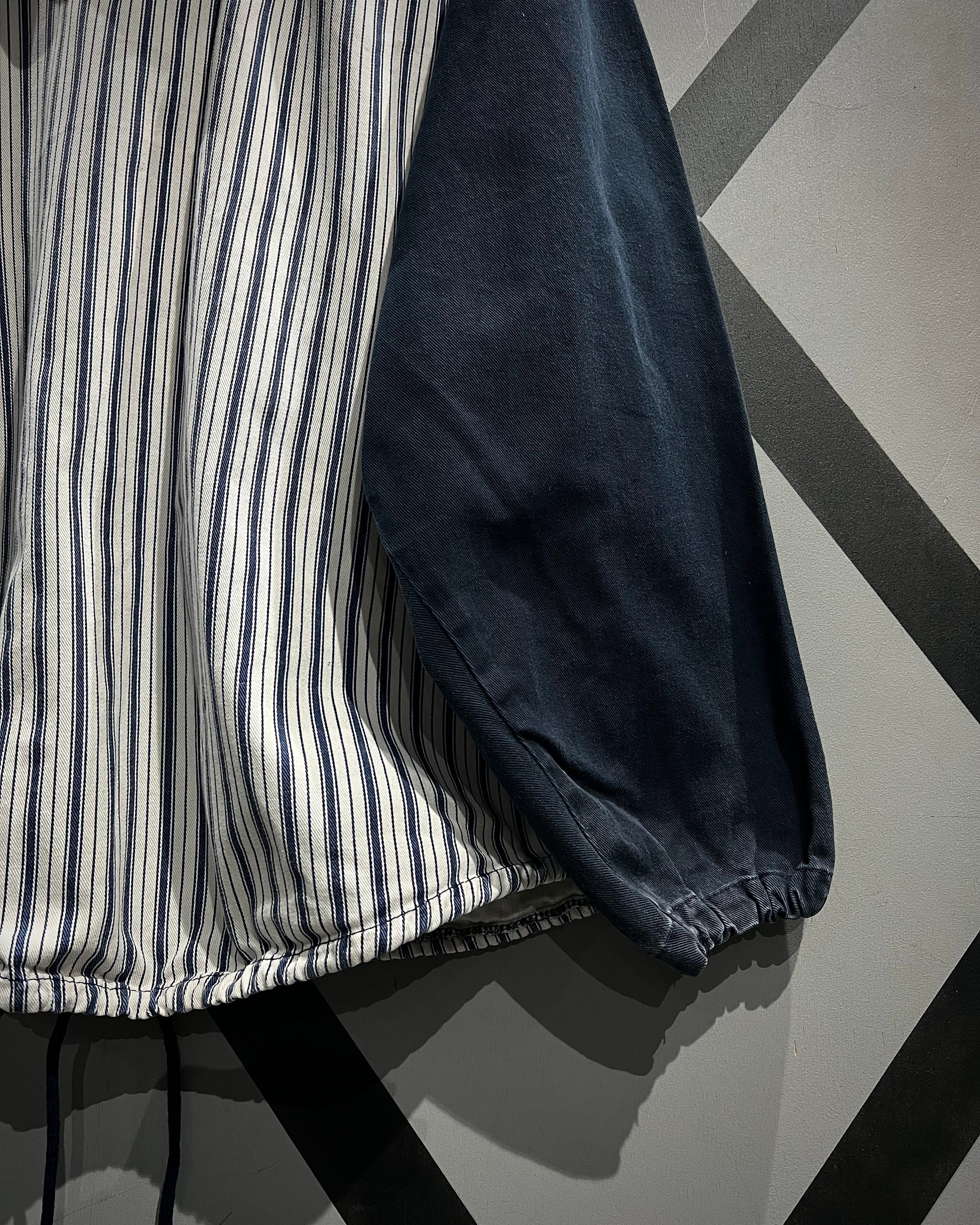 ボディには、タフな質感とラフな雰囲気を兼ね備えたコットンヘビーツイルを採用。ホワイトベースに走るネイビーのストライプが爽やかな印象を与えつつ、ネイビーの切り替えが全体を引き締め、クラシックなベースボールウェアのムードを漂わせます。