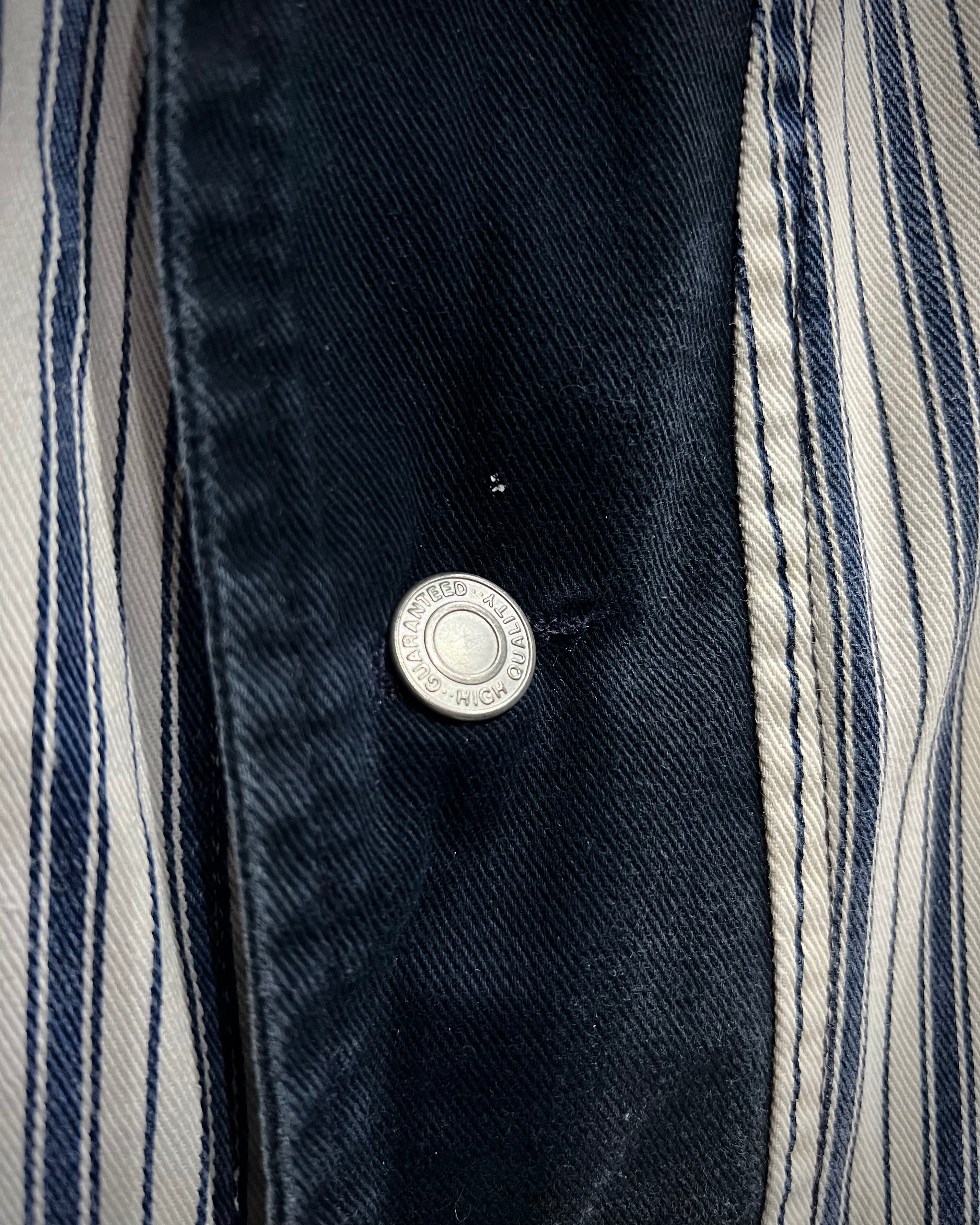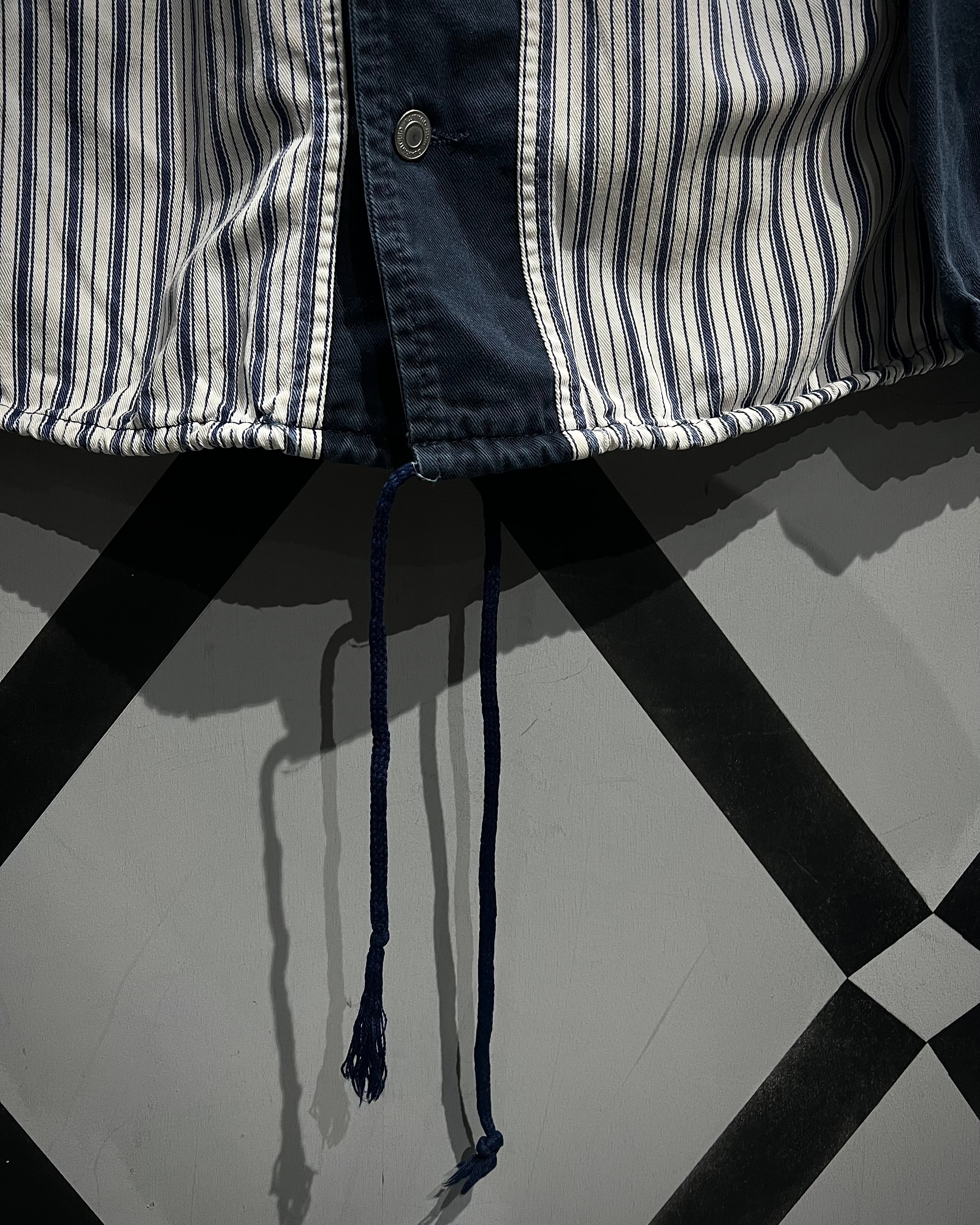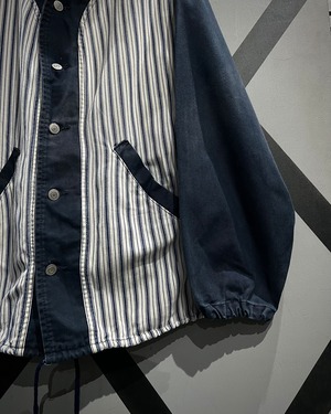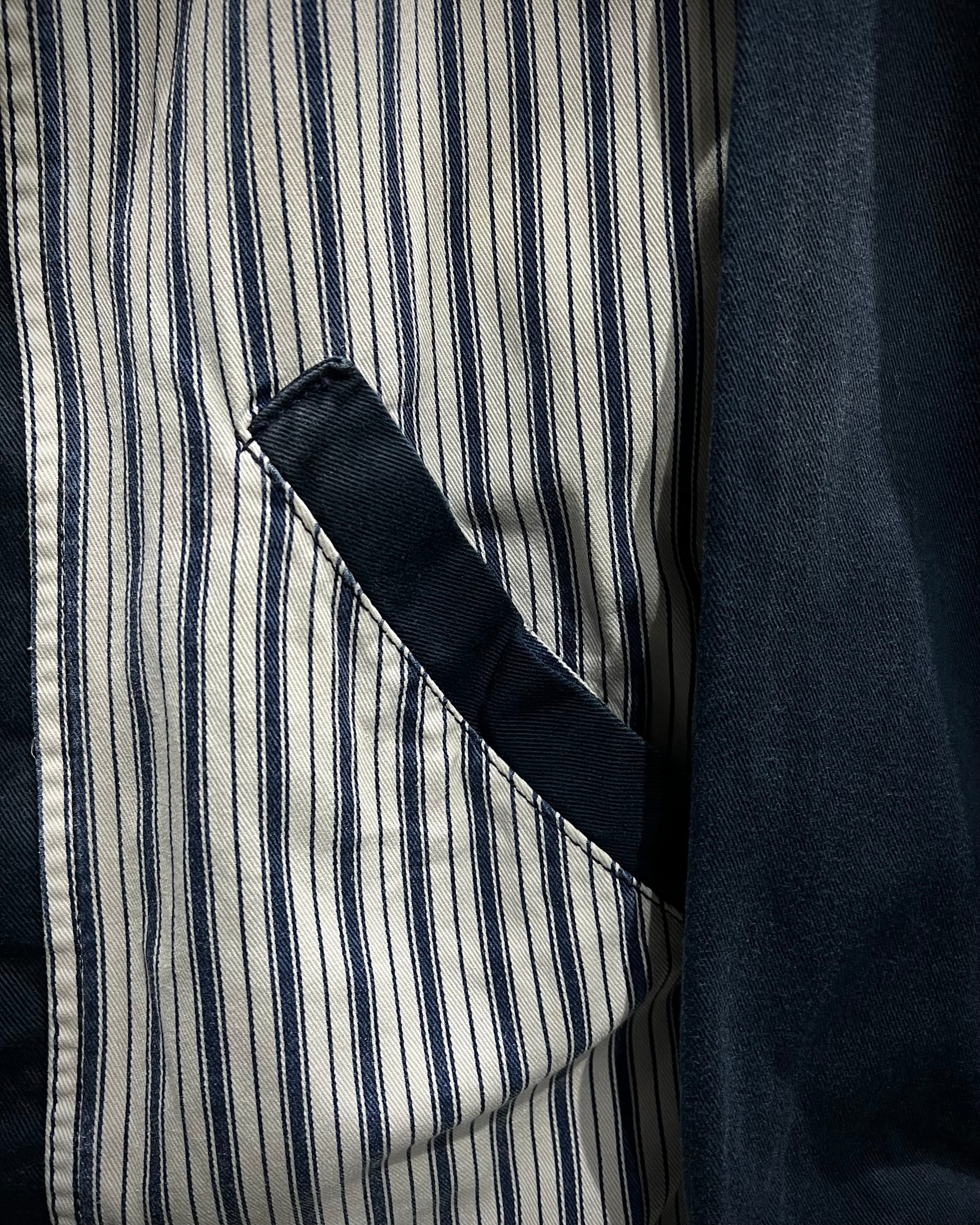 ボディには、タフな質感とラフな雰囲気を兼ね備えたコットンヘビーツイルを採用。ホワイトベースに走るネイビーのストライプが爽やかな印象を与えつつ、ネイビーの切り替えが全体を引き締め、クラシックなベースボールウェアのムードを漂わせます。
