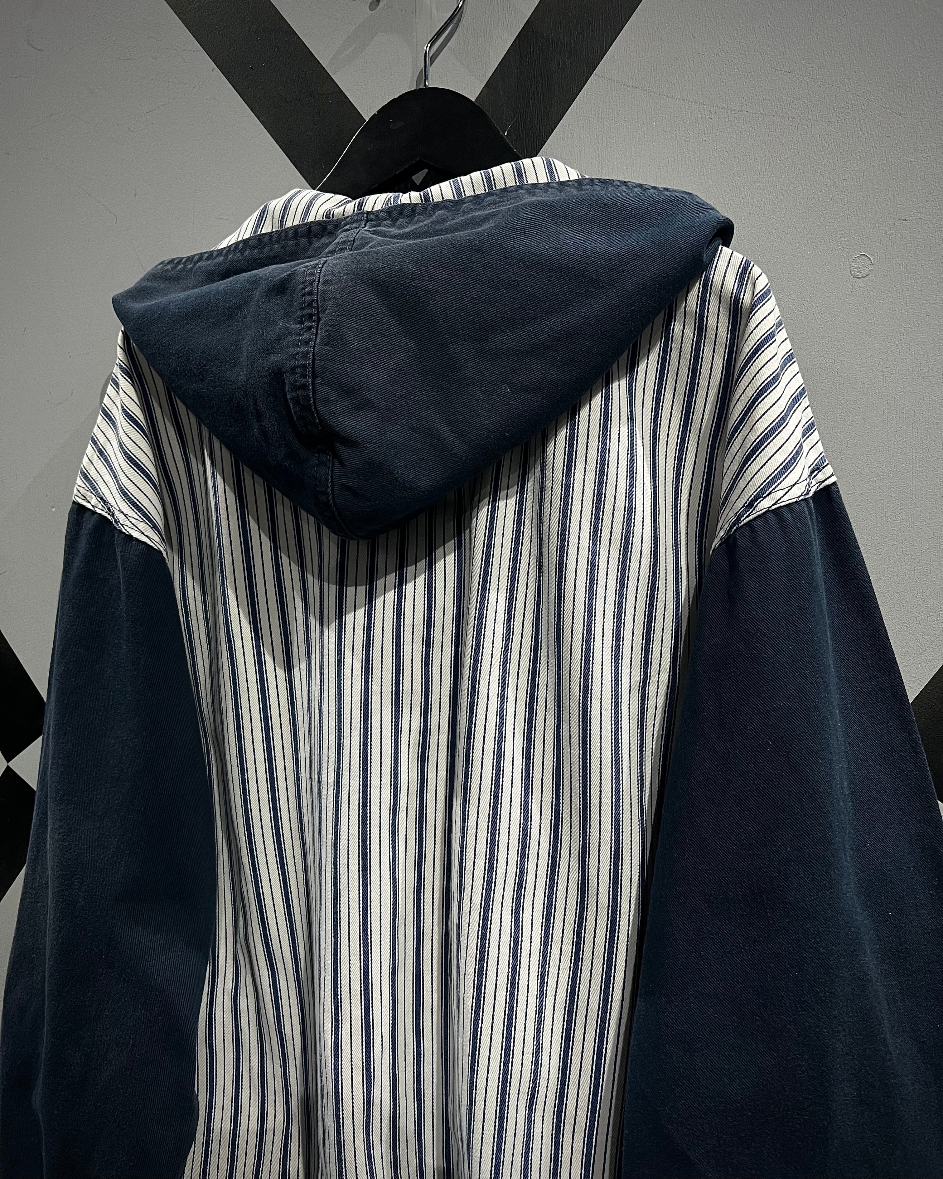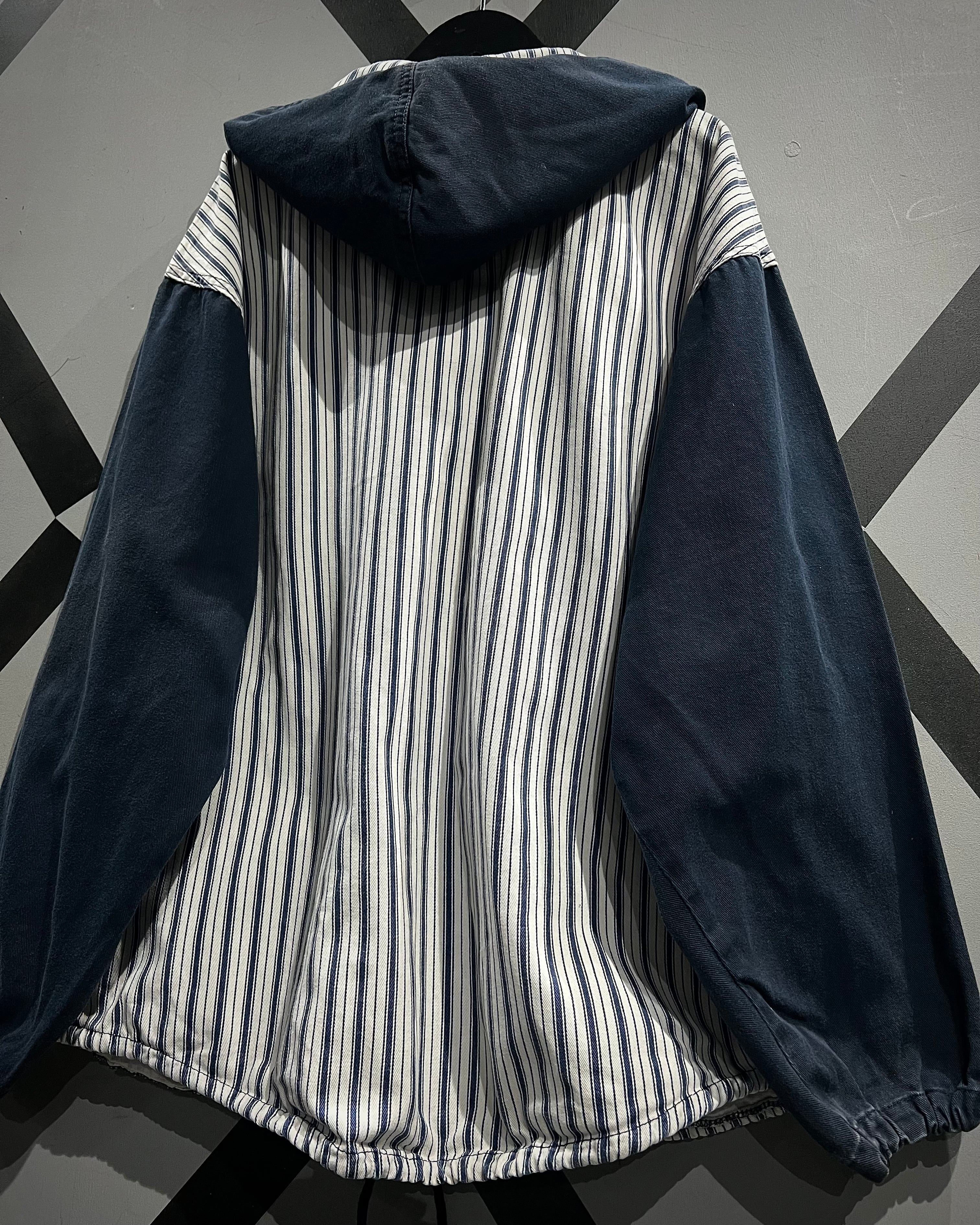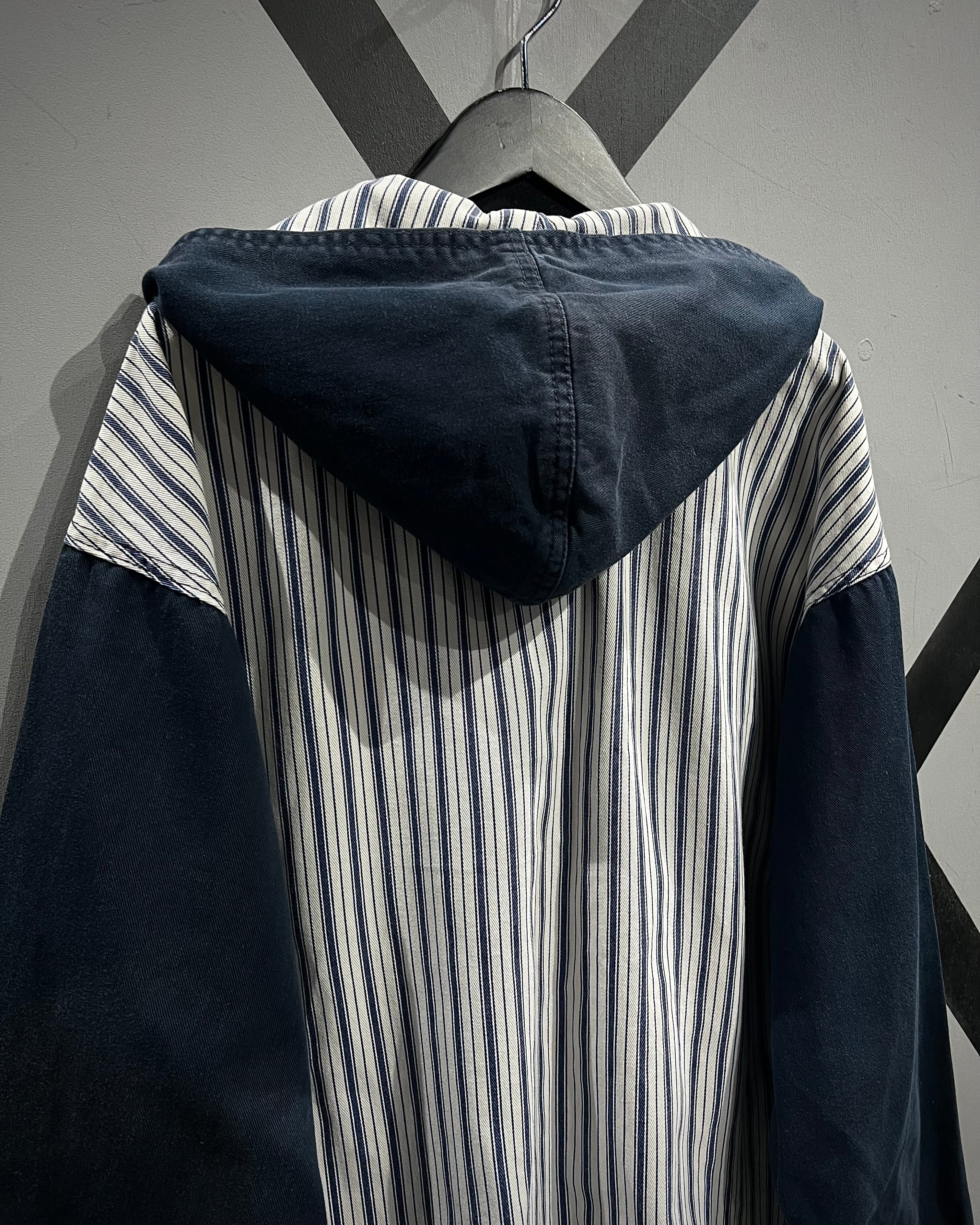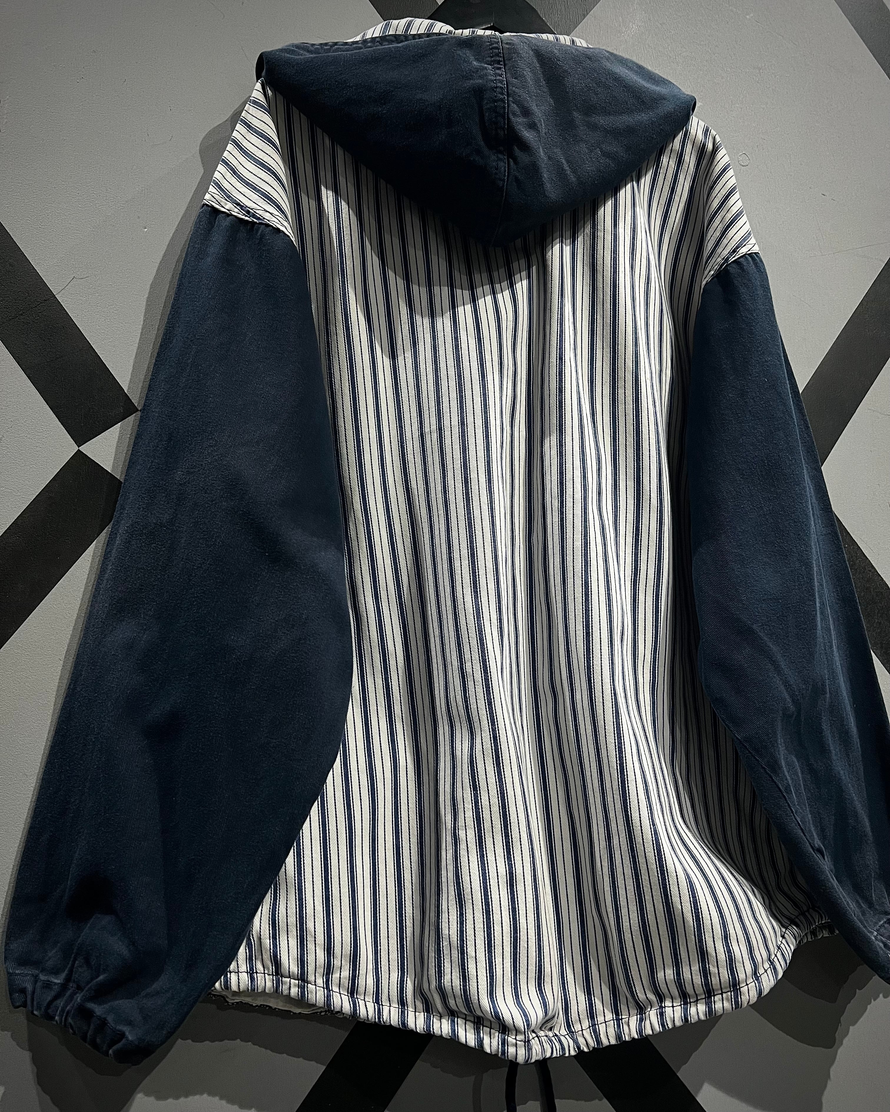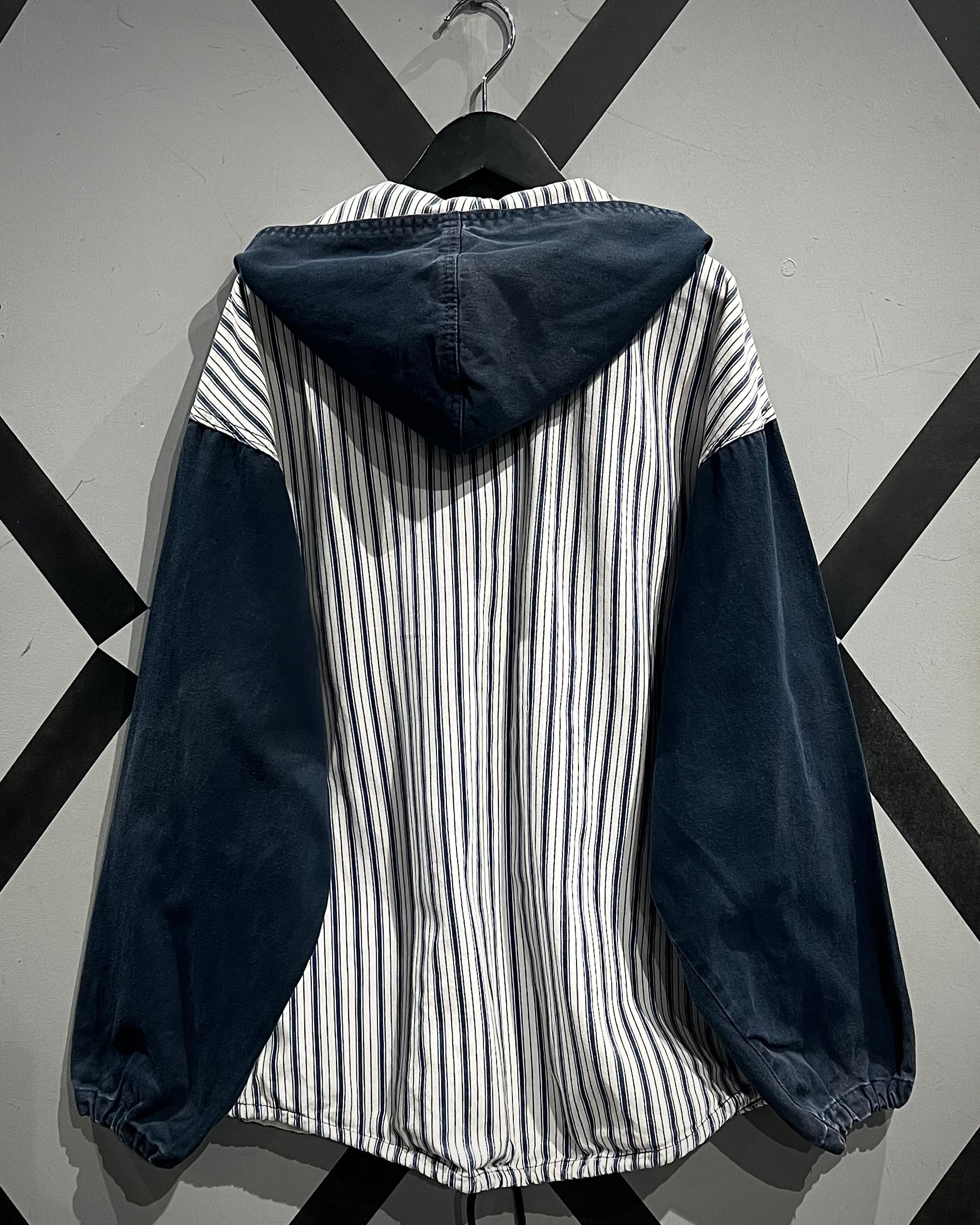 ネックから前立てにかけてのフロントパネルや、斜めに配置されたポケット、配色切り替えなど、スポーツウェア由来のディテールが随所に落とし込まれています。フード付きのデザインも相まって、カジュアルさと機能性を兼ね備えたユニークなバランスに仕上がっています。