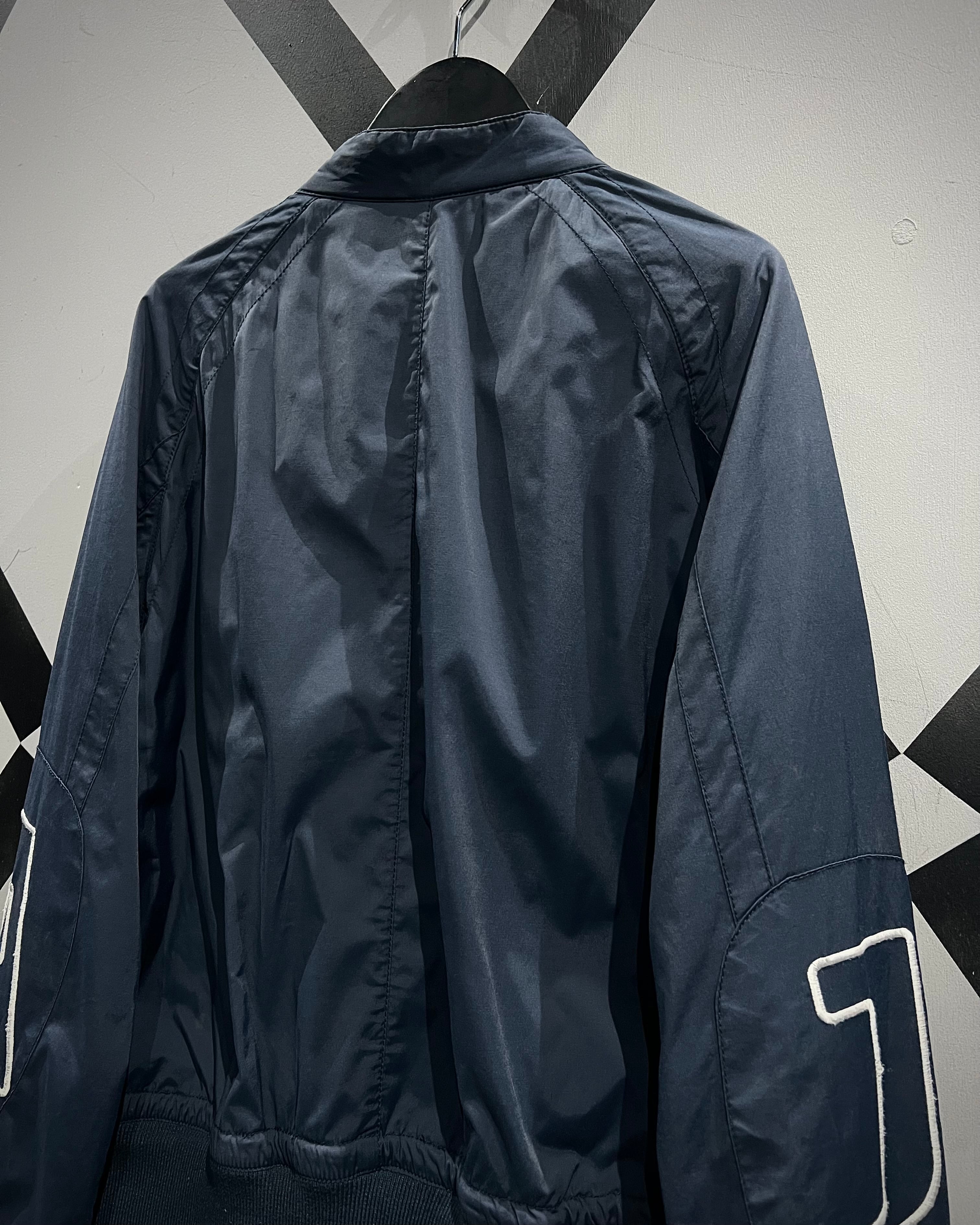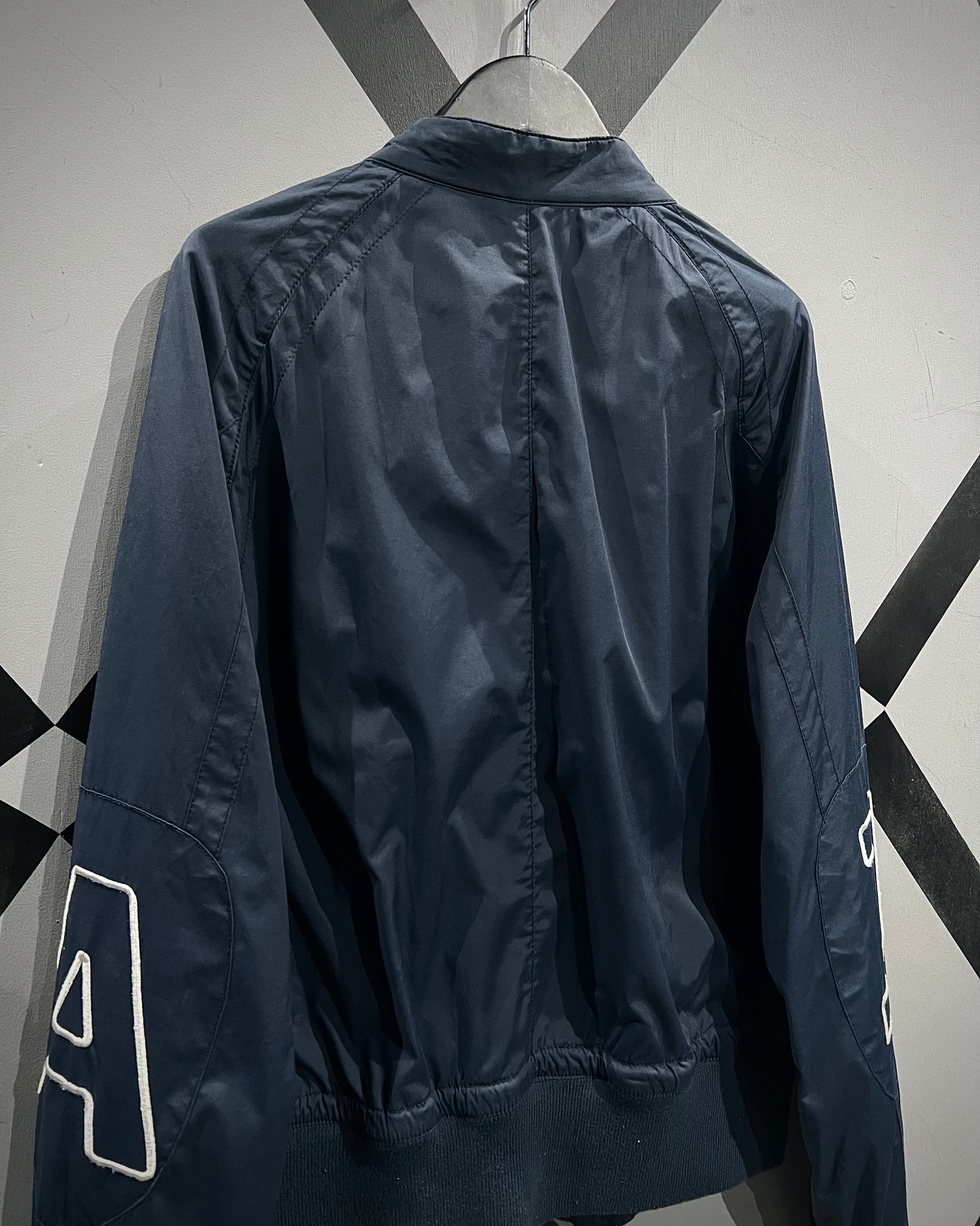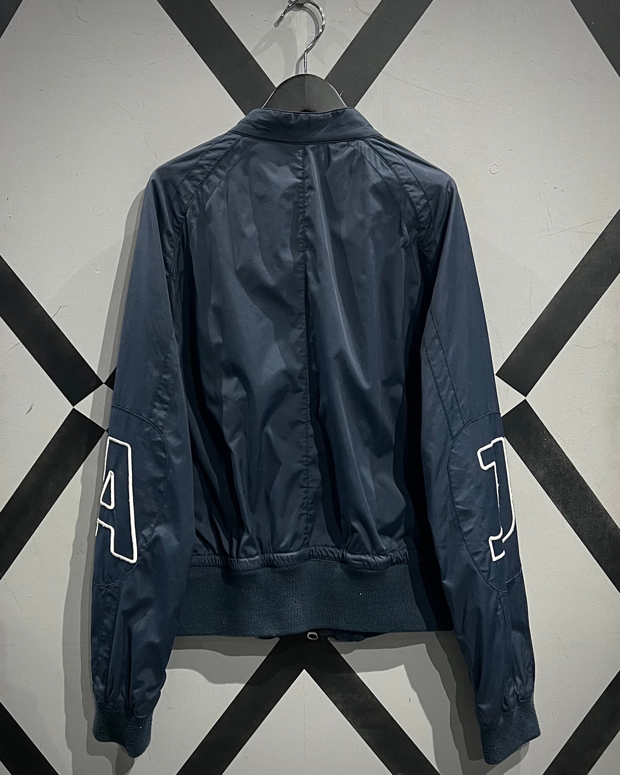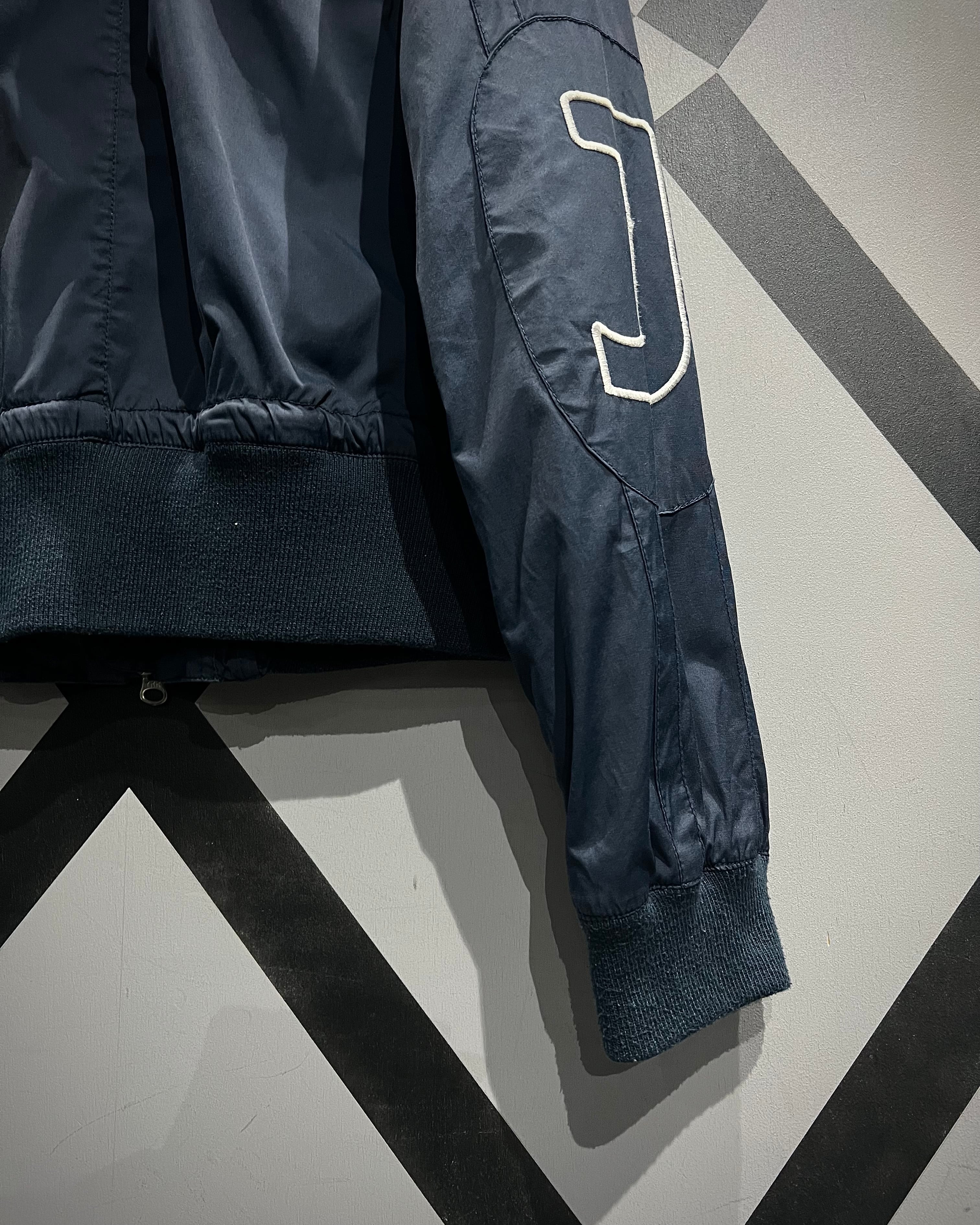ツルッと滑らかなネイビーのボディに、両腕にかけてブランドネームのイニシャルを刺繍で刻んだライダースタイプのジャケット。