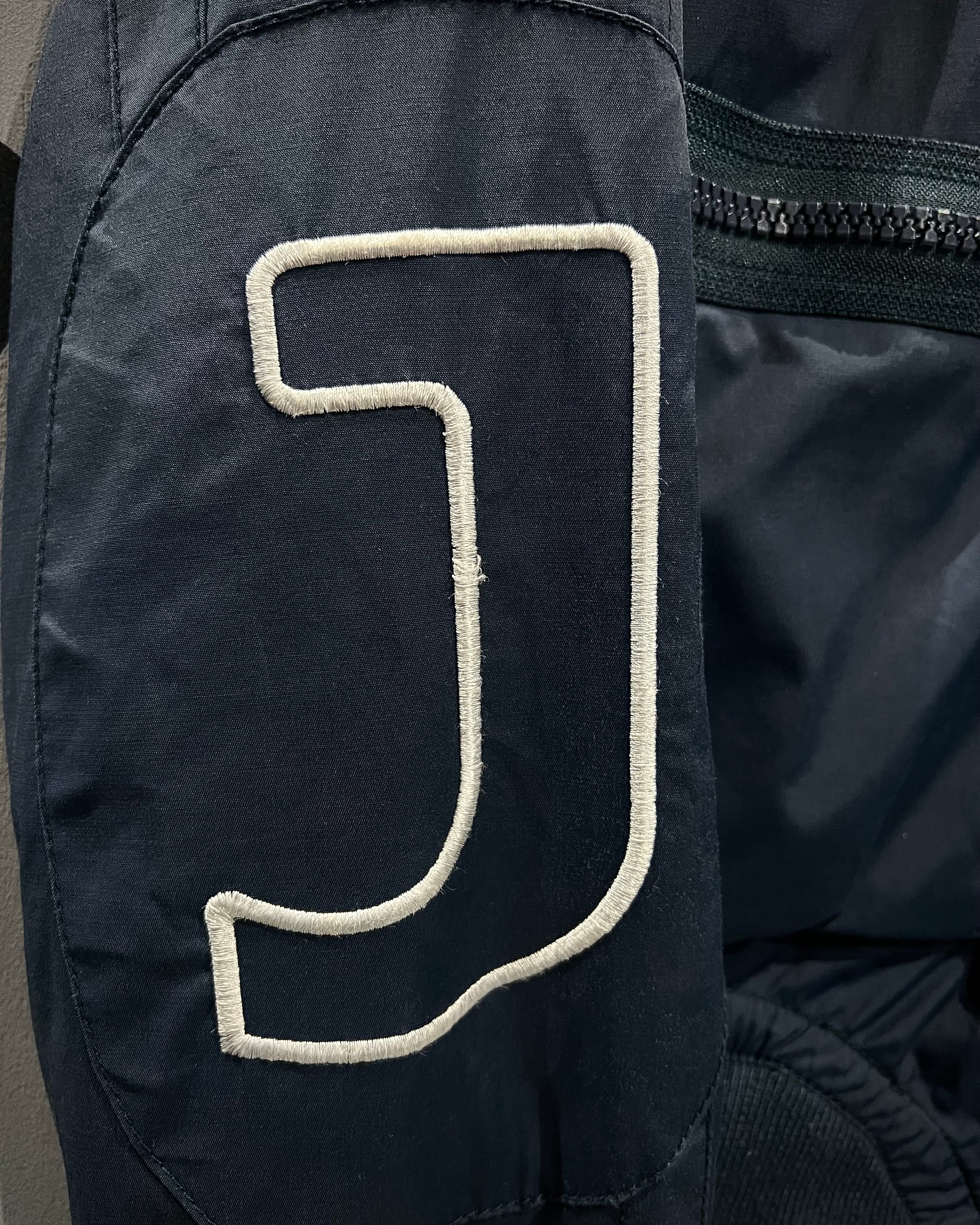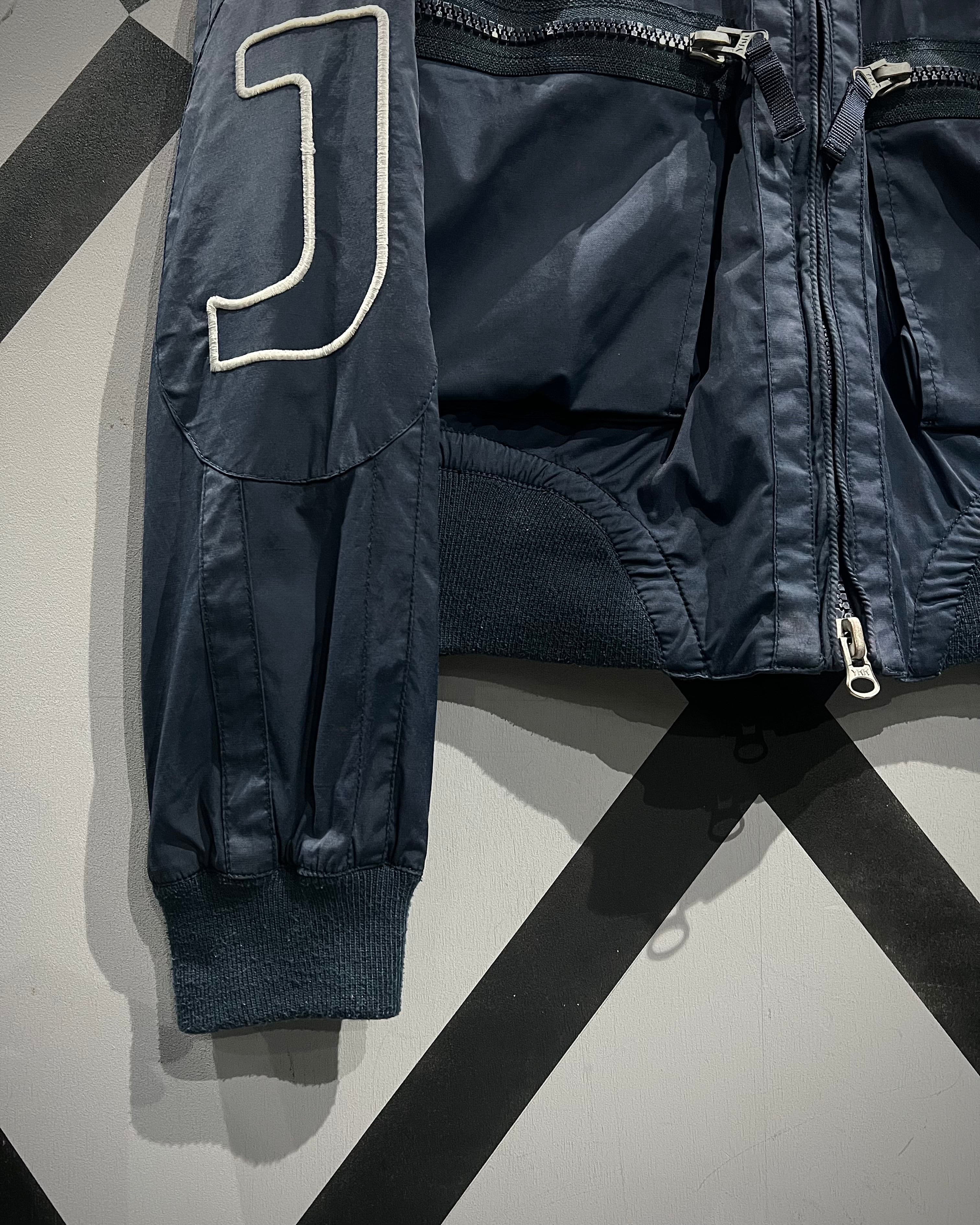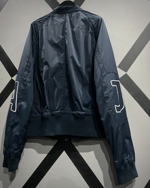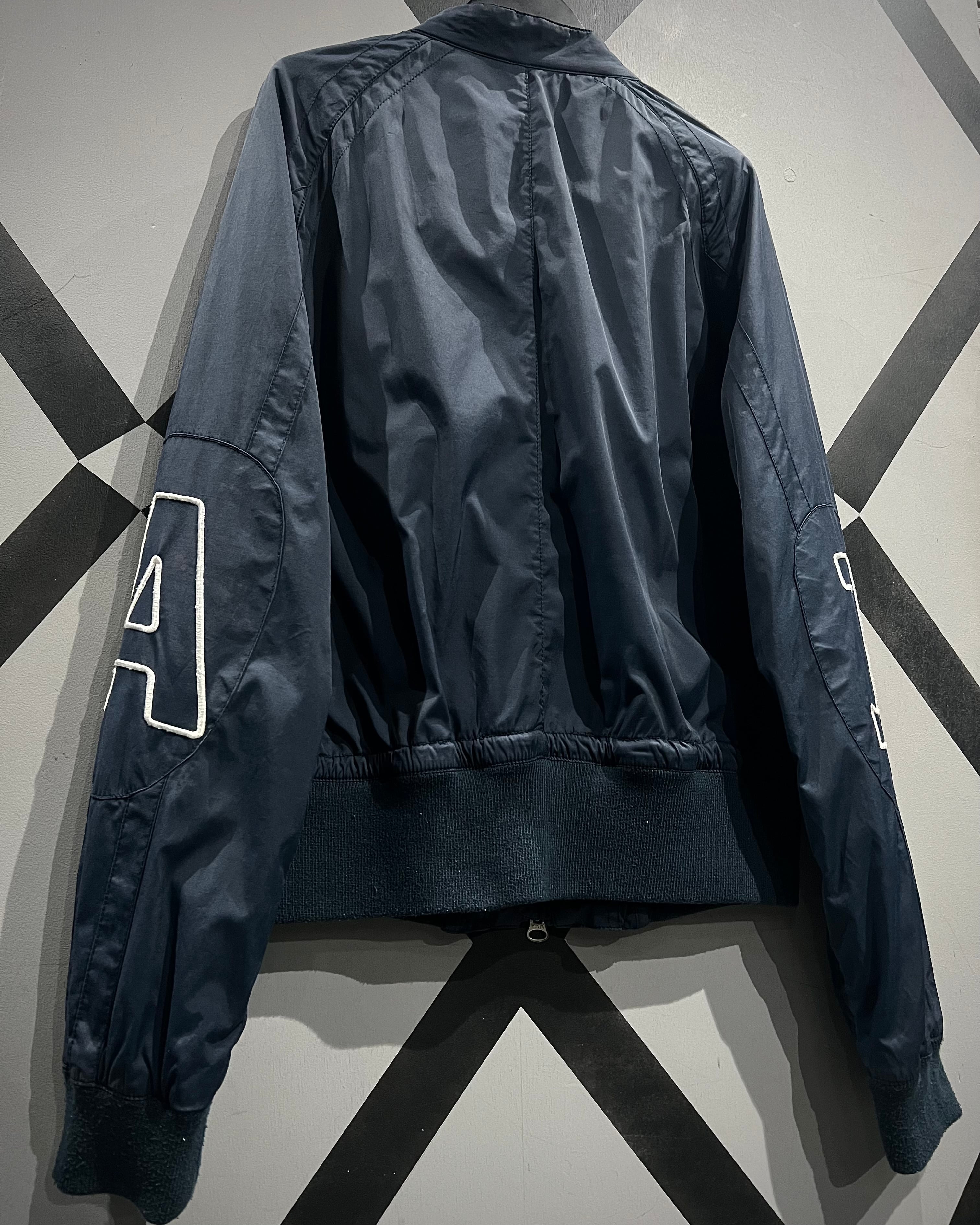 ツルッと滑らかなネイビーのボディに、両腕にかけてブランドネームのイニシャルを刺繍で刻んだライダースタイプのジャケット。
