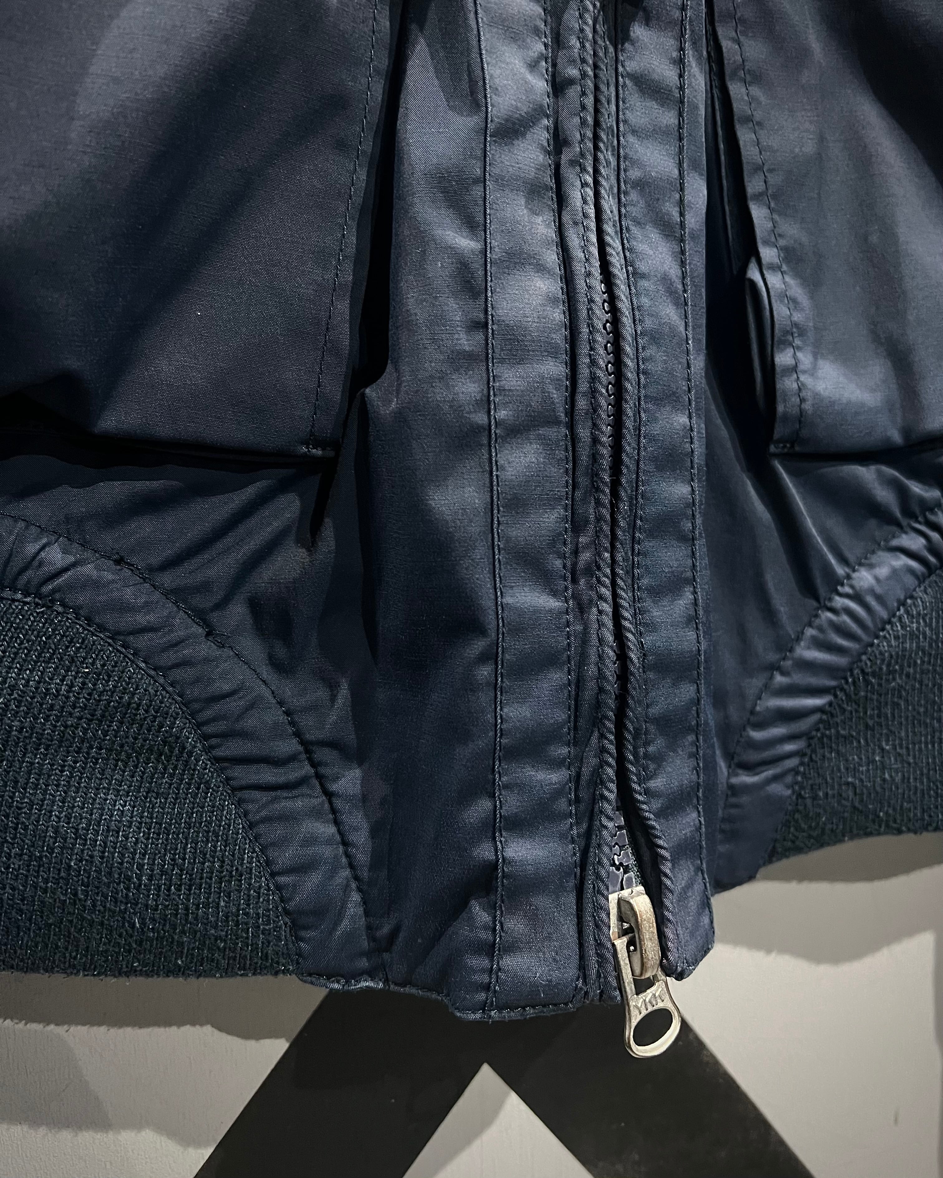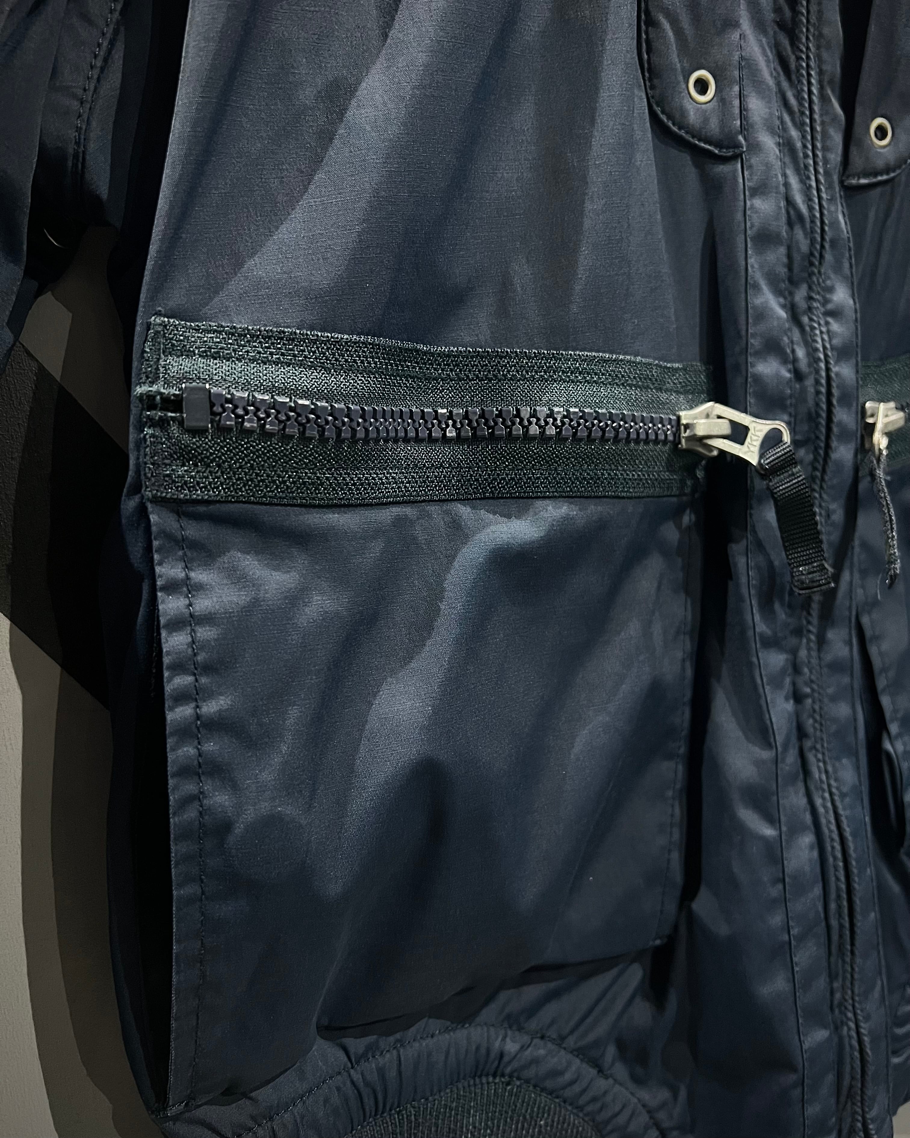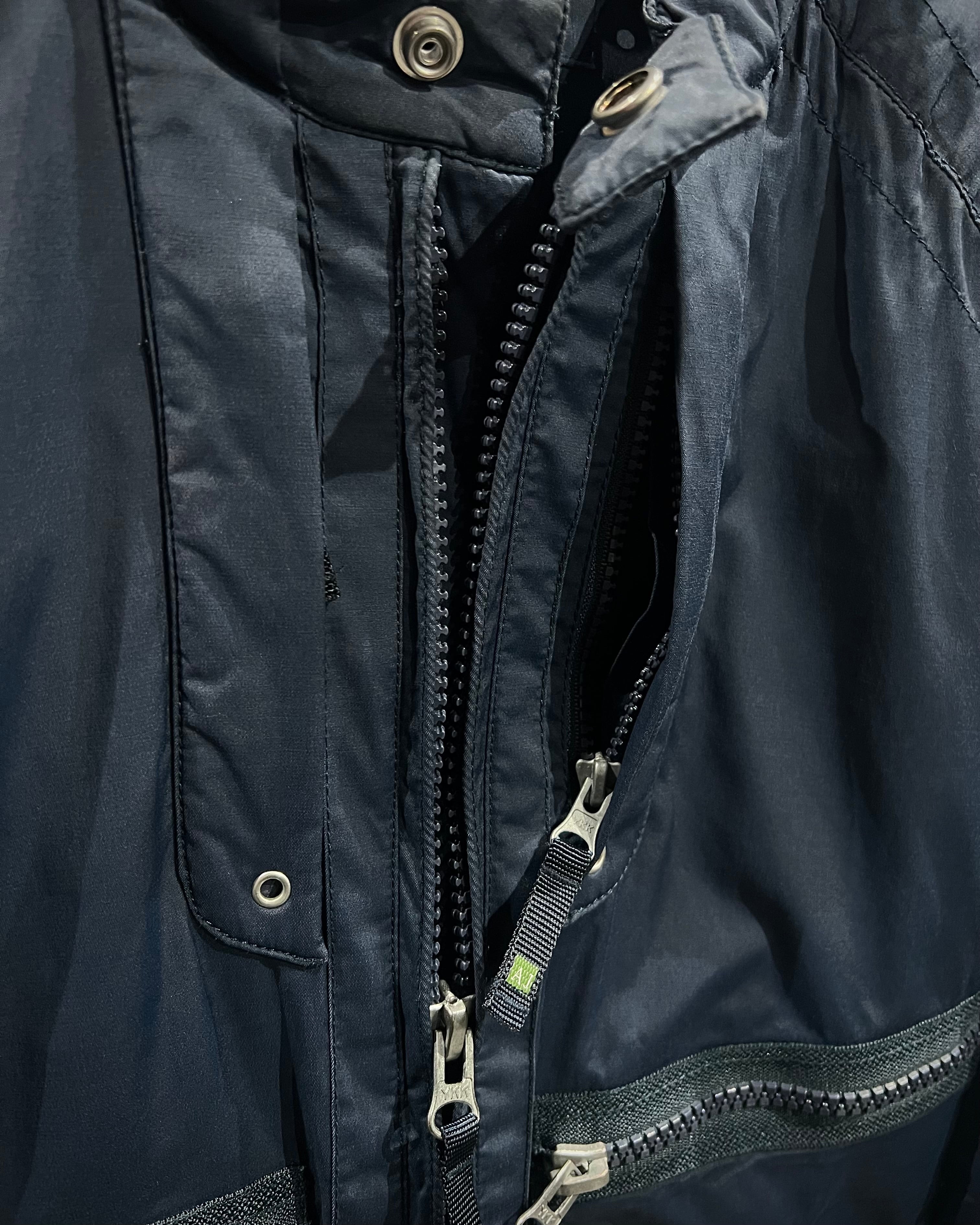 フロントには容量大きめのスリットポケットと合わさったジップポケット、首元にもジップポケット、脇下にはベンチレーション、フロントはダブルジップのギミックと機能的なディテール使い。