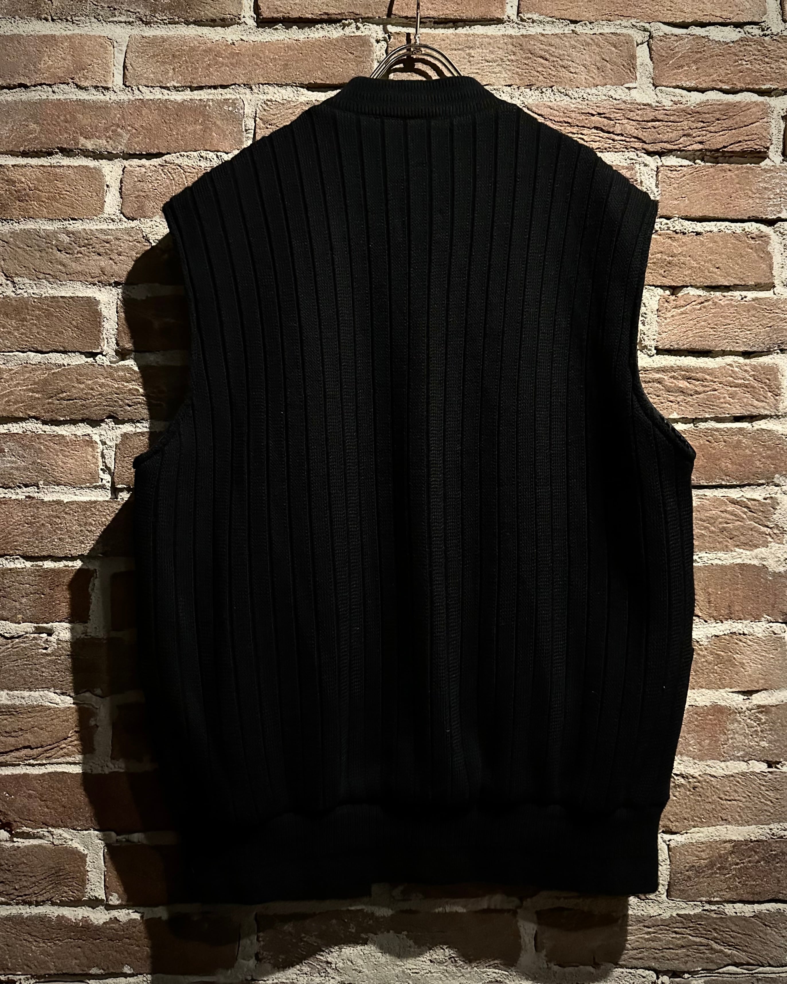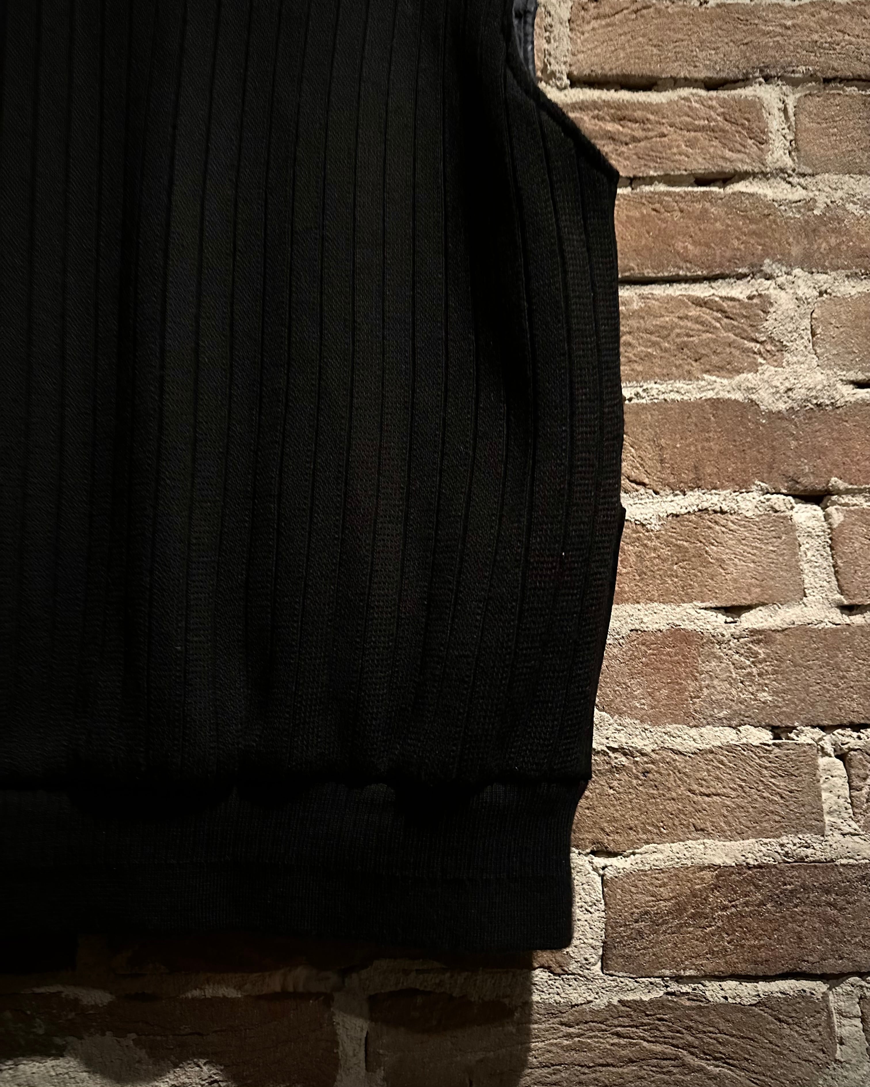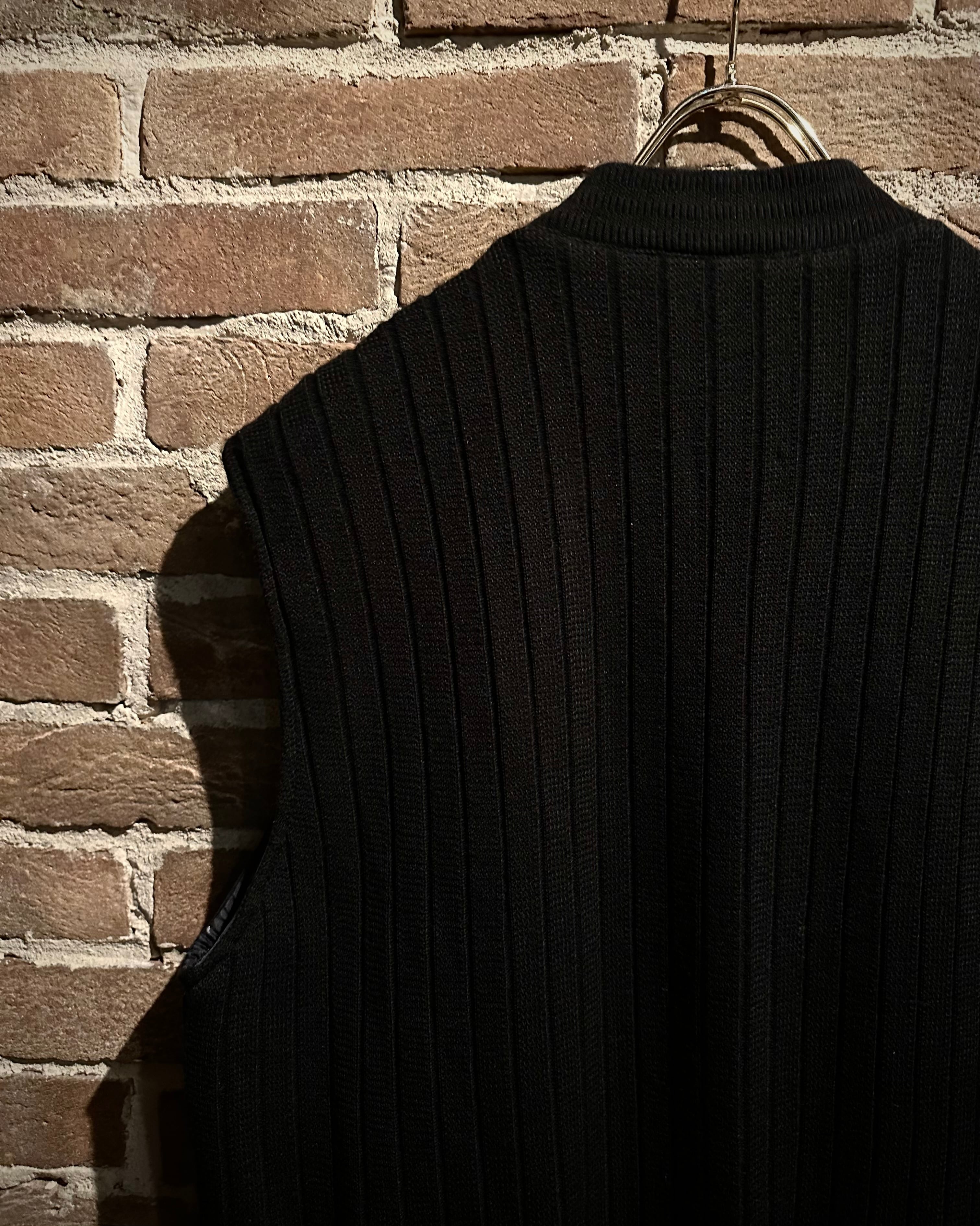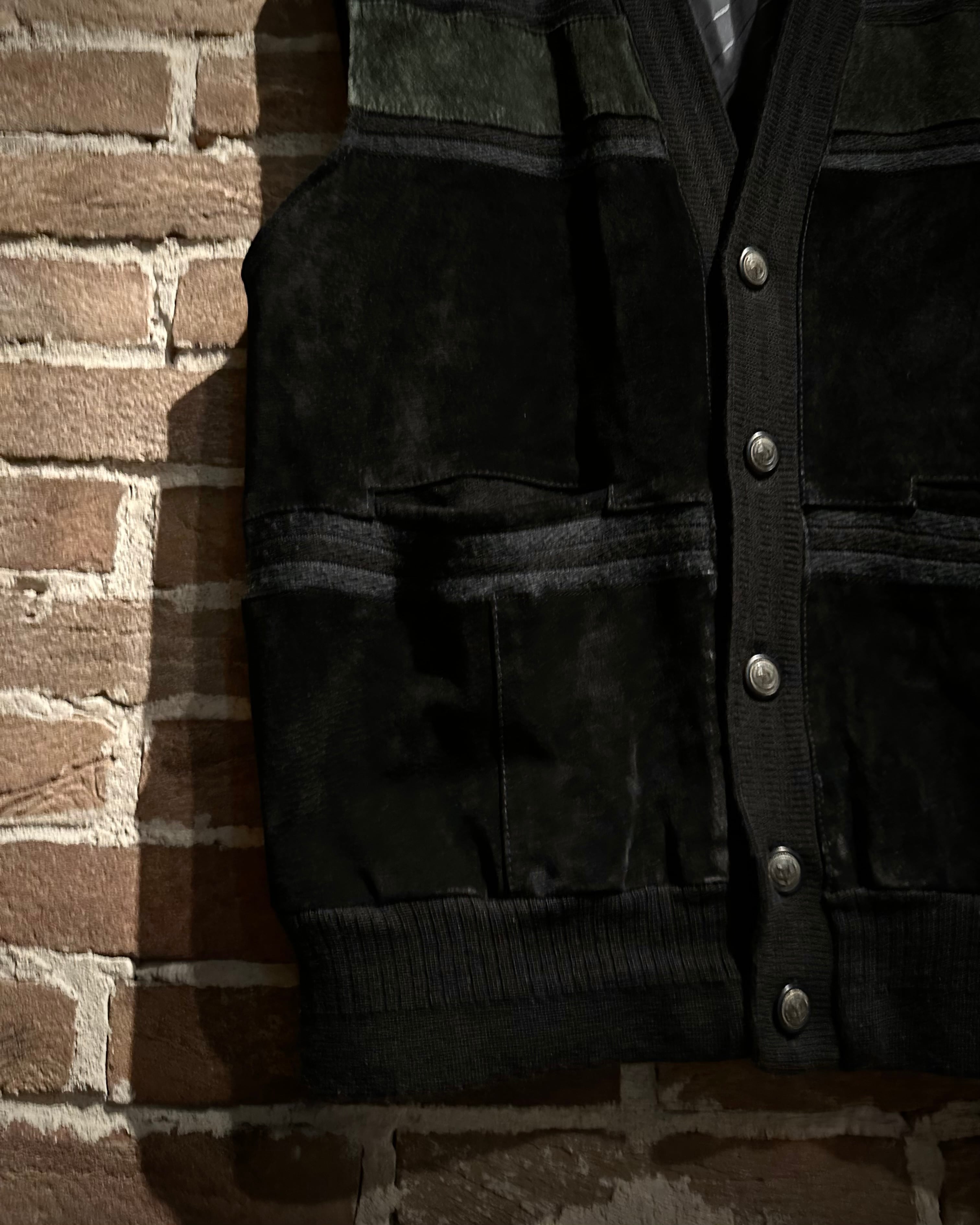深みのあるブラックをベースとしたスペシャルなニットベスト。落ち着きのある風合いに加えて、フロントに切り替えられたスエードレザーの起毛感がデザインのアクセントに。