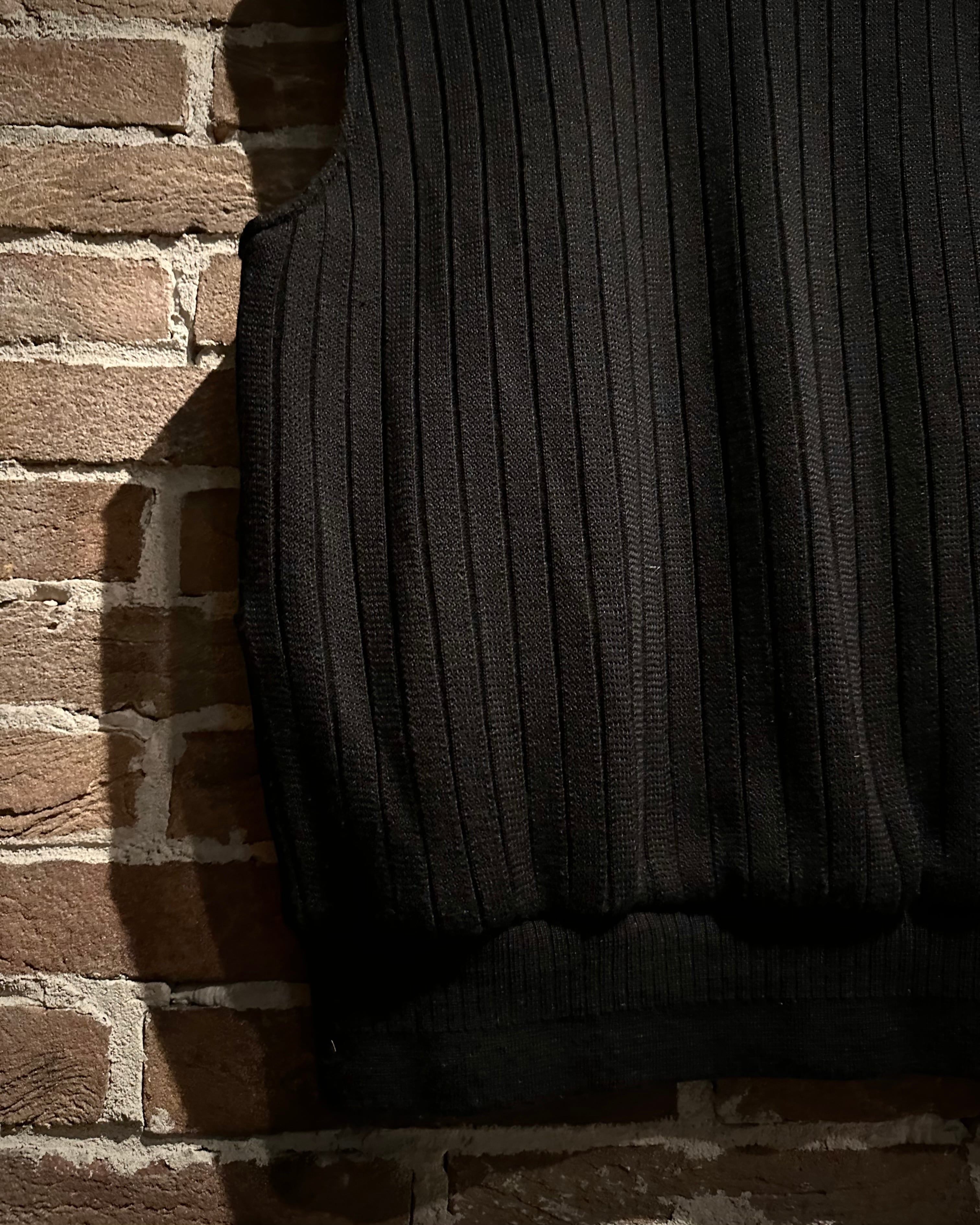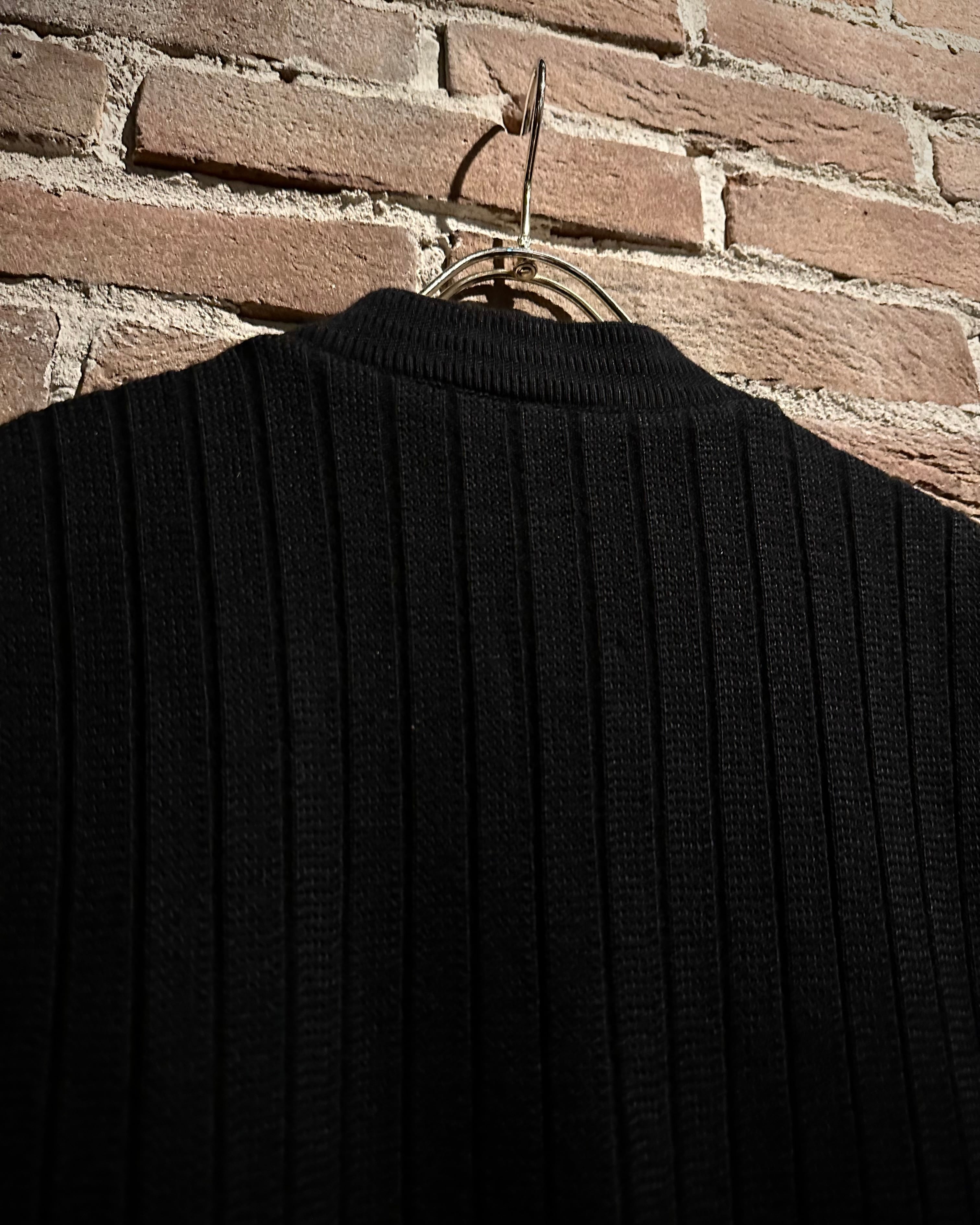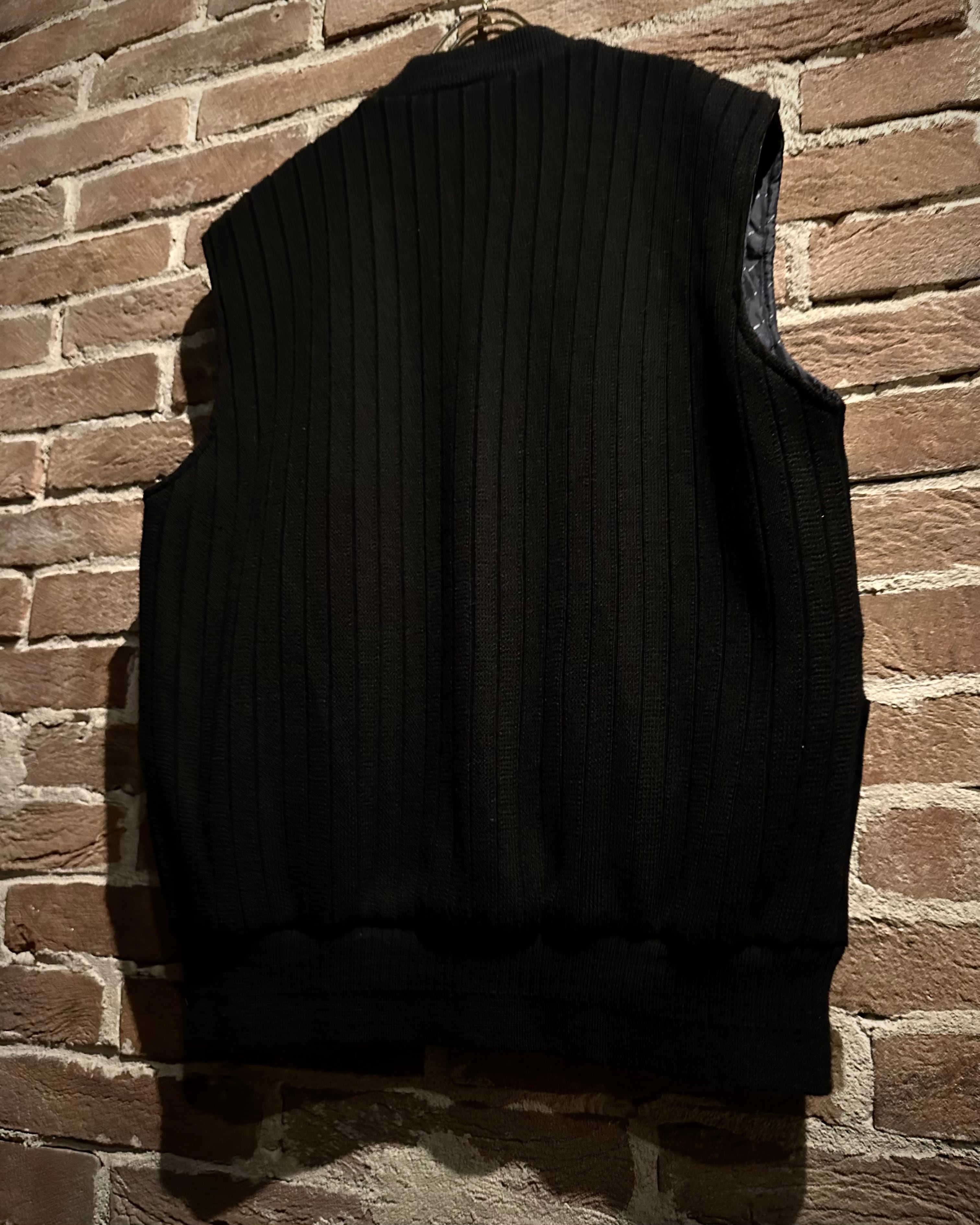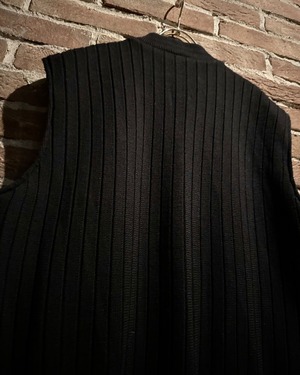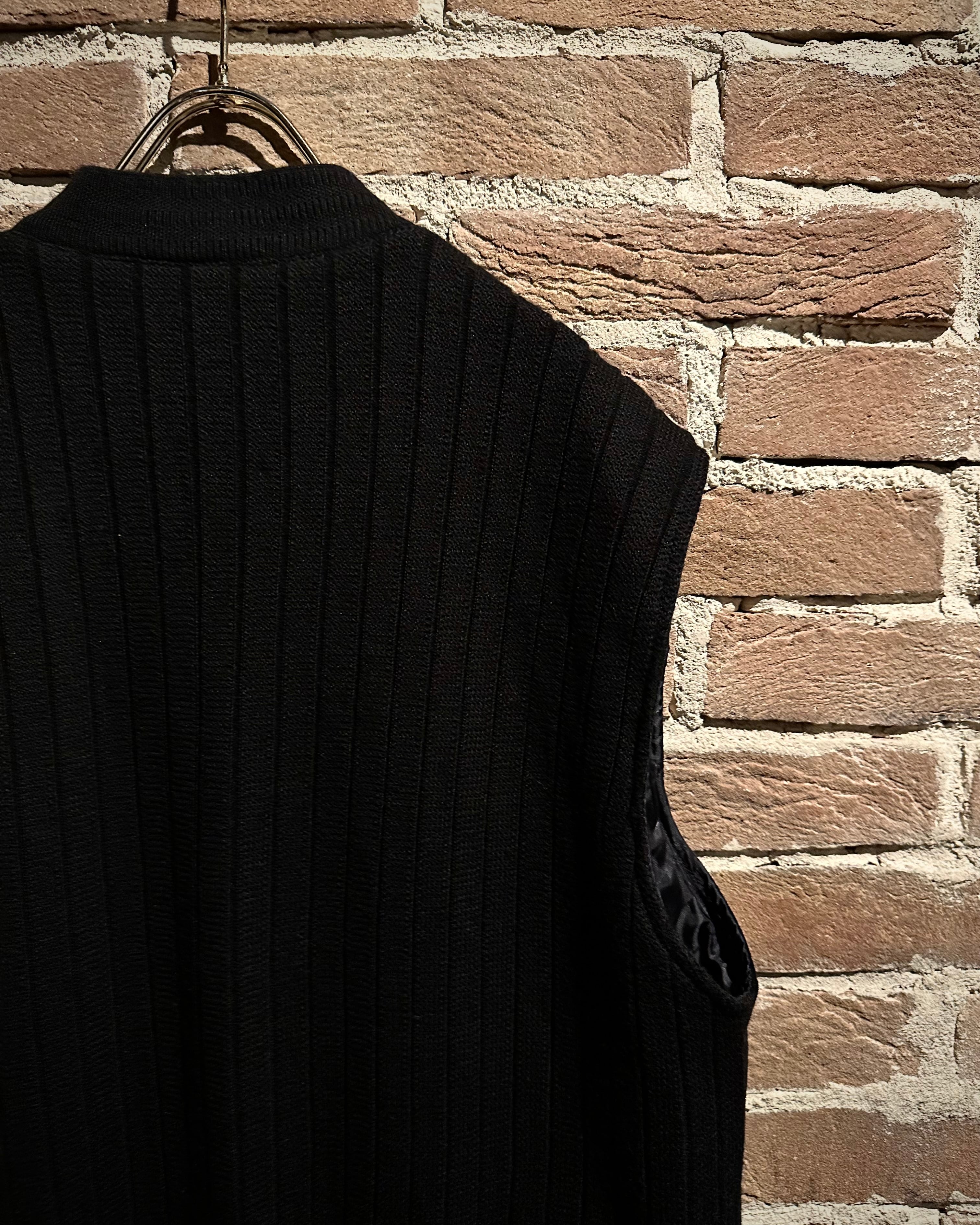 深みのあるブラックをベースとしたスペシャルなニットベスト。落ち着きのある風合いに加えて、フロントに切り替えられたスエードレザーの起毛感がデザインのアクセントに。