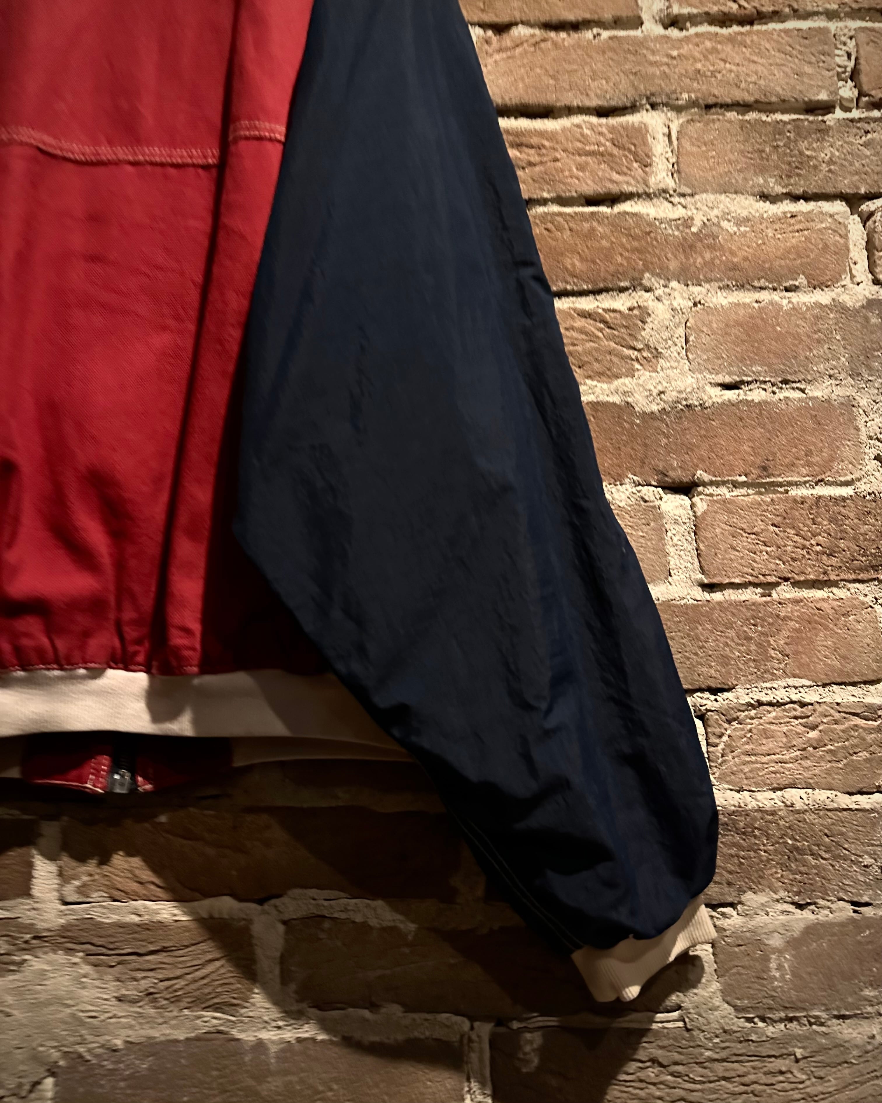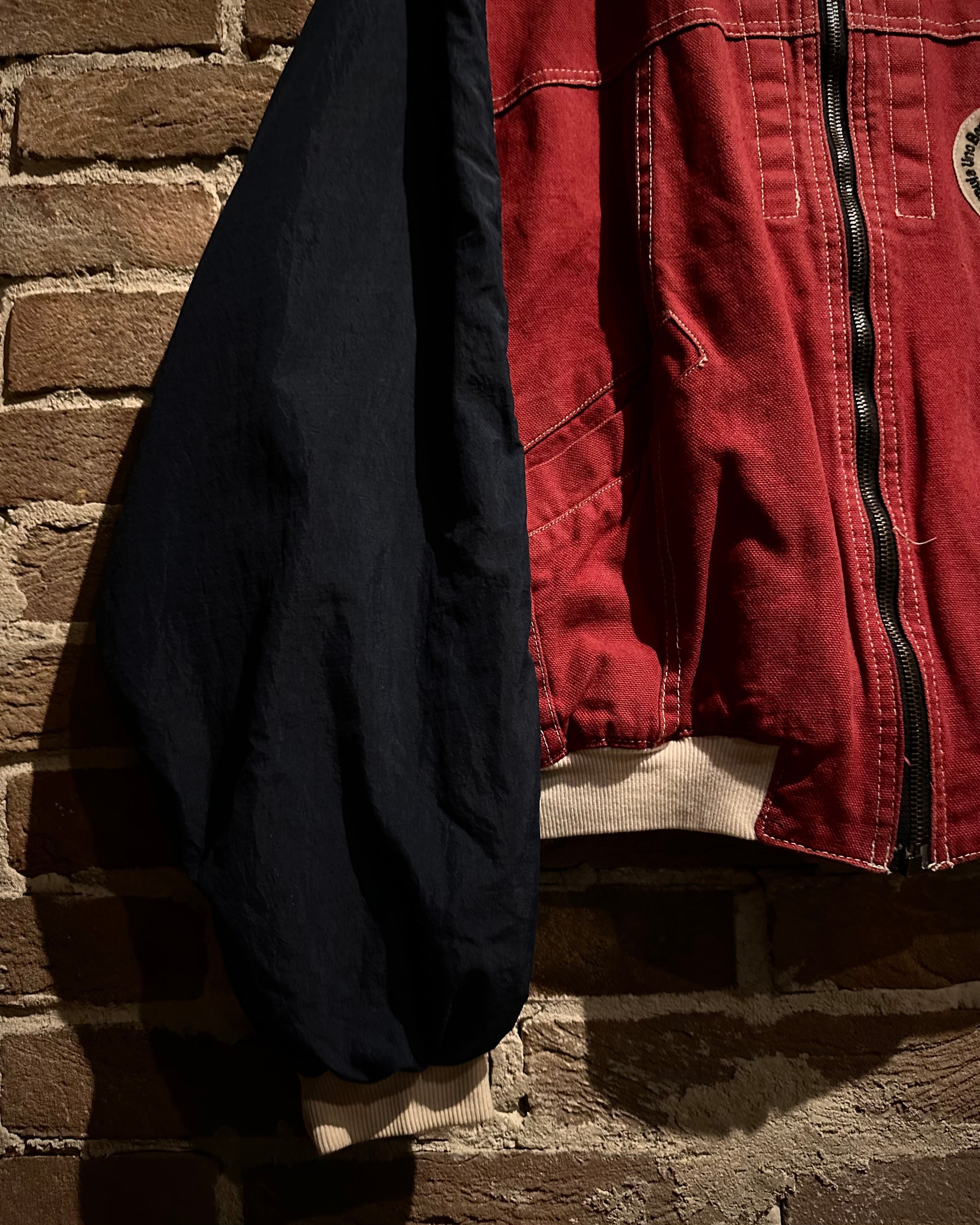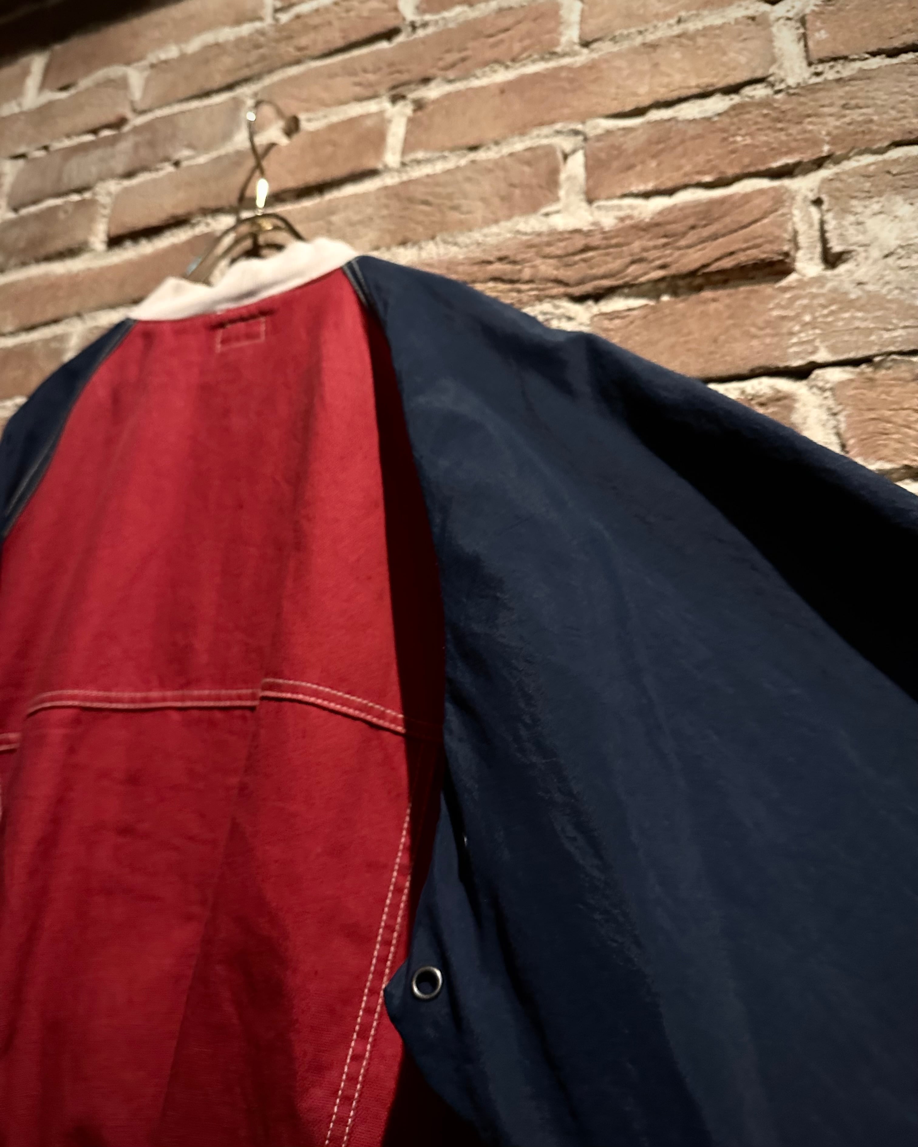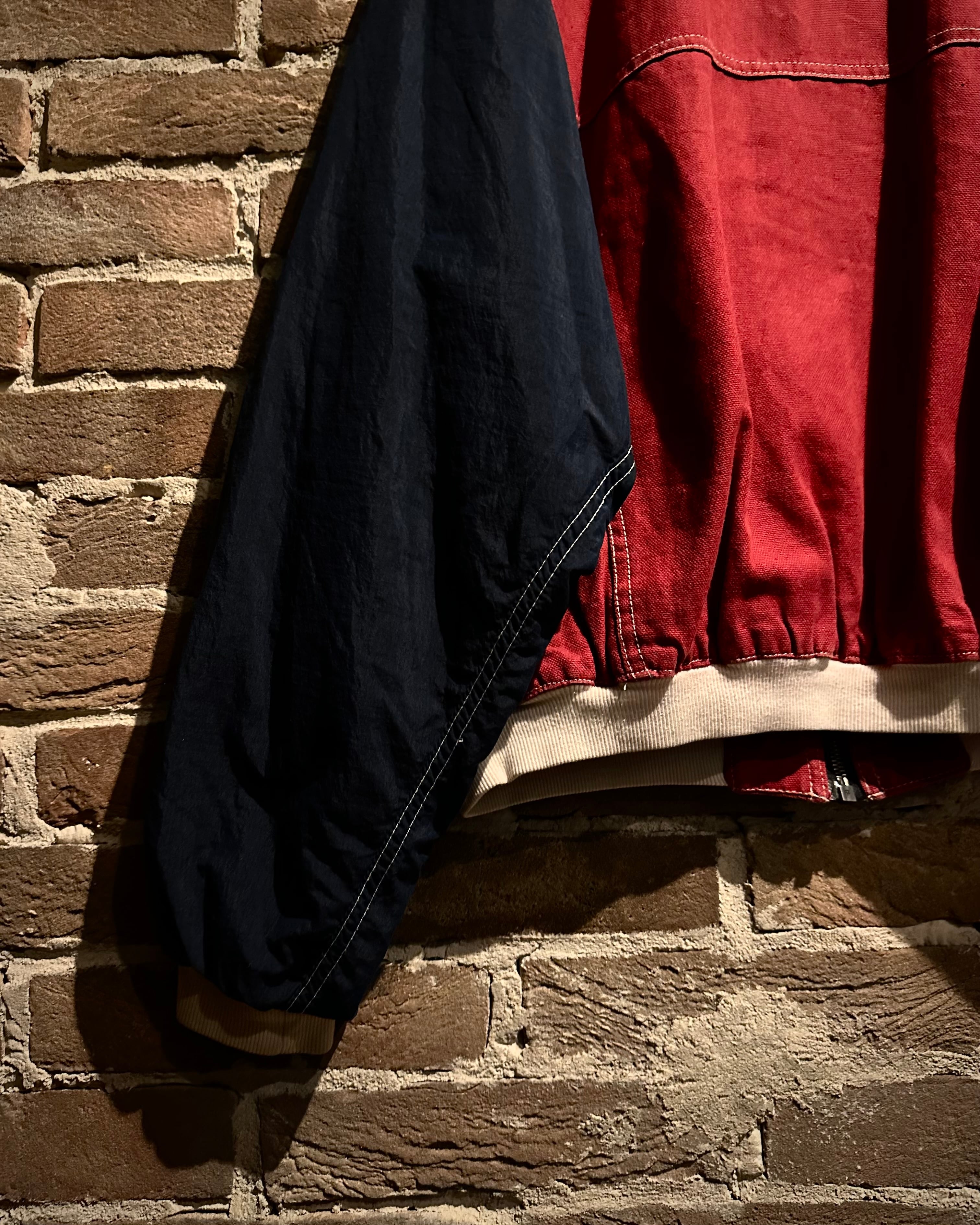 ボディは赤のタフなファブリックをベースに、スリーブにはネイビーのナイロンを切り替えた、配色、異素材の使いで存在感を放つ1着。