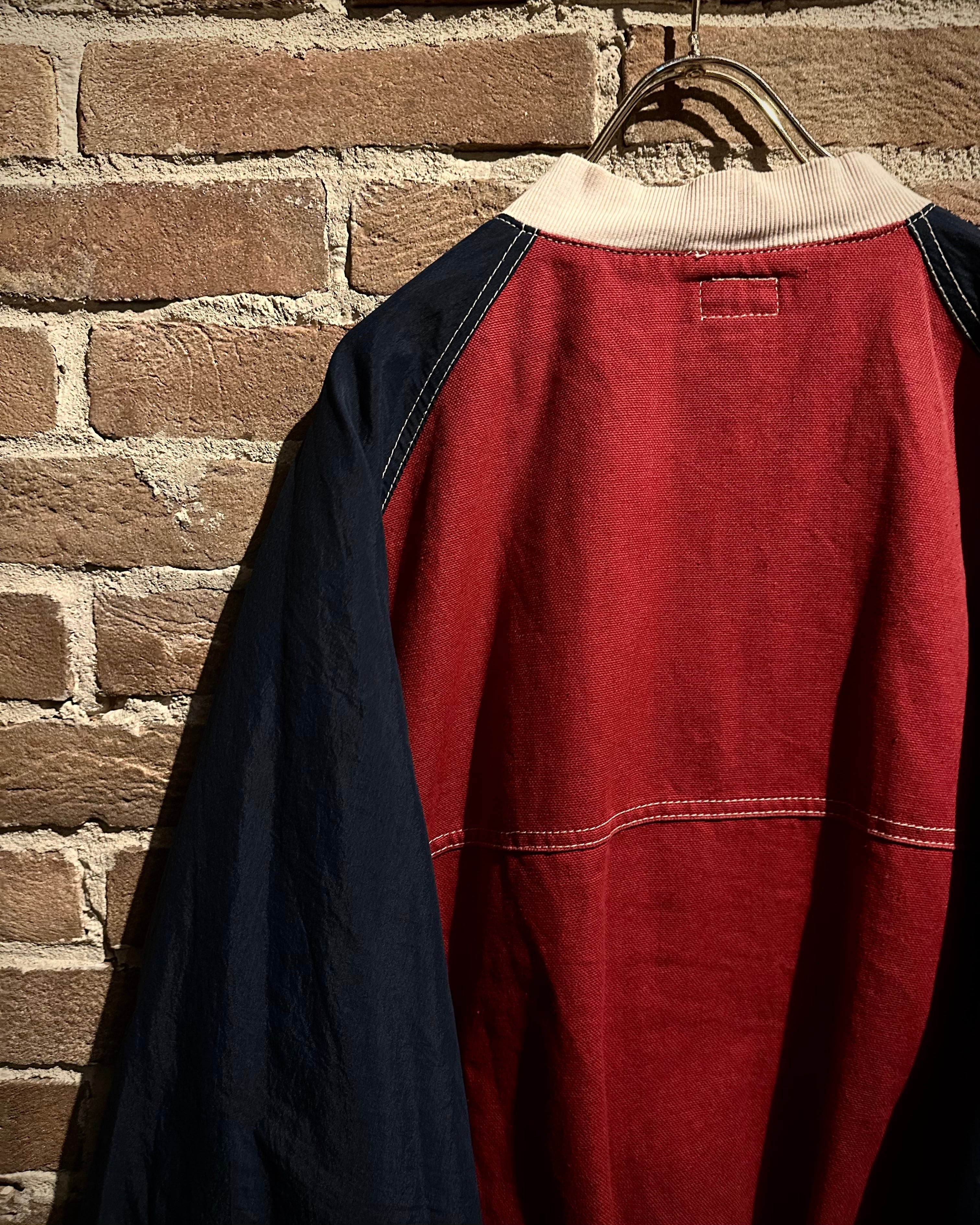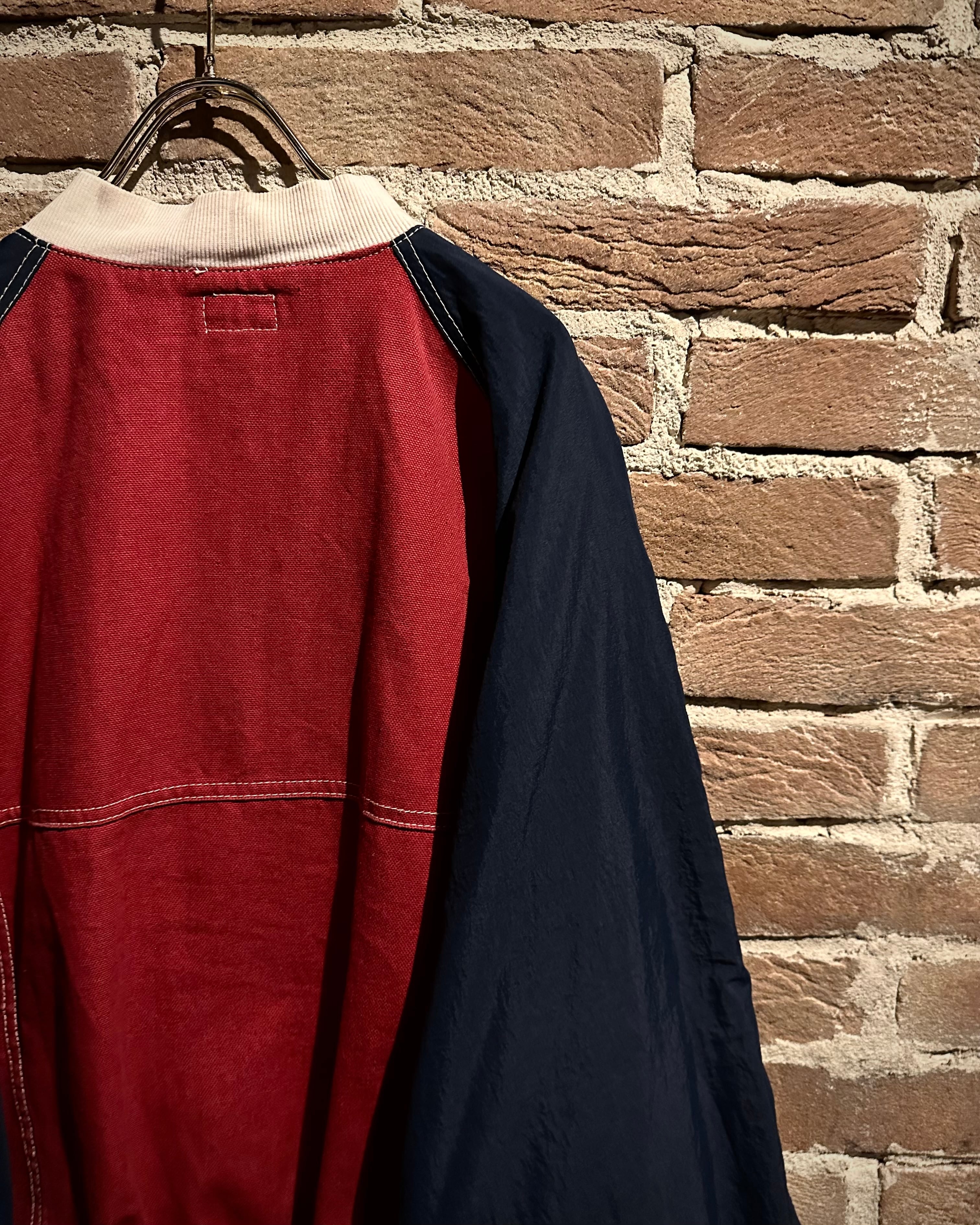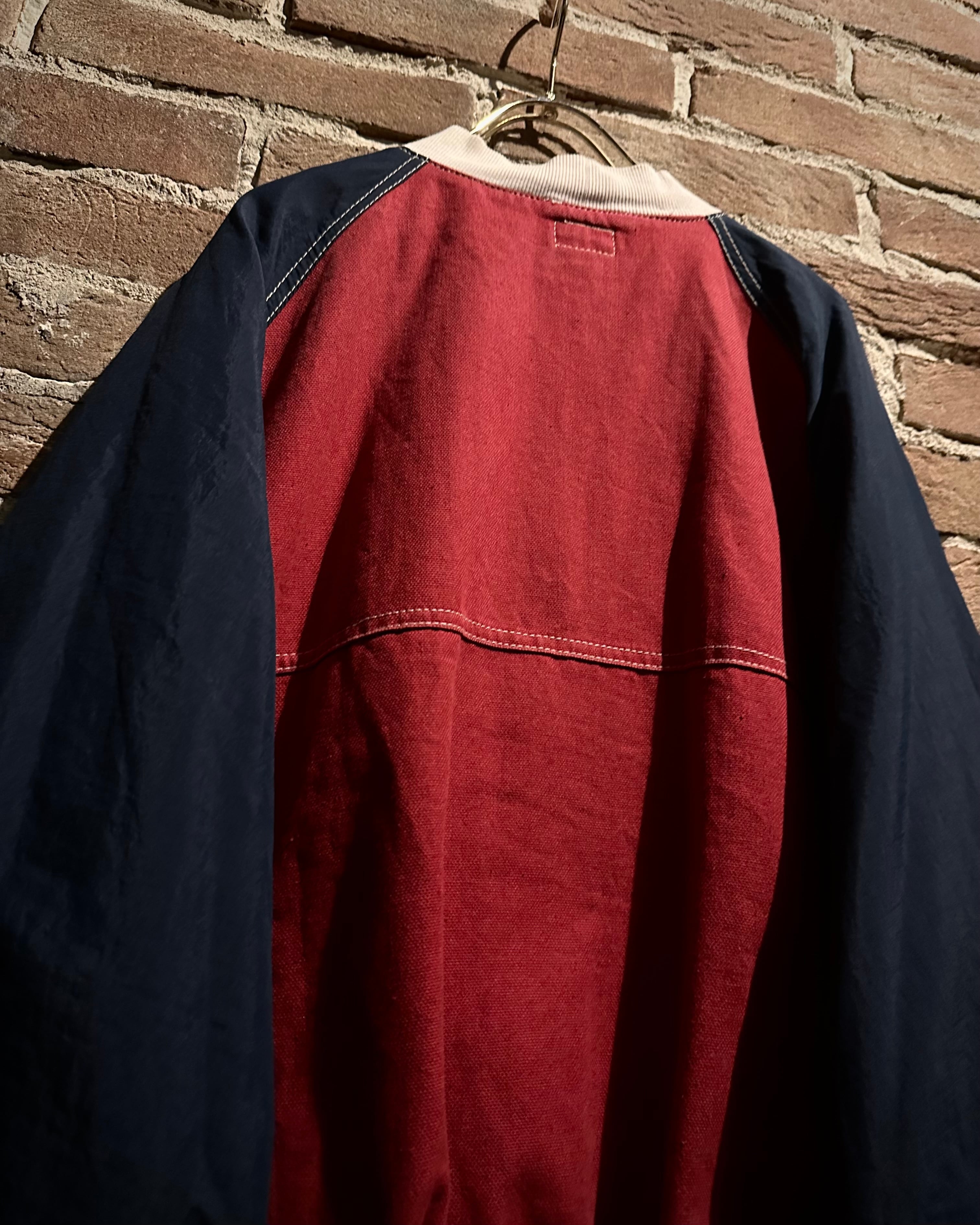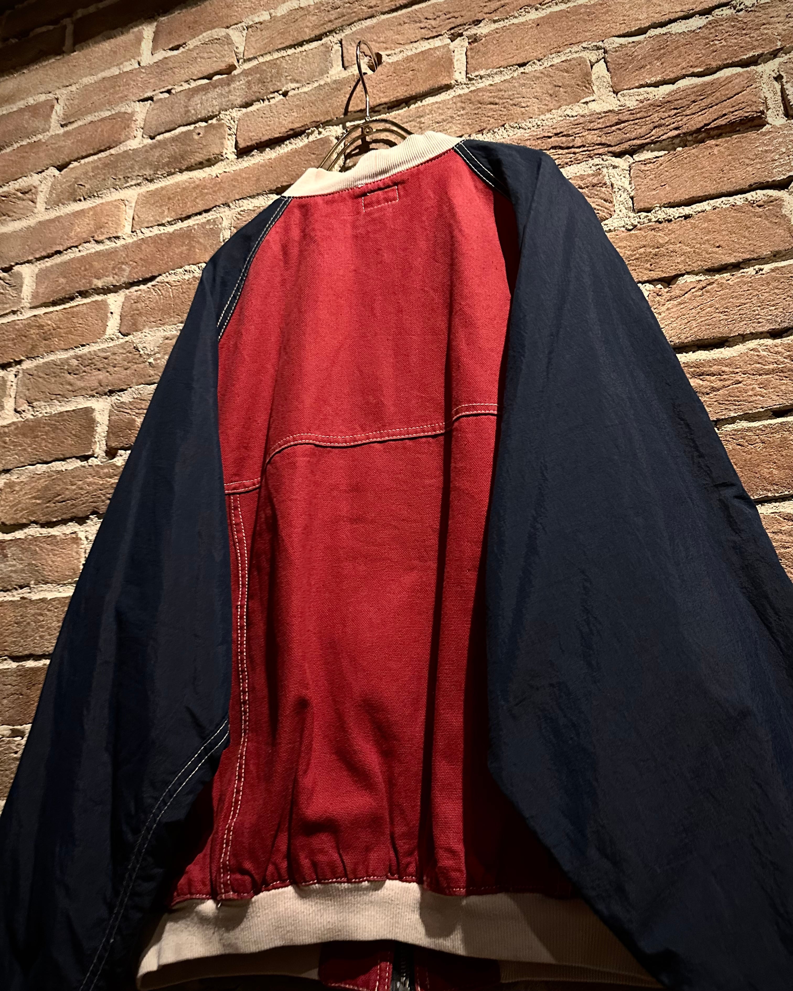 ボディは赤のタフなファブリックをベースに、スリーブにはネイビーのナイロンを切り替えた、配色、異素材の使いで存在感を放つ1着。