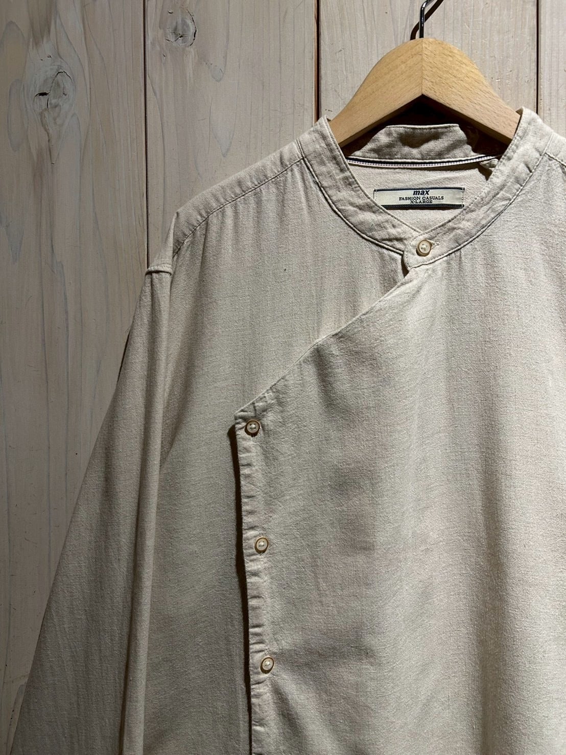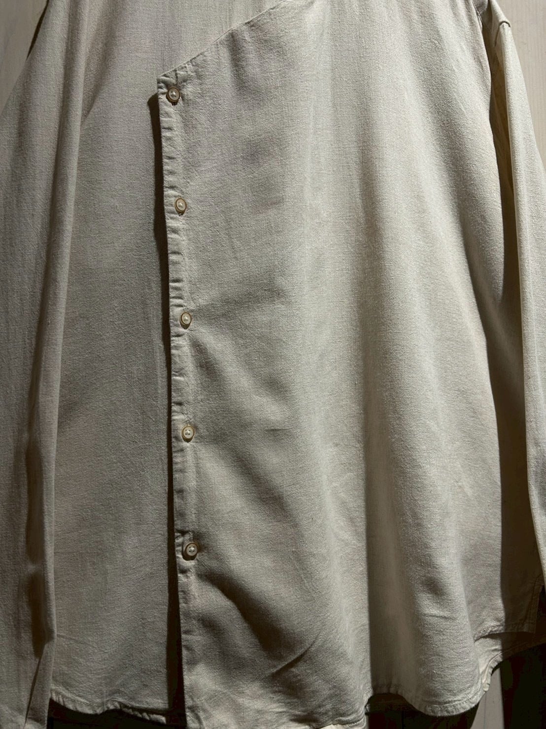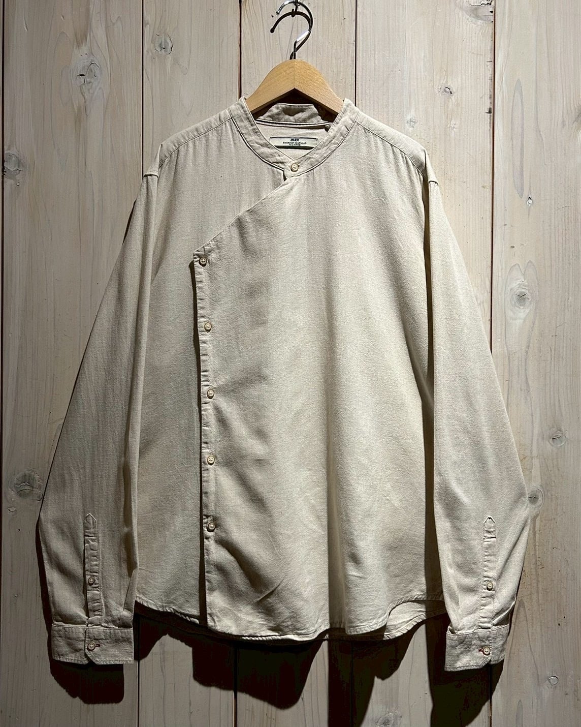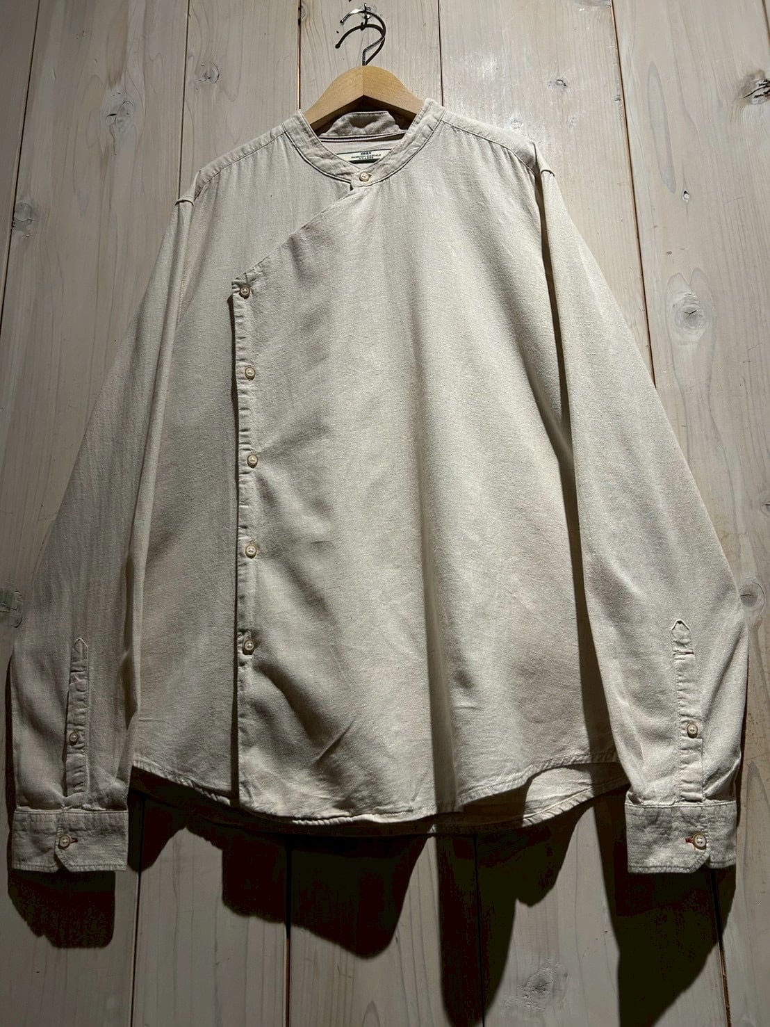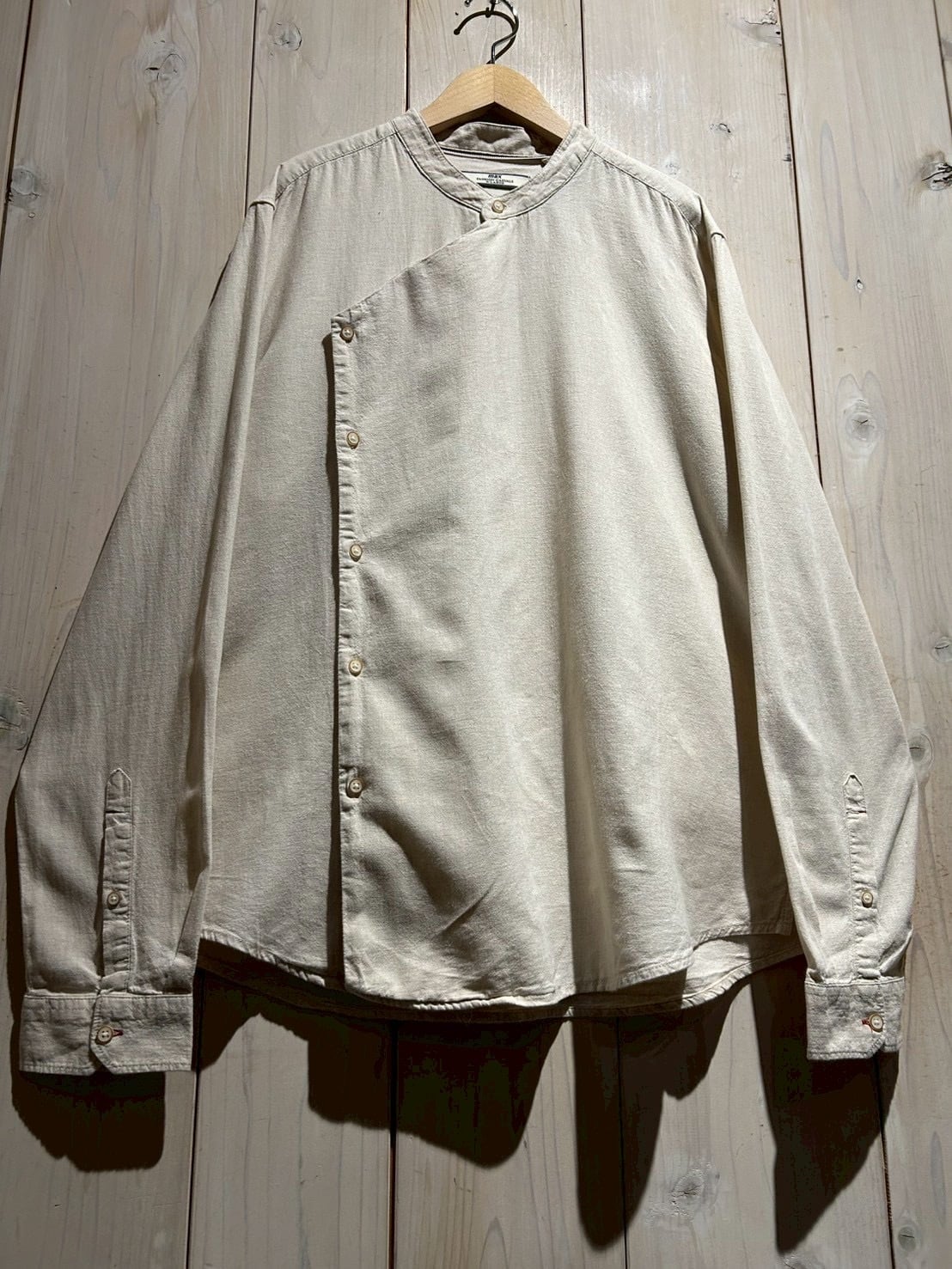 フロントは斜めに走るアシンメトリーな前立てが最大の特徴。スタンドカラーと組み合わさることで、通常のシャツとは一線を画すモードな印象に仕上がっています。