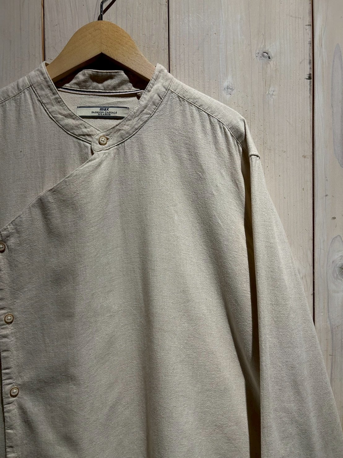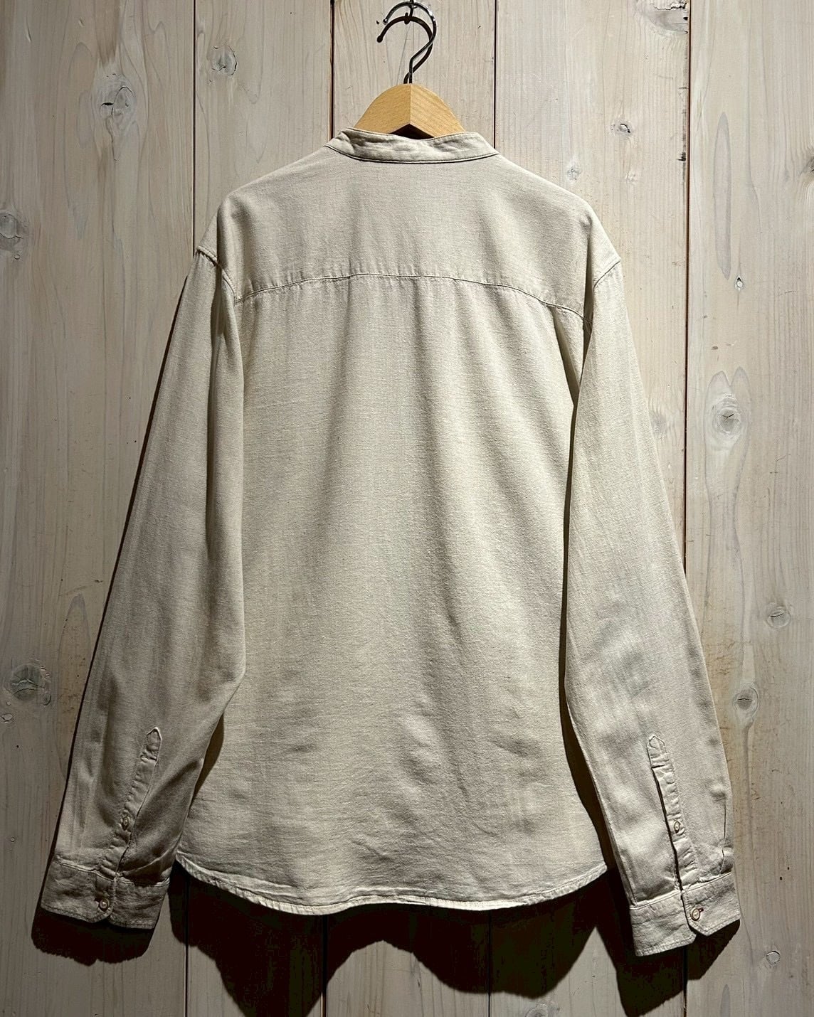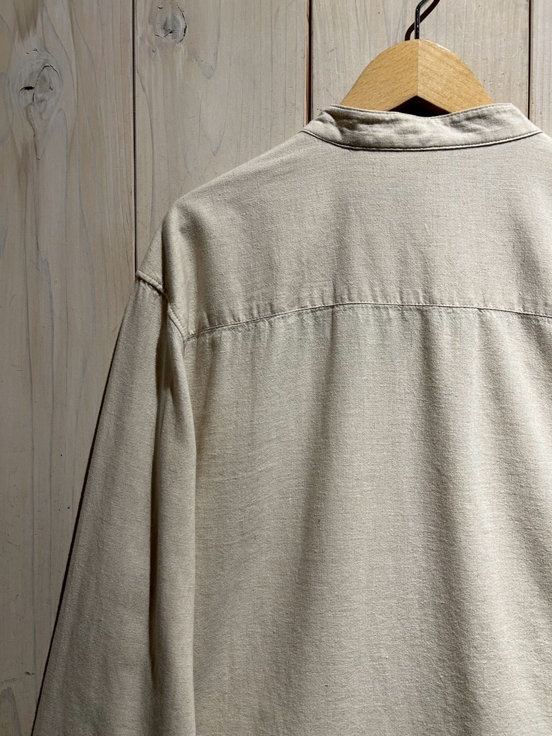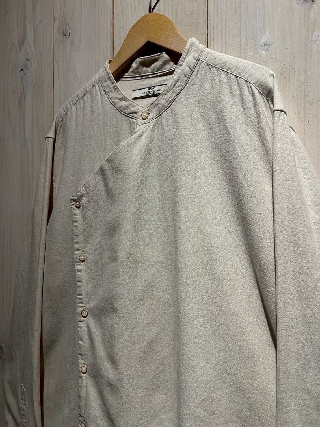 フロントは斜めに走るアシンメトリーな前立てが最大の特徴。スタンドカラーと組み合わさることで、通常のシャツとは一線を画すモードな印象に仕上がっています。