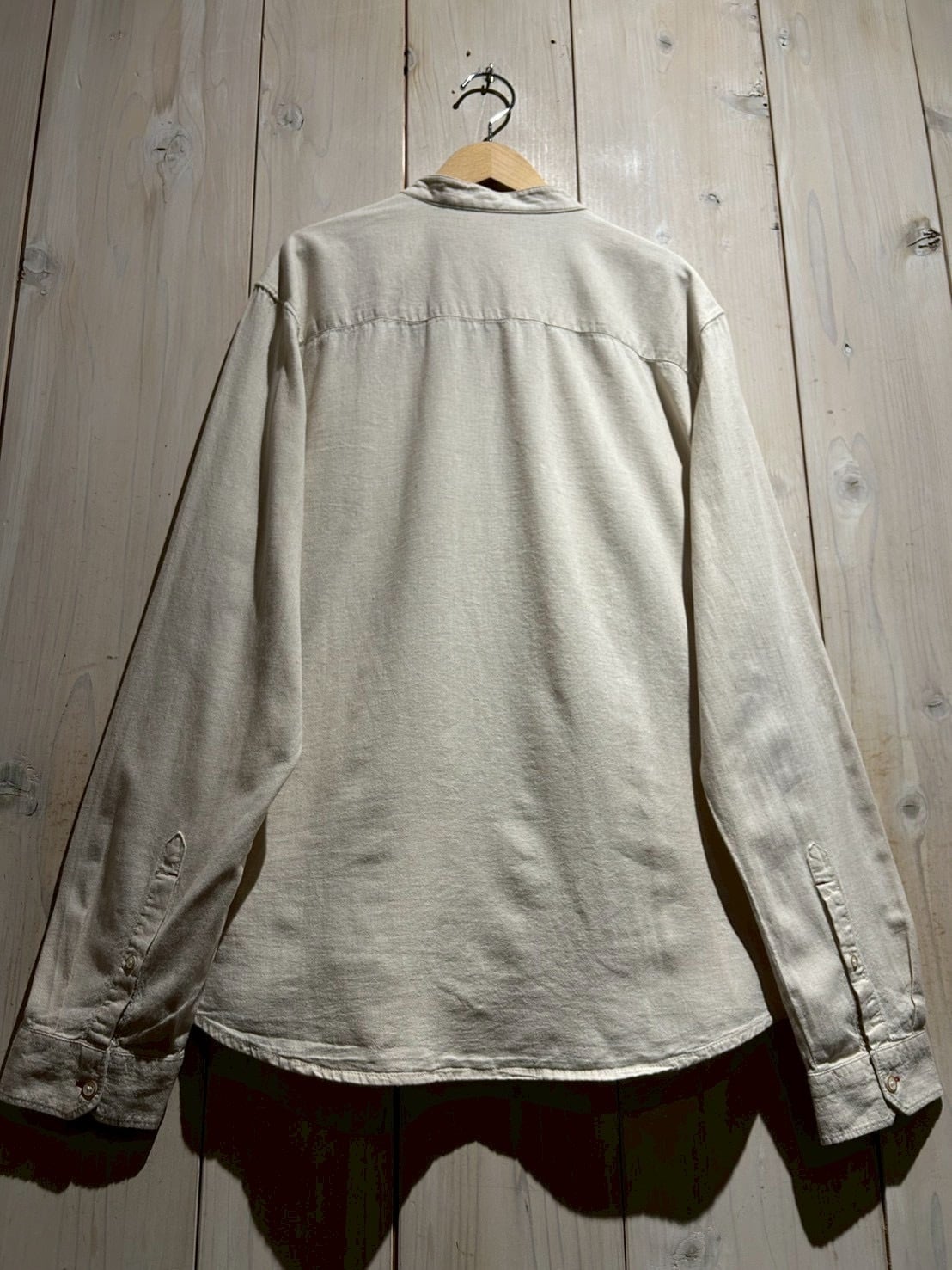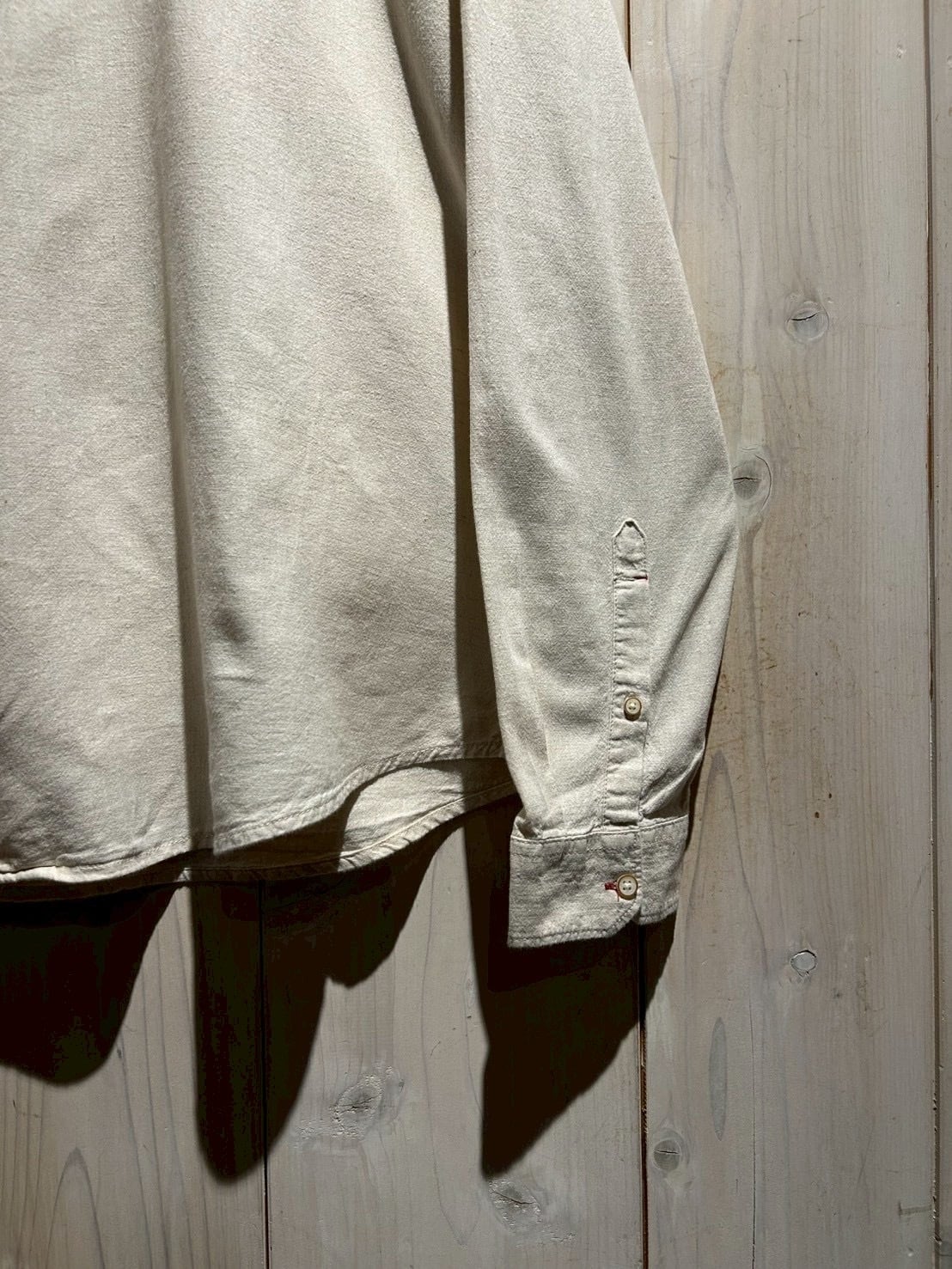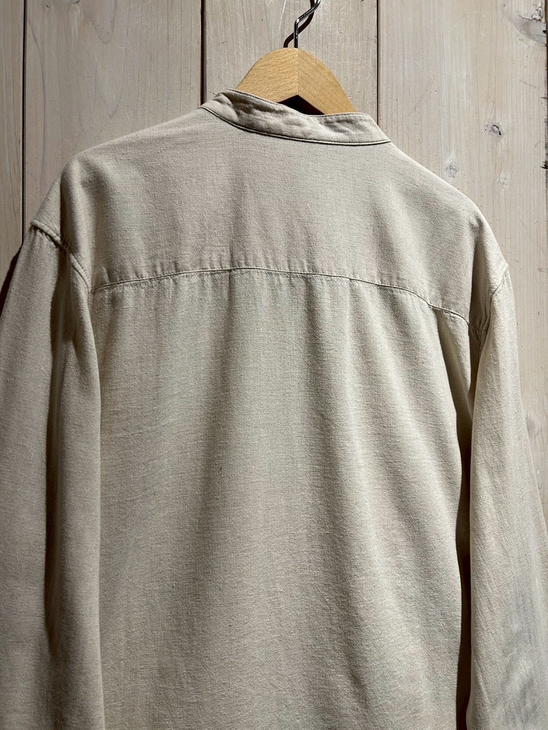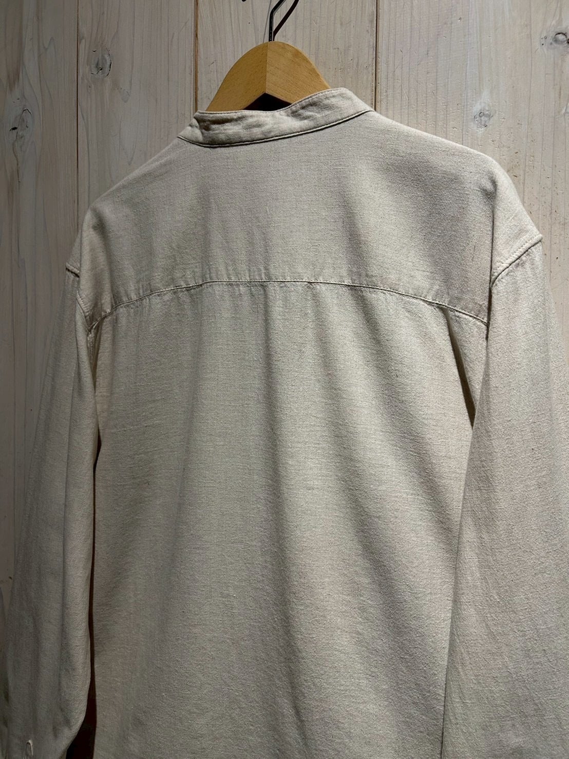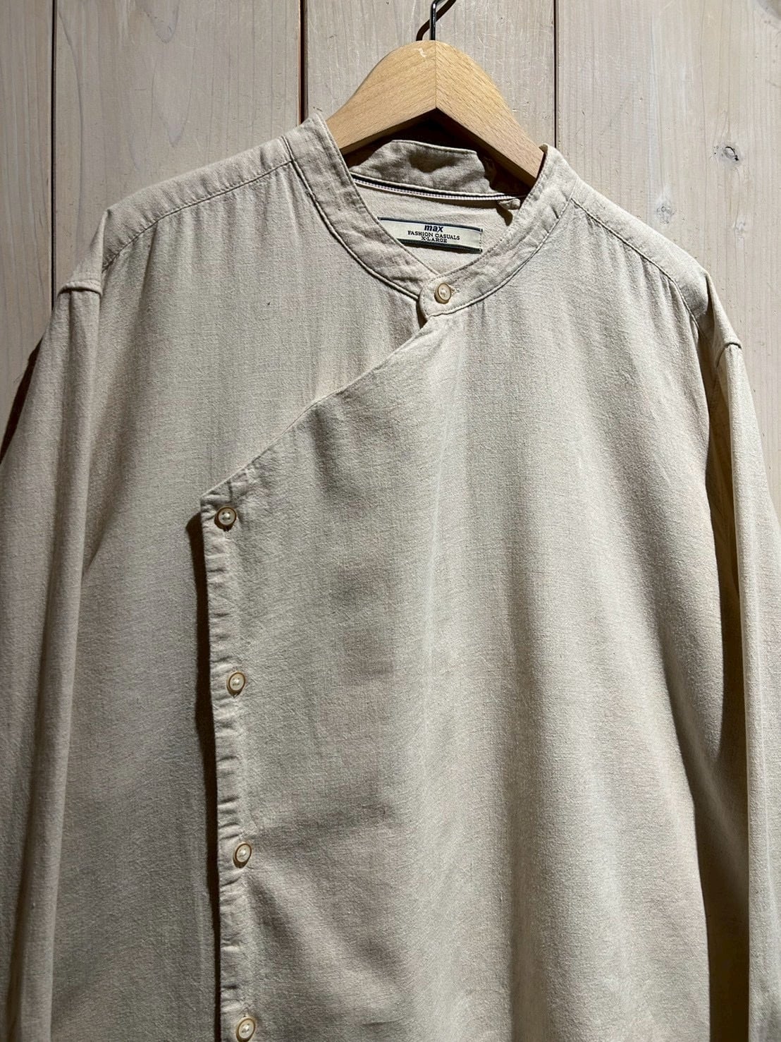 フロントは斜めに走るアシンメトリーな前立てが最大の特徴。スタンドカラーと組み合わさることで、通常のシャツとは一線を画すモードな印象に仕上がっています。
